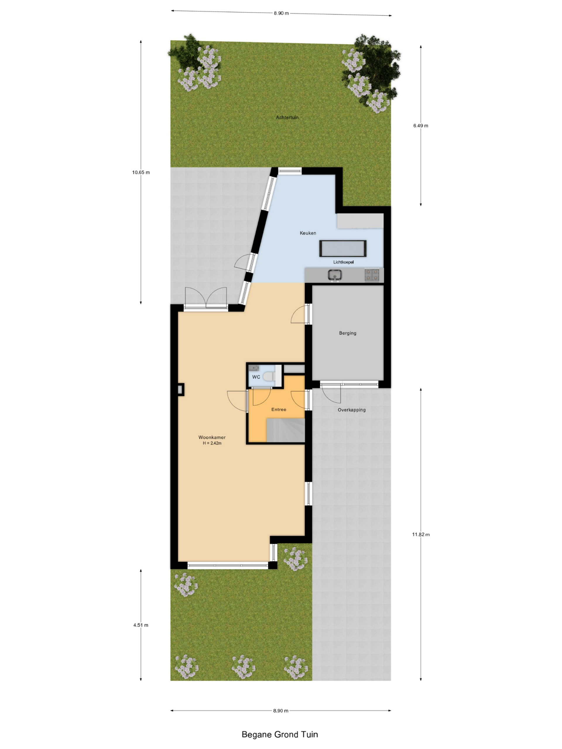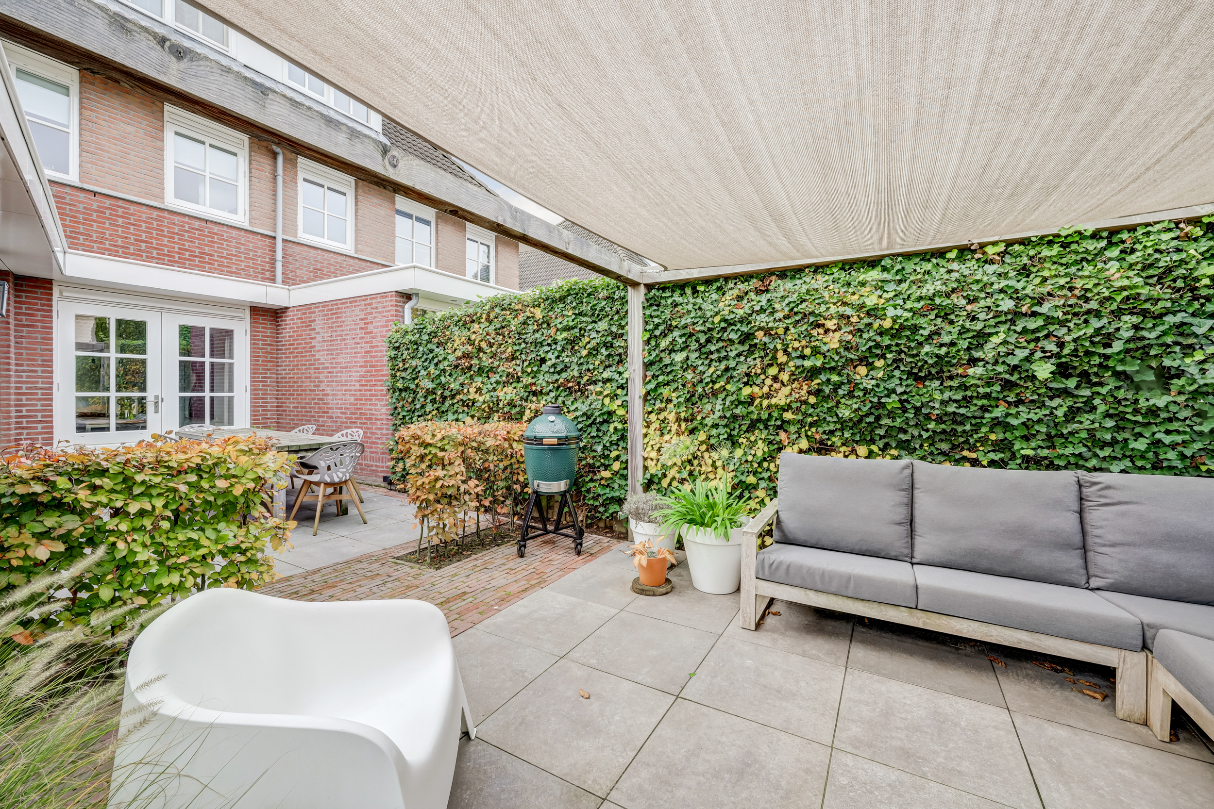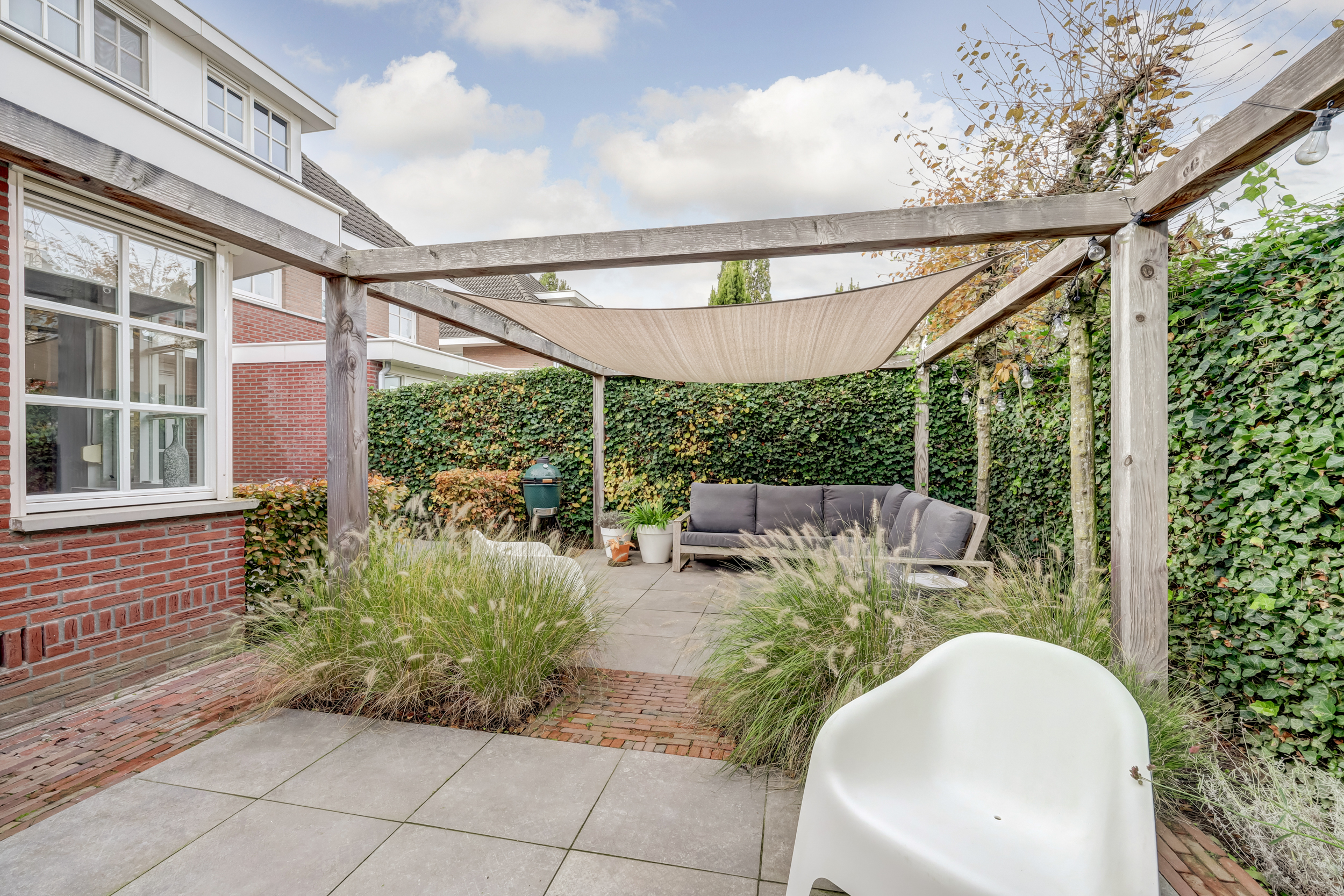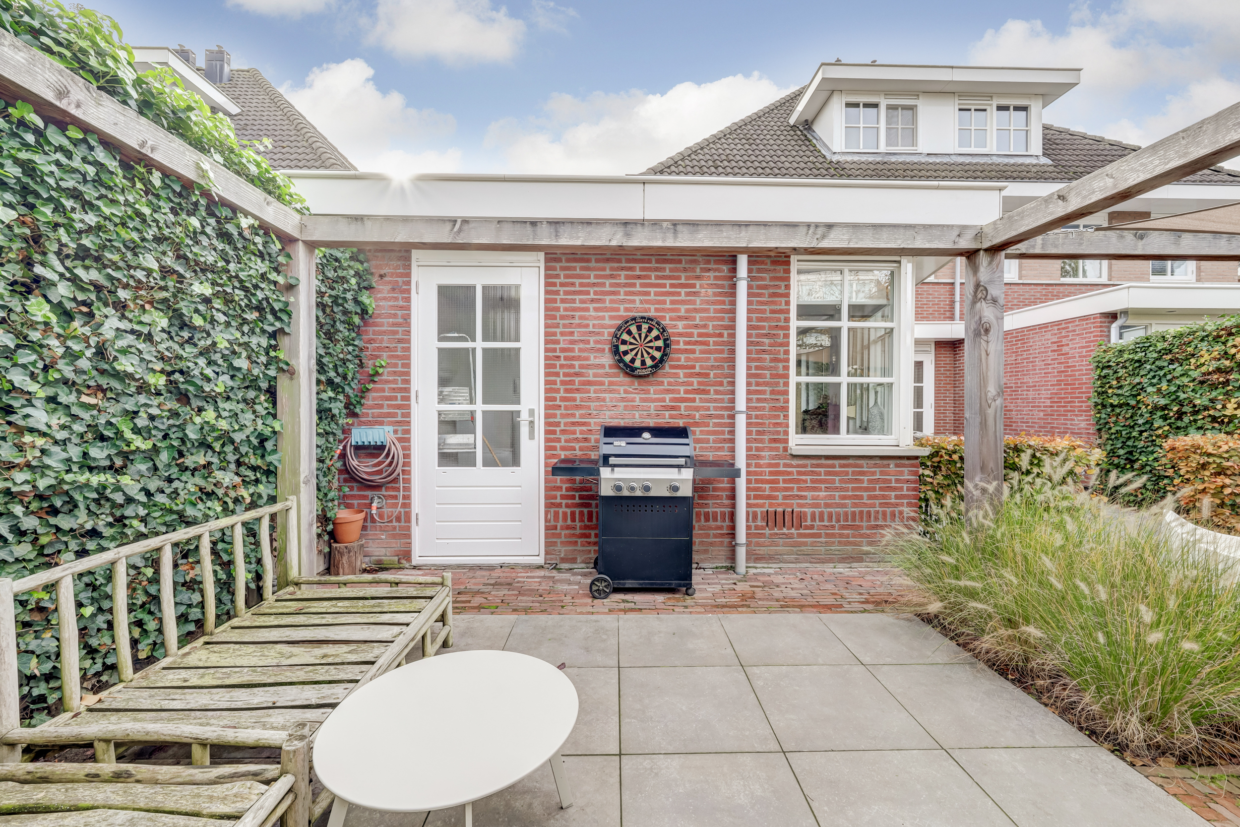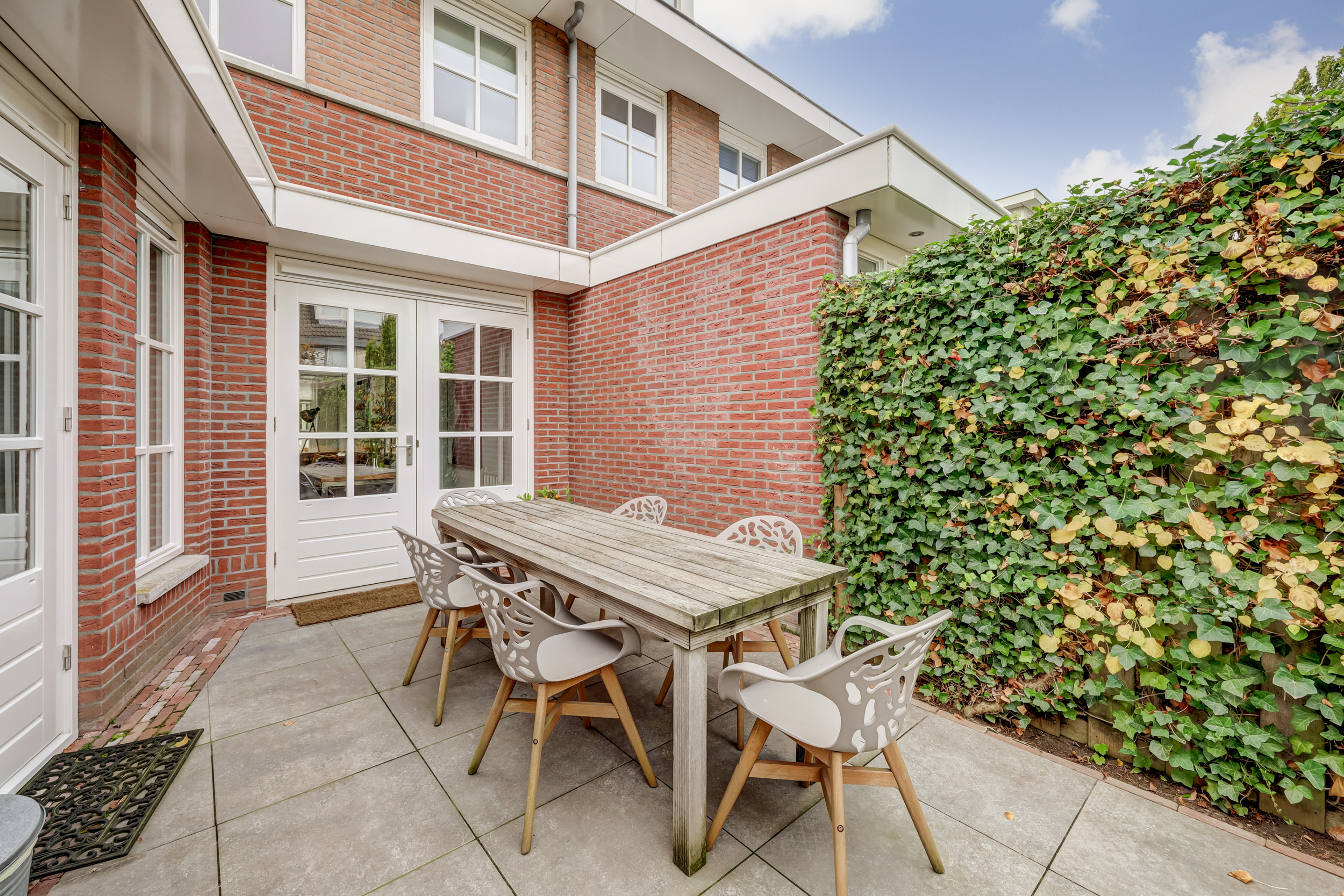 De voortuin heeft een eigen oprit met parkeerruimte voor twee auto’s. De achtertuin is netjes aangelegd en combineert meerdere terrassen met groen, waardoor het een prettige, koele plek is om te ontspannen en te genieten van het buitenleven.