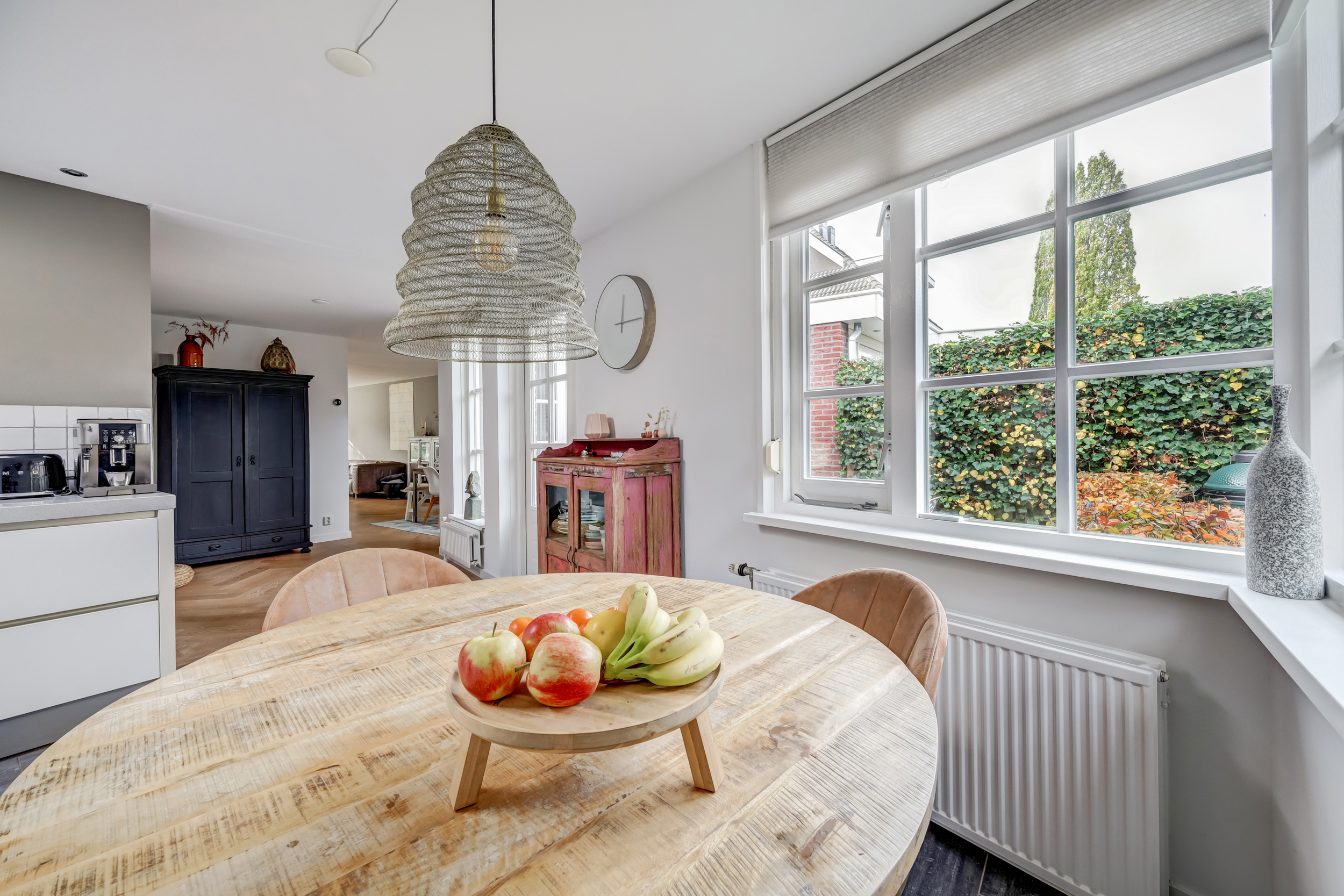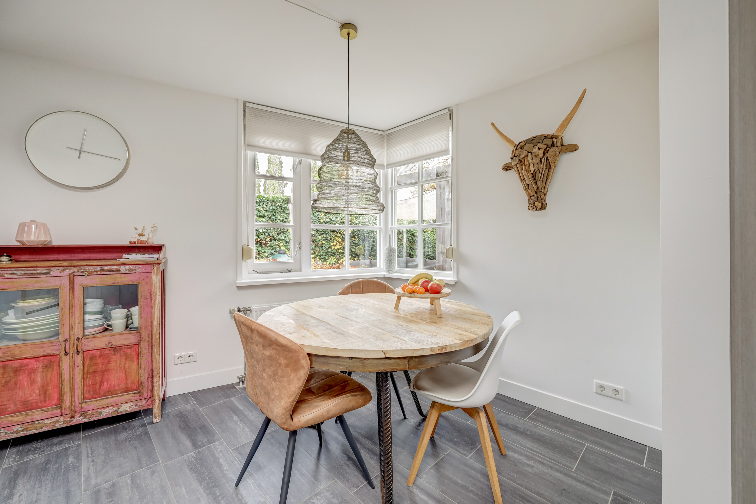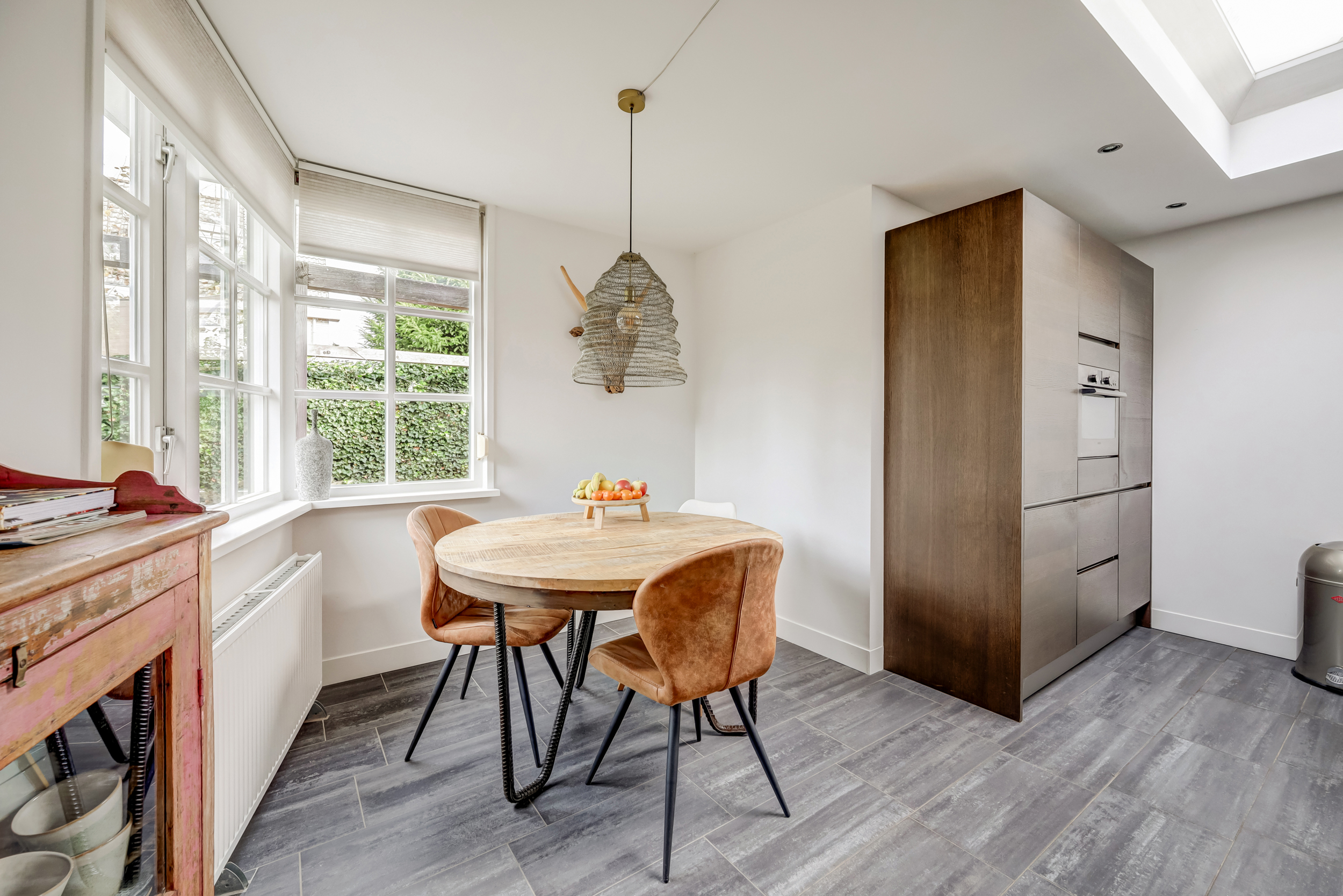 De woonkamer is een heerlijke plek om tot rust te komen. Dankzij de grote raampartijen in de erker valt er veel daglicht binnen, waardoor de ruimte fris en uitnodigend aanvoelt. De openslaande deuren naar de tuin maken het mogelijk om binnen en buiten moeiteloos met elkaar te verbinden, ideaal voor zomerse dagen of gezellige avonden. Er is volop plek voor een ruime zithoek en een eettafel waar het hele gezin samen kan komen.