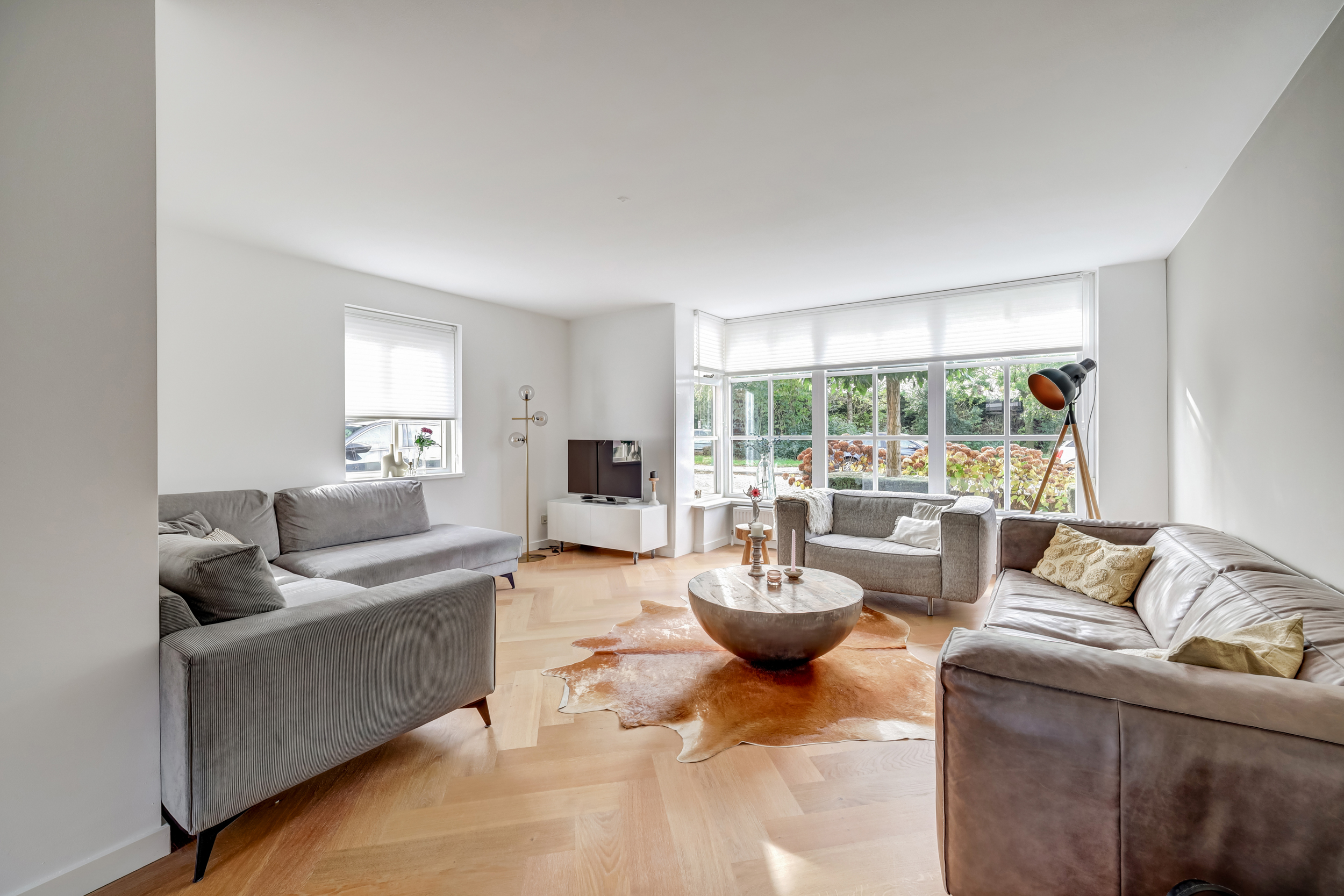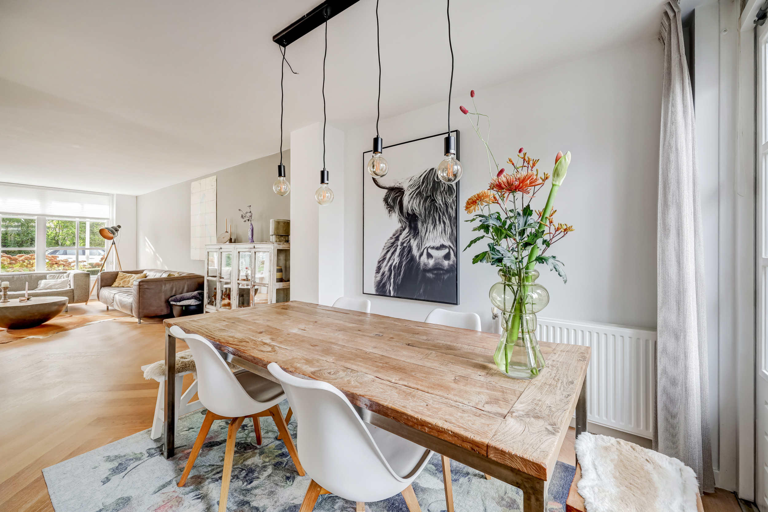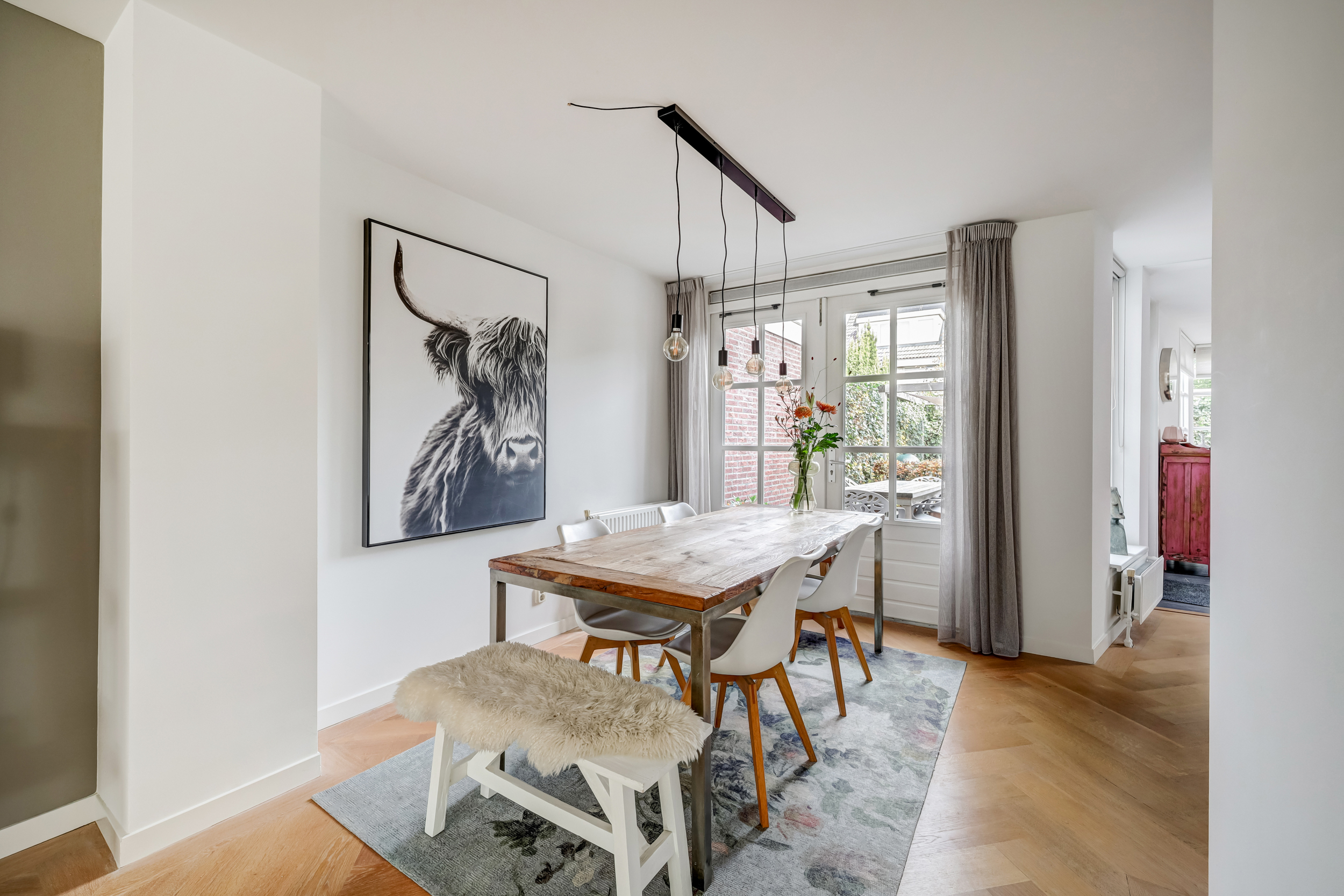 De woonkamer is een heerlijke plek om tot rust te komen. Dankzij de grote raampartijen in de erker valt er veel daglicht binnen, waardoor de ruimte fris en uitnodigend aanvoelt. De openslaande deuren naar de tuin maken het mogelijk om binnen en buiten moeiteloos met elkaar te verbinden, ideaal voor zomerse dagen of gezellige avonden. Er is volop plek voor een ruime zithoek en een eettafel waar het hele gezin samen kan komen.
