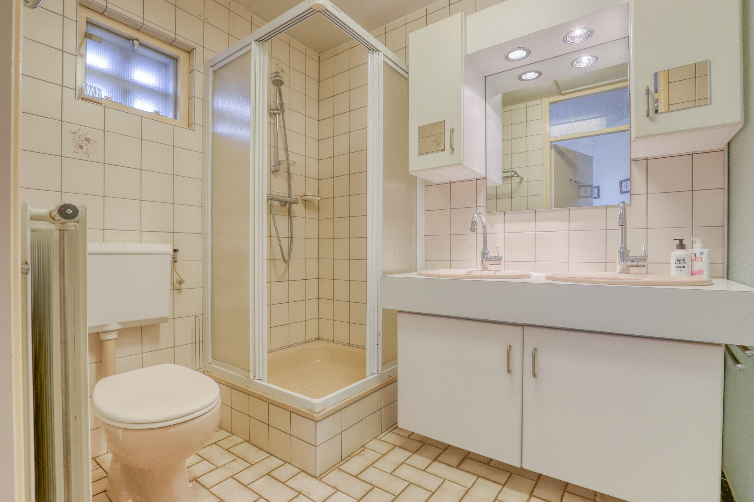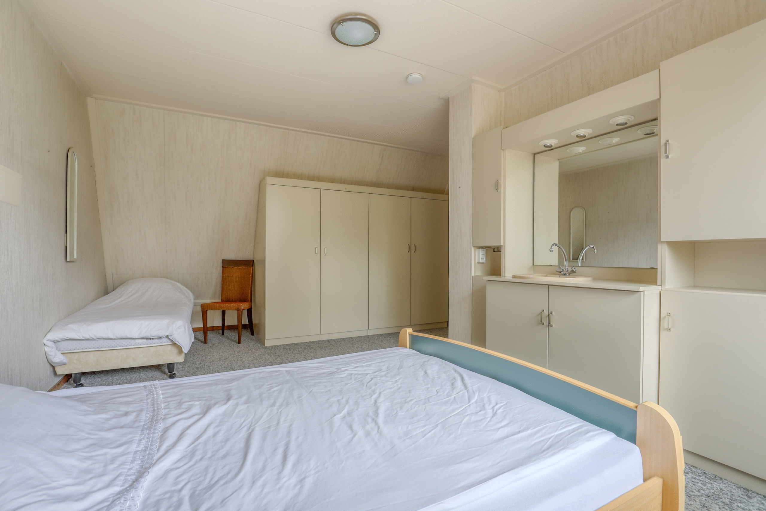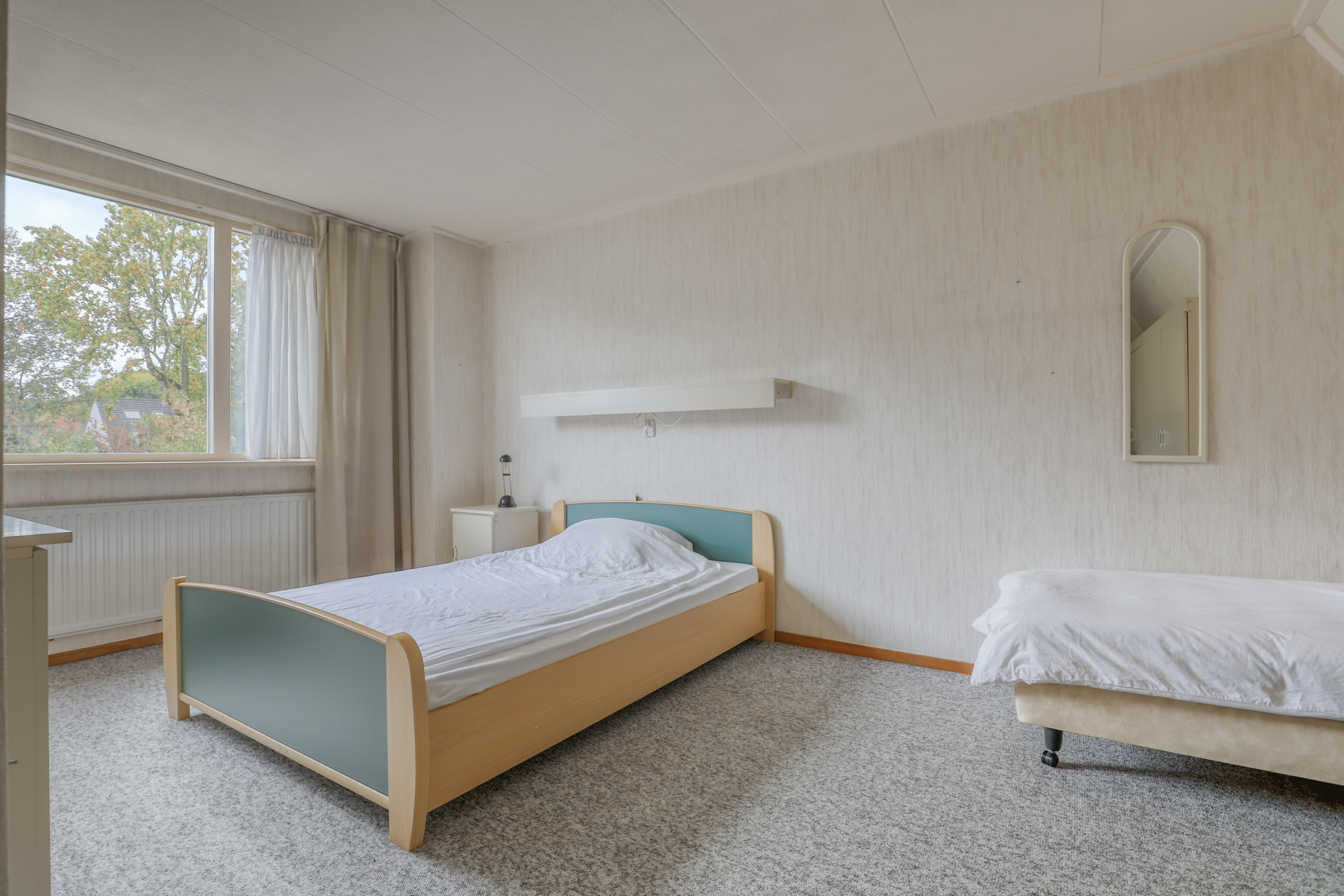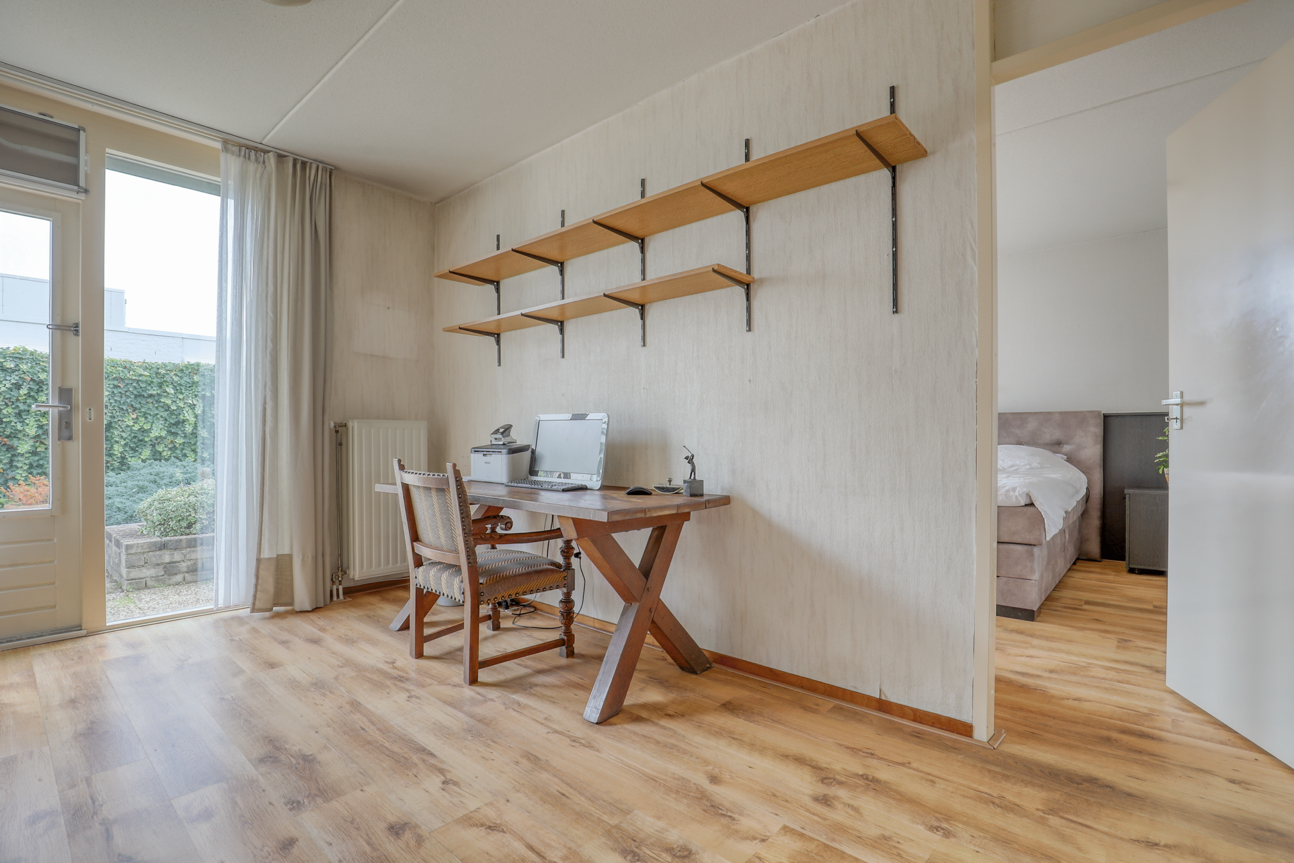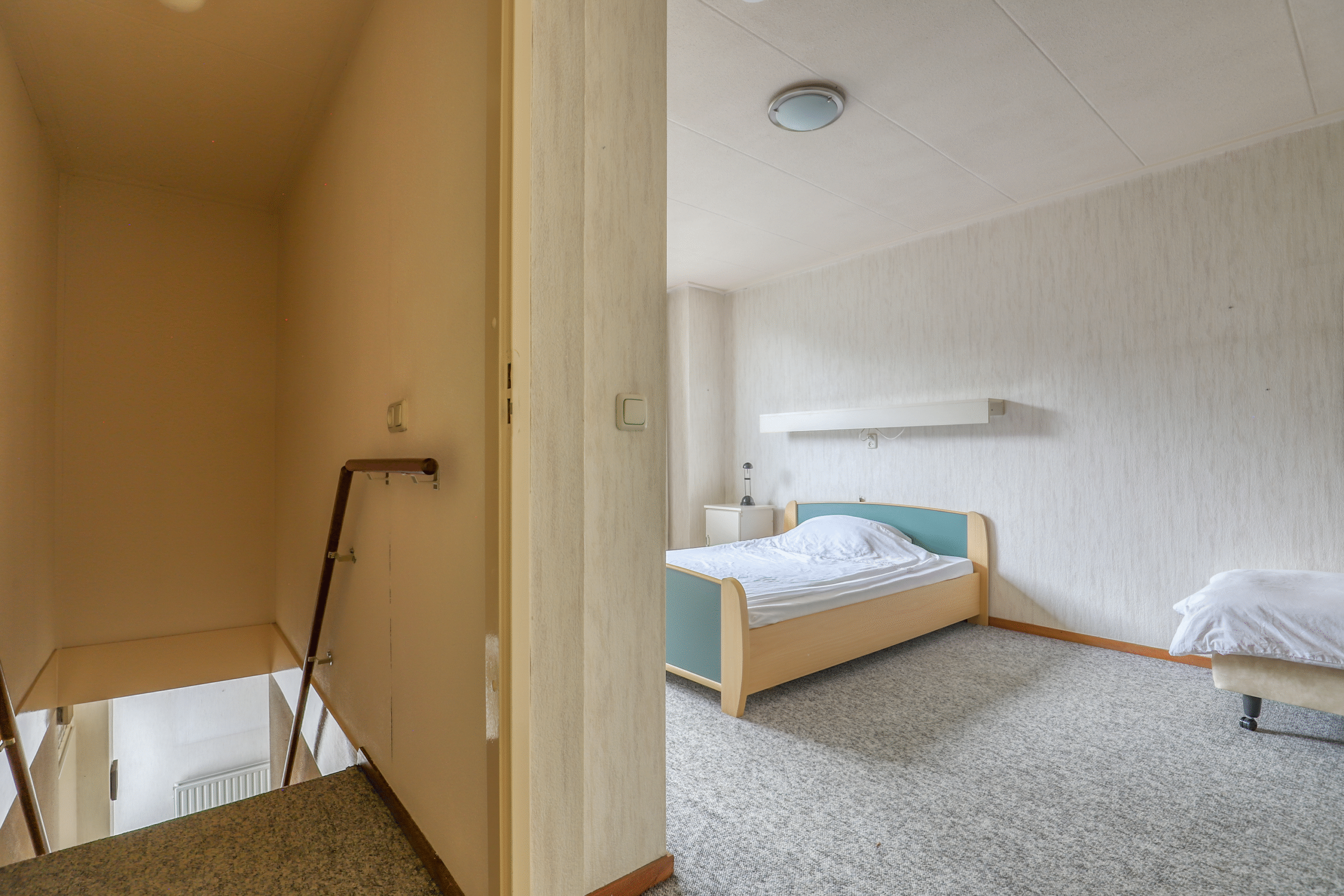 Via de vaste trap bereik je de eerste verdieping met een derde slaapkamer, voorzien van wastafelmeubel. Deze ruimte is perfect te gebruiken als logeerkamer, werkkamer of hobbyruimte.