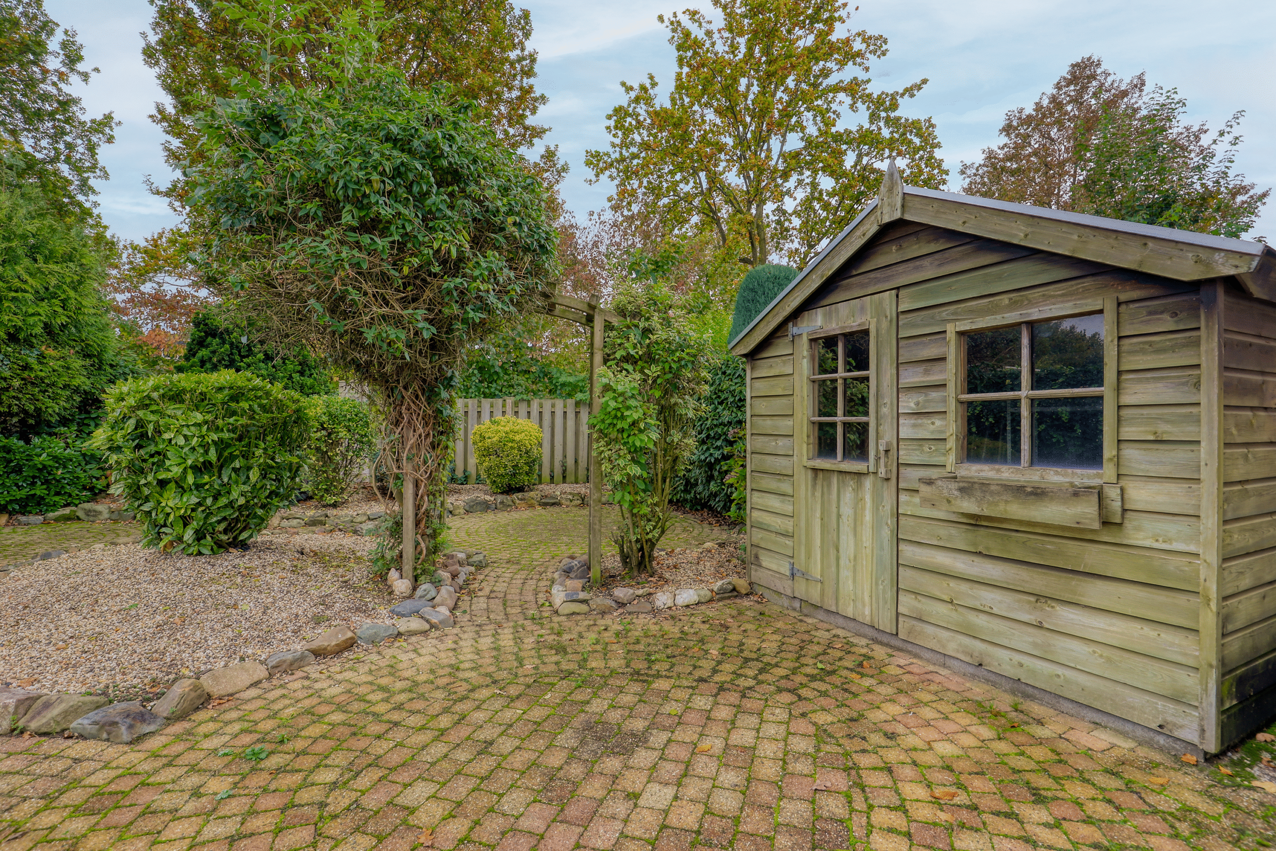 – Zonnige tuin op het zuiden met veel privacy en houten berging