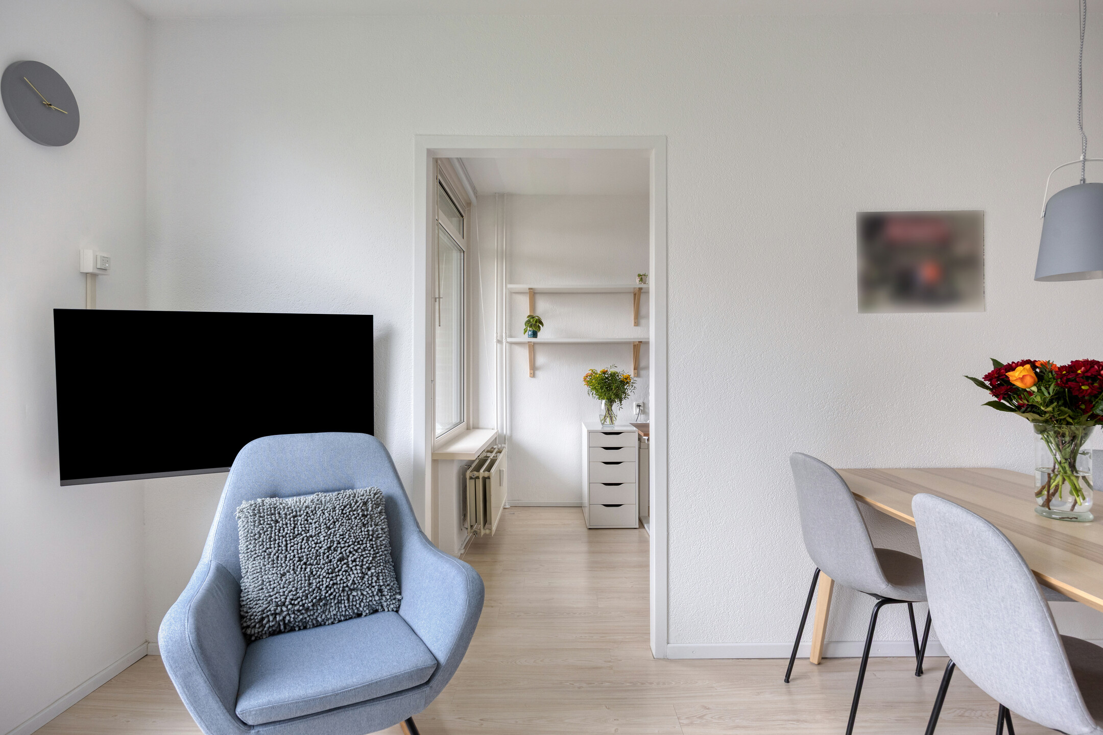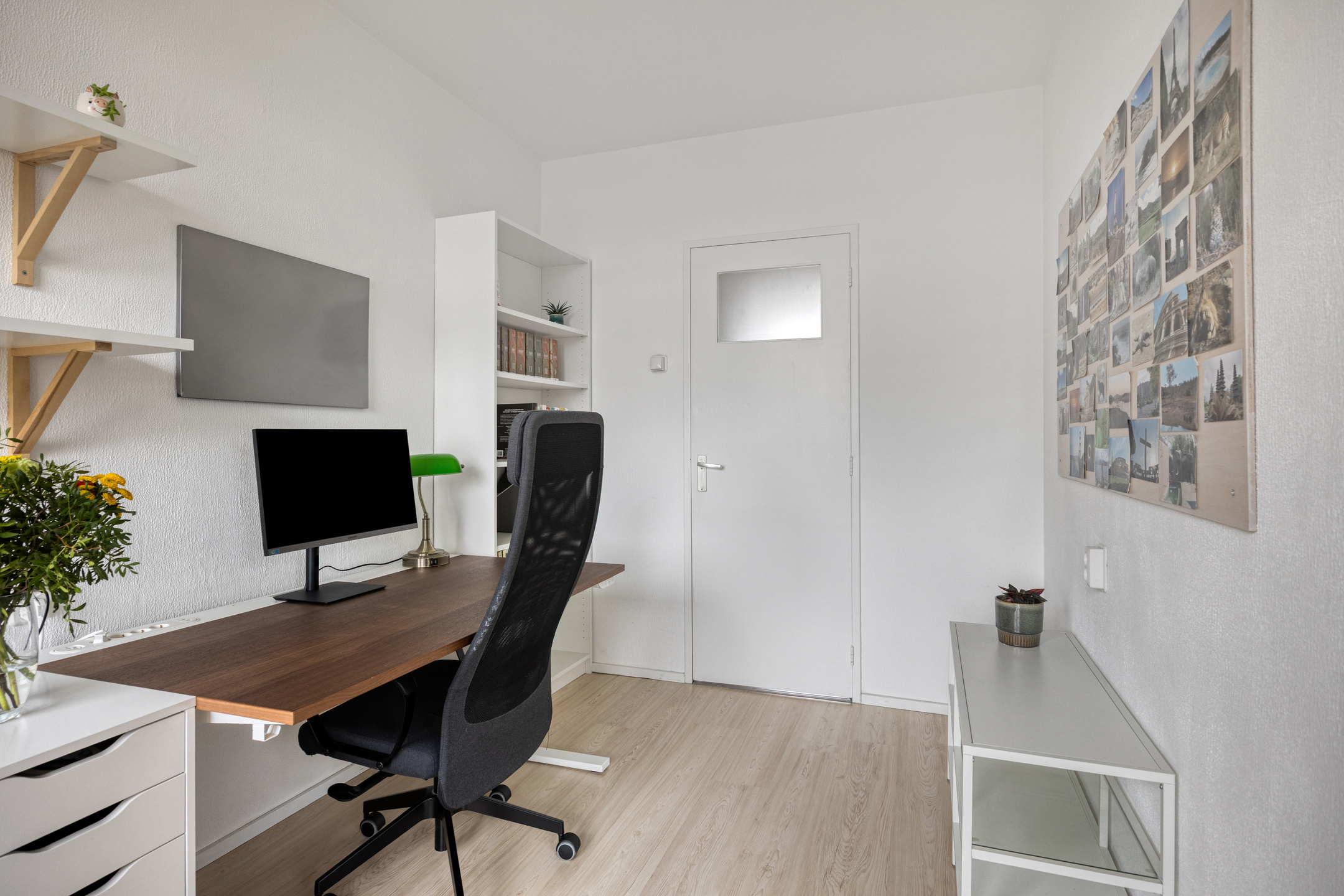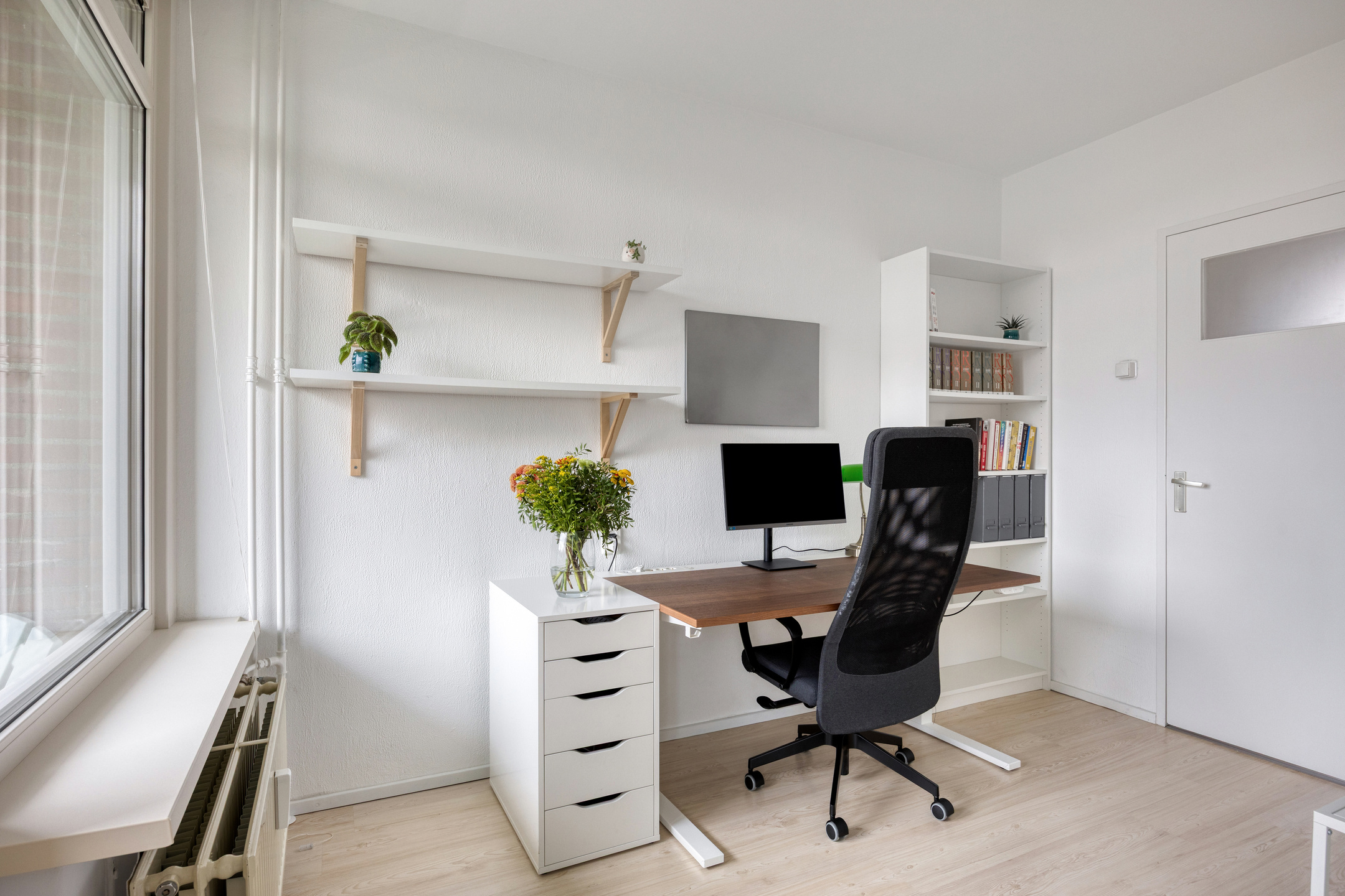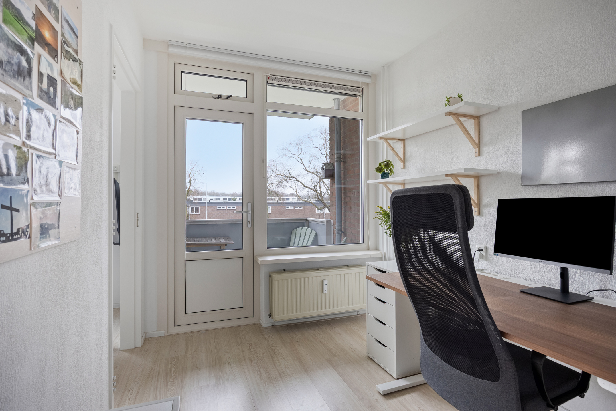 De woonkamer is licht en prettig van formaat, met ruimte voor zowel een zit- als eethoek. De grote raampartijen zorgen voor veel daglicht en een vrij uitzicht, wat het woongevoel extra aangenaam maakt. De woonkamer loopt door in de voormalige tweede slaapkamer welke momenteel is ingericht als werkplek, maar kan eenvoudig weer op deze wijze worden gebruikt door het terugplaatsen van een deur. Vanuit deze kamer is er toegang tot het eerste balkon.