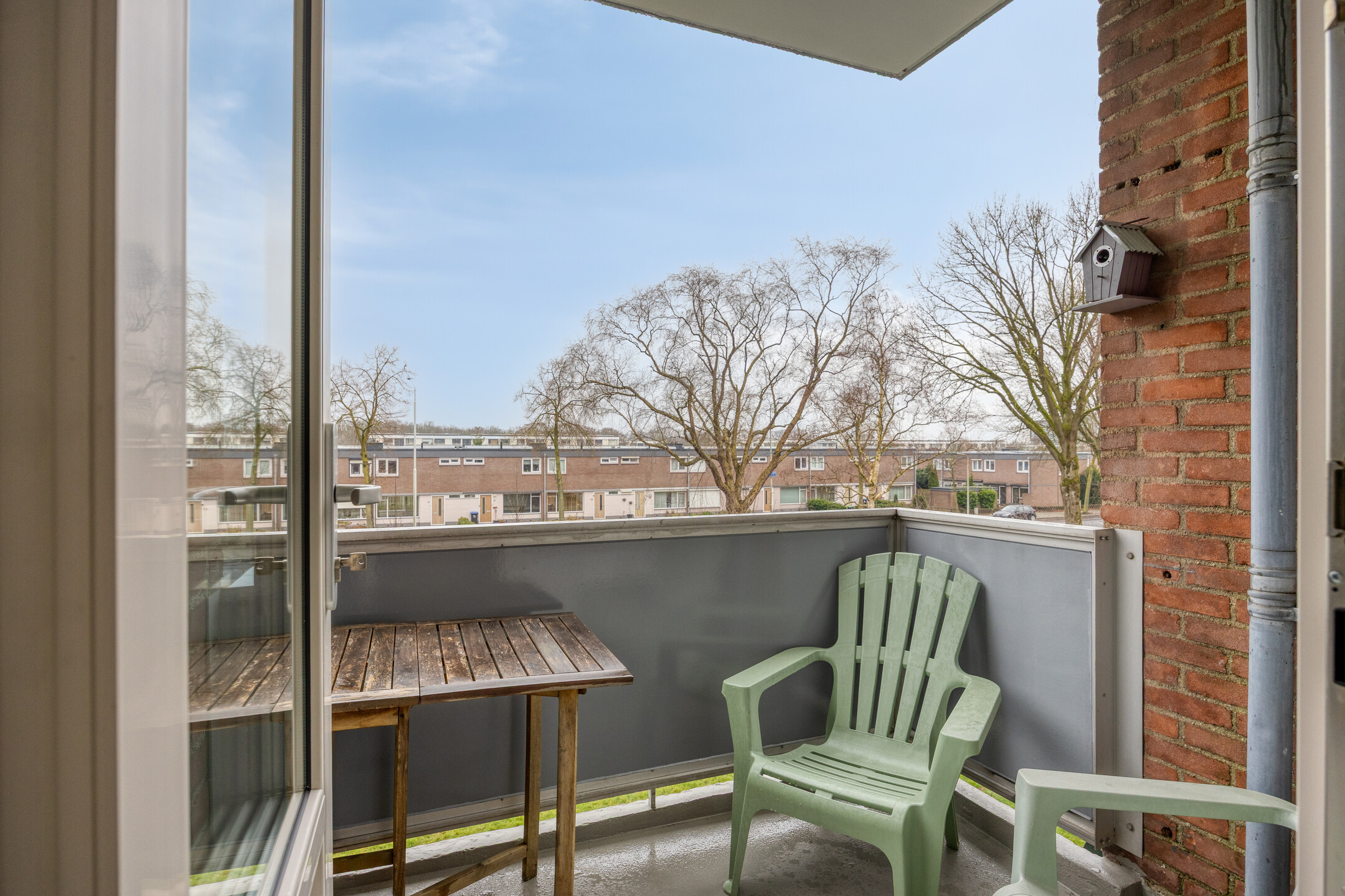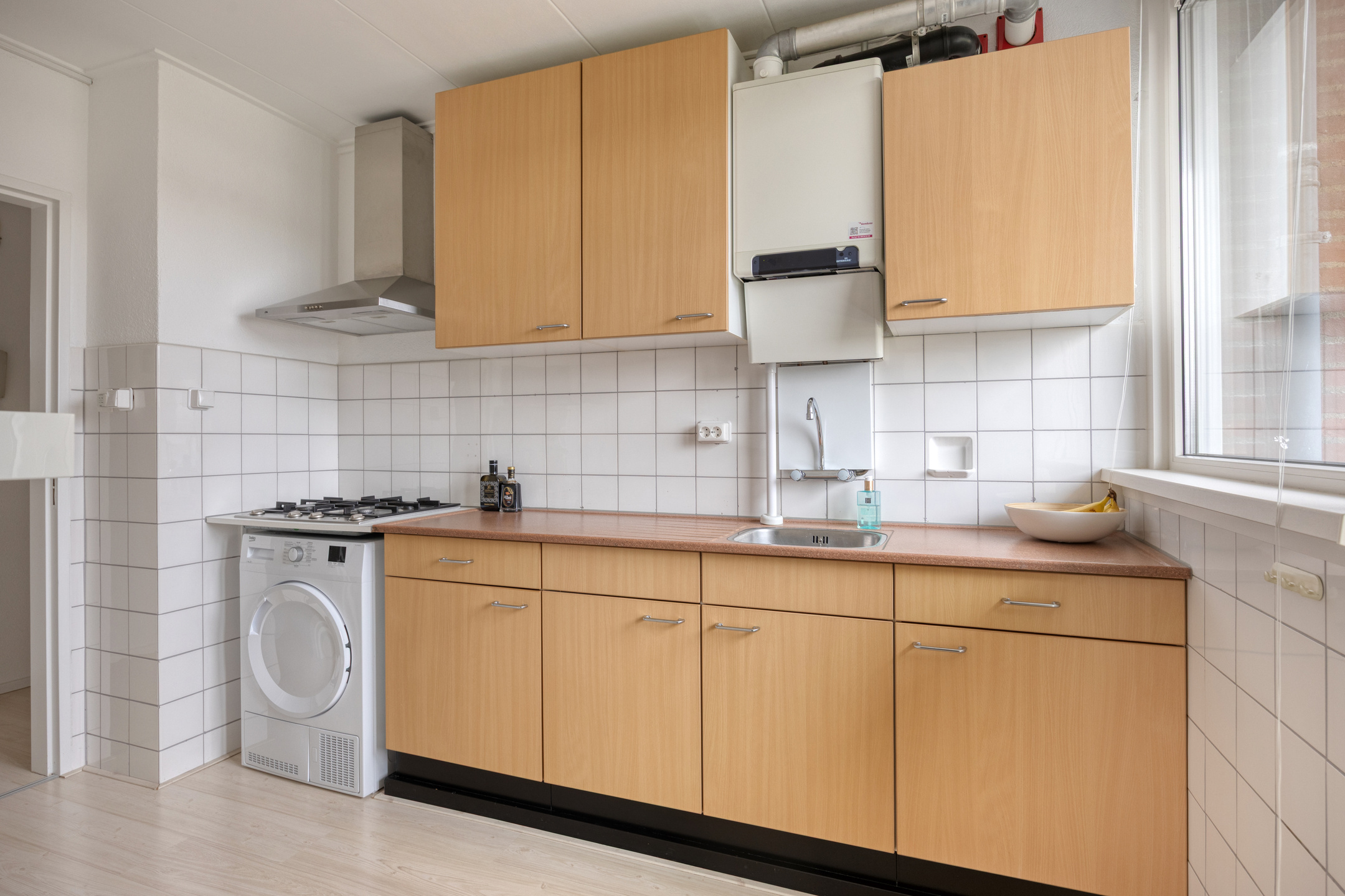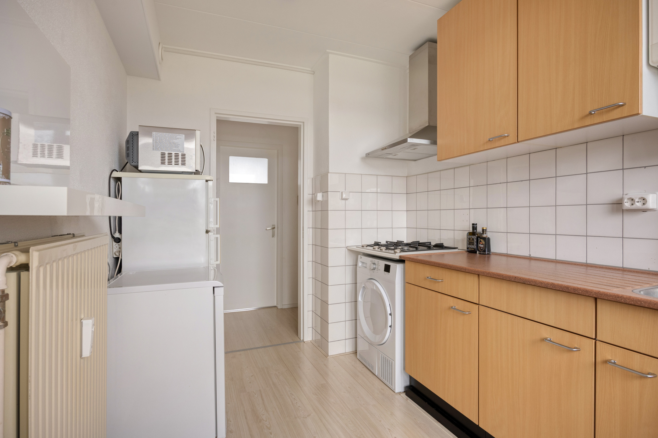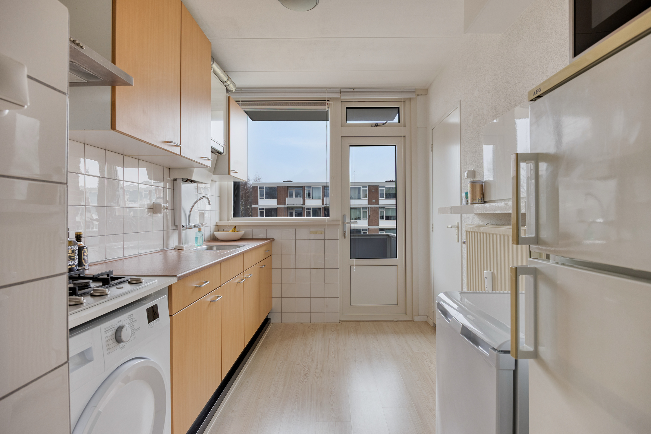 Aansluitend ligt de gesloten keuken in wandopstelling, voorzien van een 4-pits gaskookplaat, afzuigkap, spoelbak, cv-ketel (Intergas, eigendom) en ruimte voor losse koel-/vriesapparatuur. Vanuit de keuken is het tweede balkon bereikbaar: een fijne plek om buiten te zitten.