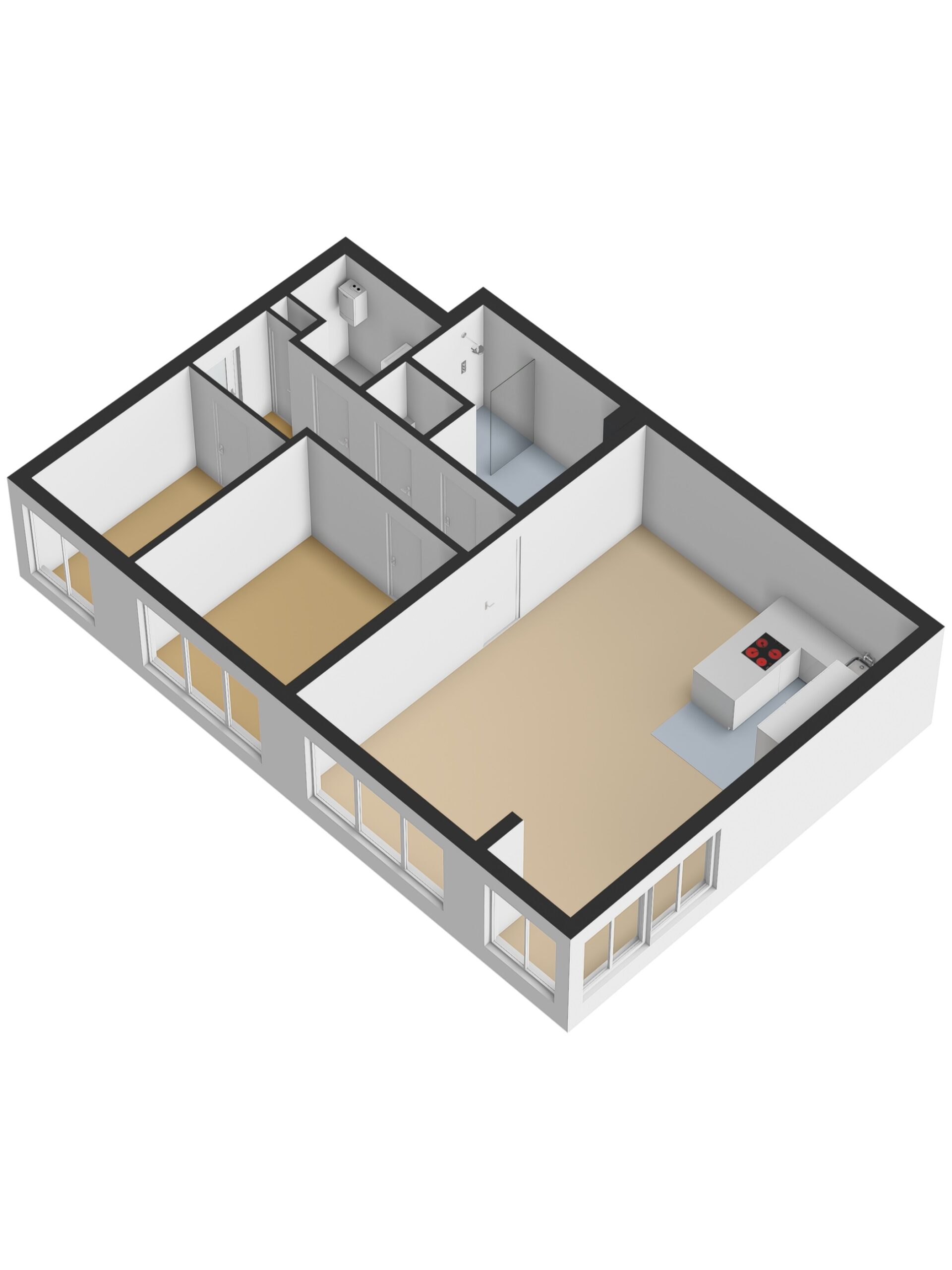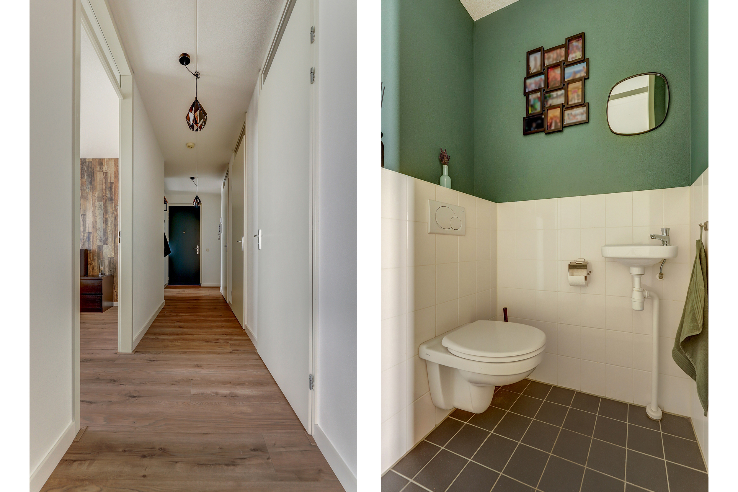Via de centrale hal zijn alle vertrekken bereikbaar. Twee slaapkamers met grote ramen bieden volop licht en flexibiliteit — ideaal voor werken, logeren of een hobbyruimte. De badkamer met inloopdouche en wastafelmeubel is ruim opgezet, met desgewenst nog voldoende plek voor een ligbad.