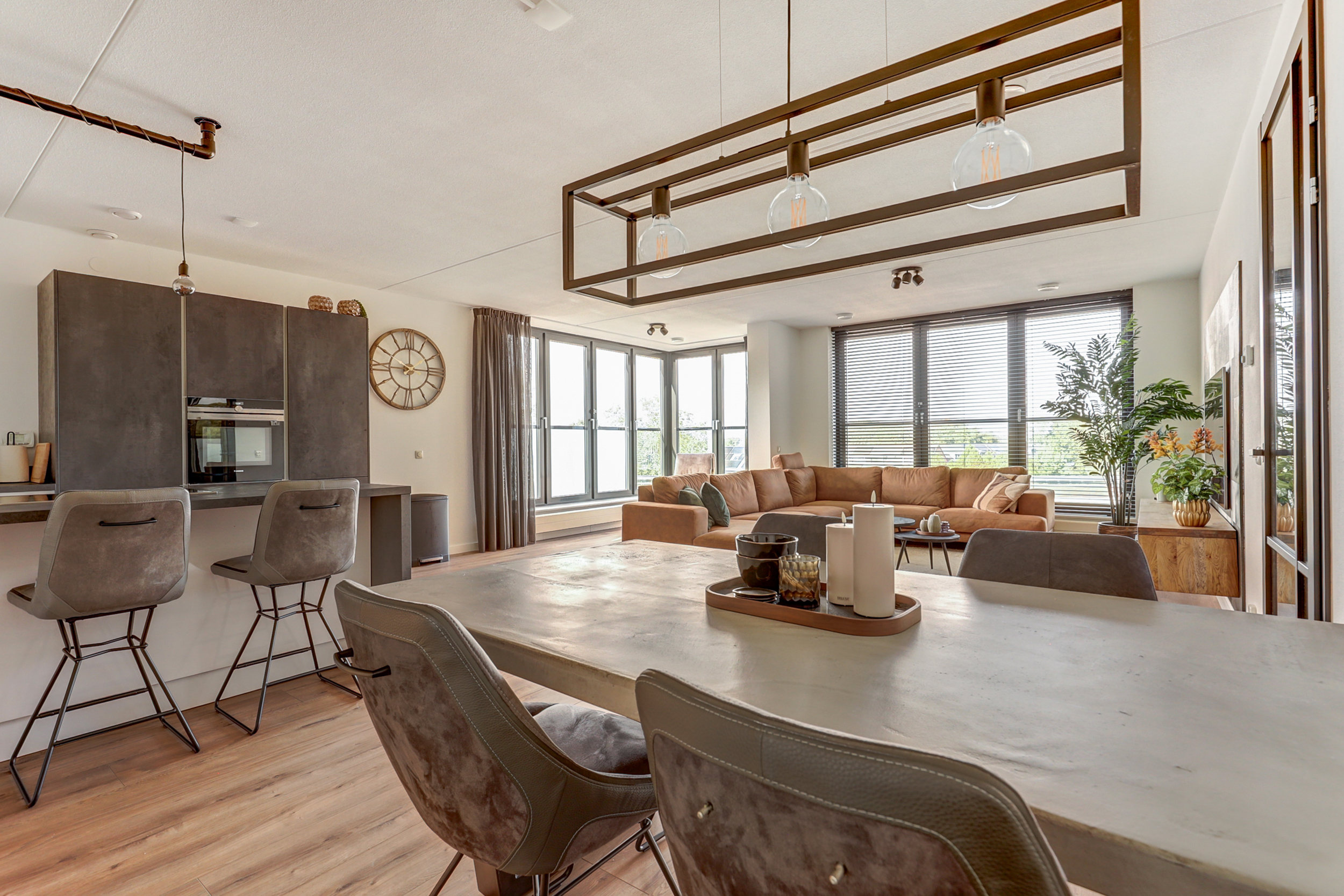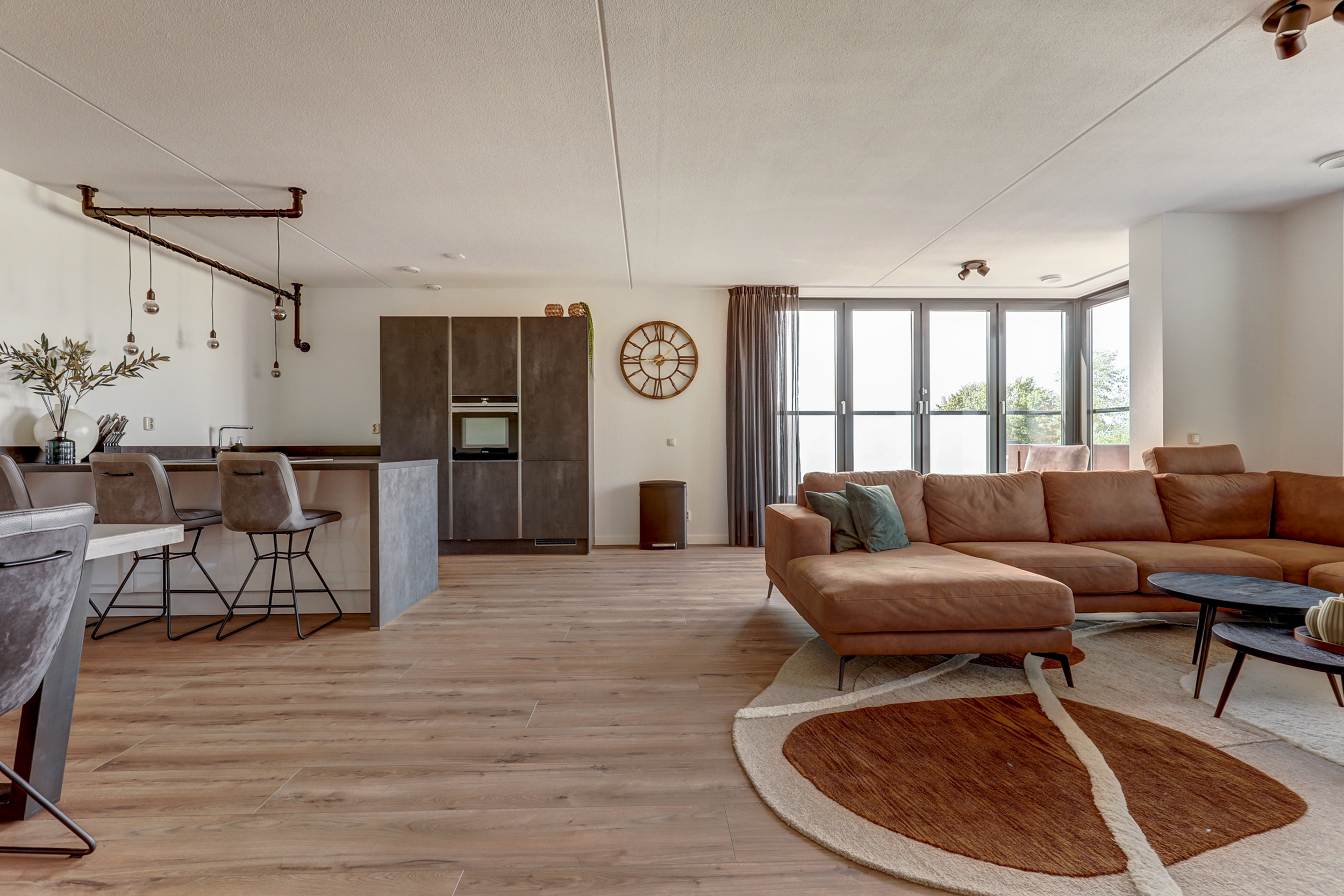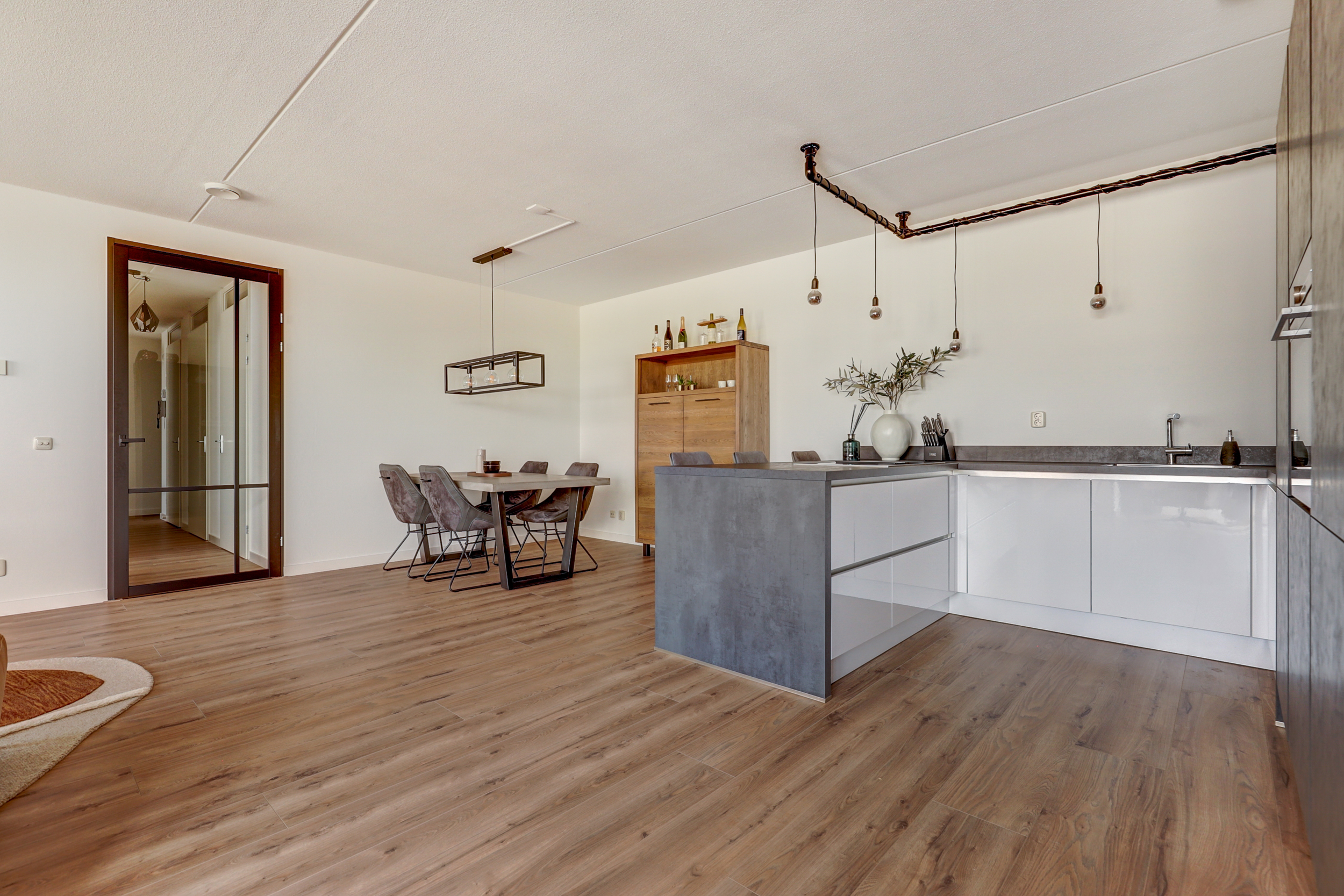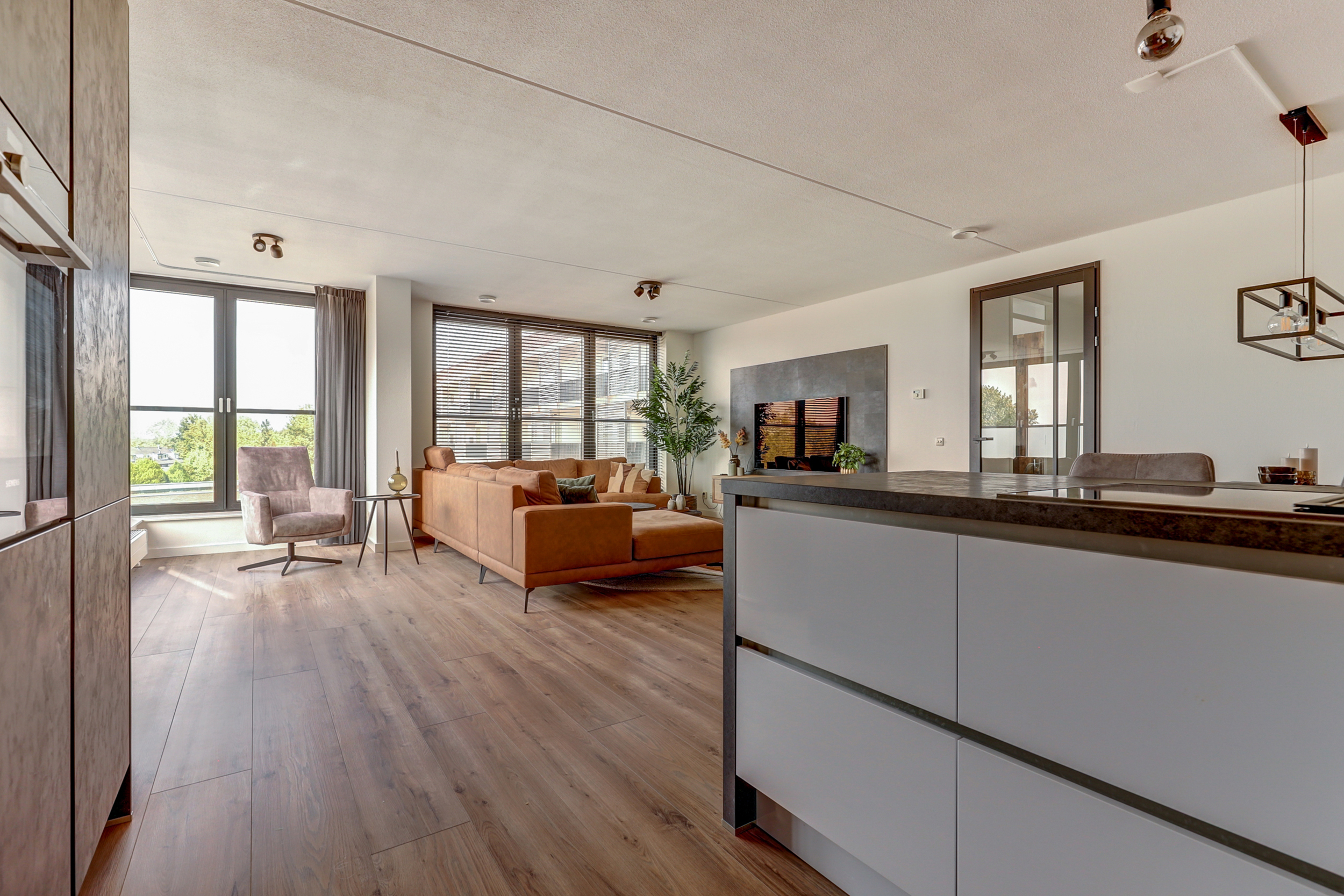 De woonkamer ligt prachtig op de hoek van de woontoren, met grote raampartijen die het daglicht rijkelijk binnenlaten. Hier geniet je van rust, privacy en uitzicht over het binnenterrein. De open keuken in wit-grijze U-opstelling vormt een stijlvol geheel en is voorzien van moderne inbouwapparatuur: inductiekookplaat met geïntegreerde afzuiging, combi-oven, vaatwasser en koel-vriescombinatie.