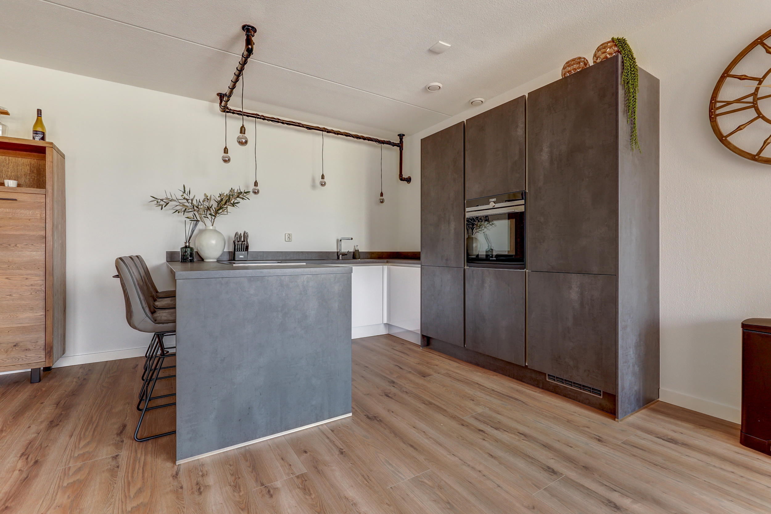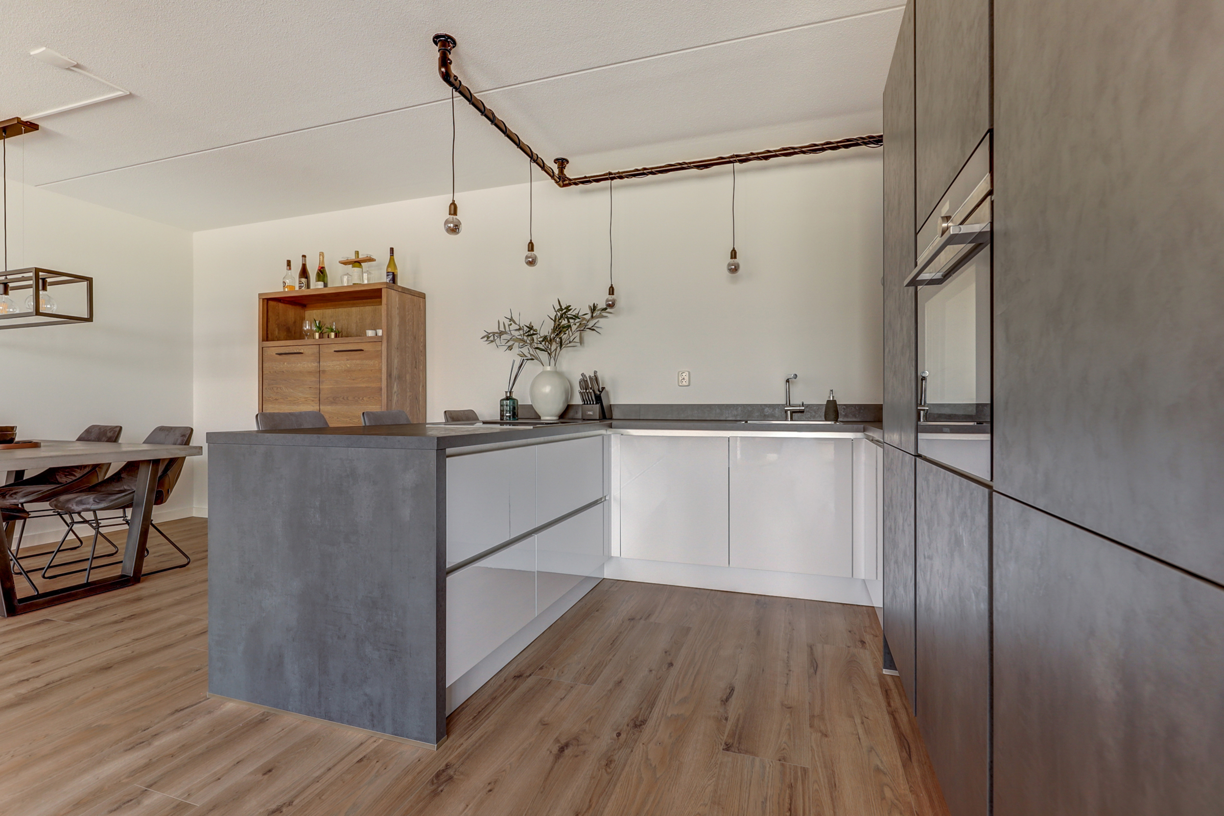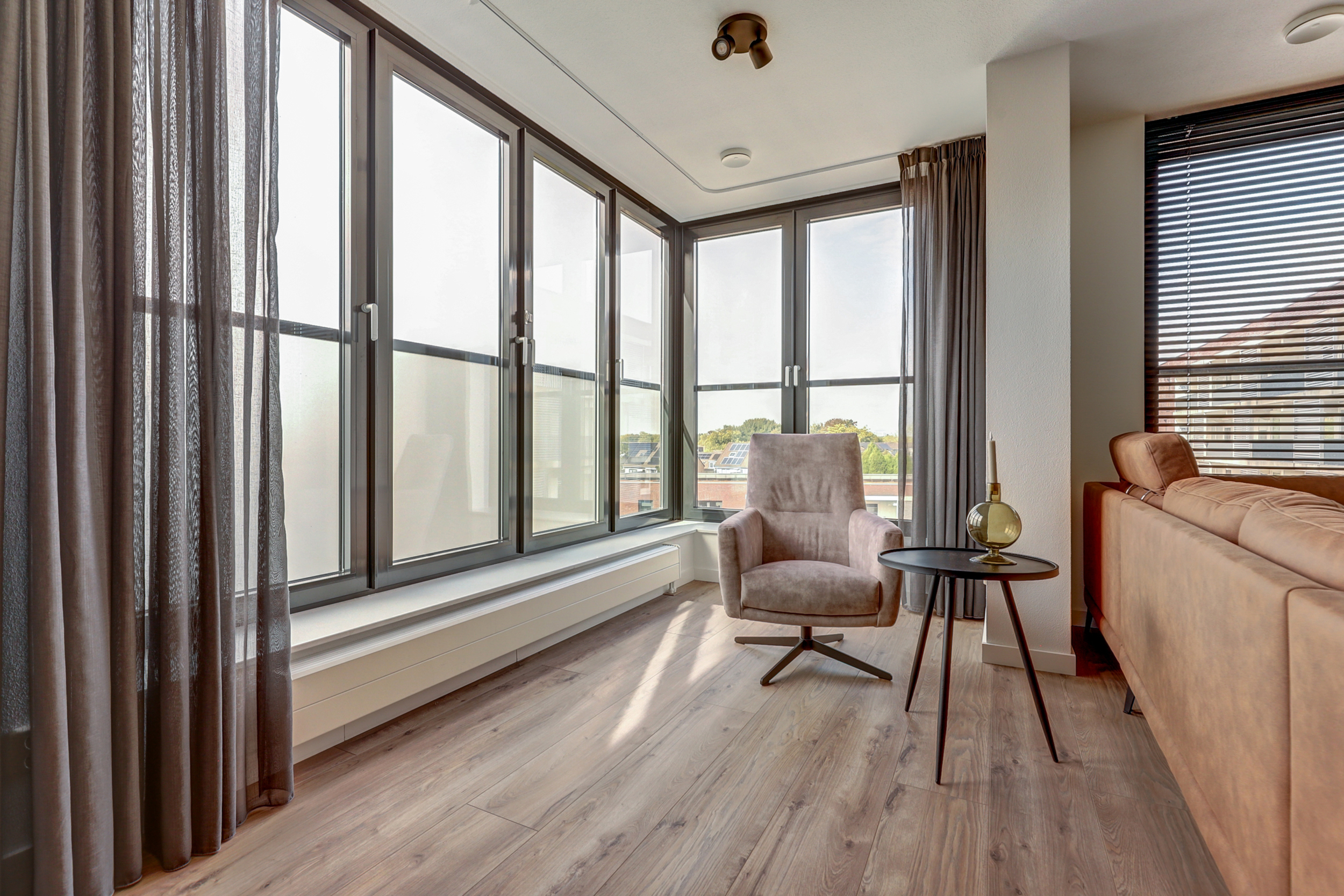 De woonkamer ligt prachtig op de hoek van de woontoren, met grote raampartijen die het daglicht rijkelijk binnenlaten. Hier geniet je van rust, privacy en uitzicht over het binnenterrein. De open keuken in wit-grijze U-opstelling vormt een stijlvol geheel en is voorzien van moderne inbouwapparatuur: inductiekookplaat met geïntegreerde afzuiging, combi-oven, vaatwasser en koel-vriescombinatie.