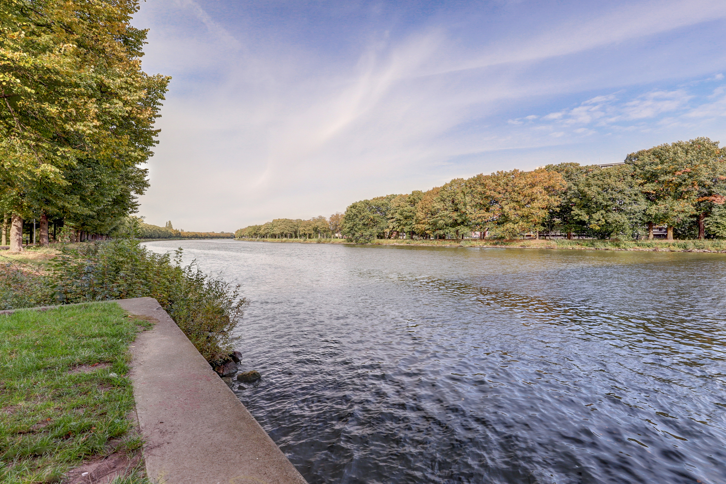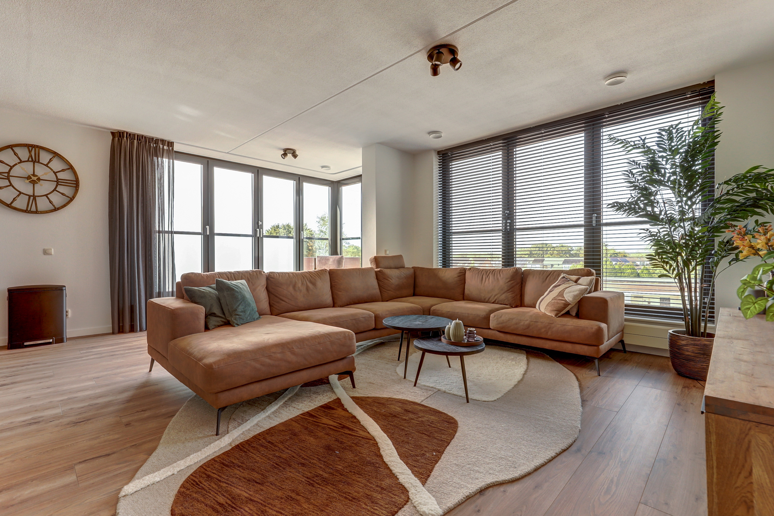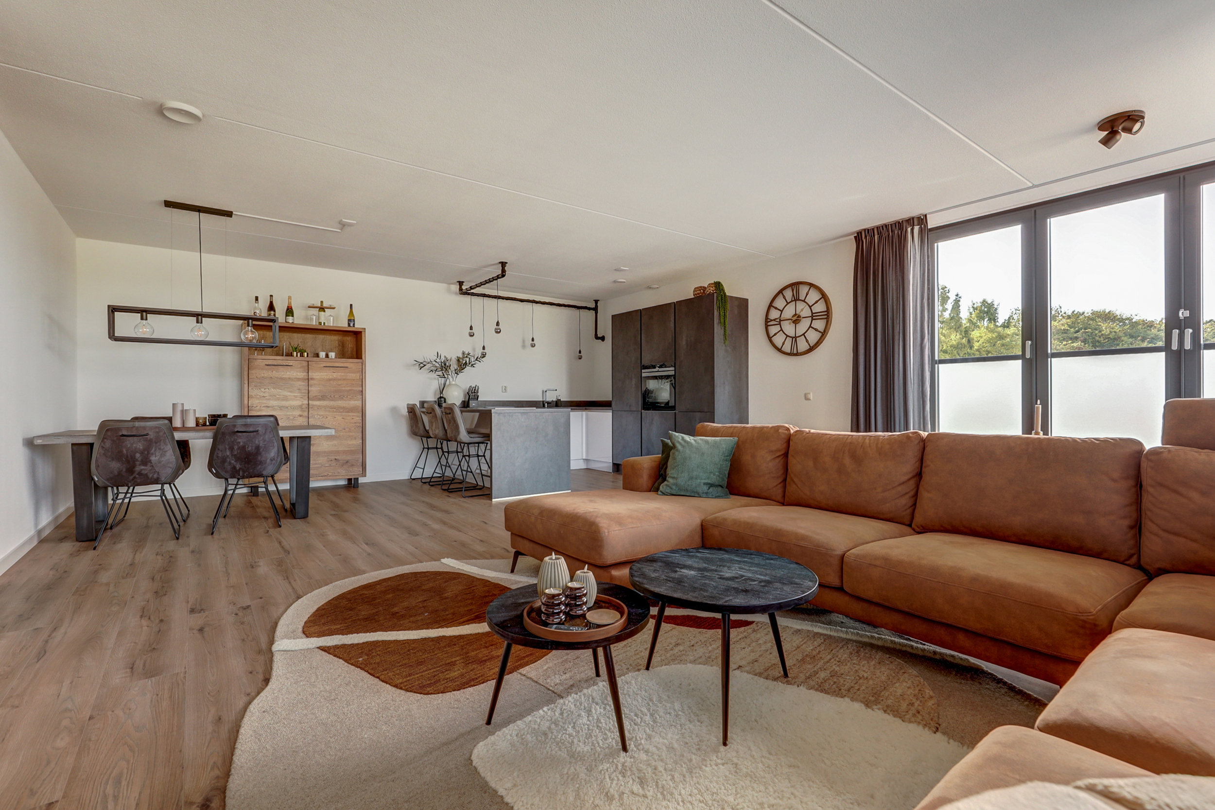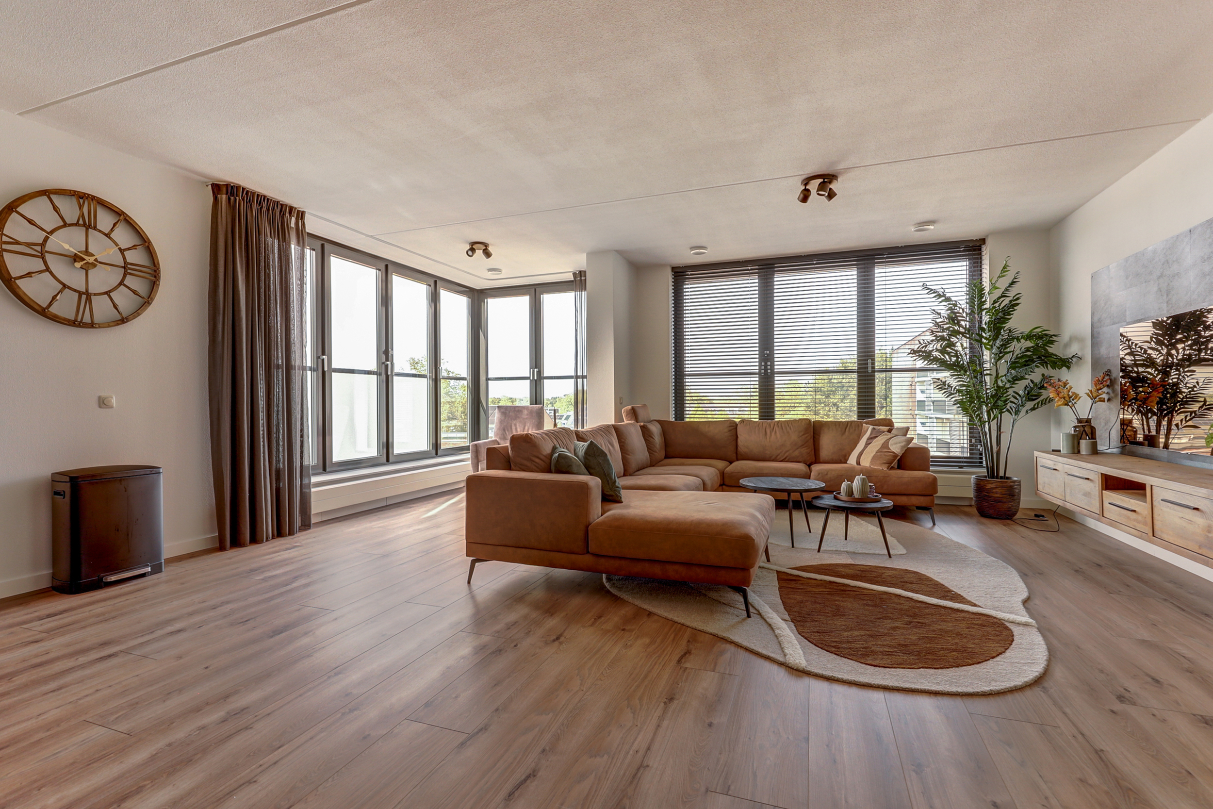 De woonkamer ligt prachtig op de hoek van de woontoren, met grote raampartijen die het daglicht rijkelijk binnenlaten. Hier geniet je van rust, privacy en uitzicht over het binnenterrein. De open keuken in wit-grijze U-opstelling vormt een stijlvol geheel en is voorzien van moderne inbouwapparatuur: inductiekookplaat met geïntegreerde afzuiging, combi-oven, vaatwasser en koel-vriescombinatie.