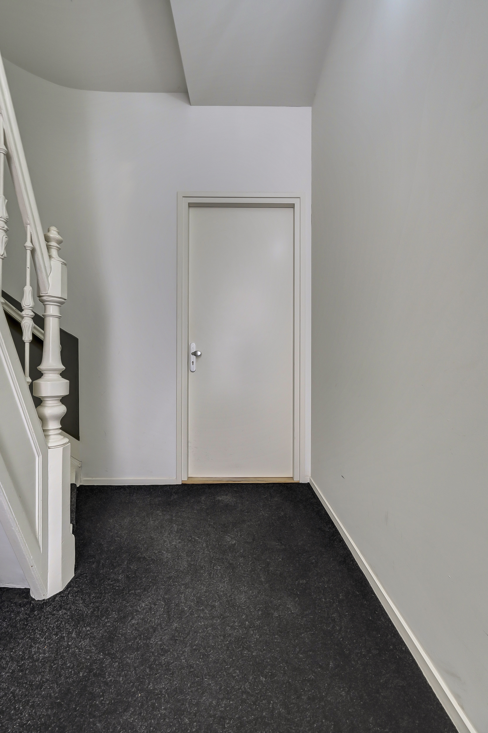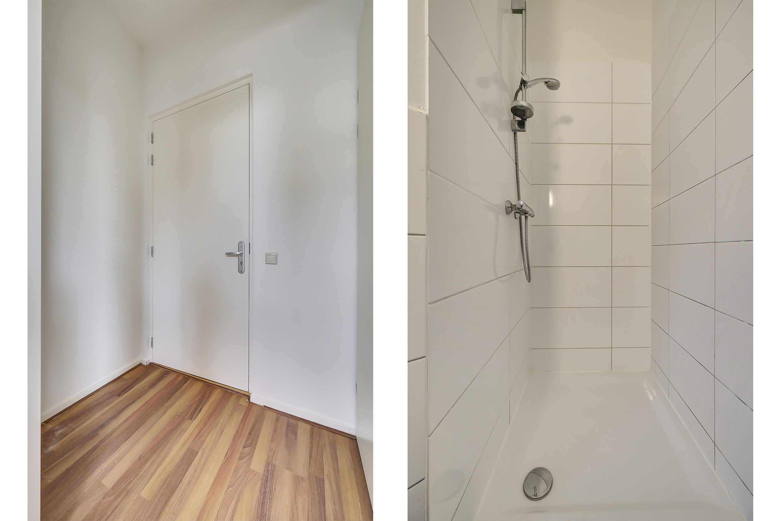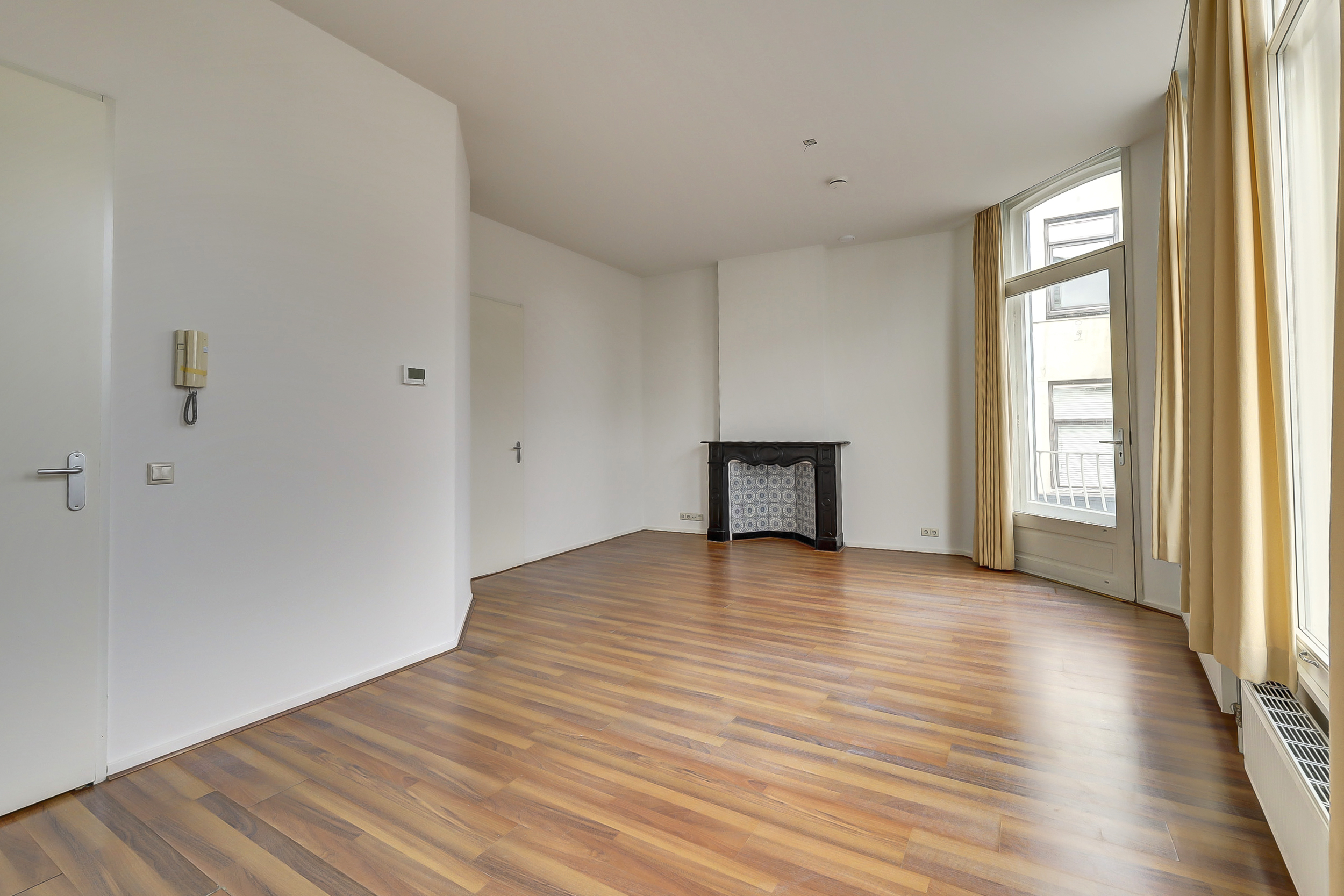 Entree naar het appartement met hal en toegang tot alle vertrekken. De lichte woonkamer beschikt over een sfeervolle schouw, een Frans balkon en een open keuken in wandopstelling. De keuken is voorzien van een 4-pits gaskookplaat, afzuigkap, combioven en spoelbak – compact maar compleet ingericht voor dagelijks gebruik.