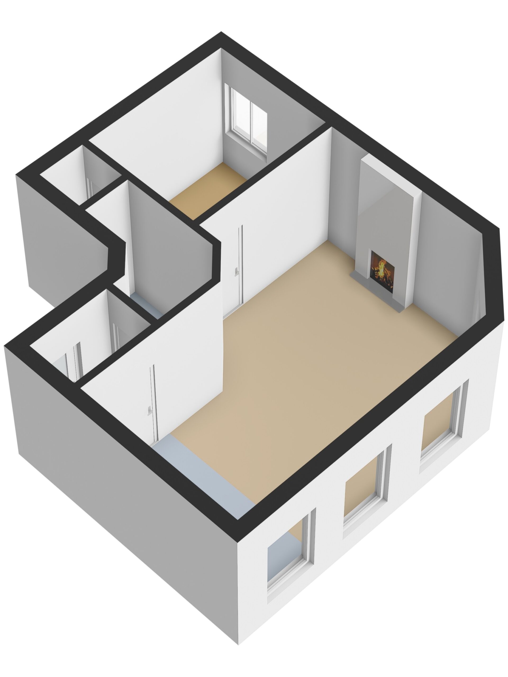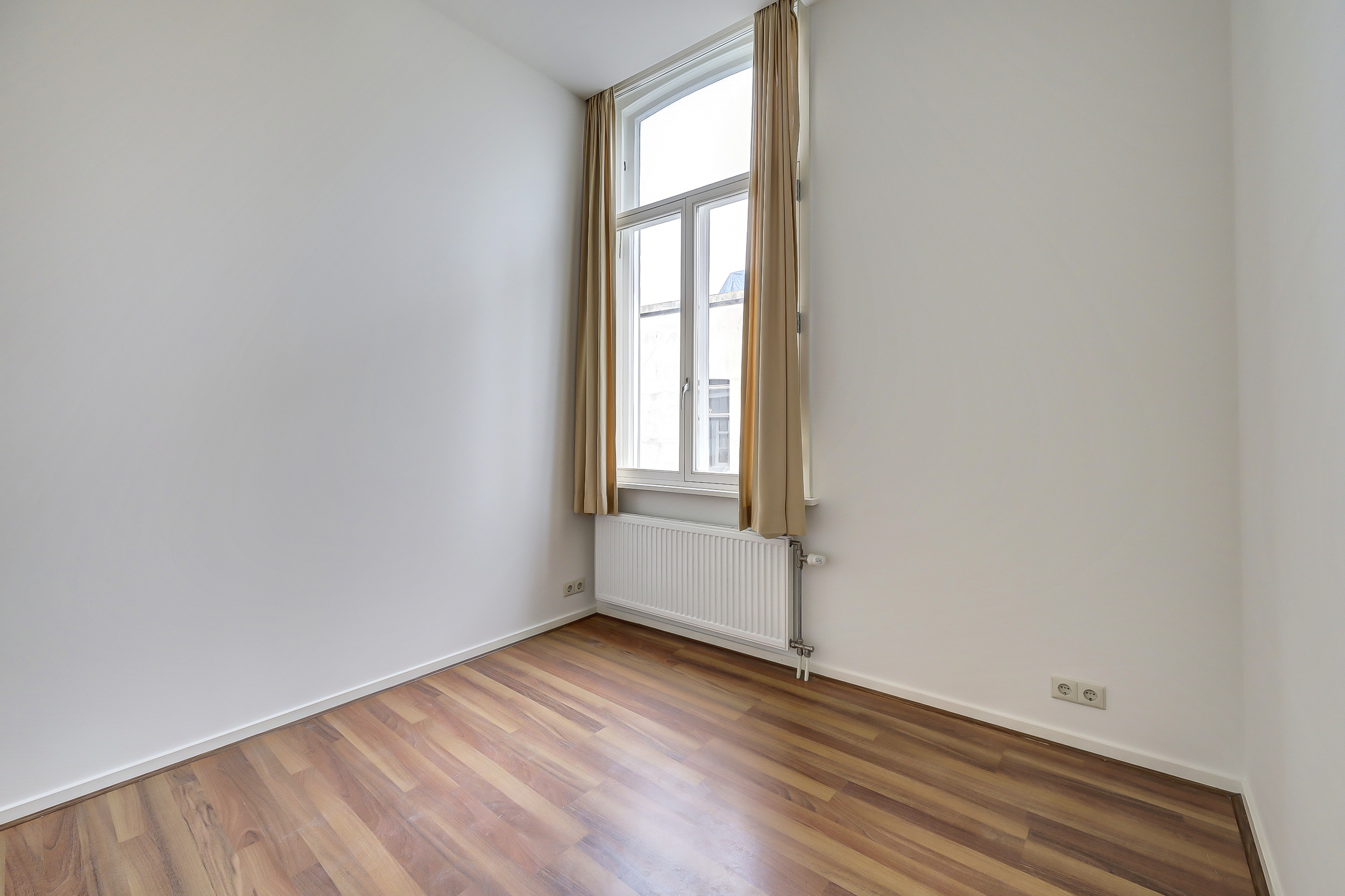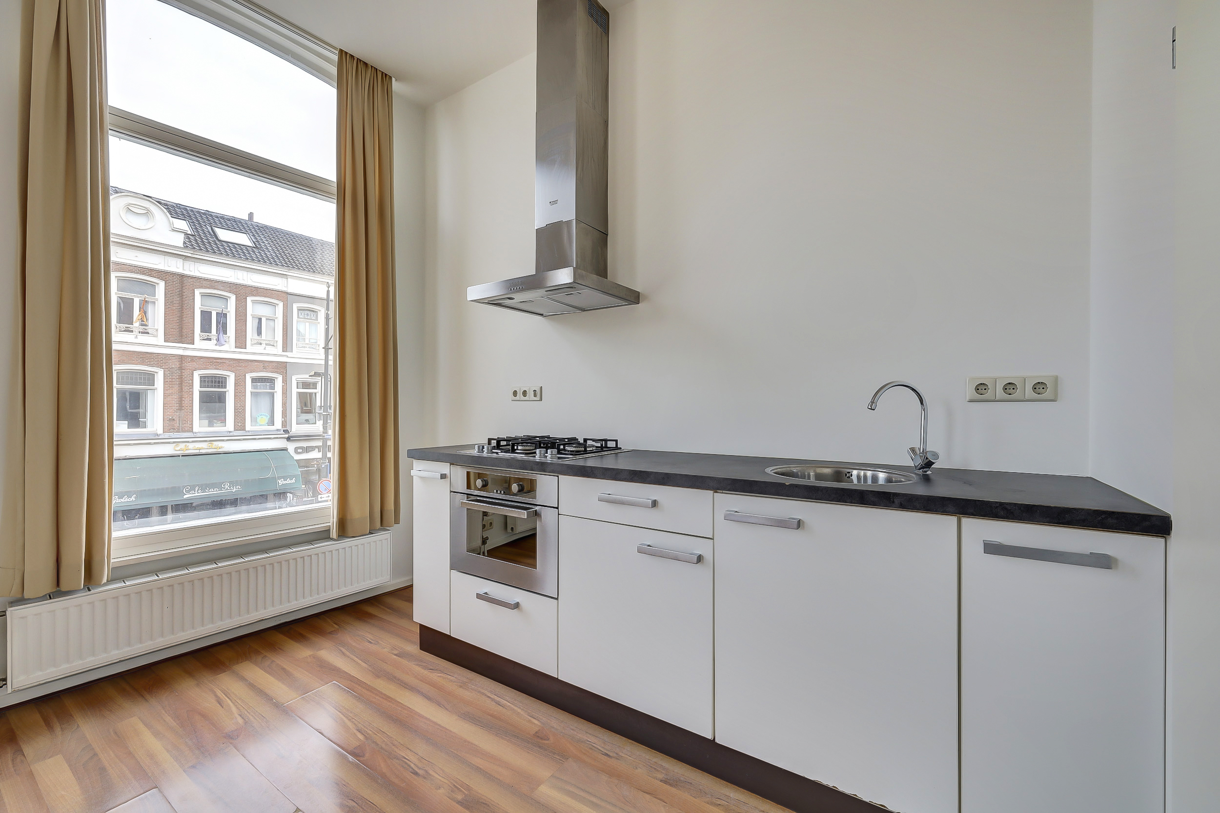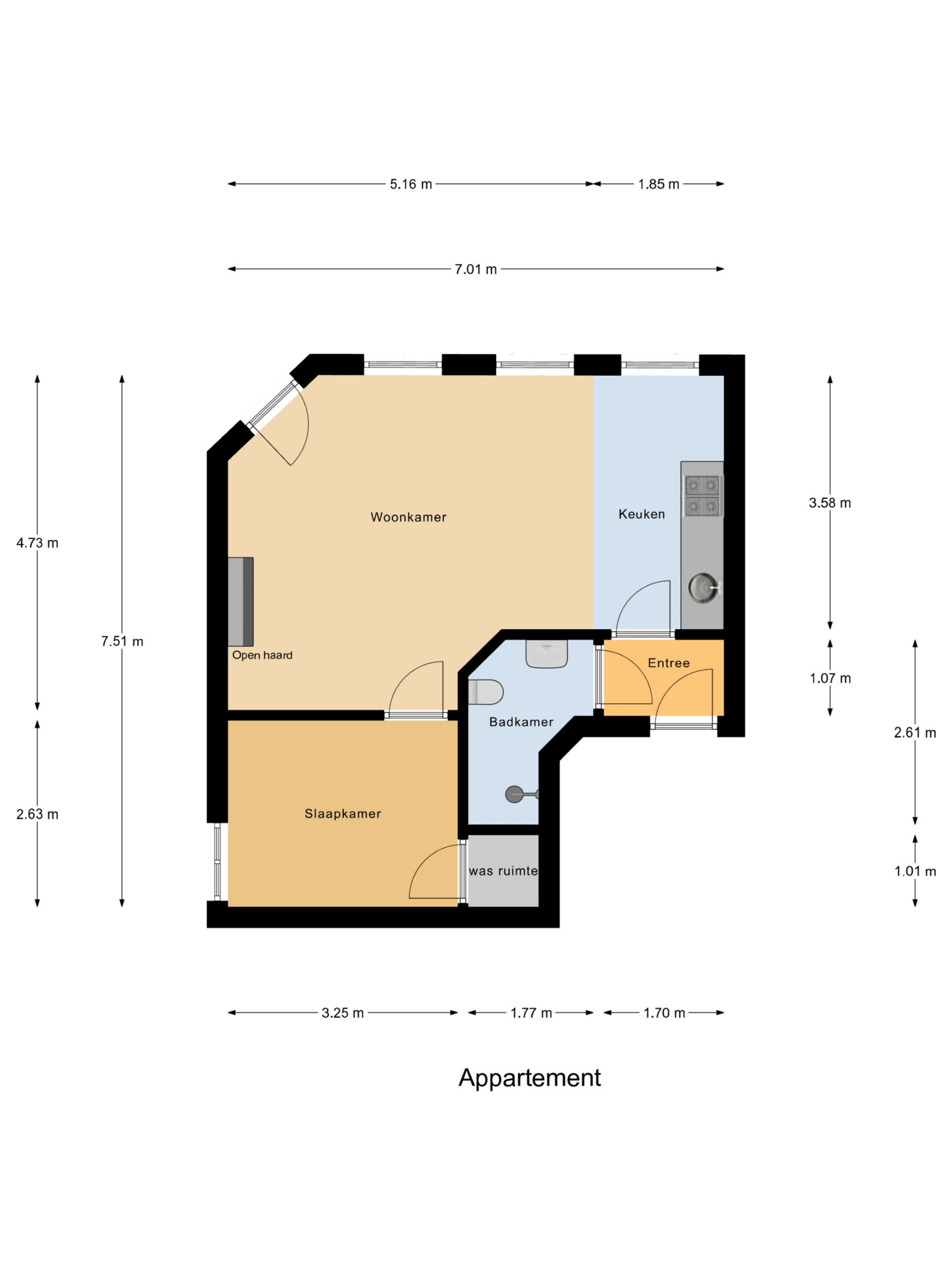 Entree naar het appartement met hal en toegang tot alle vertrekken. De lichte woonkamer beschikt over een sfeervolle schouw, een Frans balkon en een open keuken in wandopstelling. De keuken is voorzien van een 4-pits gaskookplaat, afzuigkap, combioven en spoelbak – compact maar compleet ingericht voor dagelijks gebruik.