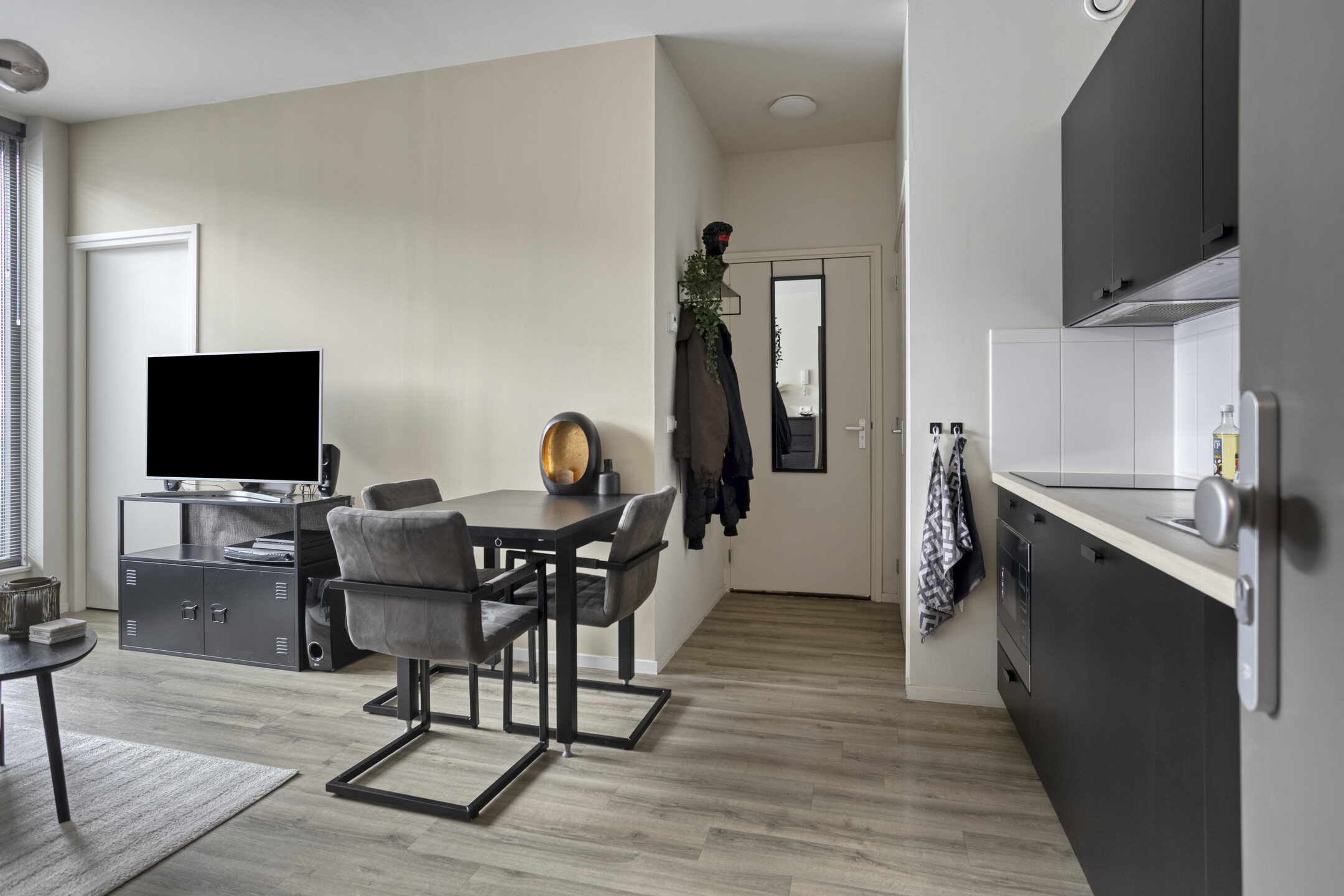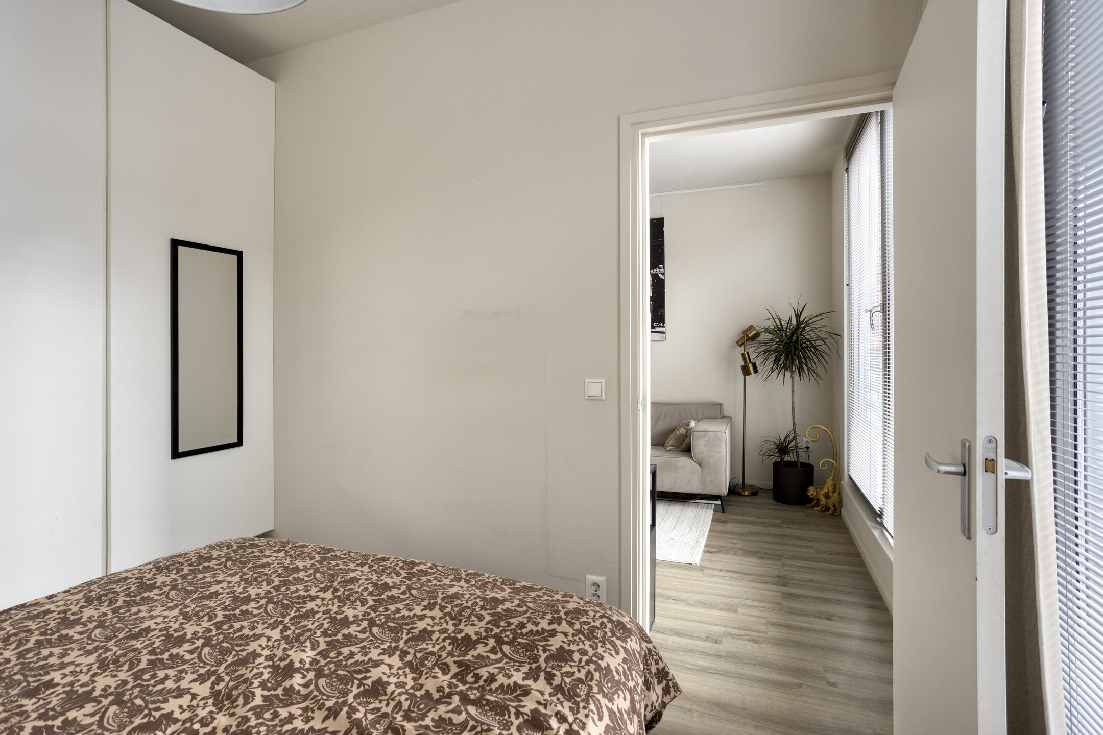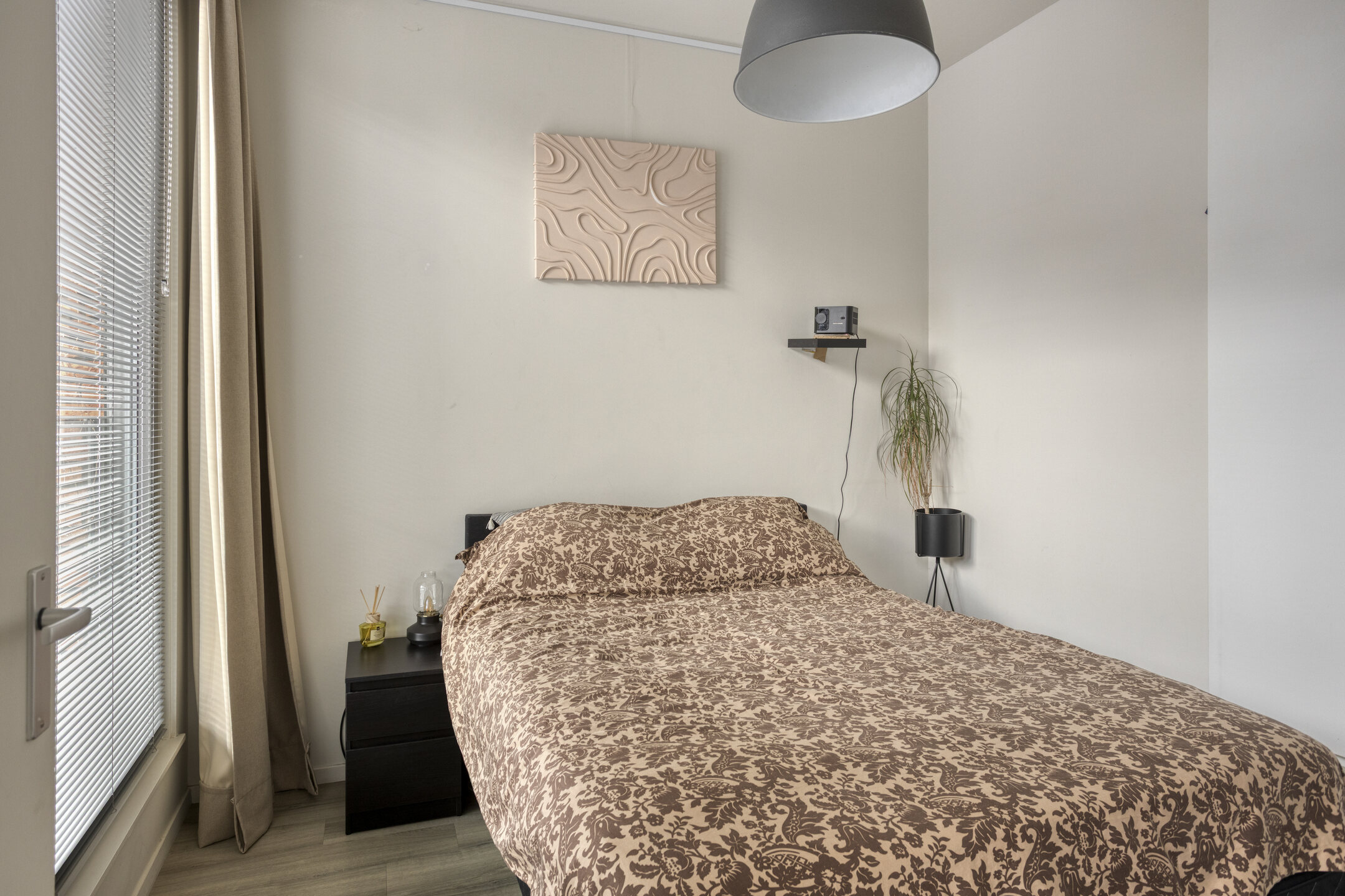 Bij binnenkomst valt direct de prettige lichtinval op. De woonkamer is afgewerkt met een nette PVCvloer en voorzien van grote raampartijen en een brede openslaande deur voor het Franse balkon. De slaapkamer bied ruimte aan een garderobekast in een nis en heeft ook grote ramen voor veel daglicht.