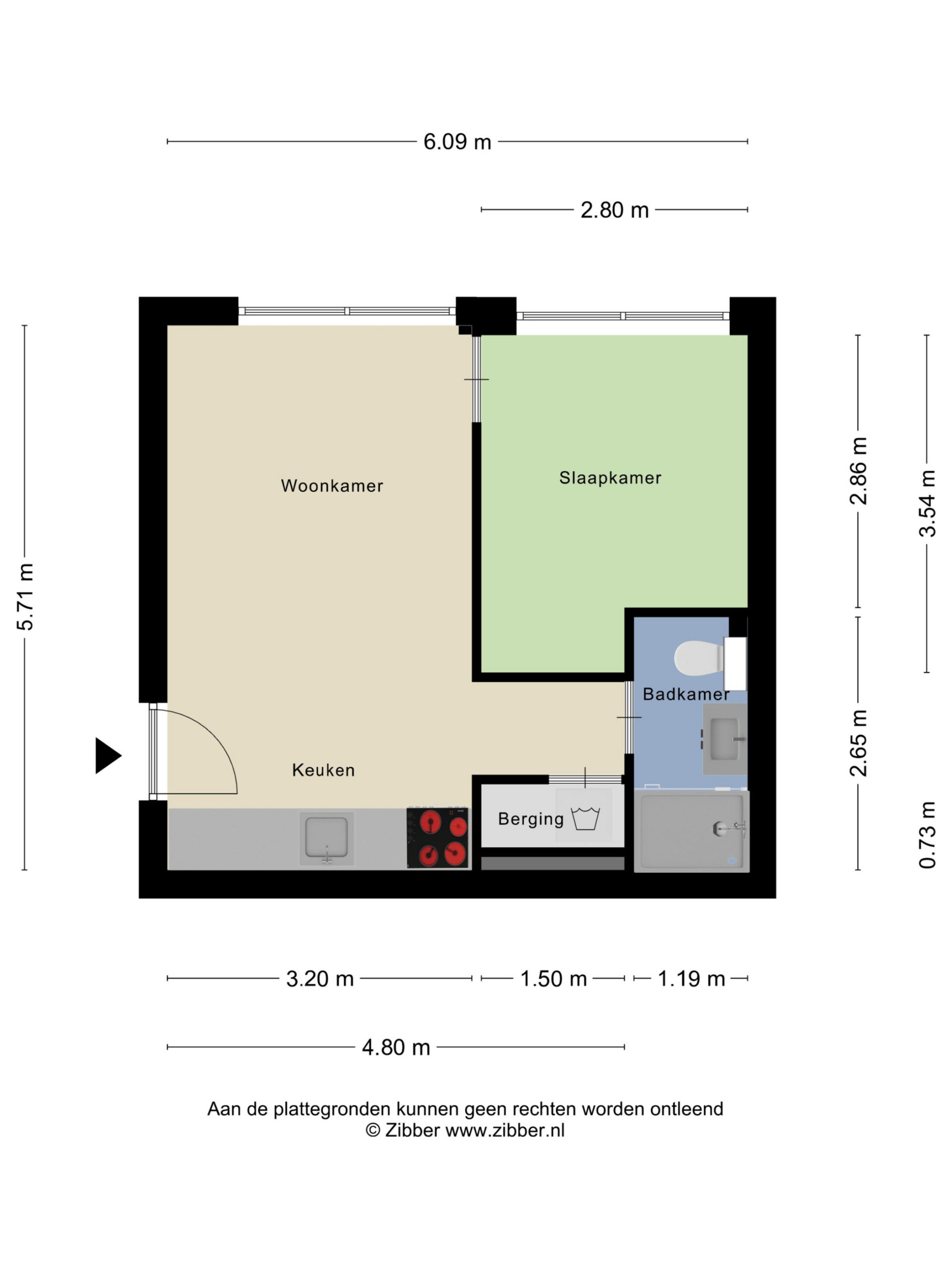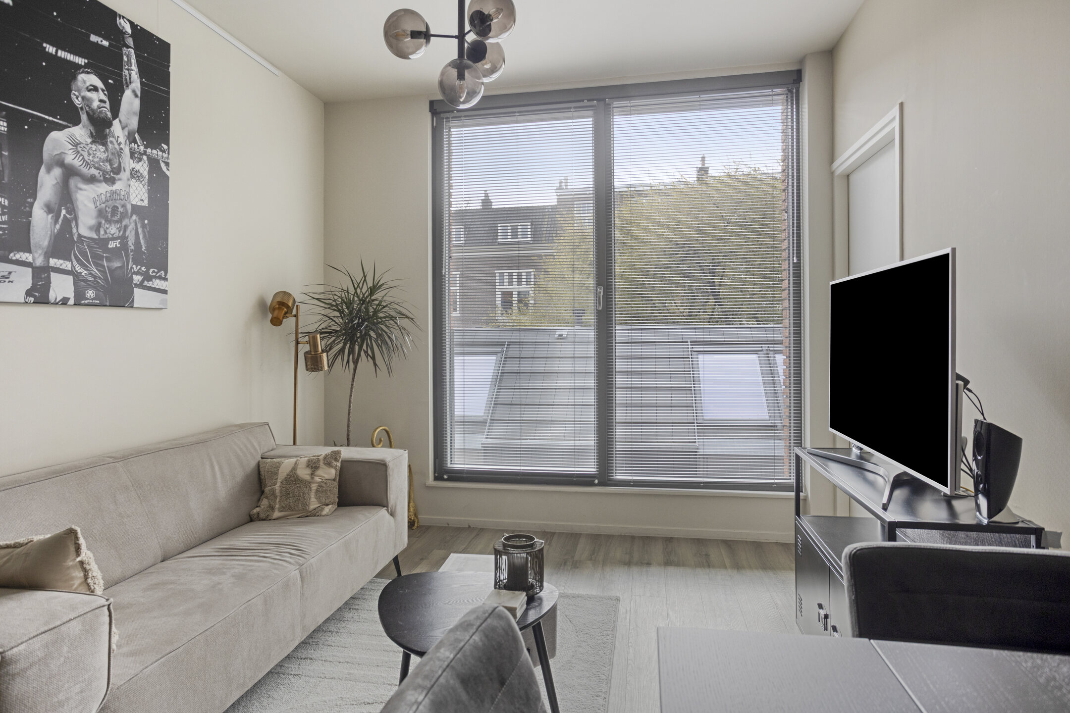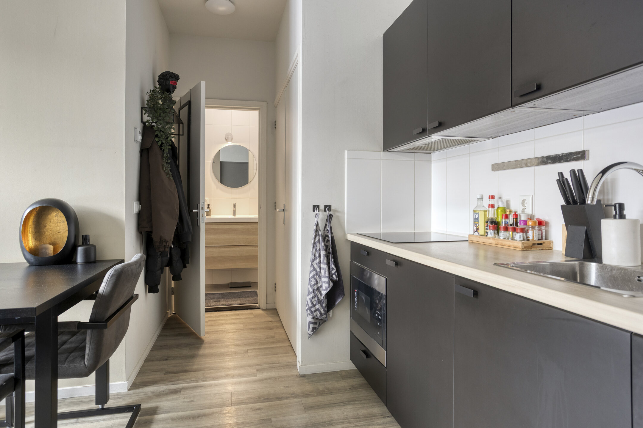 Bij binnenkomst valt direct de prettige lichtinval op. De woonkamer is afgewerkt met een nette PVCvloer en voorzien van grote raampartijen en een brede openslaande deur voor het Franse balkon. De slaapkamer bied ruimte aan een garderobekast in een nis en heeft ook grote ramen voor veel daglicht.