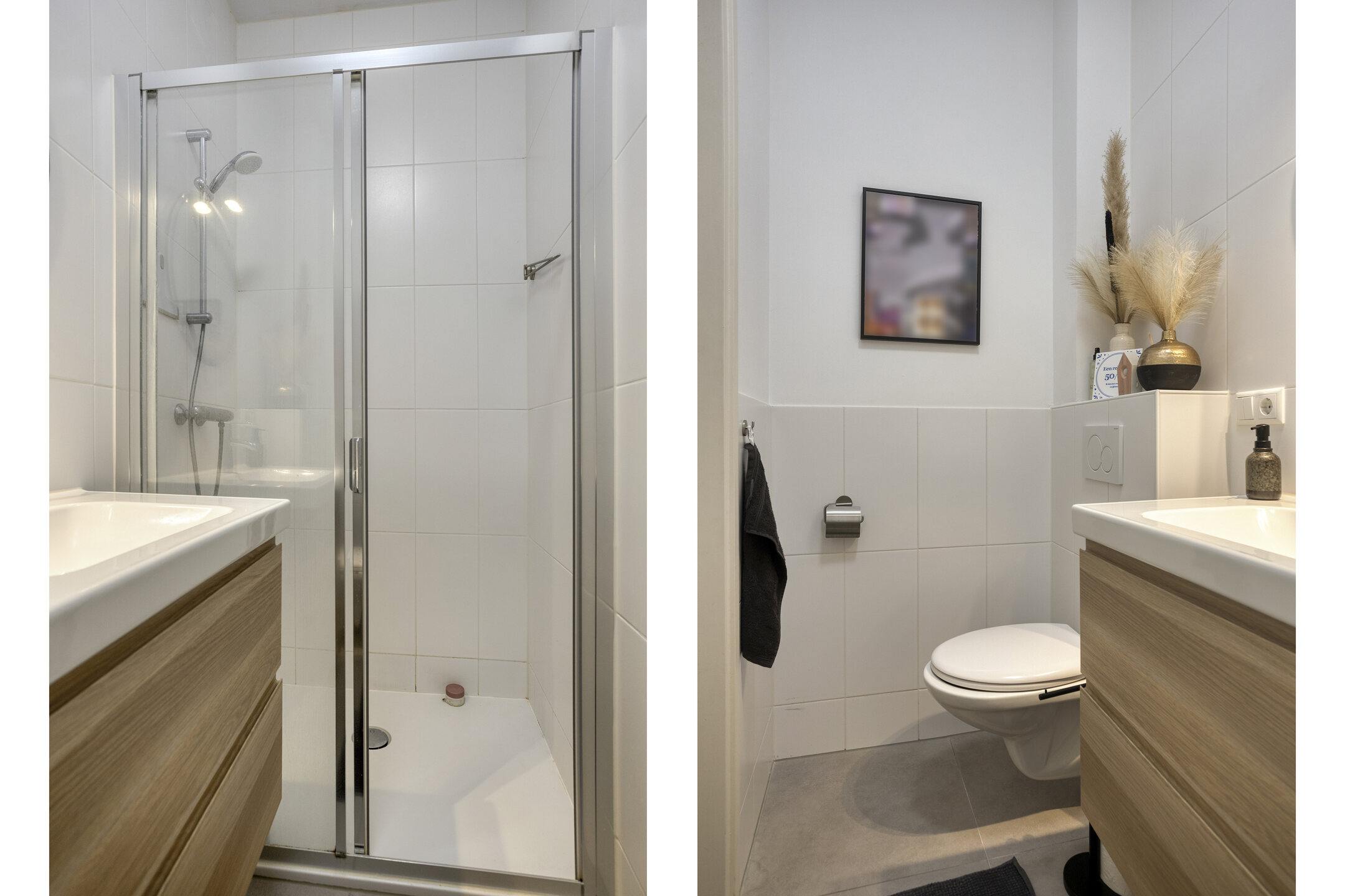 De badkamer is modern en compleet uitgevoerd met een inloopdouche, wastafelmeubel en toilet.