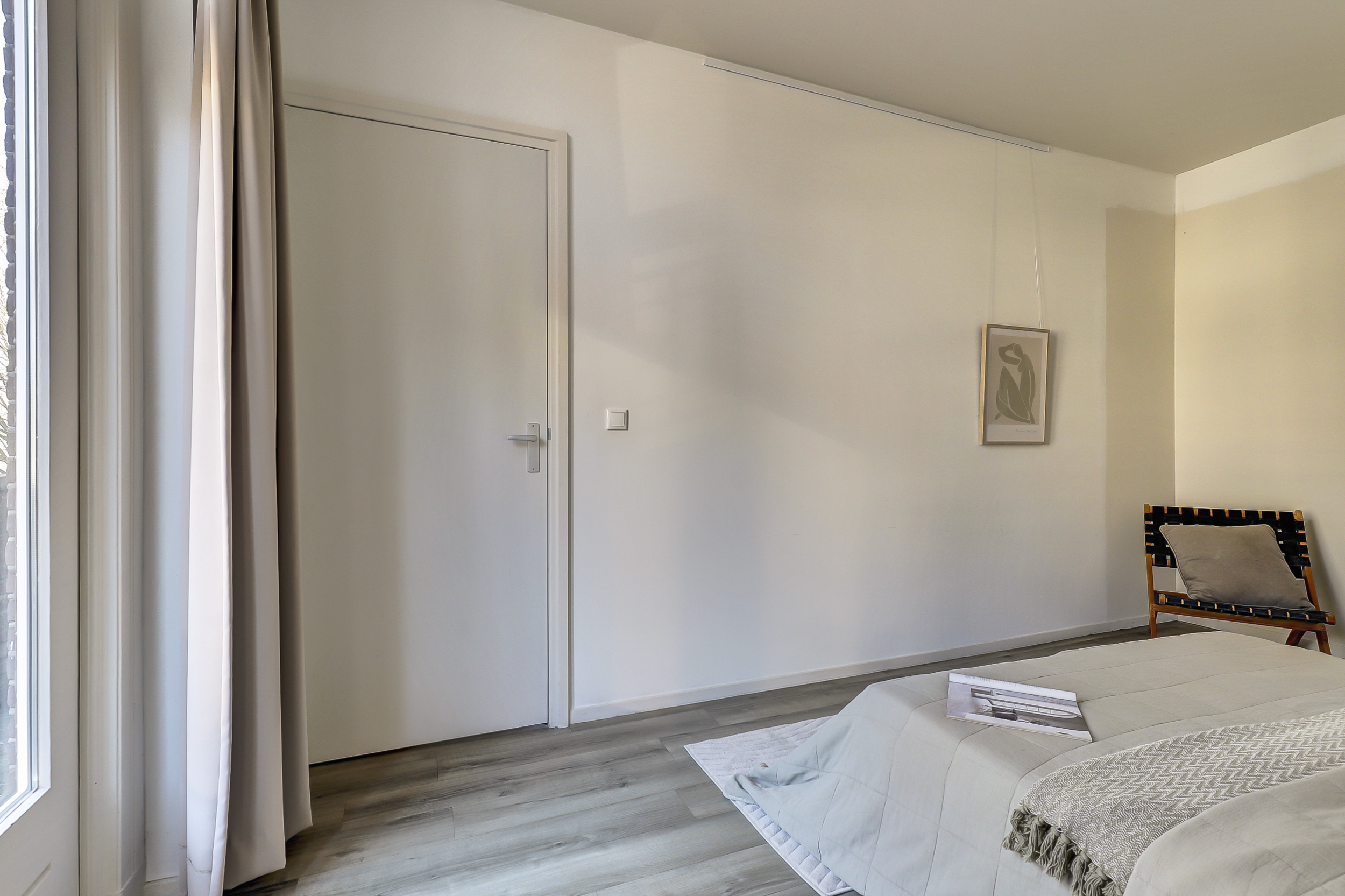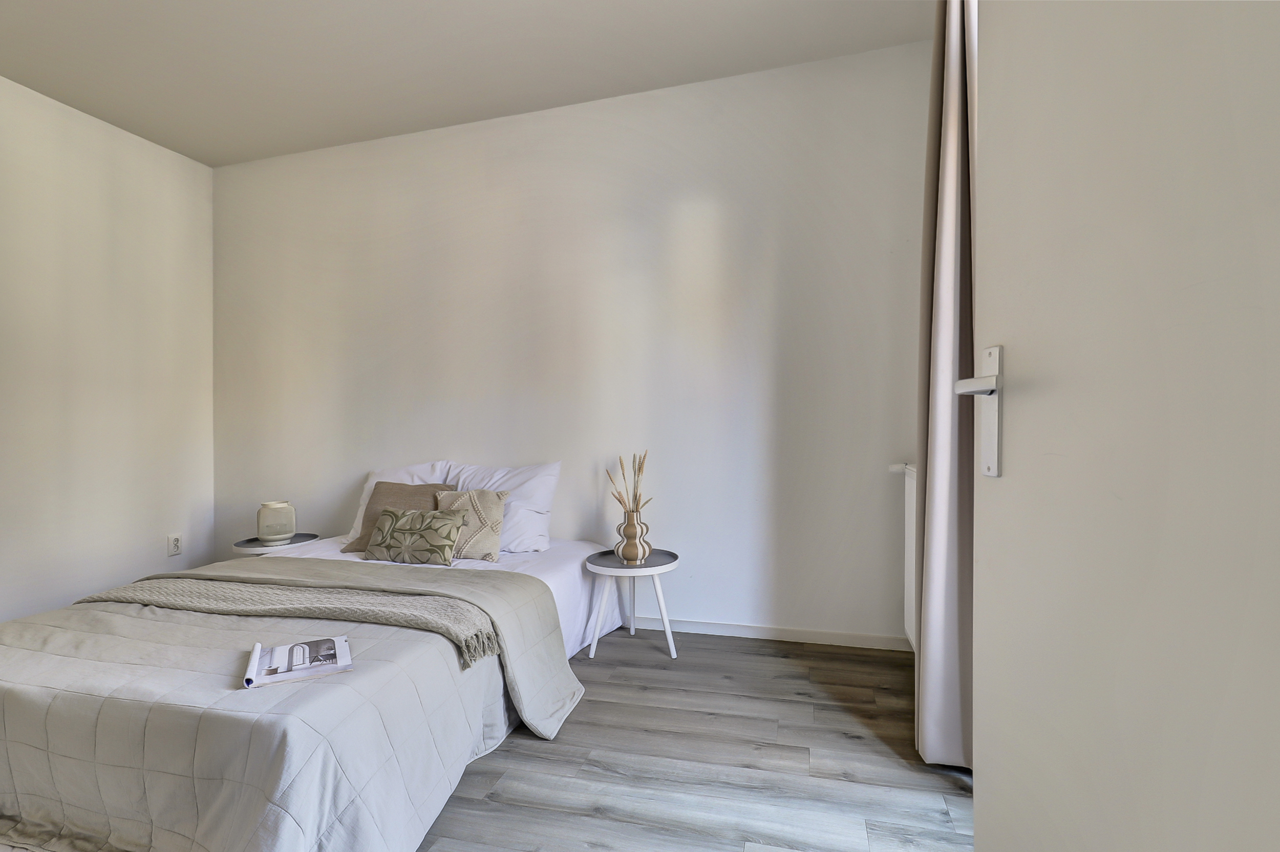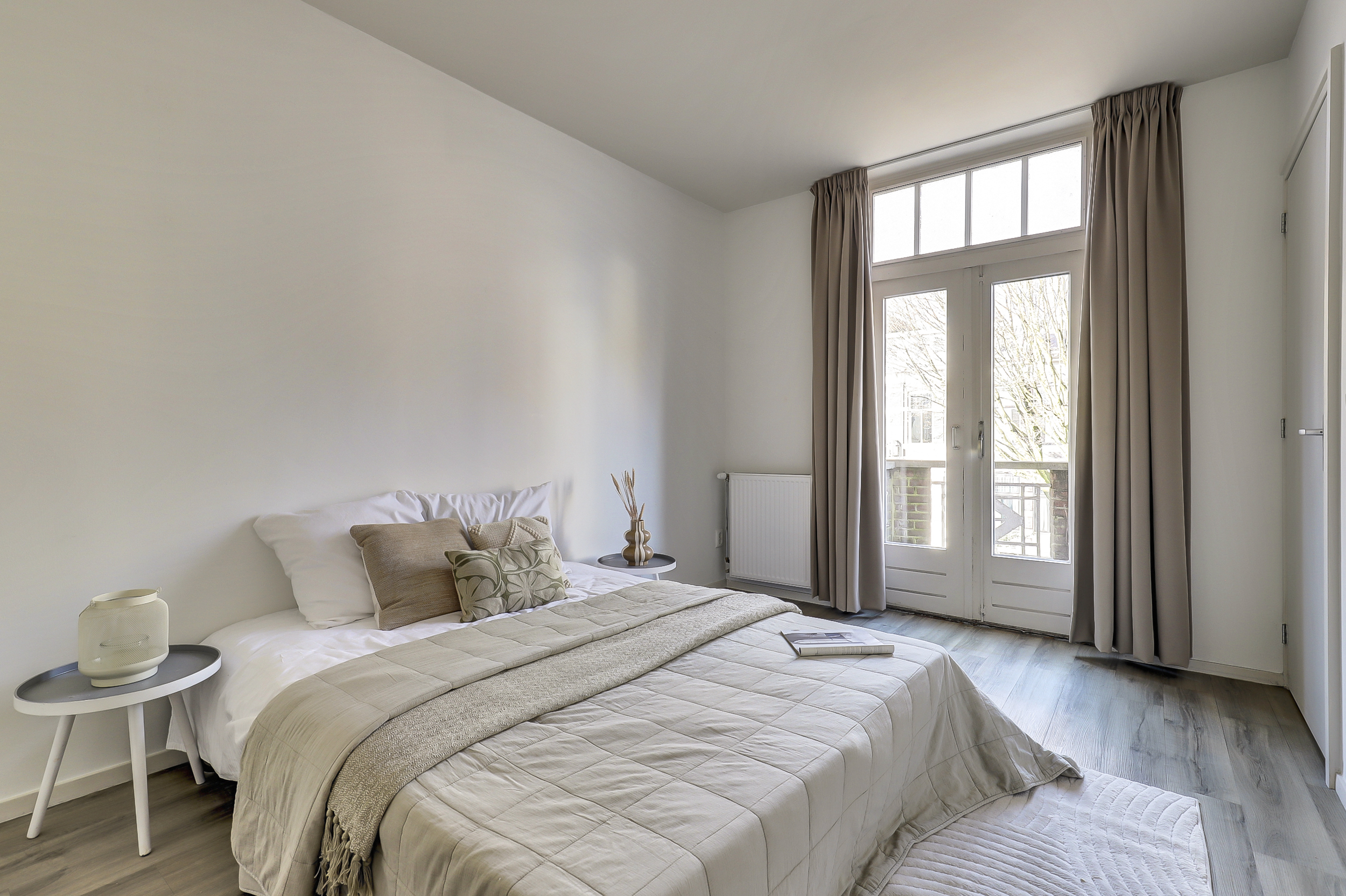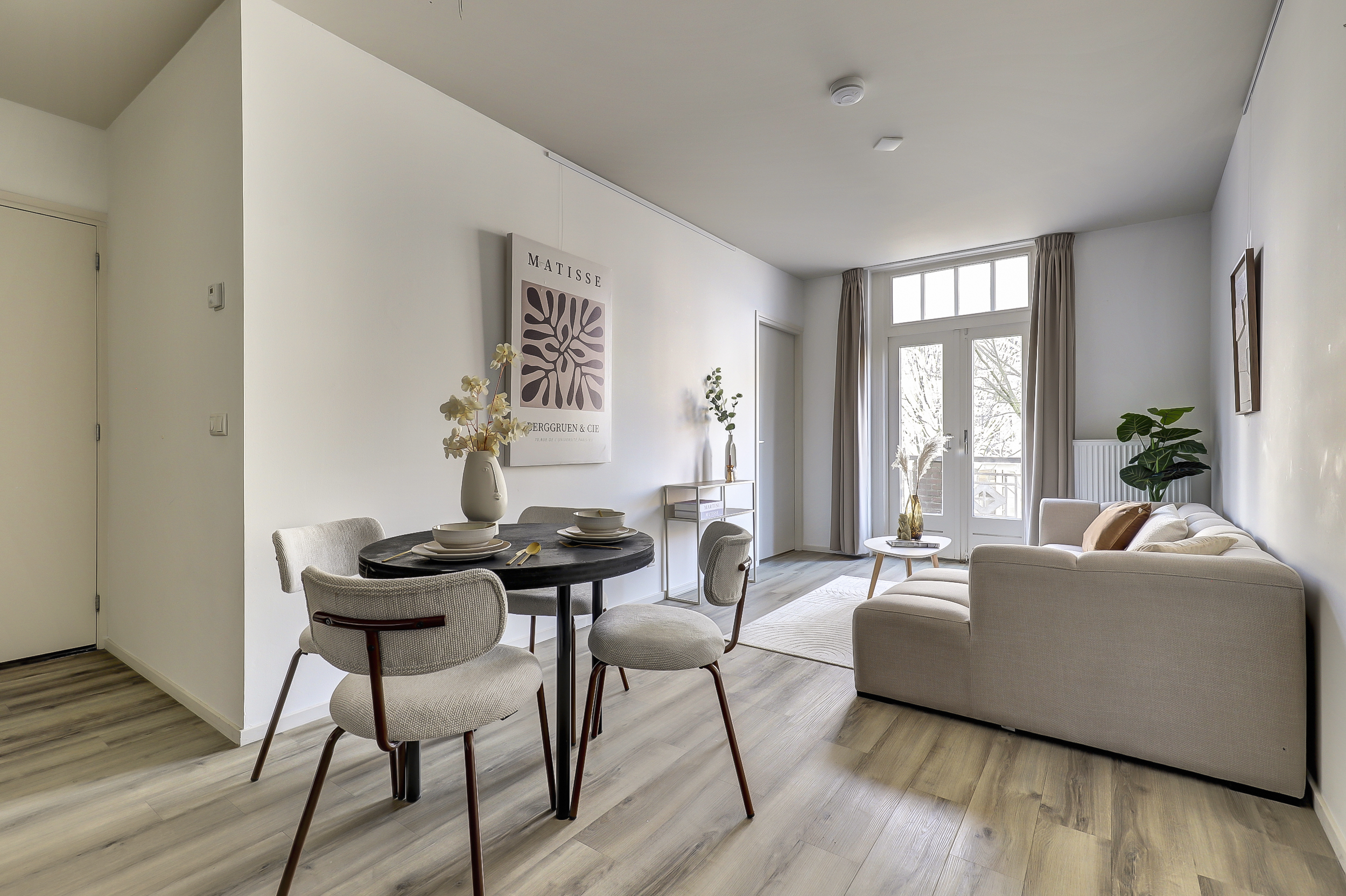 Bij binnenkomst valt direct de prettige lichtinval op. De woonkamer is afgewerkt met een nette laminaatvloer en voorzien van openslaande deuren naar het balkon 3 m²; wat zorgt voor een fijne verbinding tussen binnen en buiten. Ook de slaapkamer aan de voorzijde beschikt over openslaande deuren naar het balkon en is eveneens voorzien van een laminaatvloer. De slaapkamer heeft nis, ideaal voor een garderobekast.