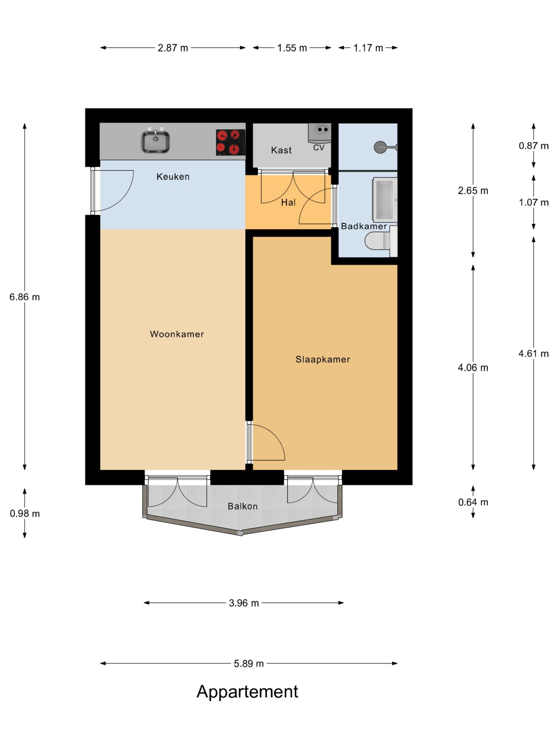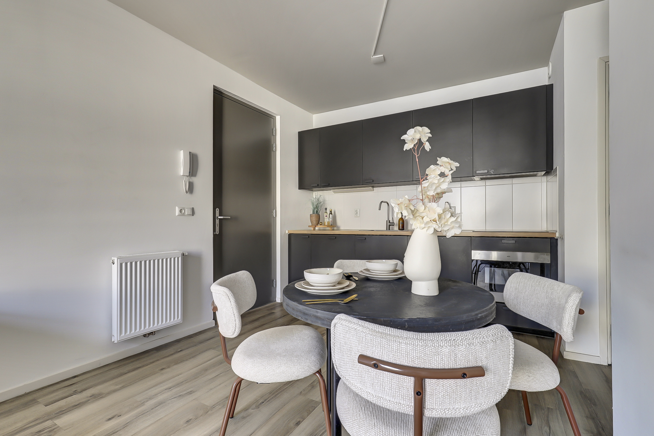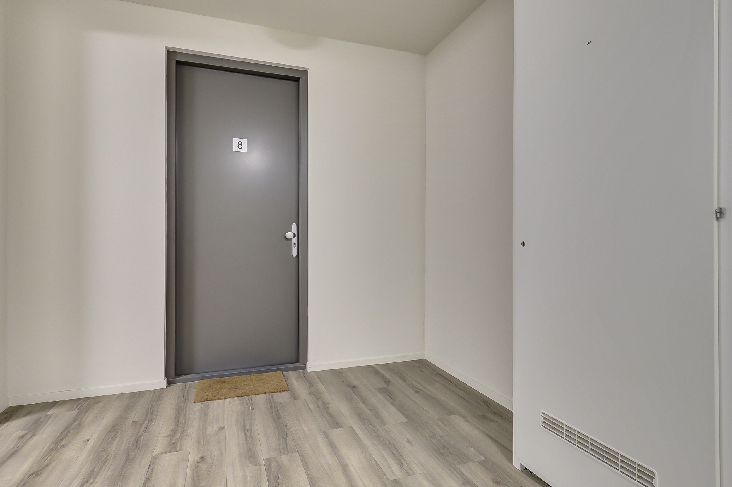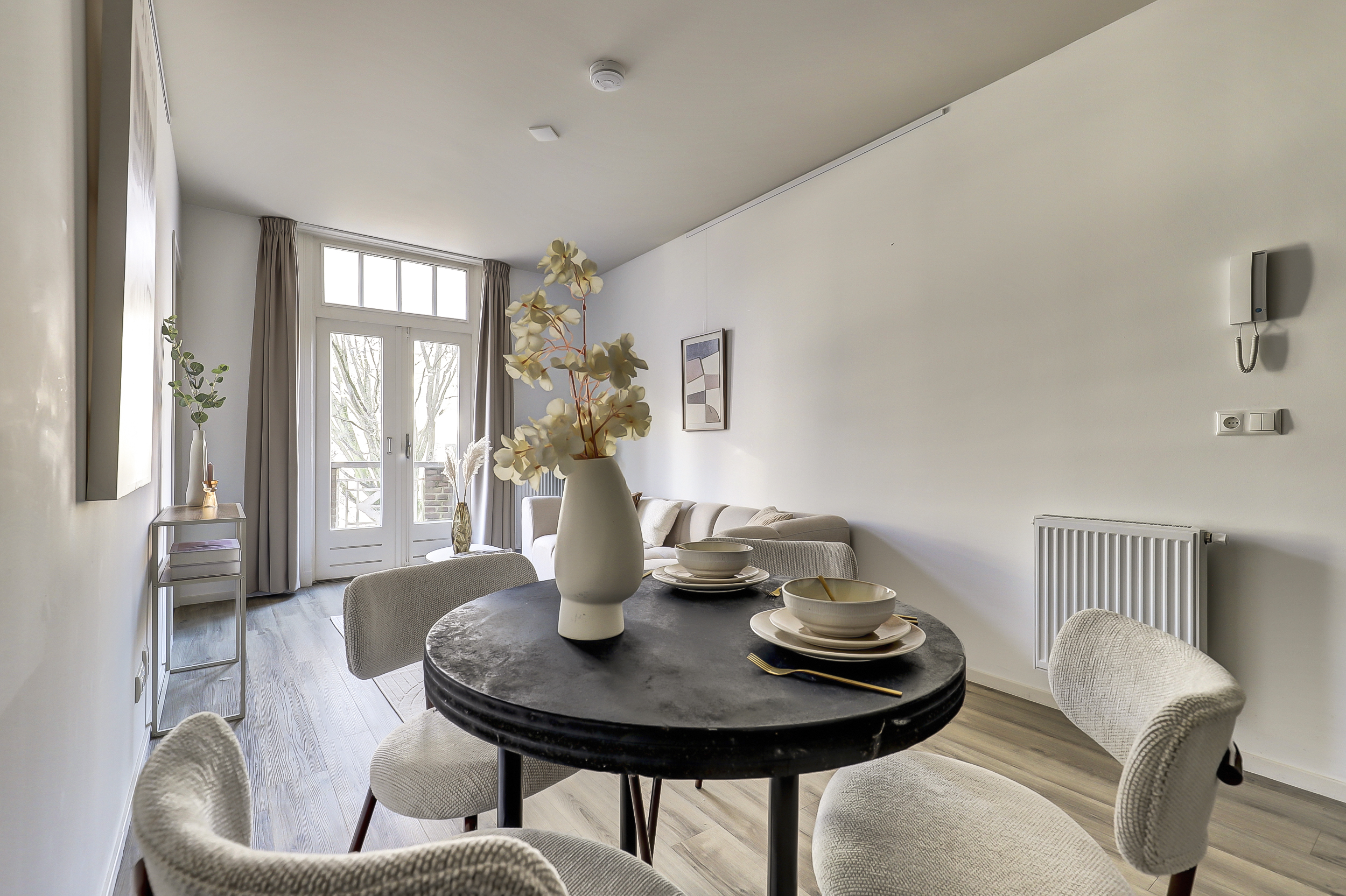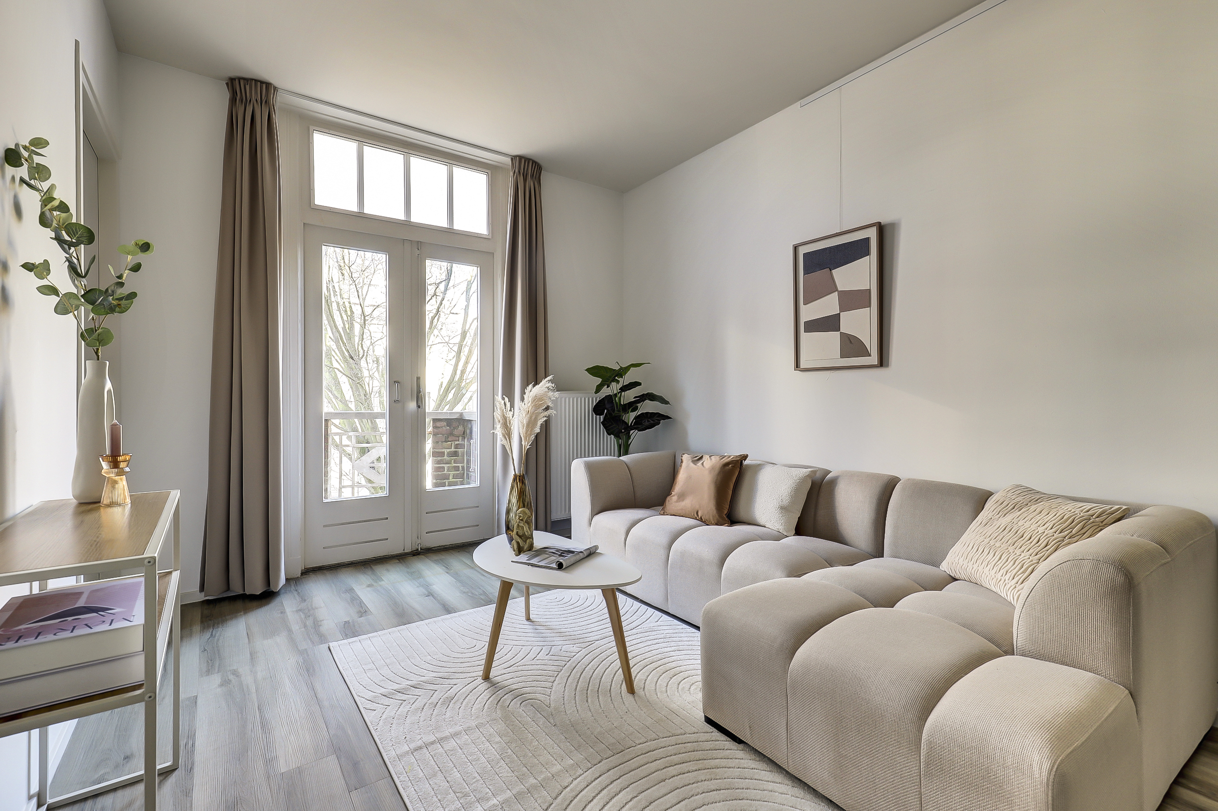 Bij binnenkomst valt direct de prettige lichtinval op. De woonkamer is afgewerkt met een nette laminaatvloer en voorzien van openslaande deuren naar het balkon 3 m²; wat zorgt voor een fijne verbinding tussen binnen en buiten. Ook de slaapkamer aan de voorzijde beschikt over openslaande deuren naar het balkon en is eveneens voorzien van een laminaatvloer. De slaapkamer heeft nis, ideaal voor een garderobekast.