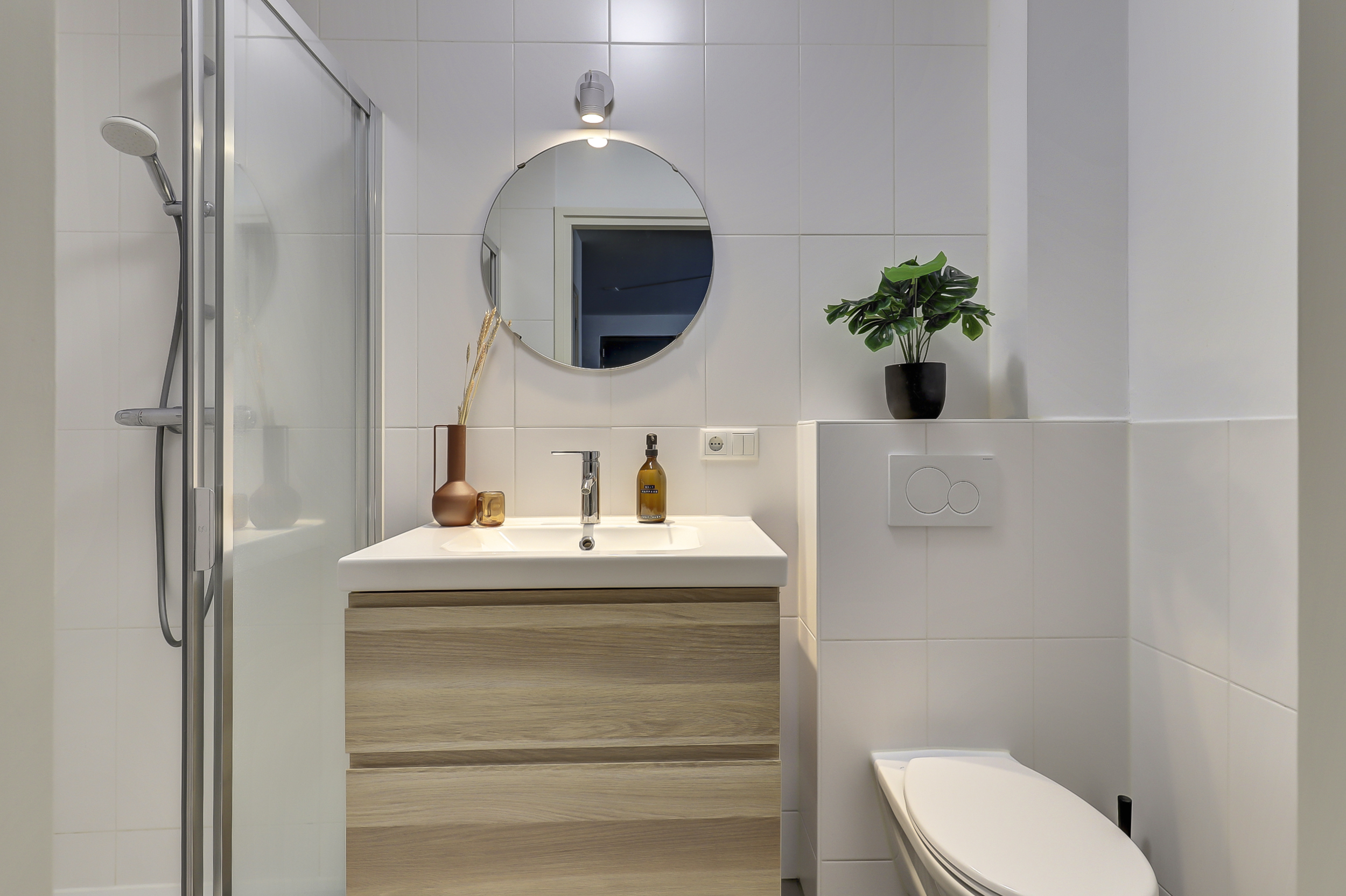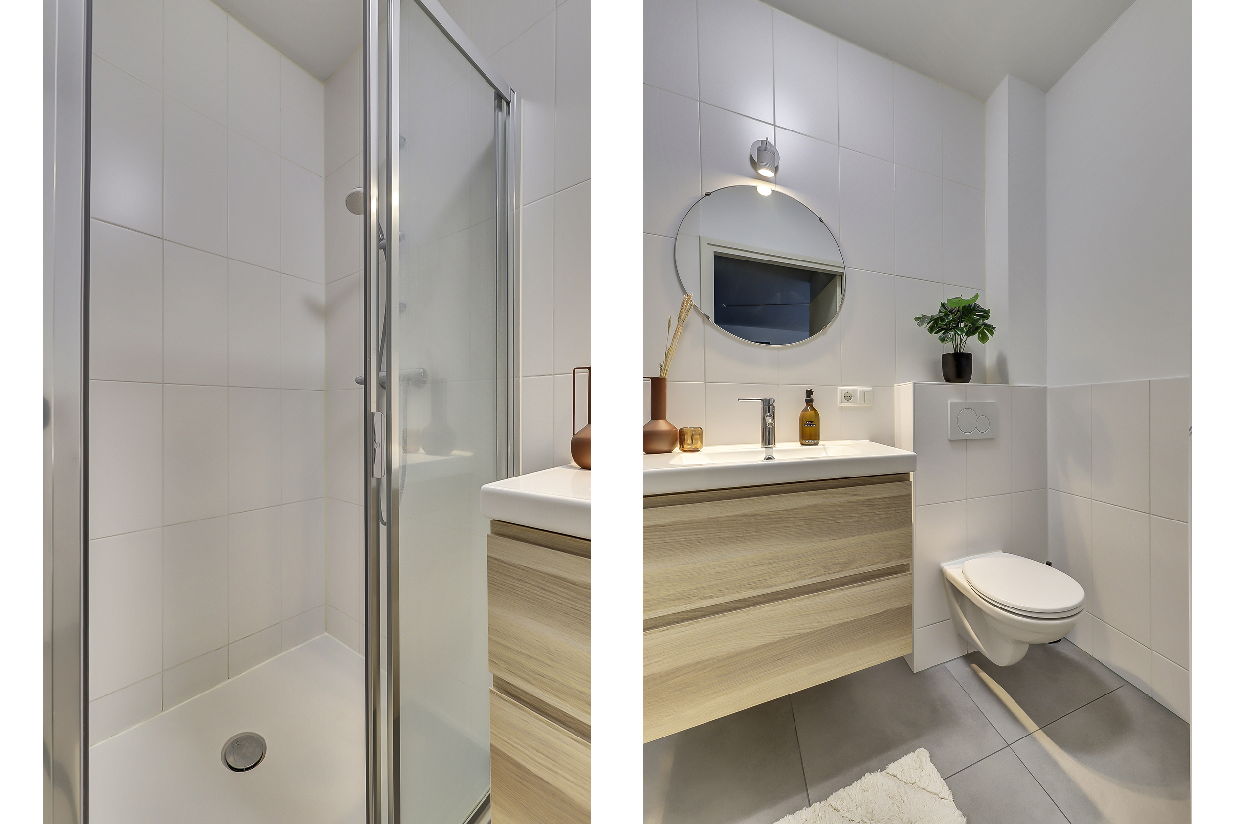 De badkamer is modern en compleet uitgevoerd met een inloopdouche, wastafelmeubel en toilet.