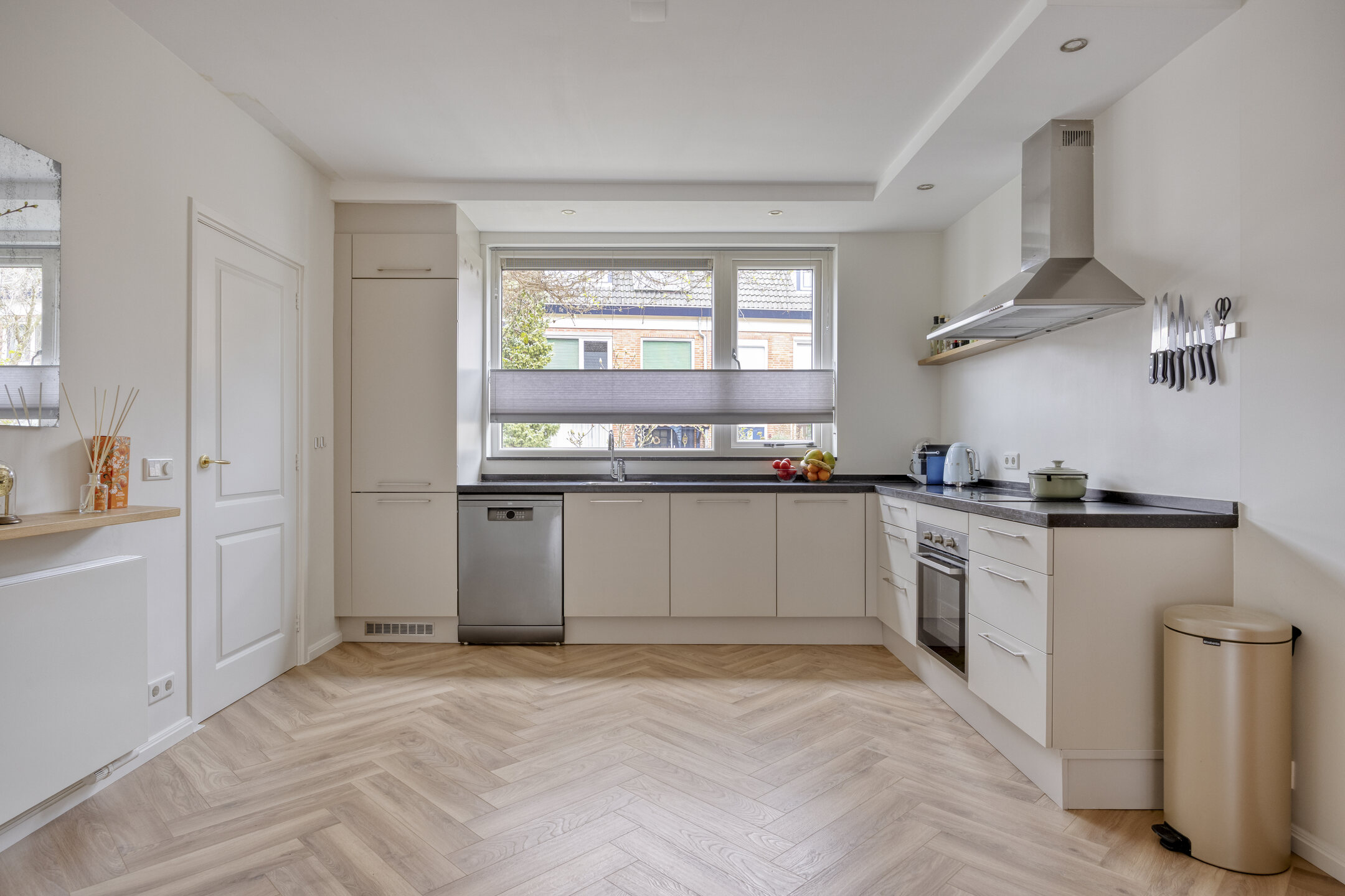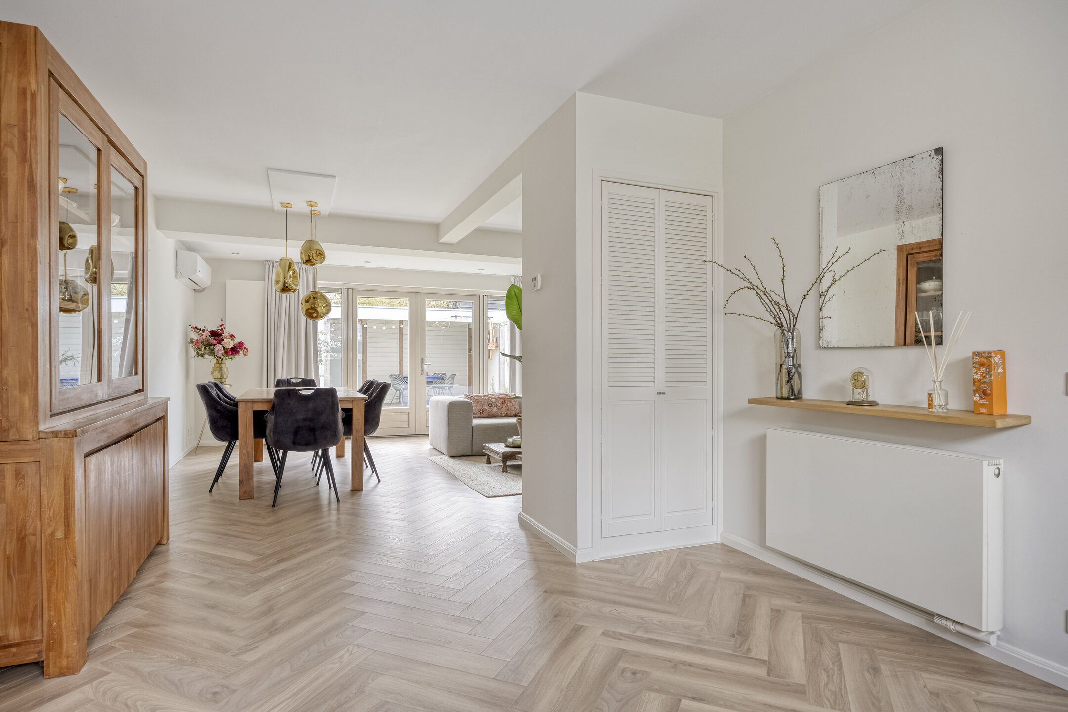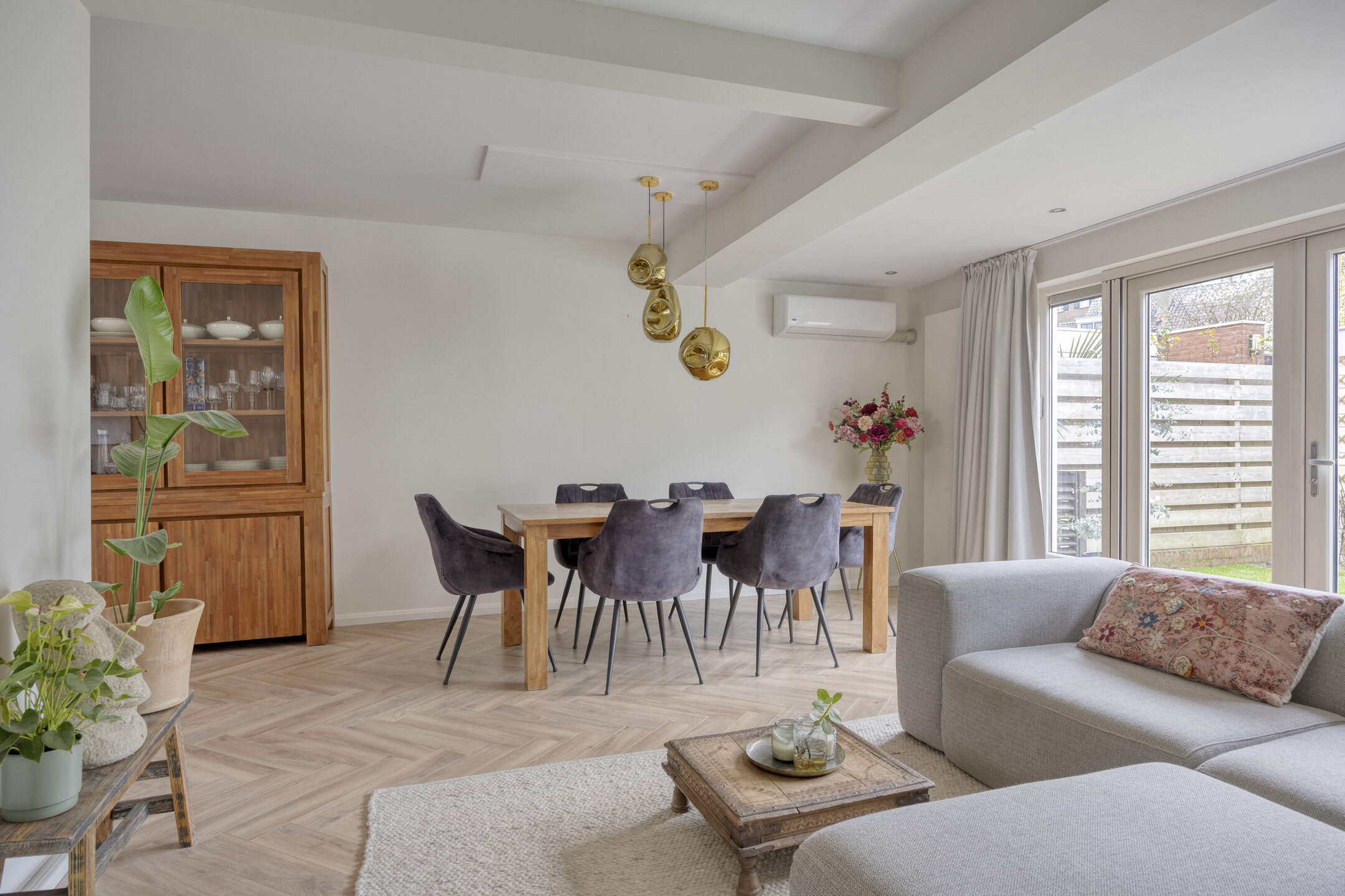 Je komt binnen in de hal met meterkast, provisiekelder en toiletruimte. Vanuit hier loop je door naar de open keuken in hoekopstelling, voorzien van diverse inbouwapparatuur, waarvan een deel in de loop der jaren is vernieuwd. Het eetgedeelte sluit hier mooi op aan en vormt een fijne plek om samen te komen. De uitgebouwde woonkamer (ca. 2011) is heerlijk licht en voorzien van airconditioning en openslaande deuren naar de achtertuin, waardoor binnen en buiten op een natuurlijke manier in elkaar overlopen.