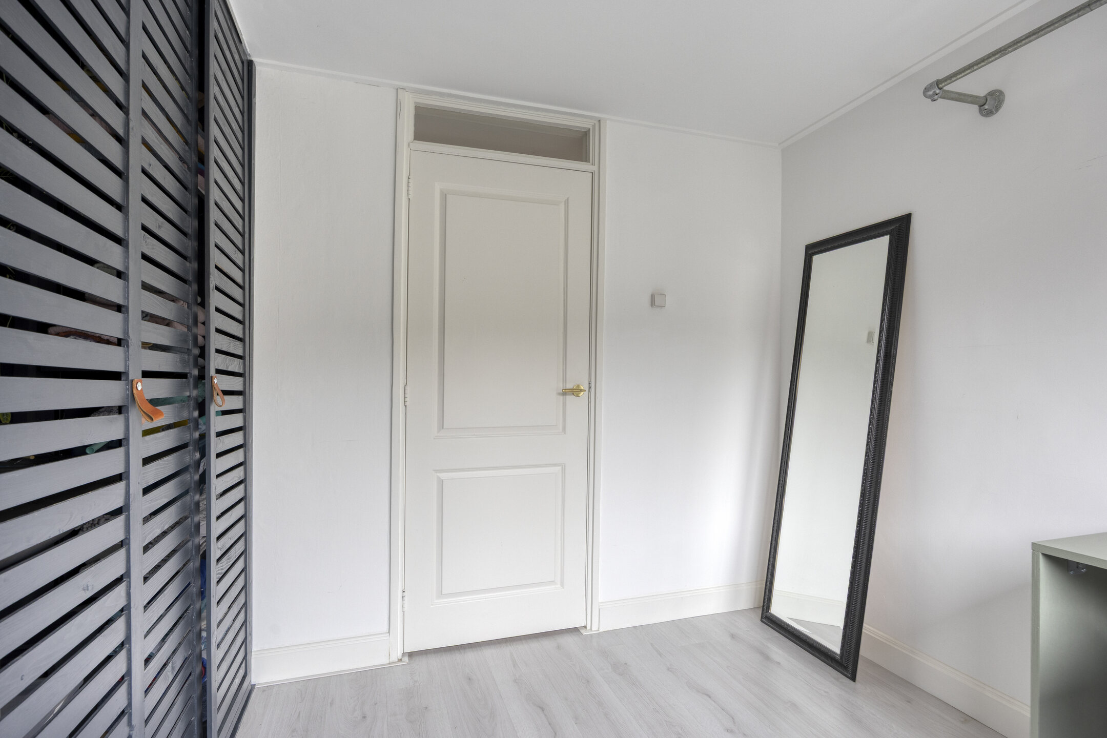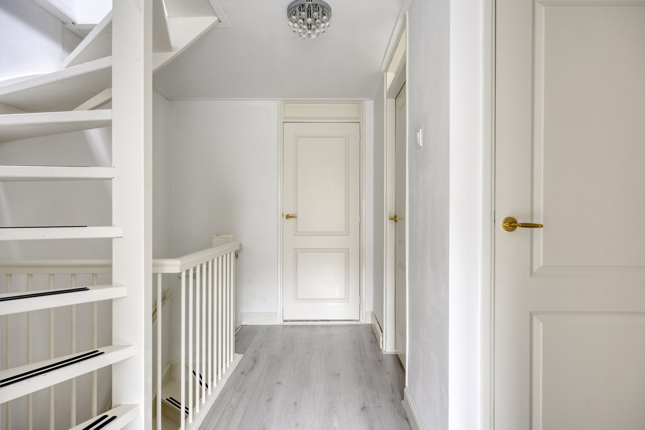 Overloop met toegang tot drie slaapkamers en de badkamer. De grote slaapkamer beschikt over een inbouwkast en rolluiken. De tweede slaapkamer is eveneens voorzien van een inbouwkast en de derde kamer wordt momenteel gebruikt als slaap-/waskamer met witgoedaansluitingen en rolluiken. De badkamer is in 2025 vernieuwd en praktisch ingericht met een douche, toilet en wastafelmeubel.