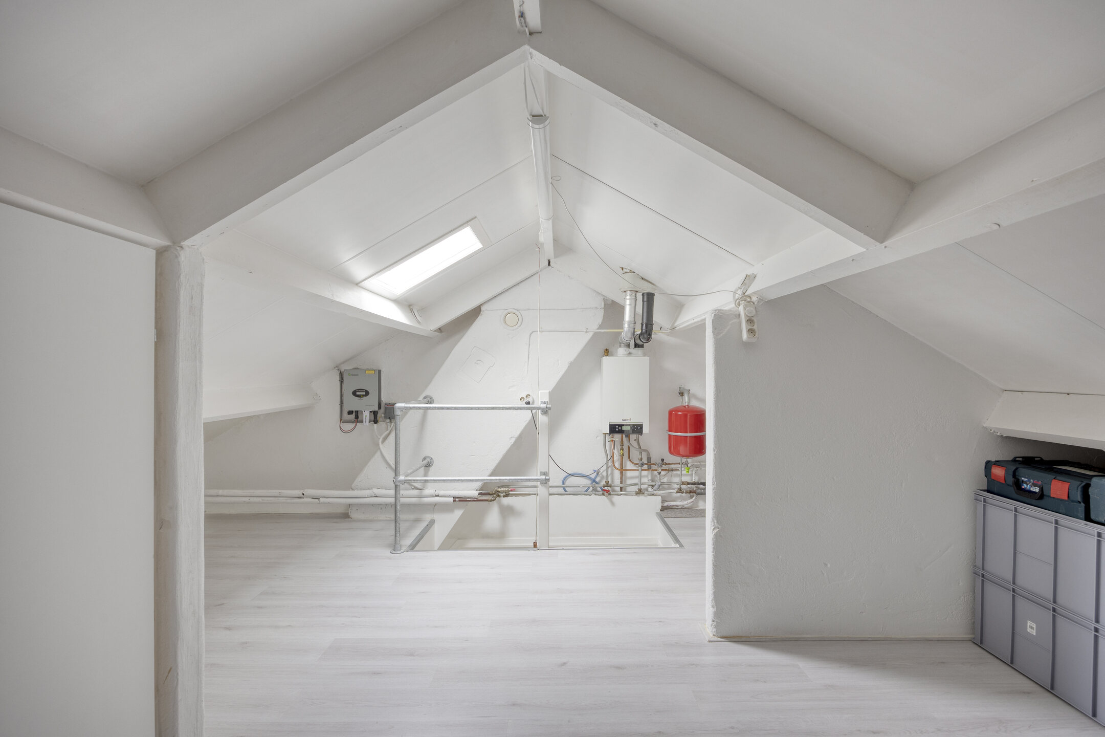 Via een vaste trap bereik je de zolderverdieping. Dit is een open ruimte met dakraam, waar zich de cv-ketel (Nefit, eigendom) en de omvormer van de zonnepanelen bevinden. De ruimte is netjes afgewerkt en biedt volop bergruimte, maar ook mogelijkheden voor een hobbyruimte of werkplek.