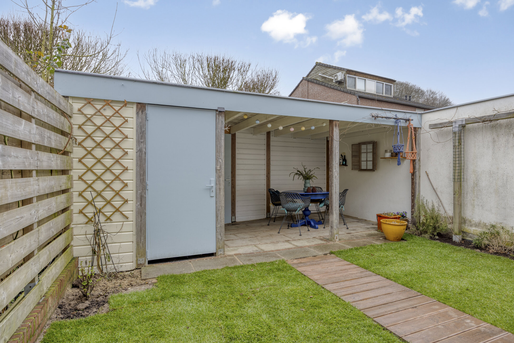 + Achtertuin met overkapping, berging en achterom;