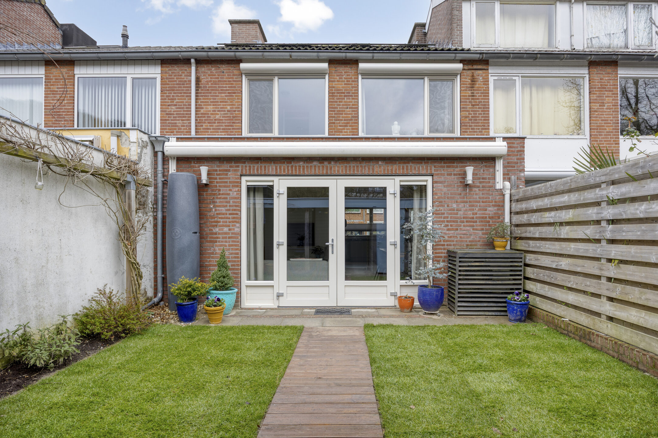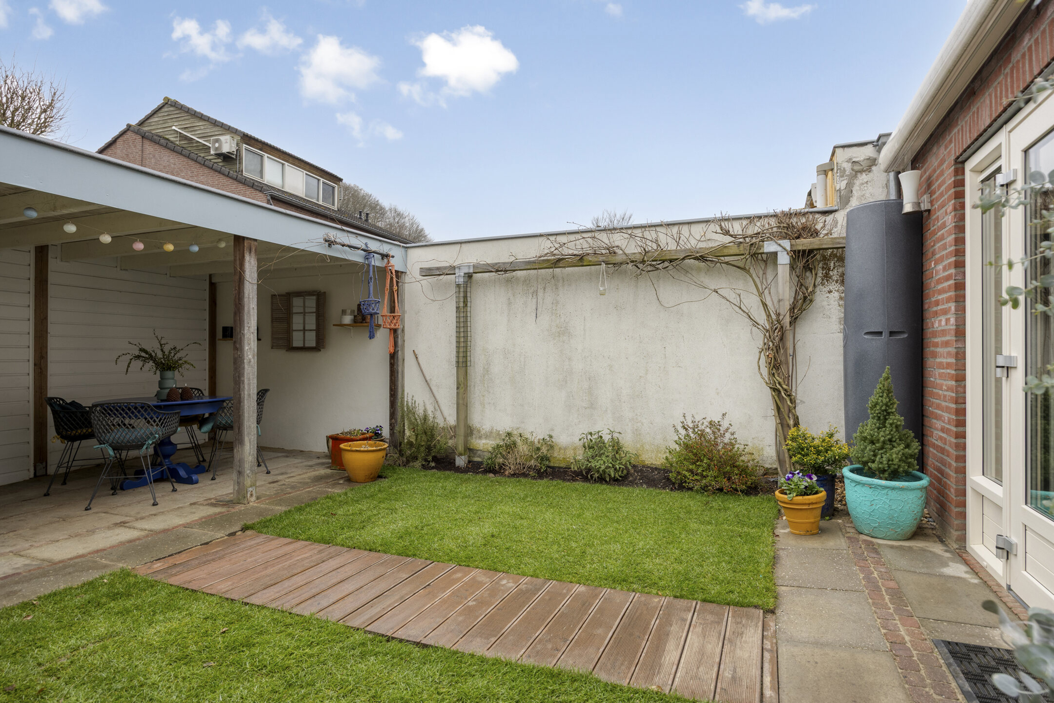 De woning beschikt over een voor- en achtertuin. De achtertuin is voorzien van een zonnescherm, een houten overkapping met bergruimte en een praktische achterom. Een fijne plek waar je al vroeg in het seizoen van de zon kunt genieten en waar je in alle rust buiten kunt zitten. Het zwembad dat hier eerder aanwezig was, is inmiddels verwijderd, waardoor er een onderhoudsvriendelijke en goed bruikbare tuin is ontstaan.