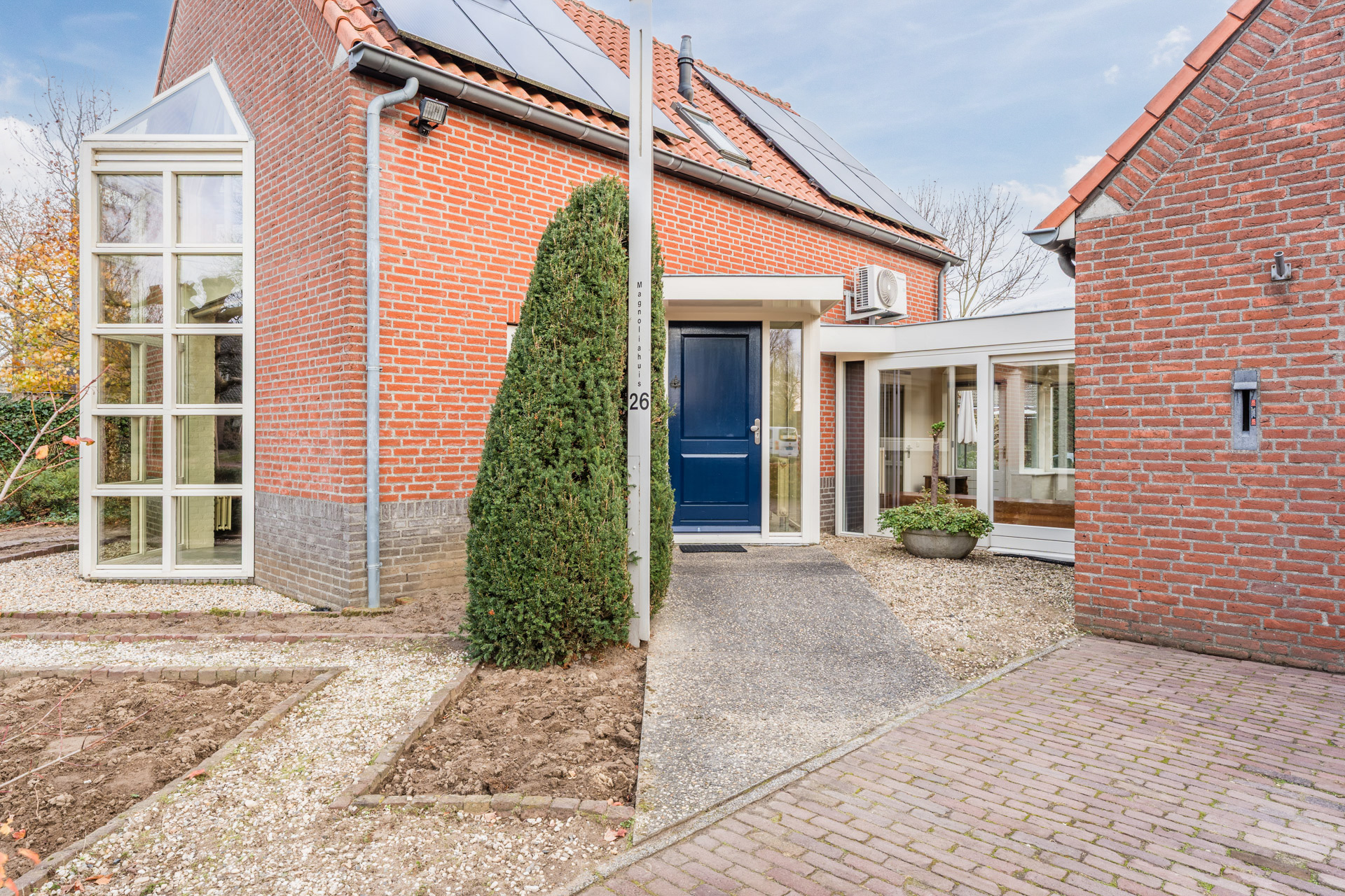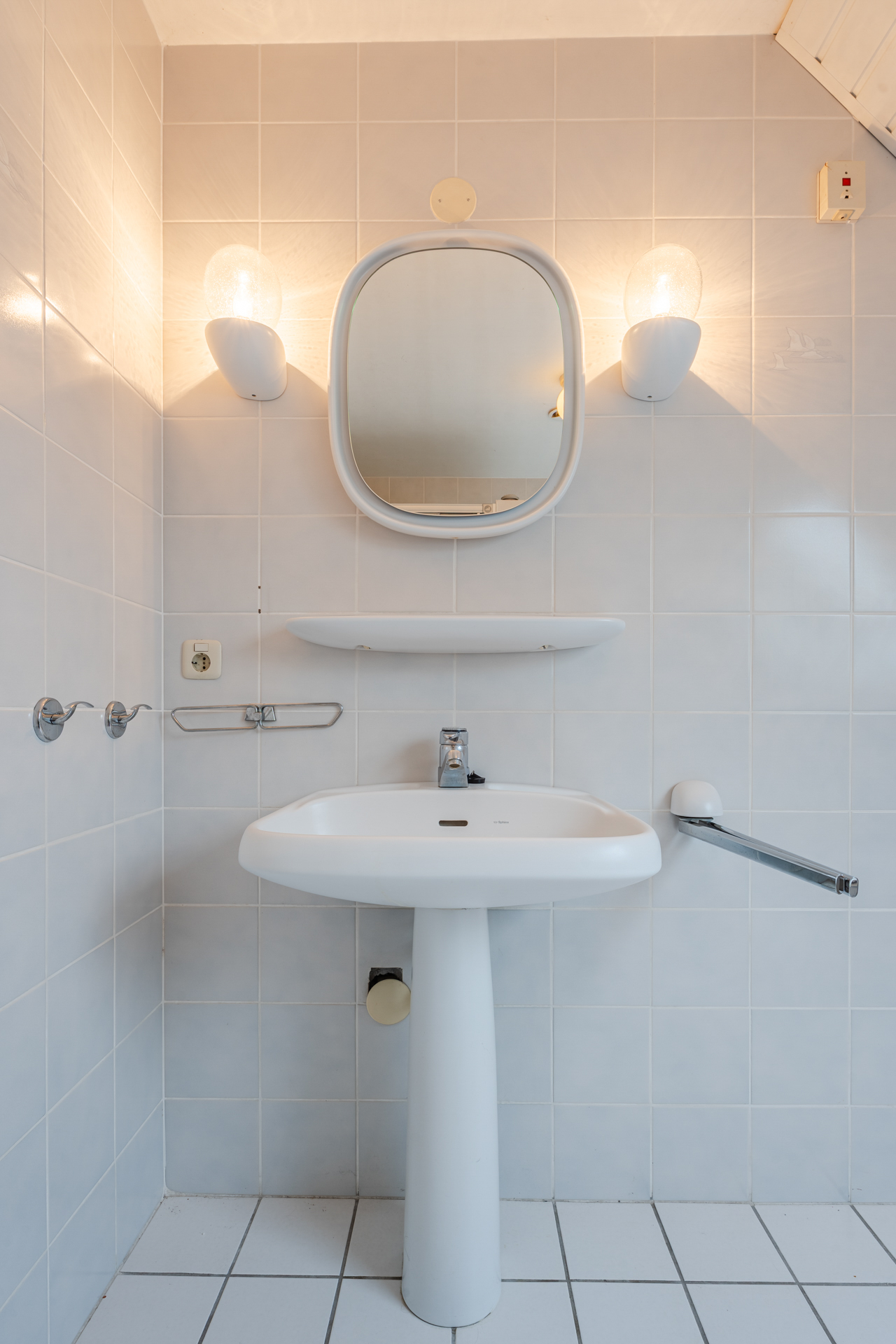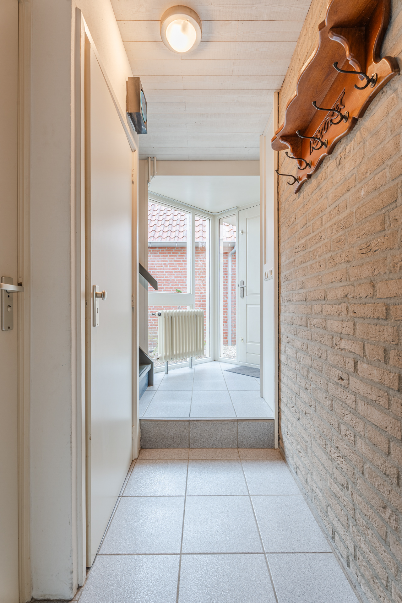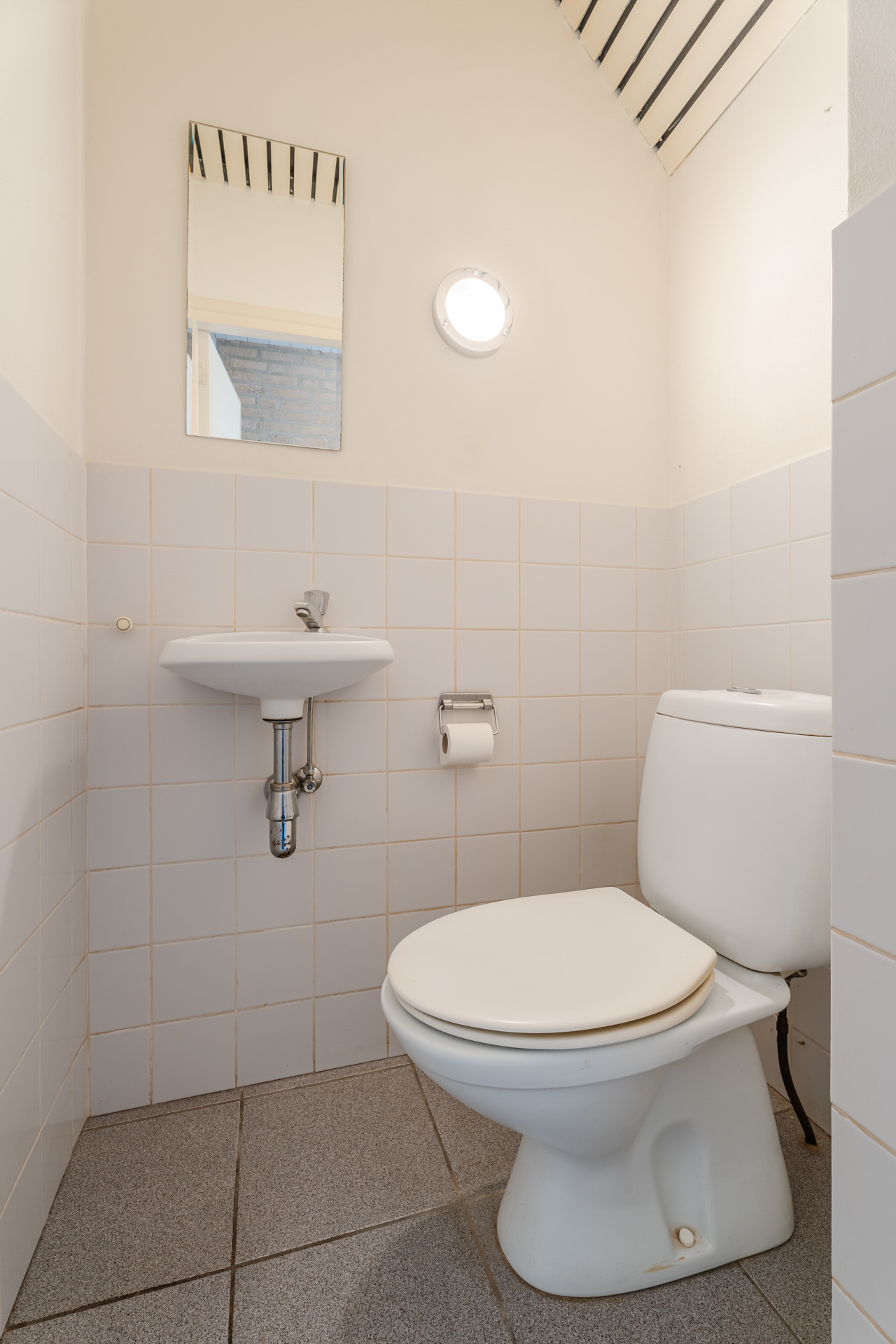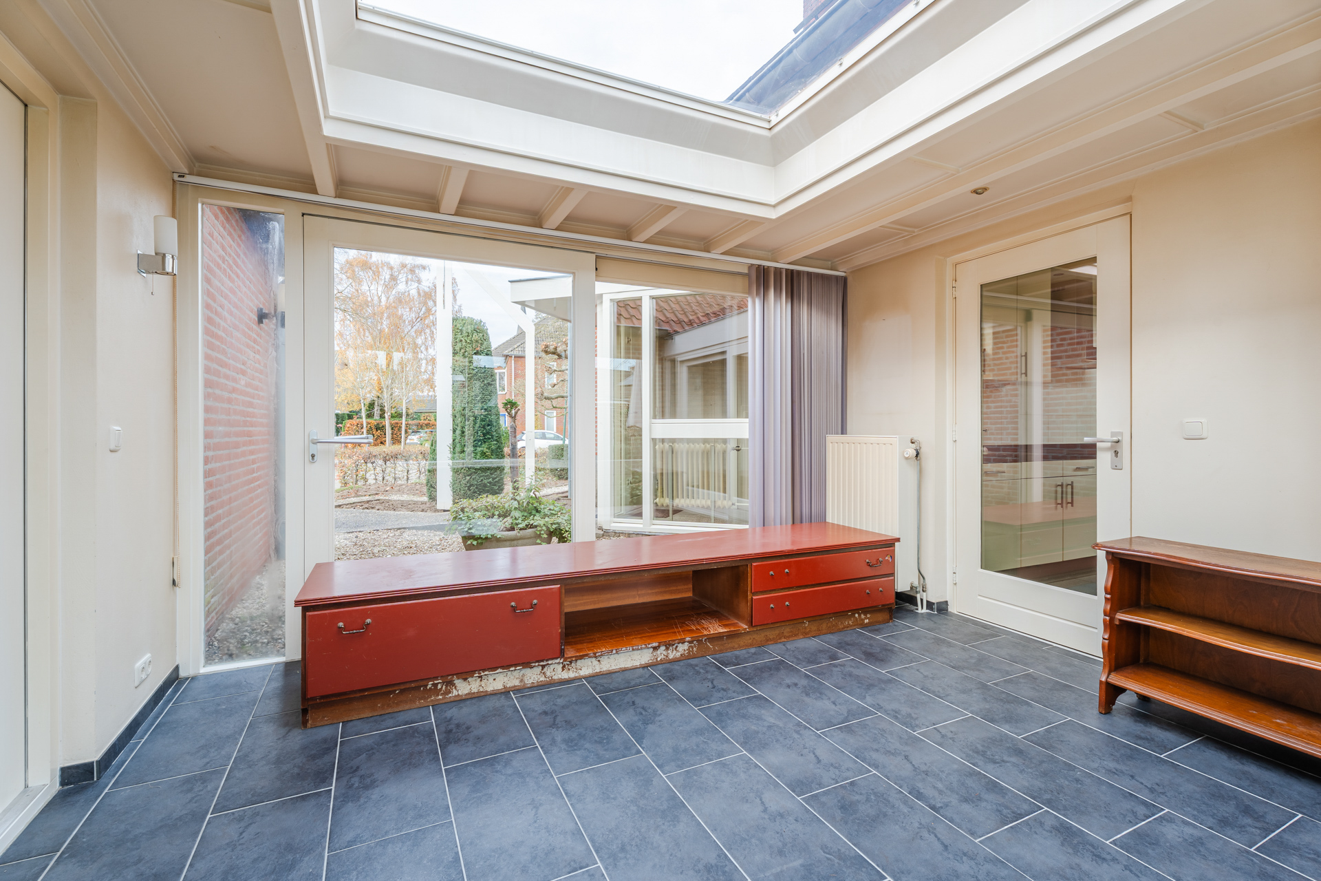 Entree, trapopgang naar de eerste verdieping en toilet met fonteintje. De L-vormige woonkamer biedt ruimte aan een zit- en eethoek. Door de openslaande deuren kun je aansluitend genieten van de achtertuin. Aan de voorzijde is een kleine erker met vrij zicht over de voorgelegen straat. De open keuken is voorzien van inbouwapparatuur zoals een combi-magnetron, vaatwasser, koelkast, afzuigkap en een kookplaat. Via de keuken is de serre toegankelijk. Hier kun je heerlijk genieten van de tuin, t.v.-kijken, rustig een boek lezen of een werkhoek creëren. Door de vele raampartijen en de lichtkoepel komt veel licht naar binnen. Aansluitend vind je de bijkeuken met witgoedaansluitingen, de vriezer, een uitstortgootsteen en kastruimte. Boven de bijkeuken is een bergzolder, te bereiken via de vlizotrap. Op deze zolder staat de mechanische ventilatie-unit en de boiler voor de badkamer op de begane grond. De woning is levensloopbestendig doordat in de voormalige garage een extra slaapkamer met badkamer is gecreëerd. De garagedeur is vervangen door een glazen pui en de badkamer is voorzien van een inloopdouche, tweede toilet en een dubbele wastafel.