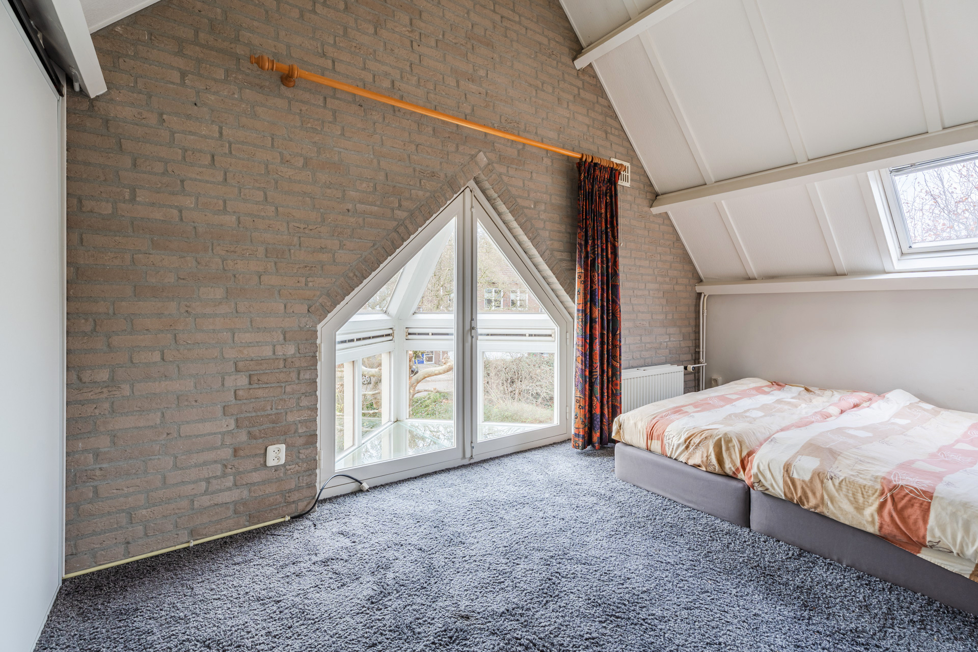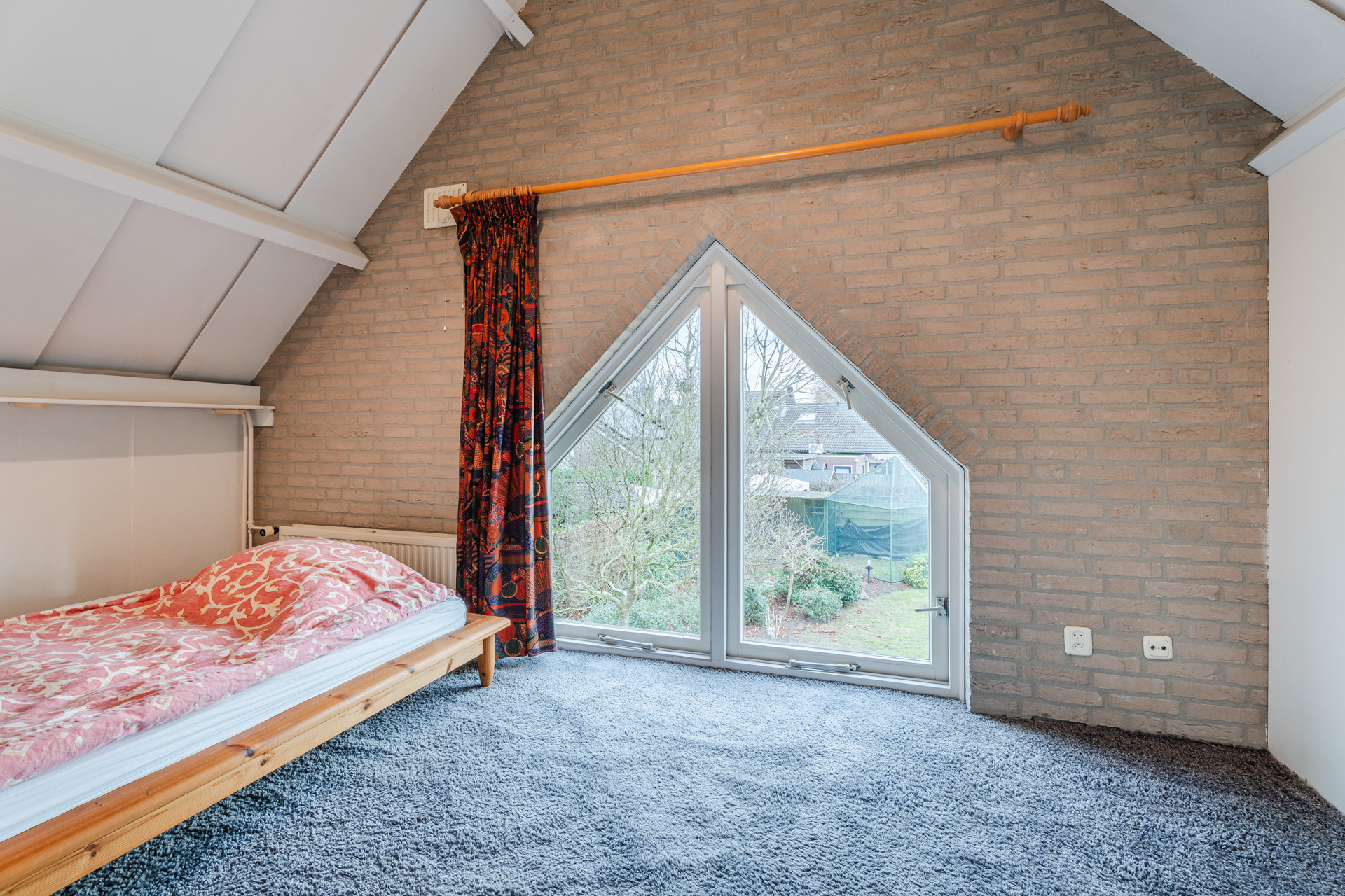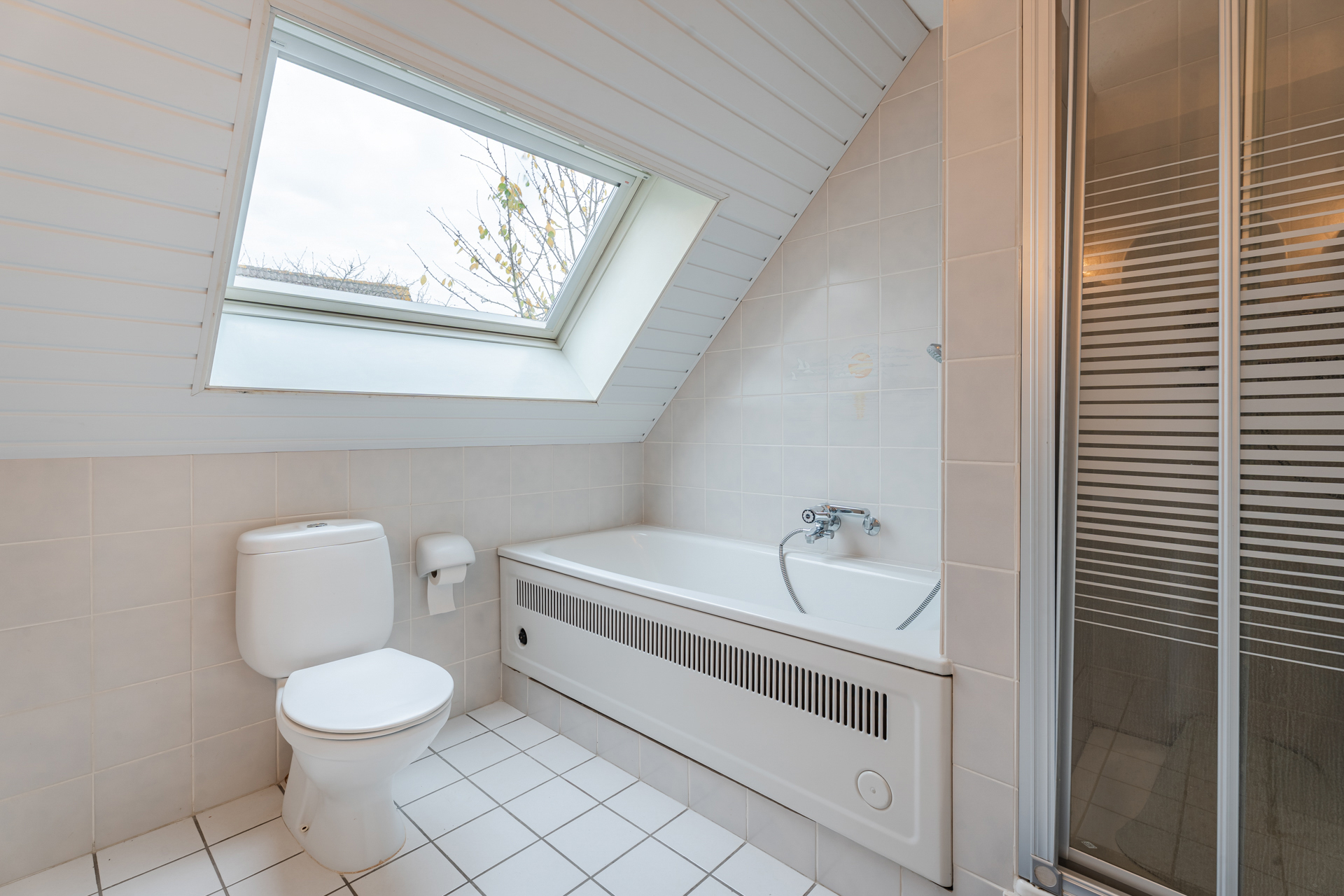 Via de overloop kom je bij twee slaapkamers en de tweede badkamer. Deze badkamer heeft een ligbad, derde toilet, douche en vaste wastafel. De slaapkamers zijn beiden voorzien van een bijzondere raampartij en hebben ook allebei een schuifkast. De slaapkamer aan de voorzijde heeft nog een extra wastafel. Op de overloop staat de C.V.-installatie (2009) en de omvormer van de zonnepanelen. De bergzolder is via een vlizotrap bereikbaar.