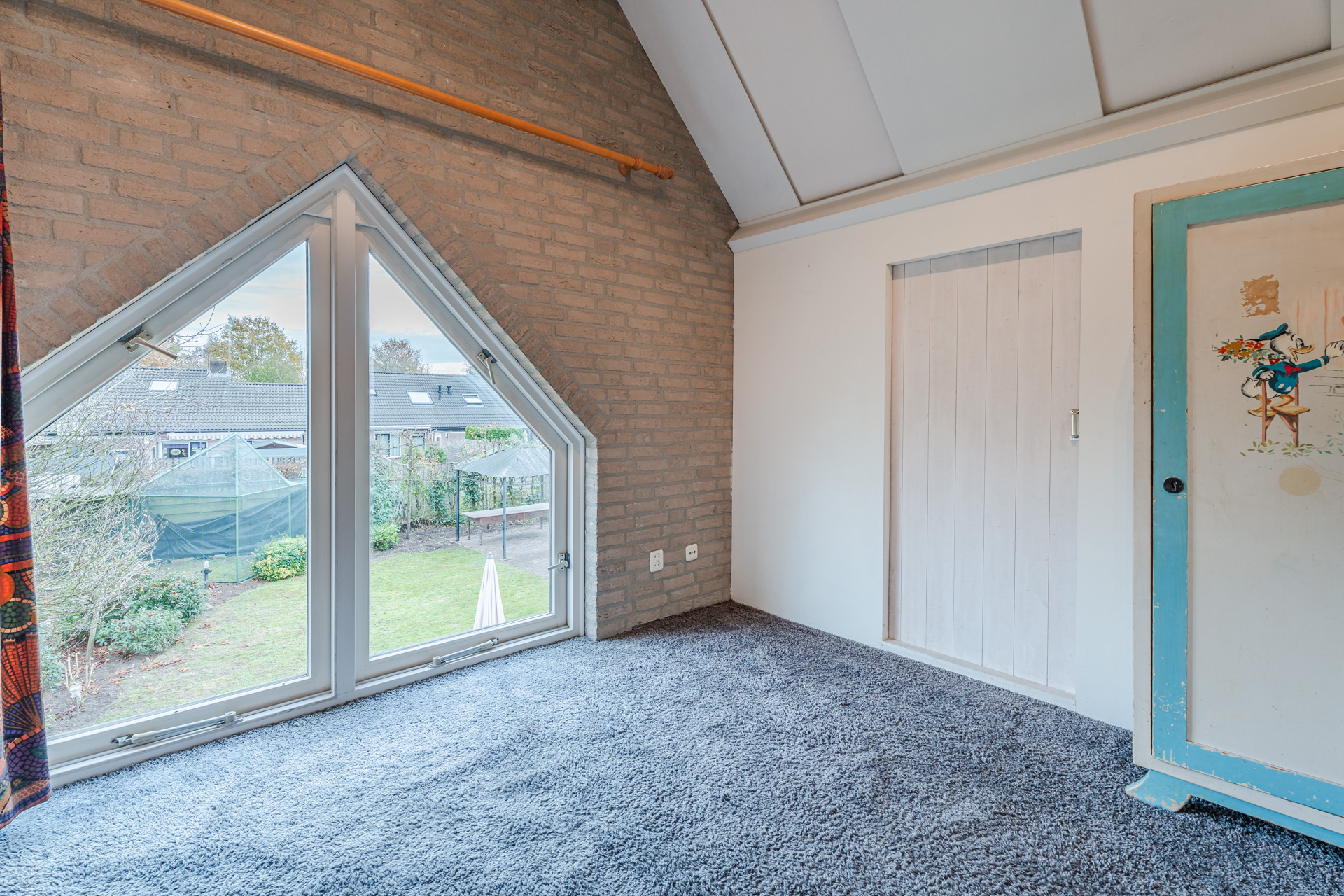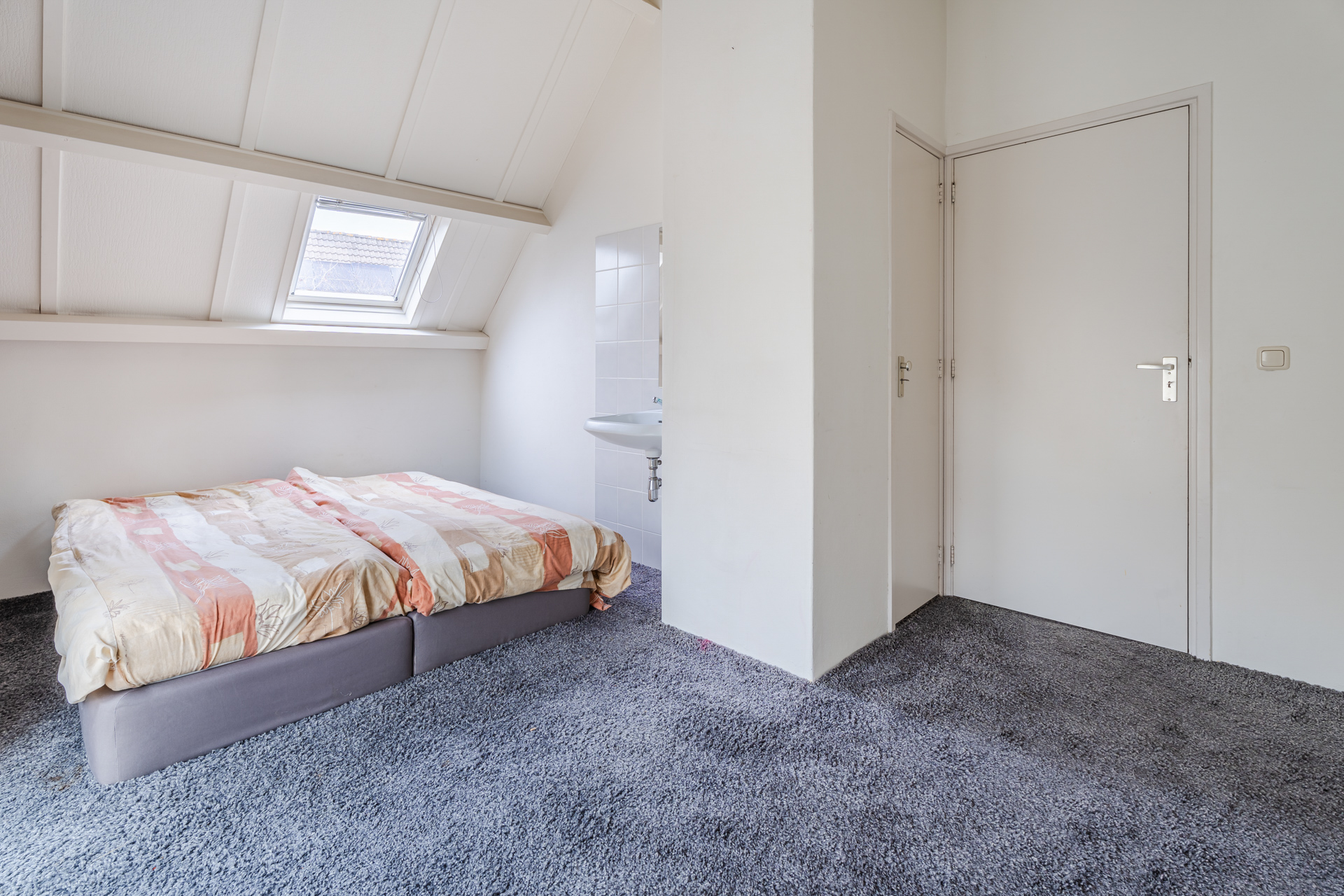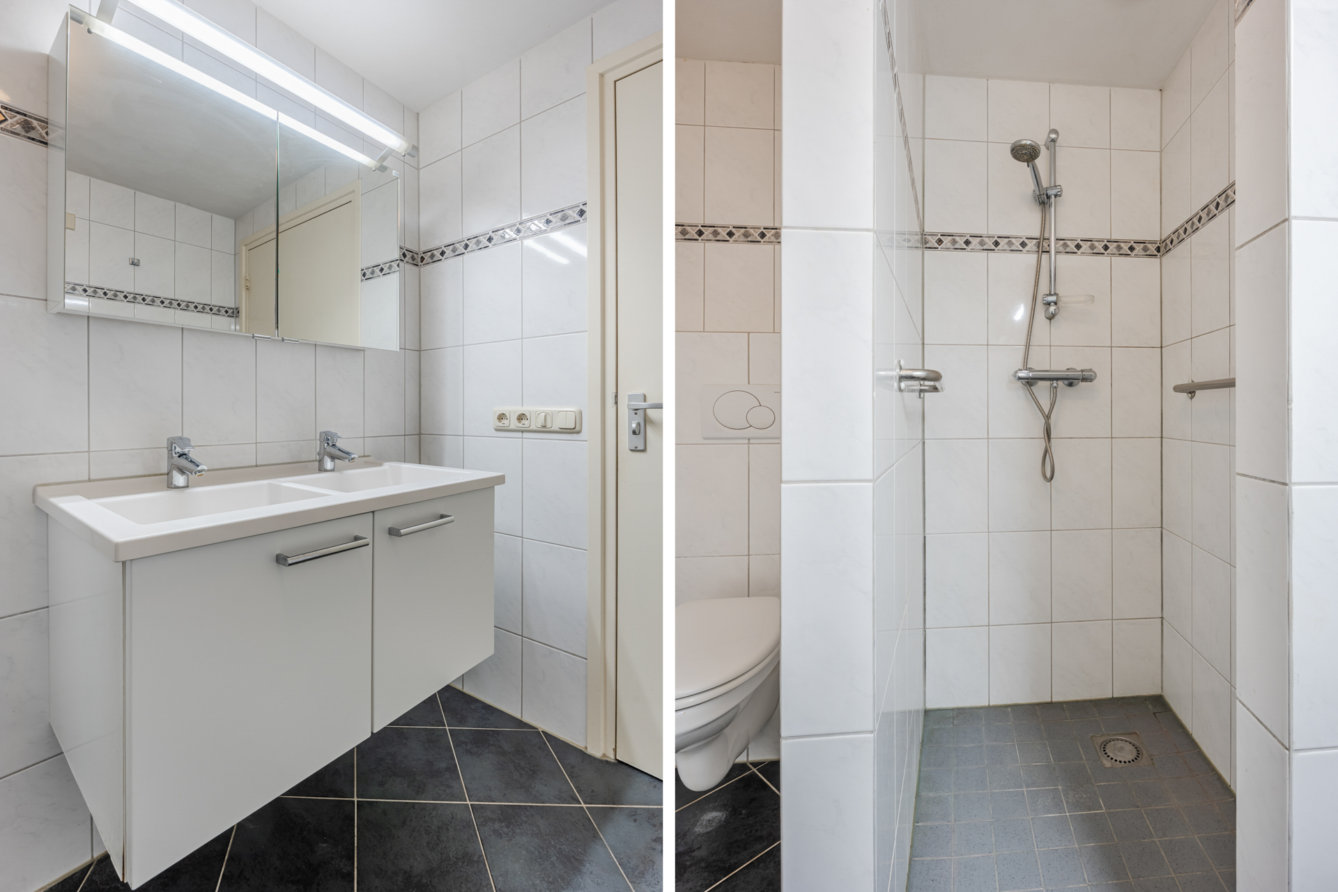 Via de overloop kom je bij twee slaapkamers en de tweede badkamer. Deze badkamer heeft een ligbad, derde toilet, douche en vaste wastafel. De slaapkamers zijn beiden voorzien van een bijzondere raampartij en hebben ook allebei een schuifkast. De slaapkamer aan de voorzijde heeft nog een extra wastafel. Op de overloop staat de C.V.-installatie (2009) en de omvormer van de zonnepanelen. De bergzolder is via een vlizotrap bereikbaar.