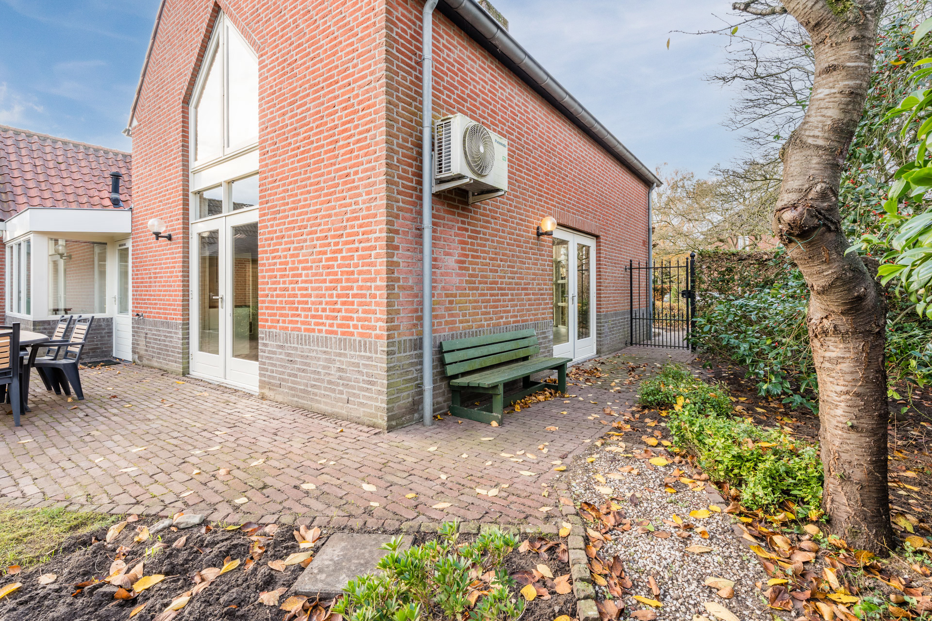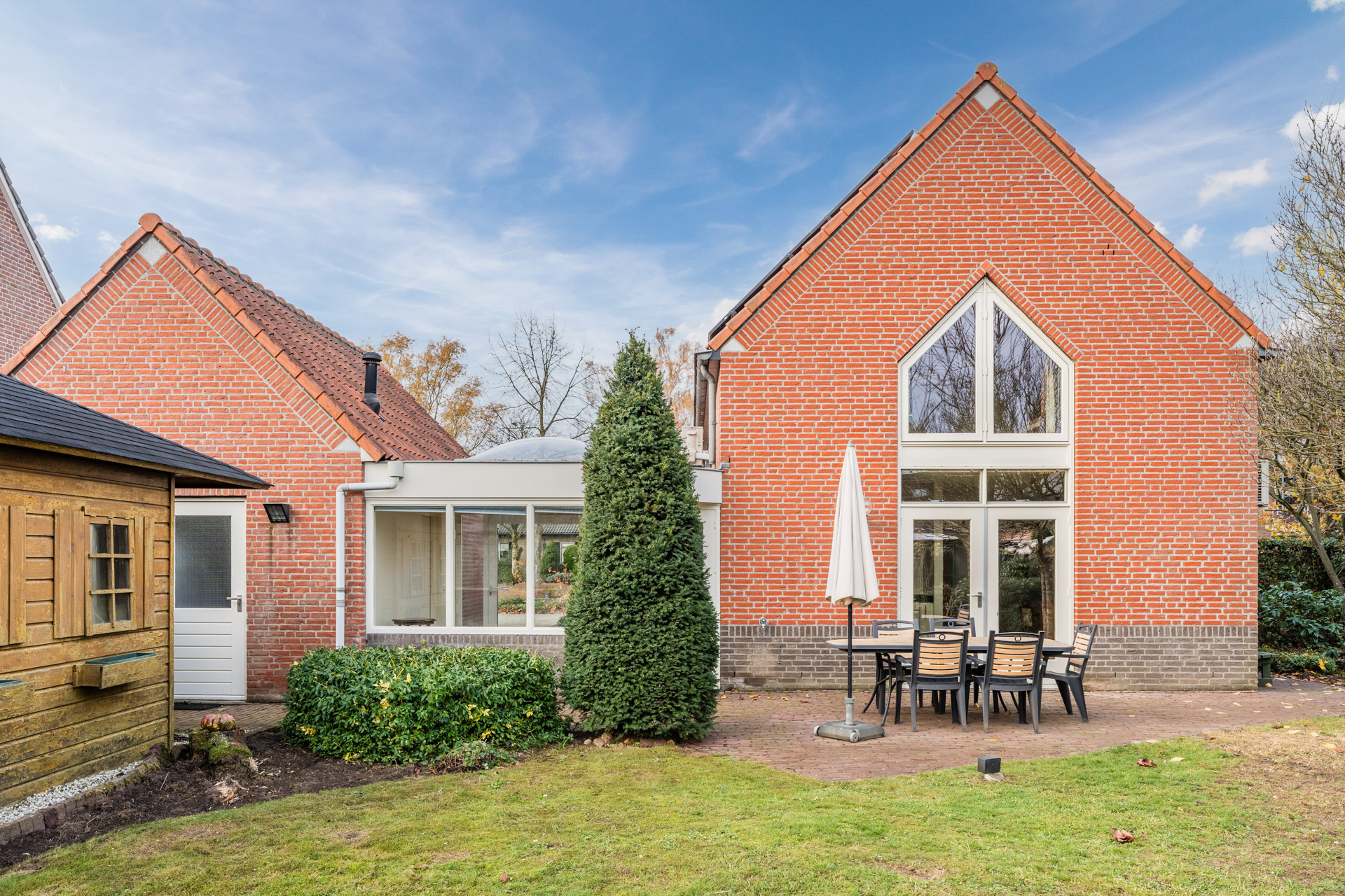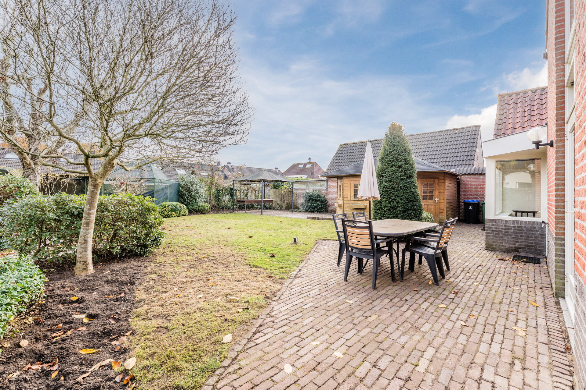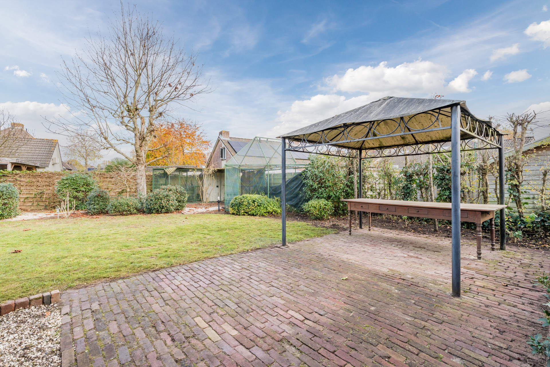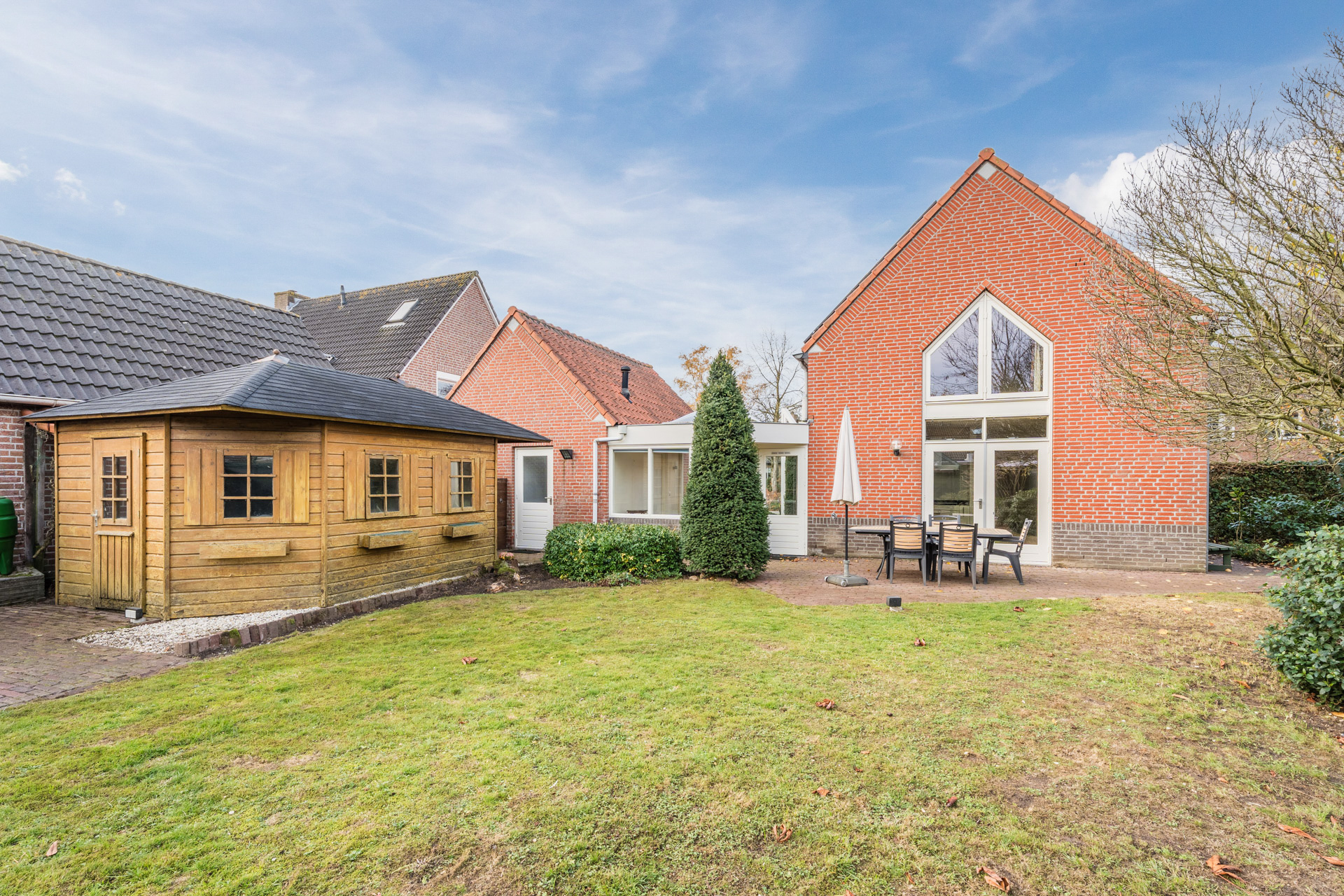 Aan de voorzijde bevindt zich de voortuin en de oprit met plek voor twee auto’s. Via de achterom kom je in de beschut gelegen achtertuin op het oosten. Achter in de tuin bevindt zich een terras met zitje. In de grote houten berging is genoeg plaats voor tuinspullen, gereedschap en fietsen. In een kast aan de achterpui vind je een puls en pomp voor het besproeien van de tuin. Verder staat er een voormalige volière in de tuin.