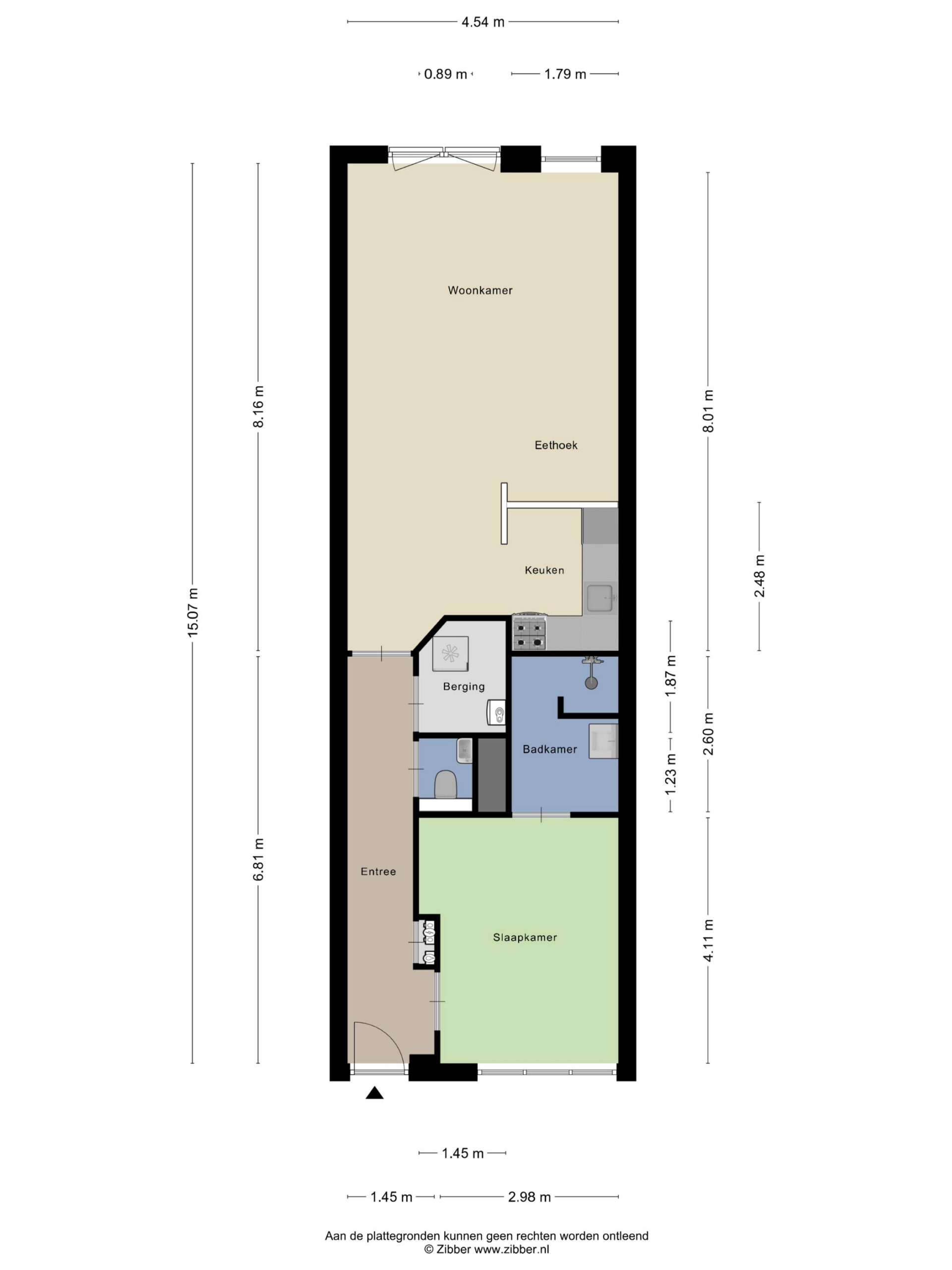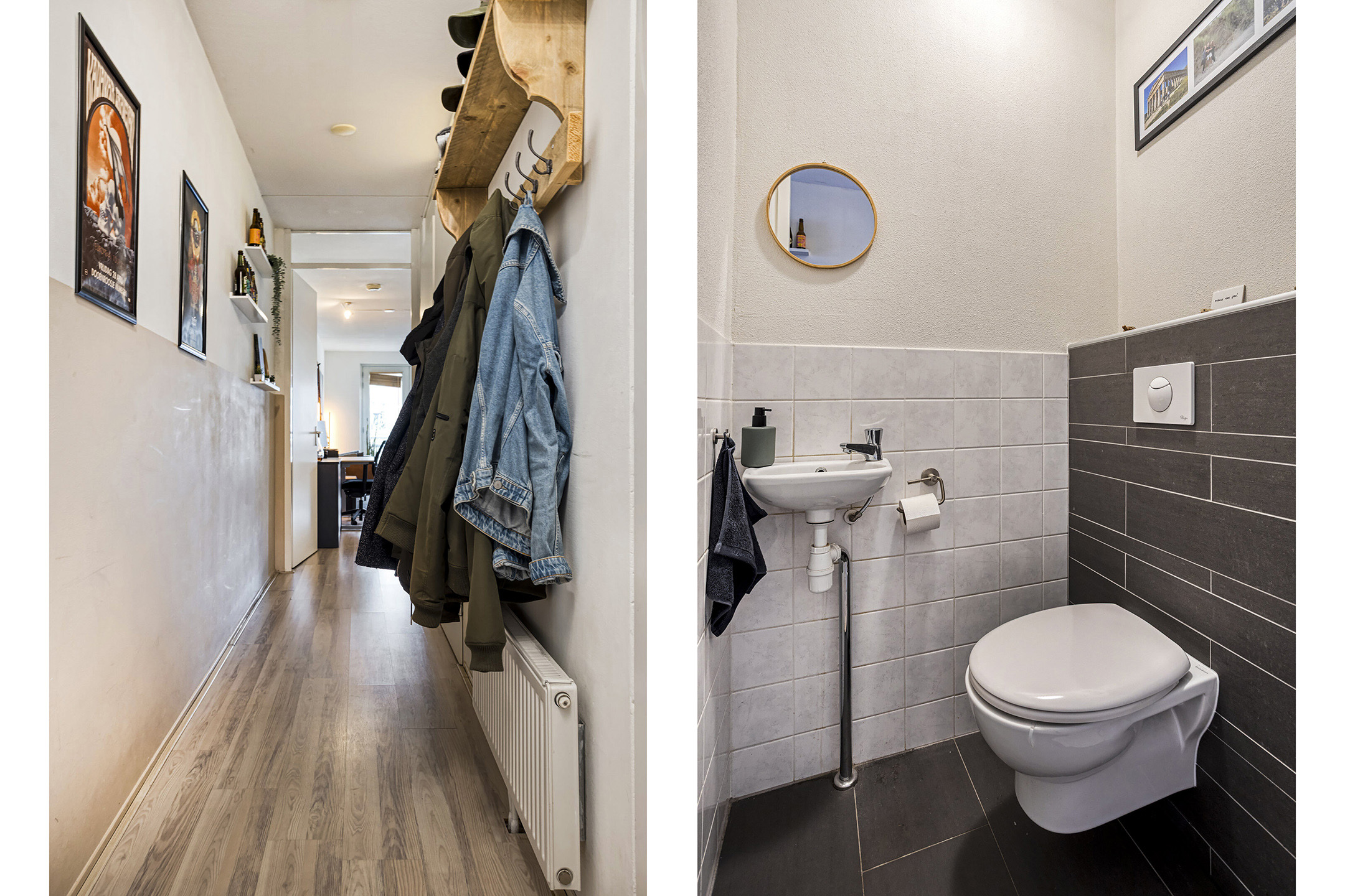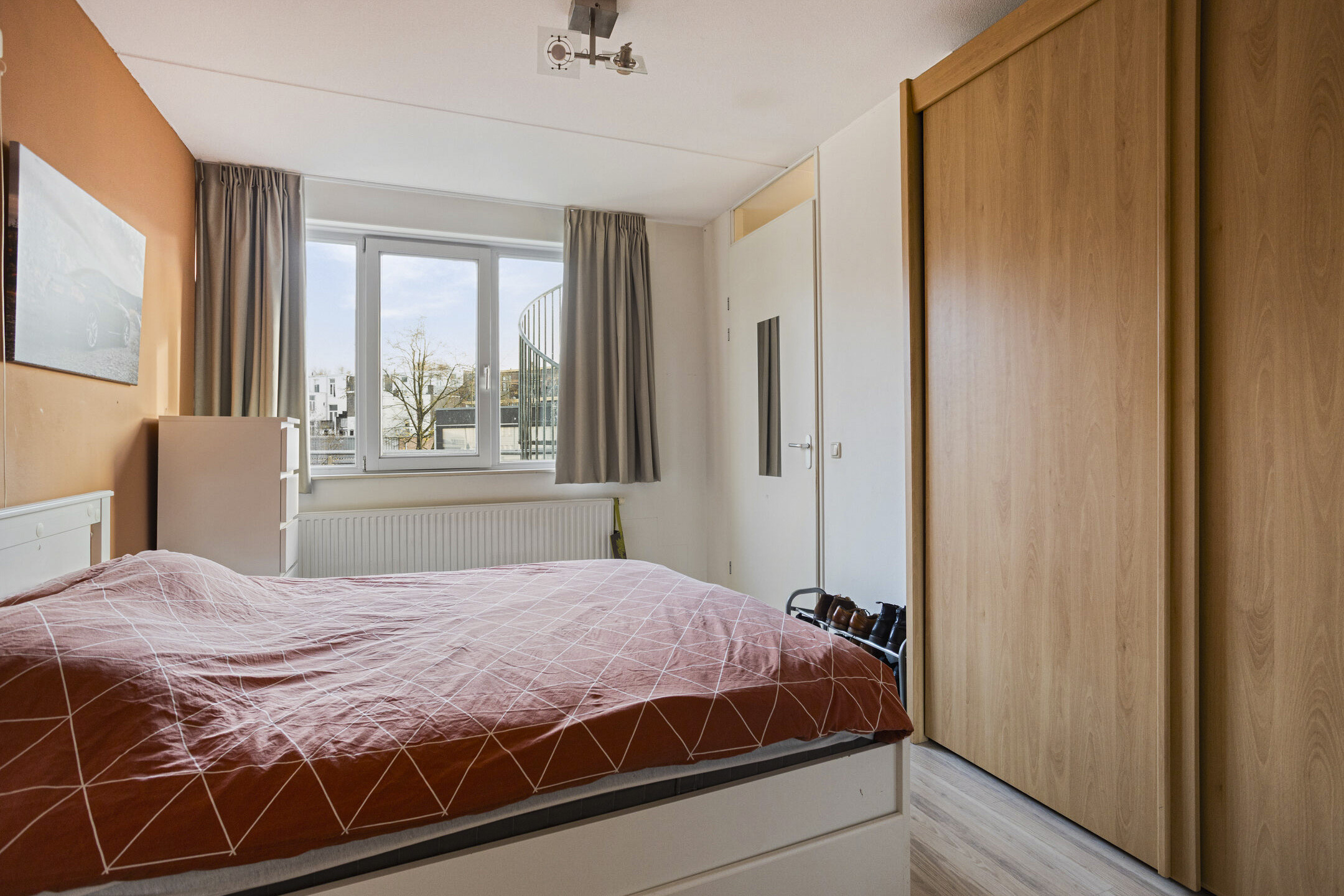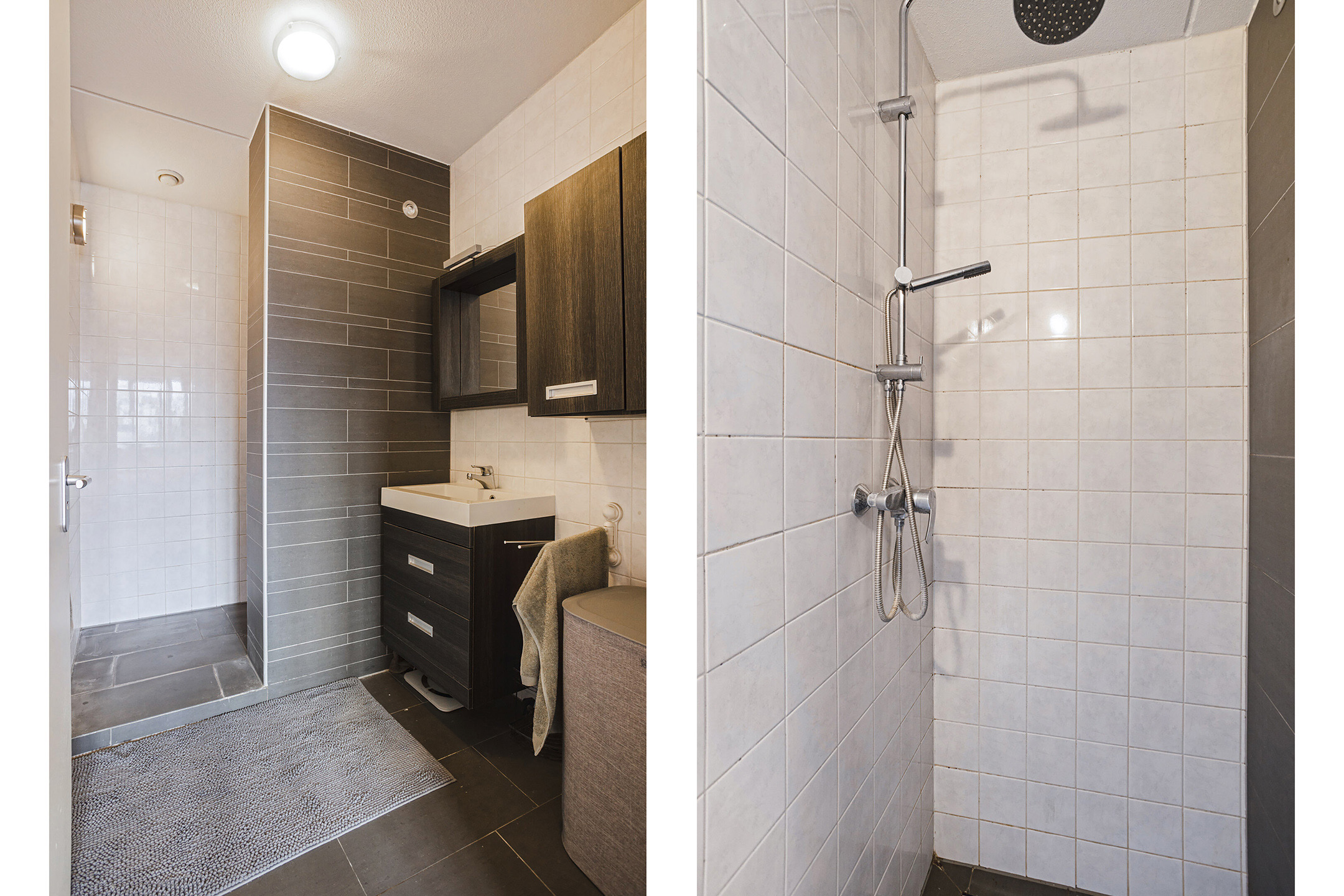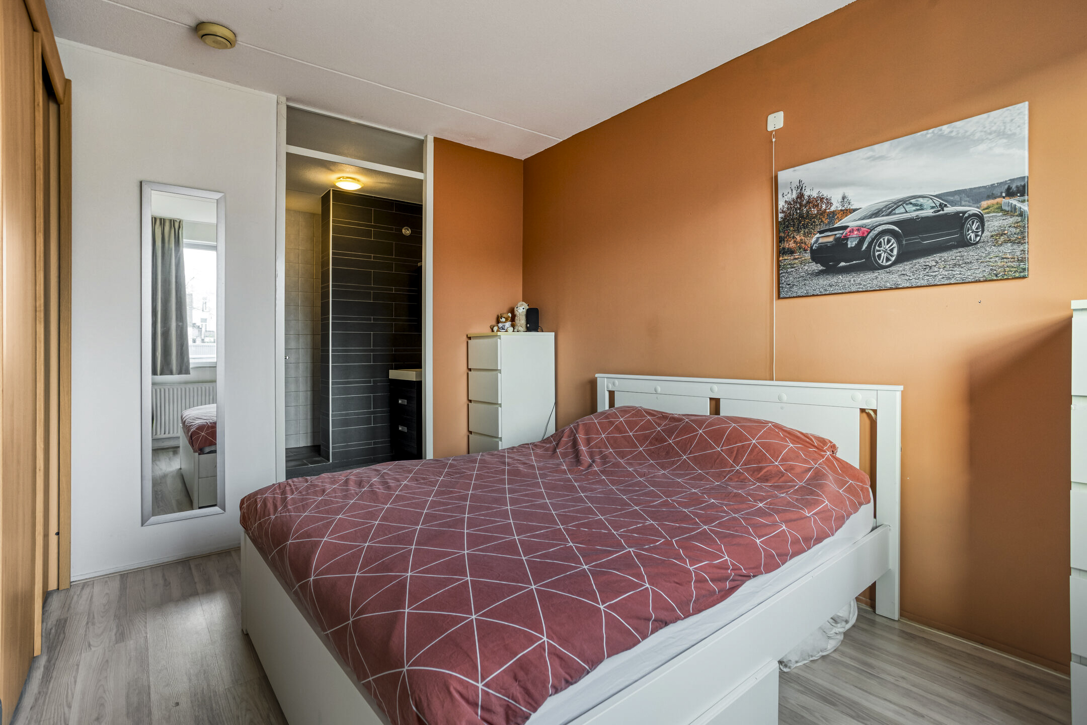De slaapkamer ligt aan de rustige achterkant in het appartement en biedt voldoende plek voor een tweepersoonsopstelling. De via de slaapkamer toegankelijke badkamer is voorzien van een douche en wastafel; het separate toilet bevindt zich in de hal.