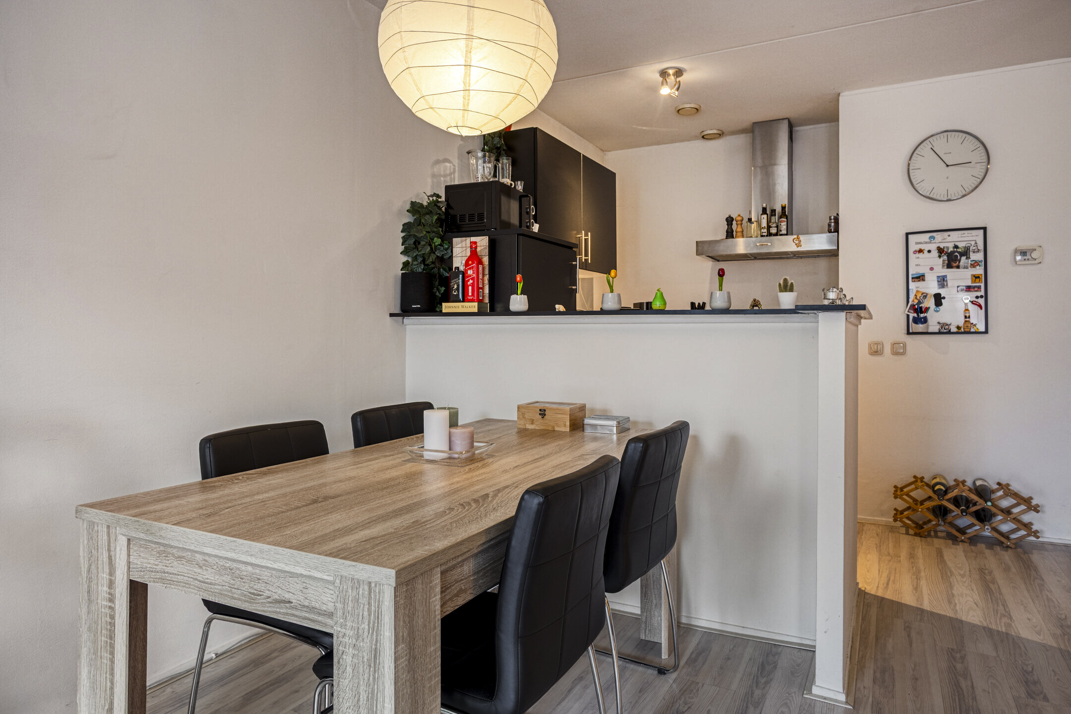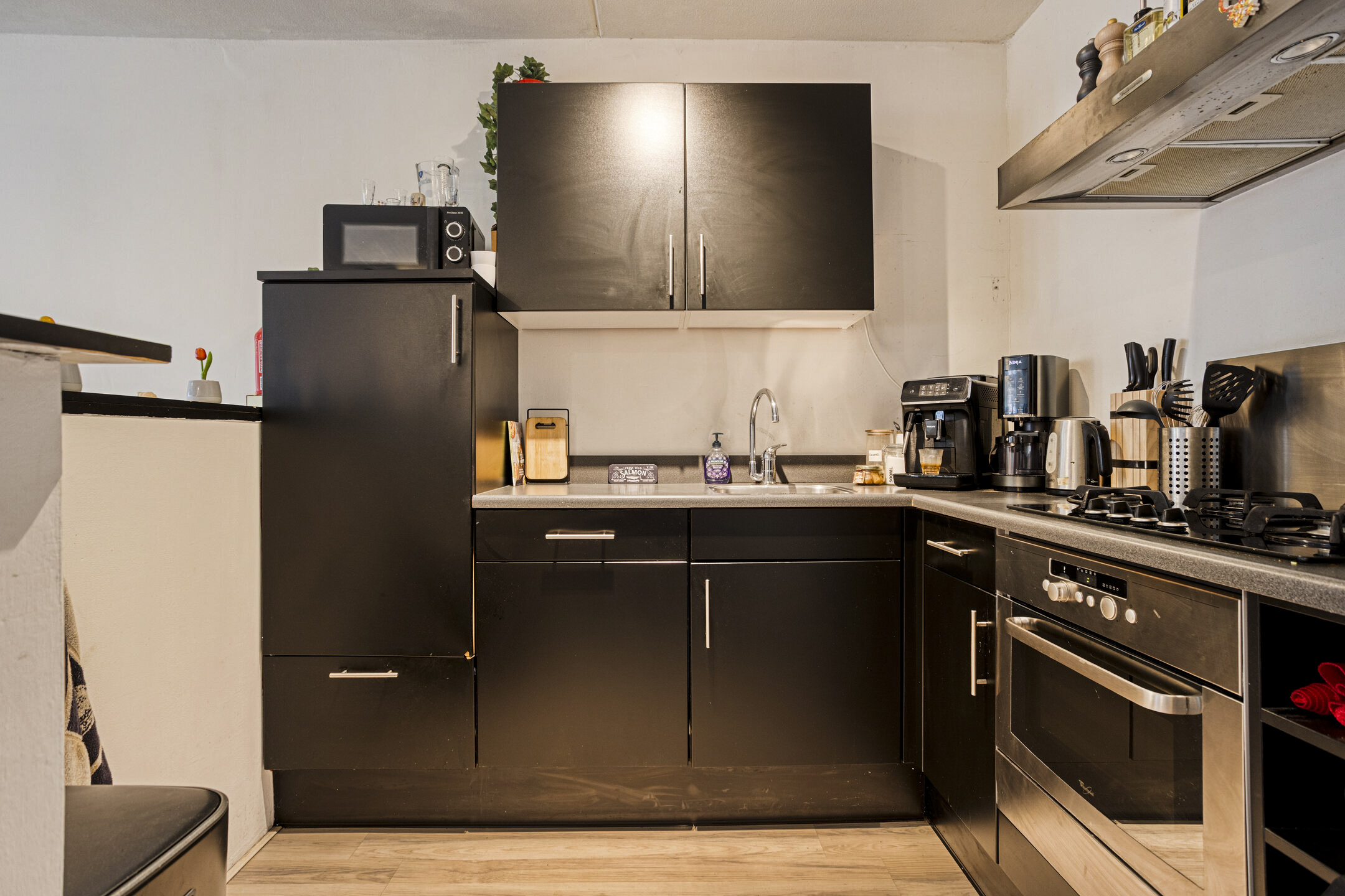 De open keuken sluit logisch aan op de woonruimte en maakt het geheel praktisch en comfortabel.