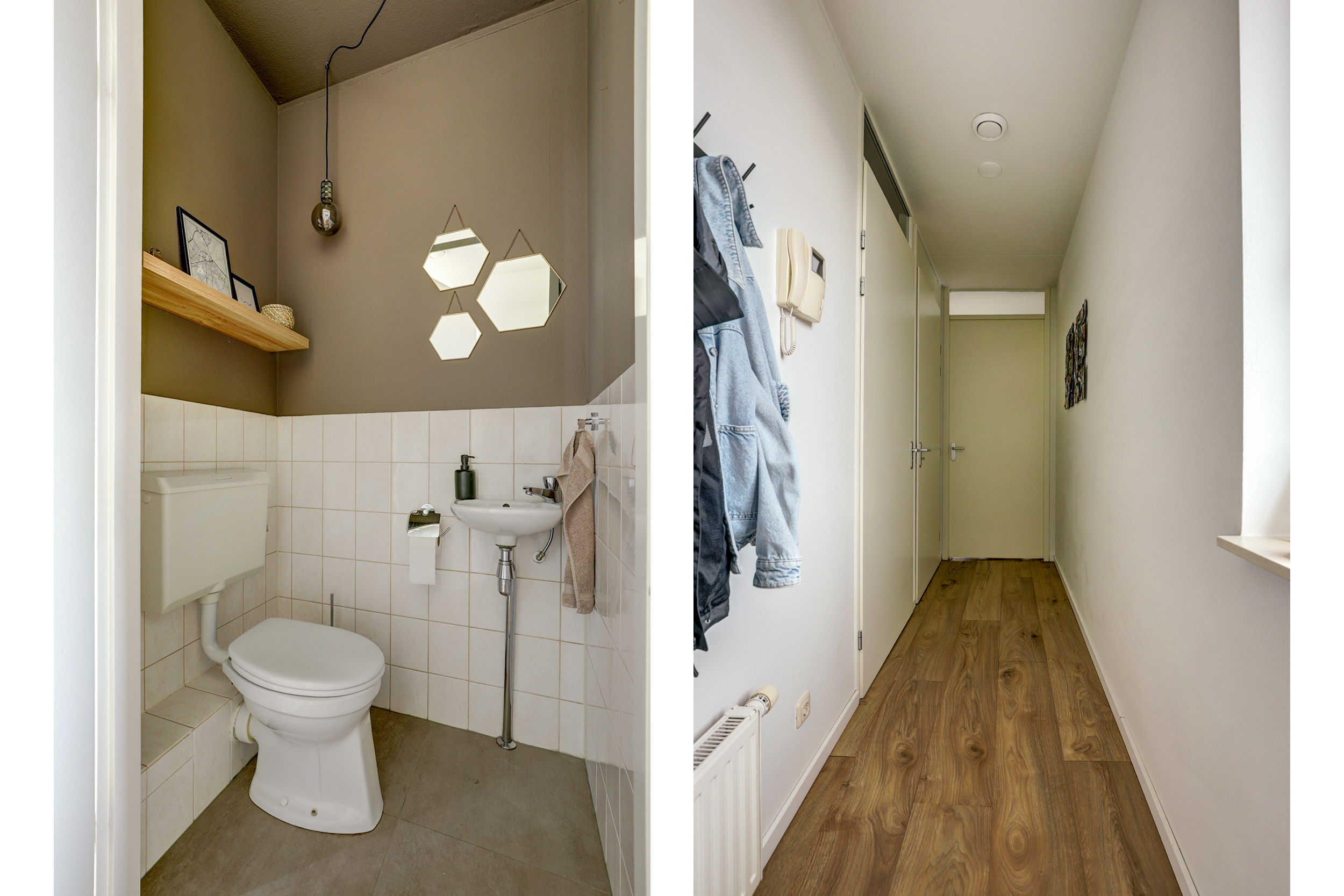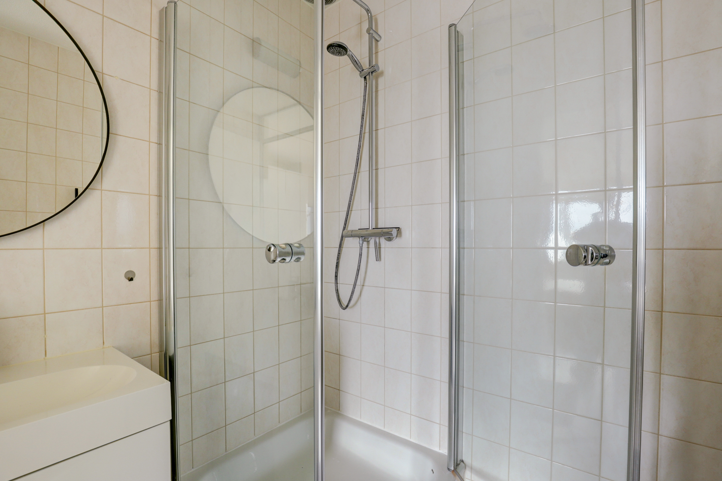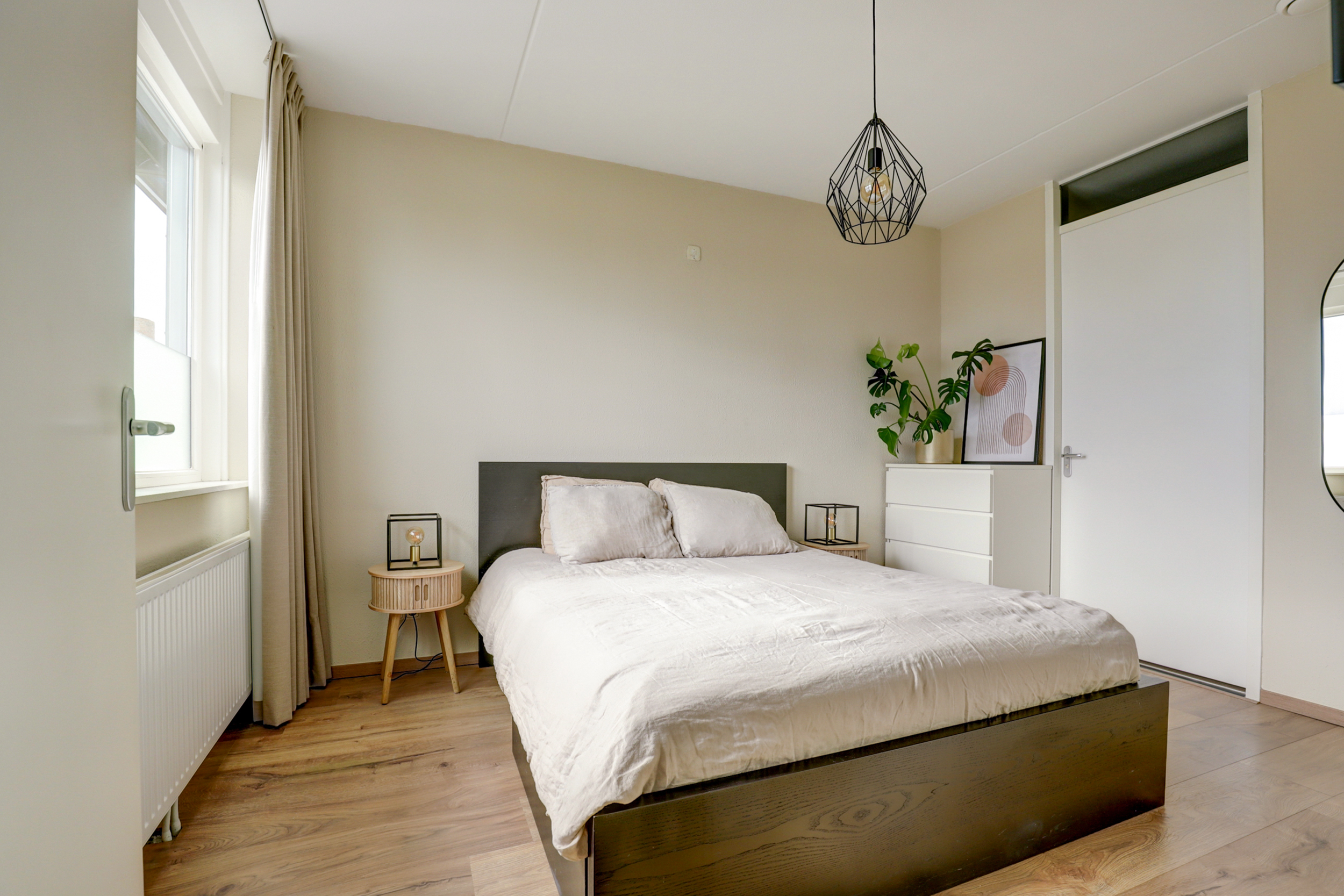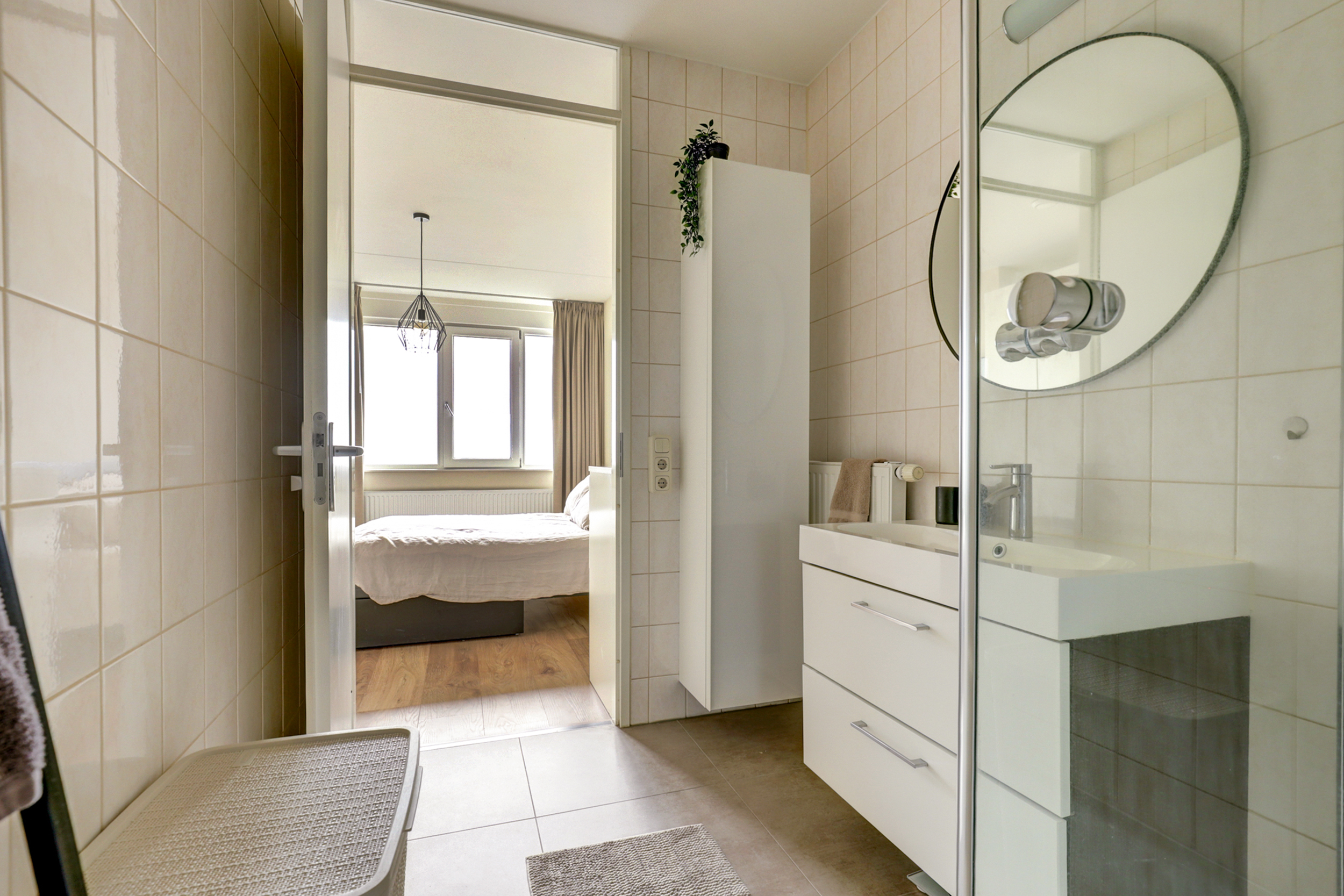 Aan de voorzijde bevindt zich de ruime slaapkamer, direct grenzend aan de badkamer, die is voorzien van een douche en wastafelmeubel. In de hal is een apart toilet gesitueerd, evenals een inpandige berging met ruimte voor wasmachine en extra opbergruimte. Door deze slimme indeling ervaar je optimaal wooncomfort op één woonlaag.