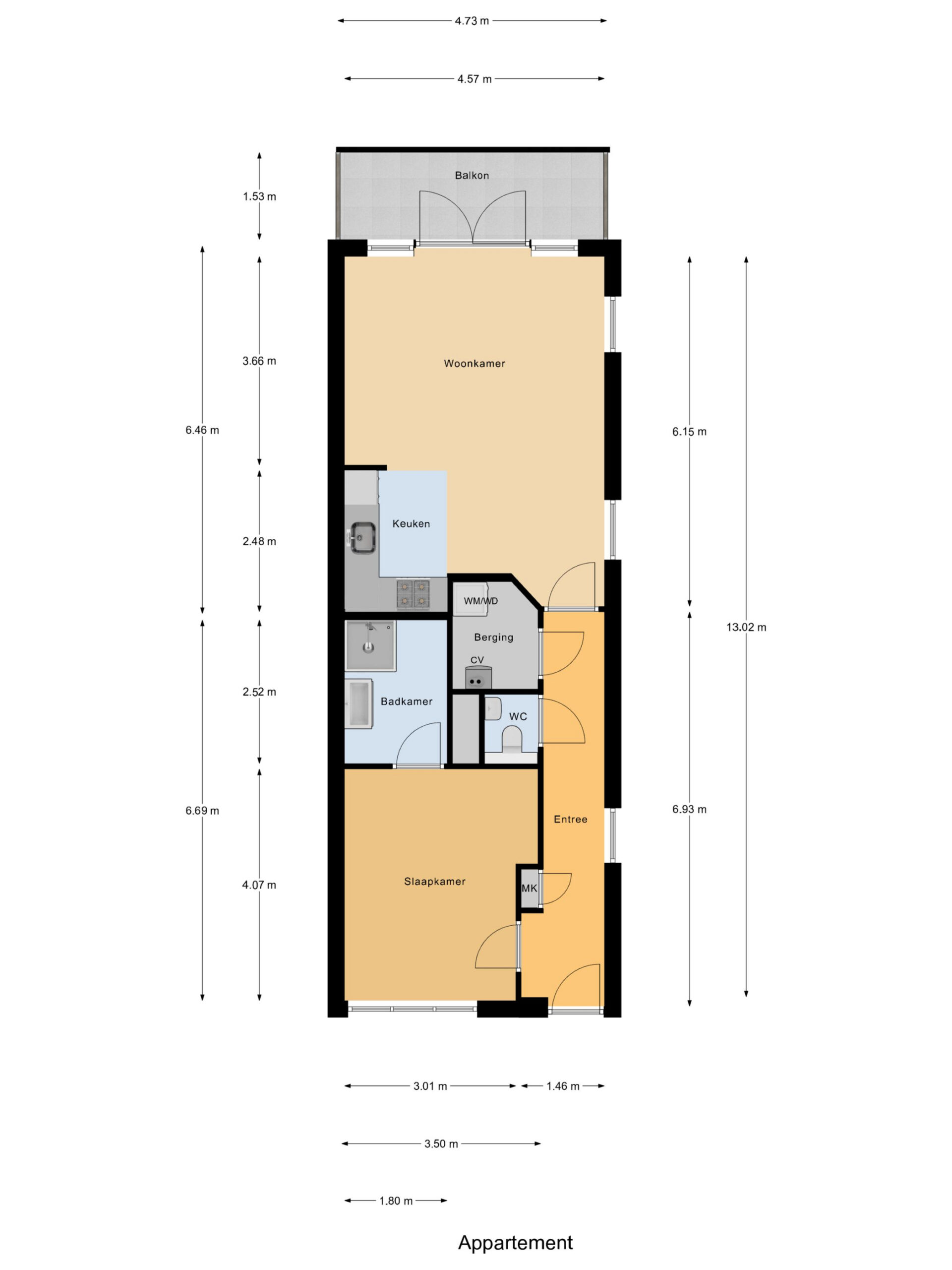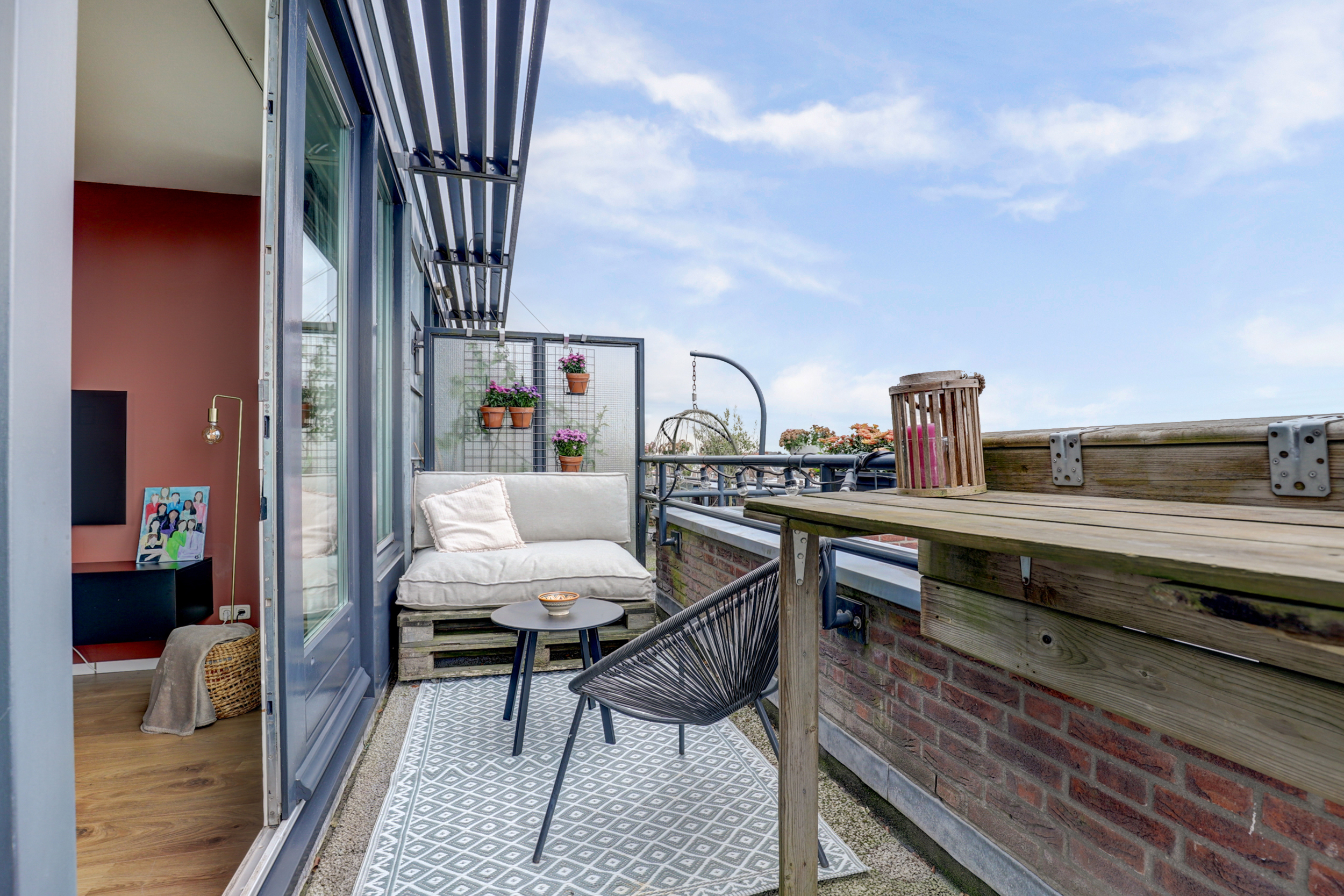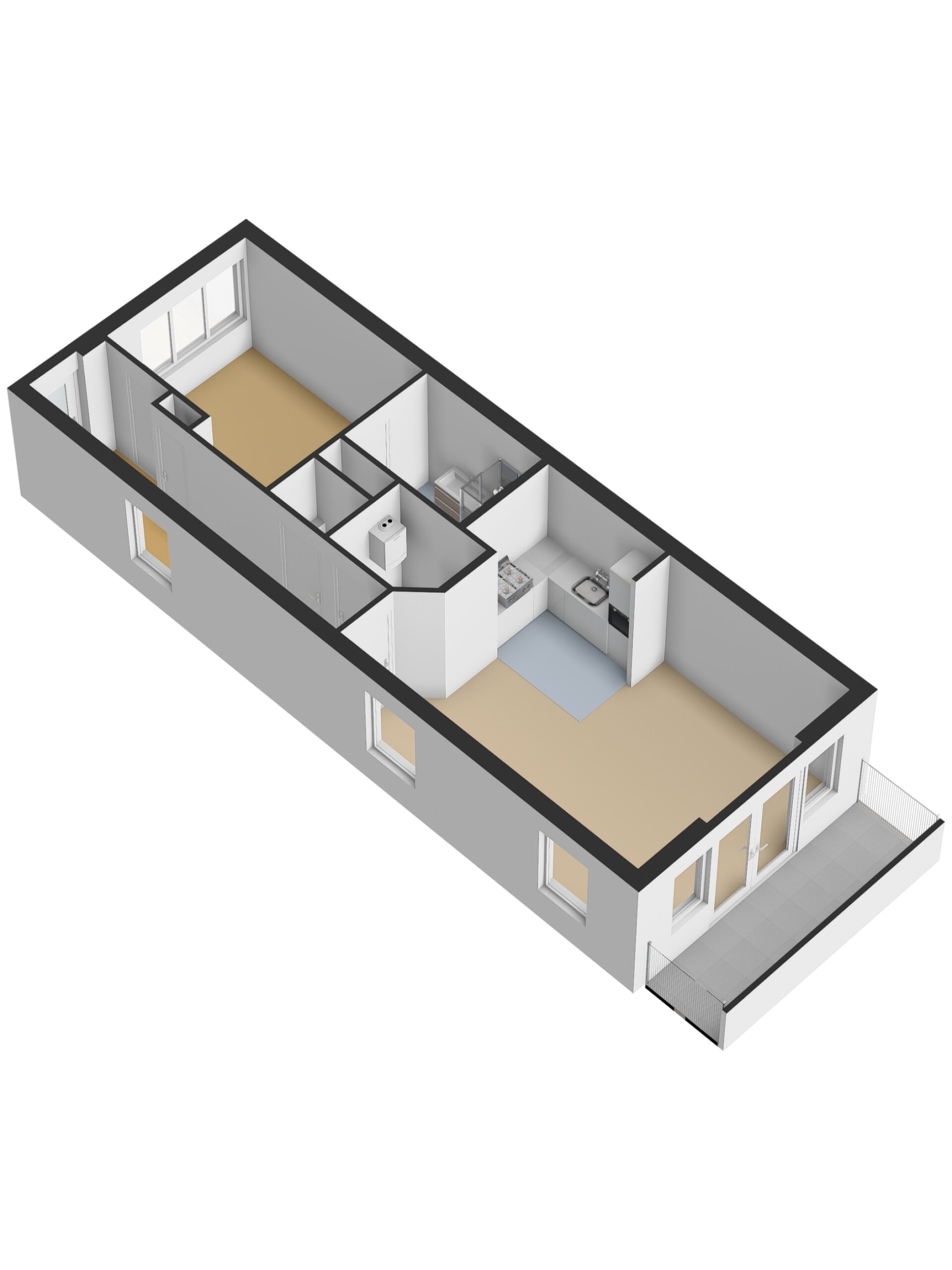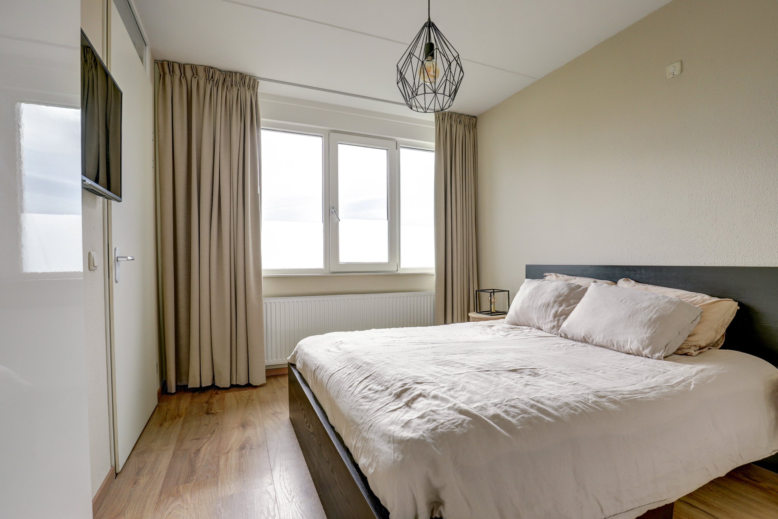 Aan de voorzijde bevindt zich de ruime slaapkamer, direct grenzend aan de badkamer, die is voorzien van een douche en wastafelmeubel. In de hal is een apart toilet gesitueerd, evenals een inpandige berging met ruimte voor wasmachine en extra opbergruimte. Door deze slimme indeling ervaar je optimaal wooncomfort op één woonlaag.