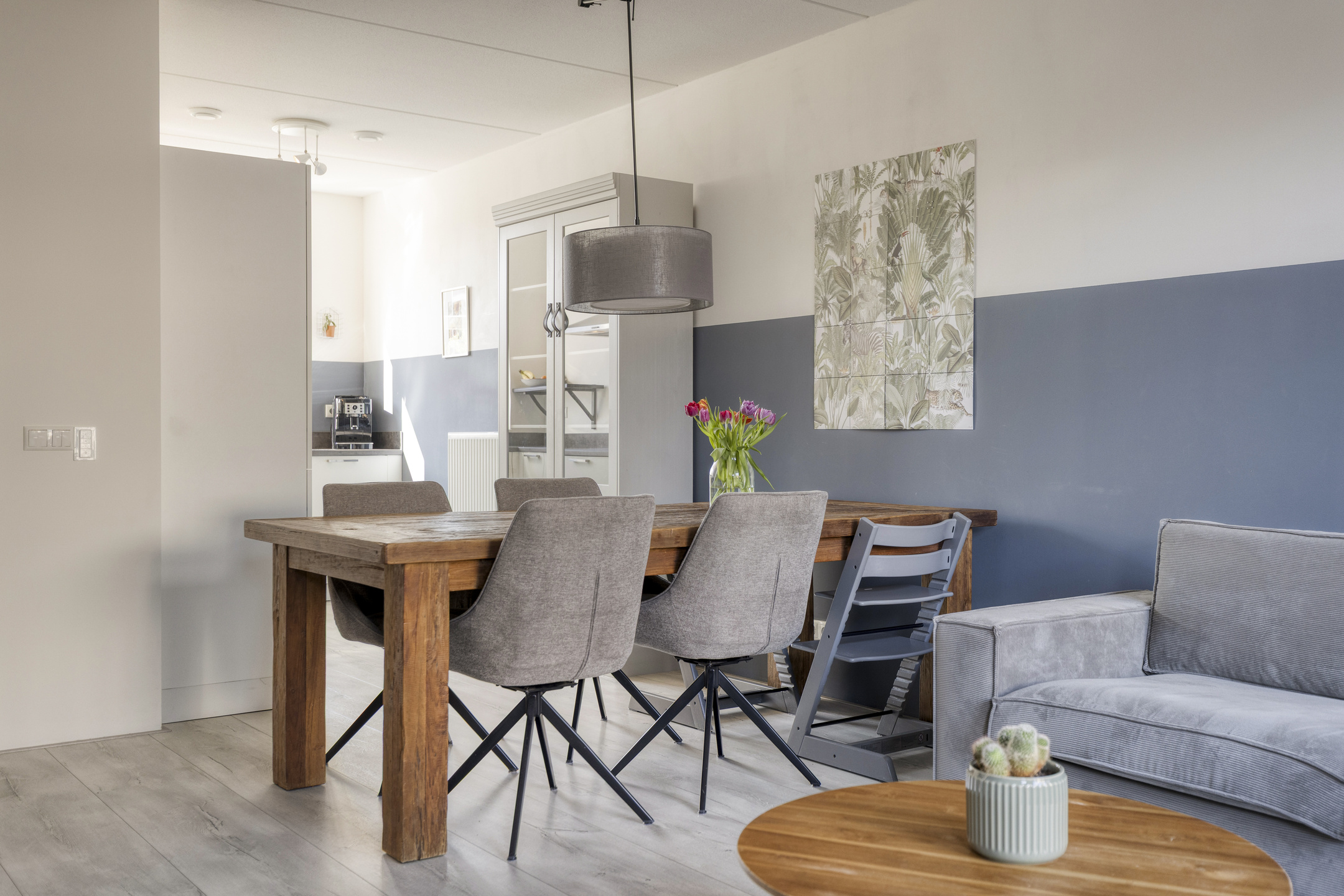 De begane grond is ingericht op het dagelijks gezinsleven. Aan de voorzijde bevindt zich de ruime L-vormige keuken, waar koken en samenkomen centraal staan. De woonkamer ligt tuingericht en profiteert van veel lichtinval en een directe verbinding met buiten. Hier ontstaat een fijne leefruimte waar rust en levendigheid in balans zijn.