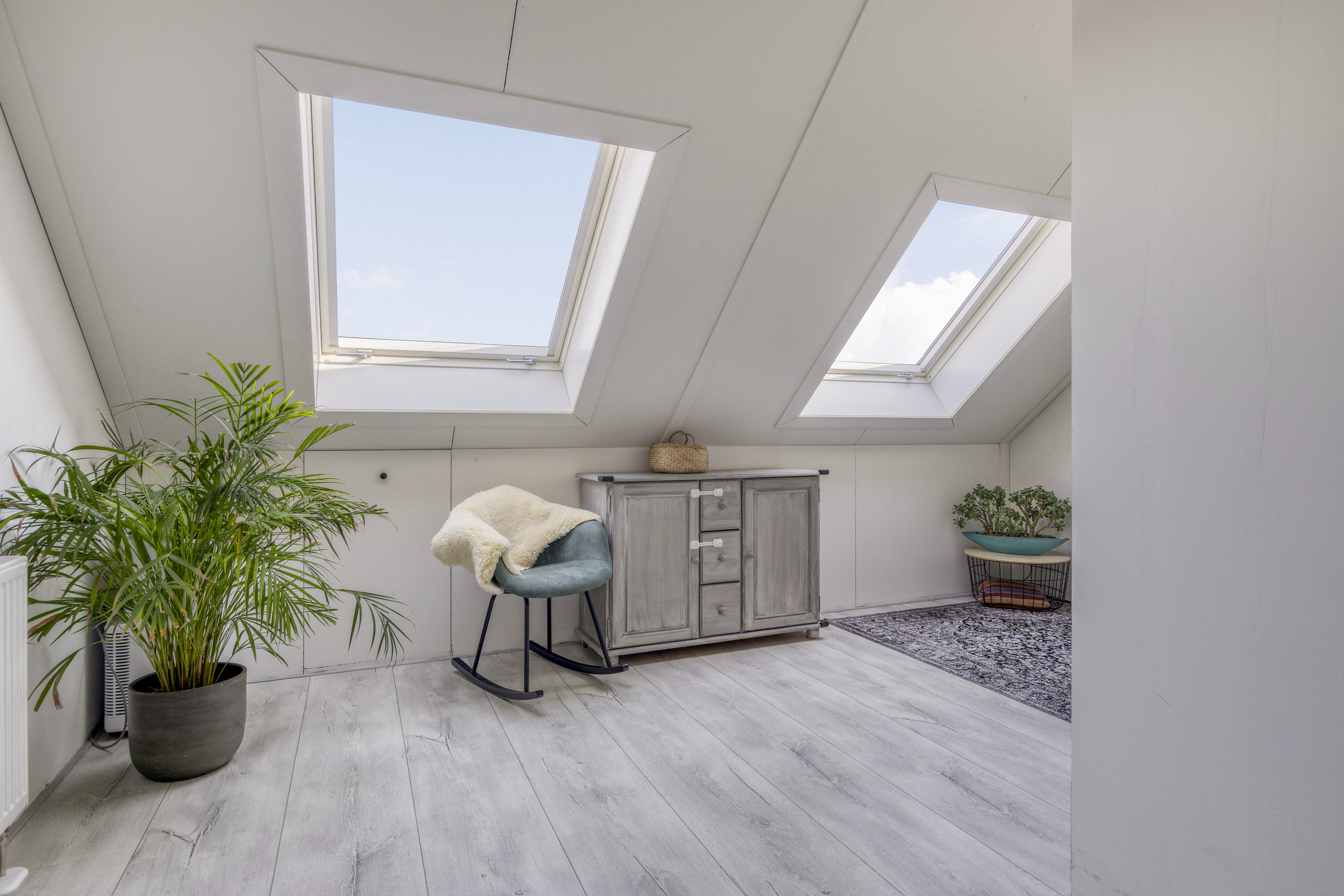 De zolderverdieping beschikt over twee extra kamers, ideaal als slaapkamer, werkruimte of hobbyruimte. De grote Fakro dakramen met rolgordijnen zorgen hier voor prettig daglicht en een aangename sfeer.