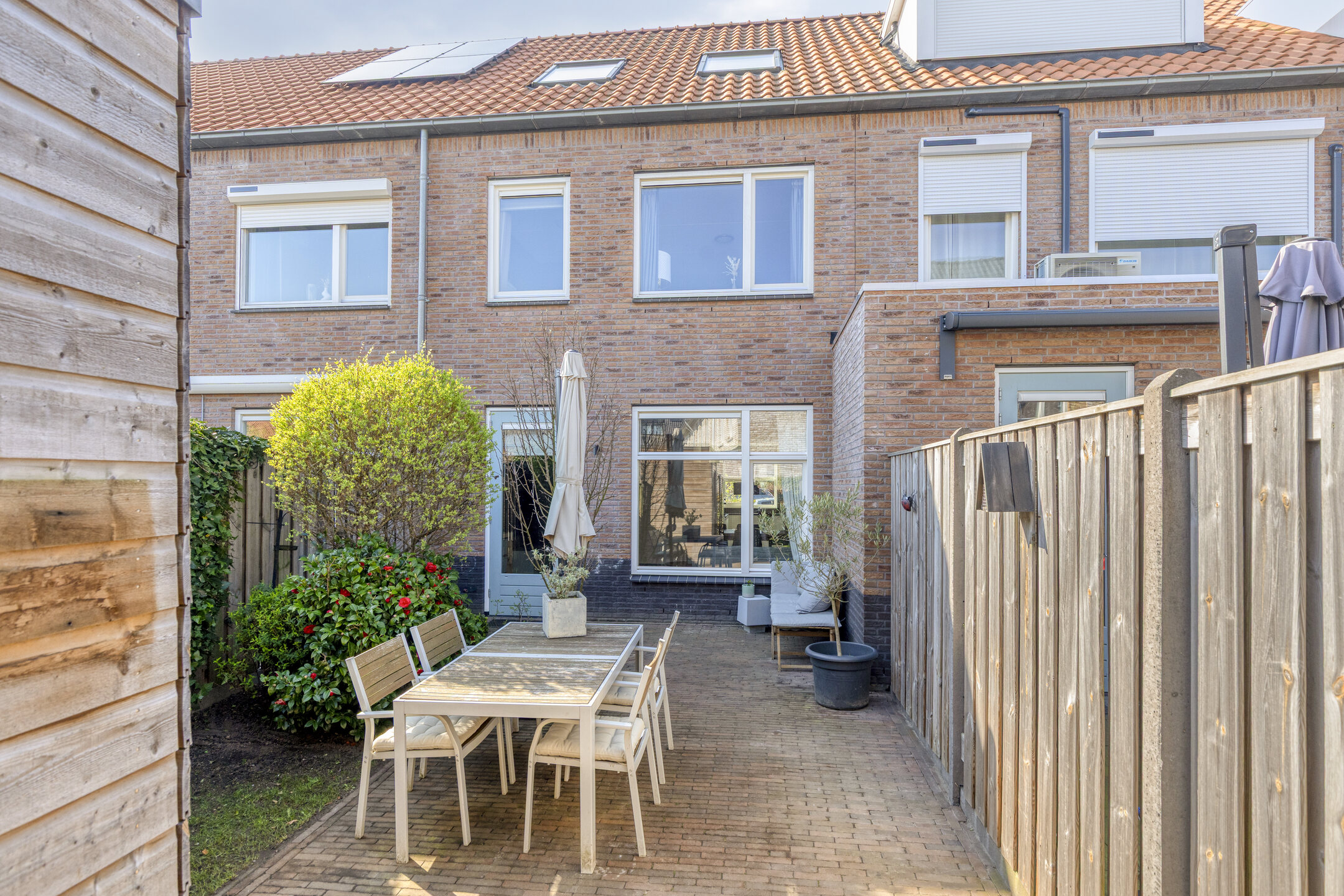 De achtertuin is fraai aangelegd en verzorgd, met veel groen en een prettige sfeer. Vanuit de tuin lopen kinderen direct het aangrenzende hofje op, waar volop ruimte is om veilig te spelen. De vrijstaande houten berging maakt het geheel praktisch en compleet.