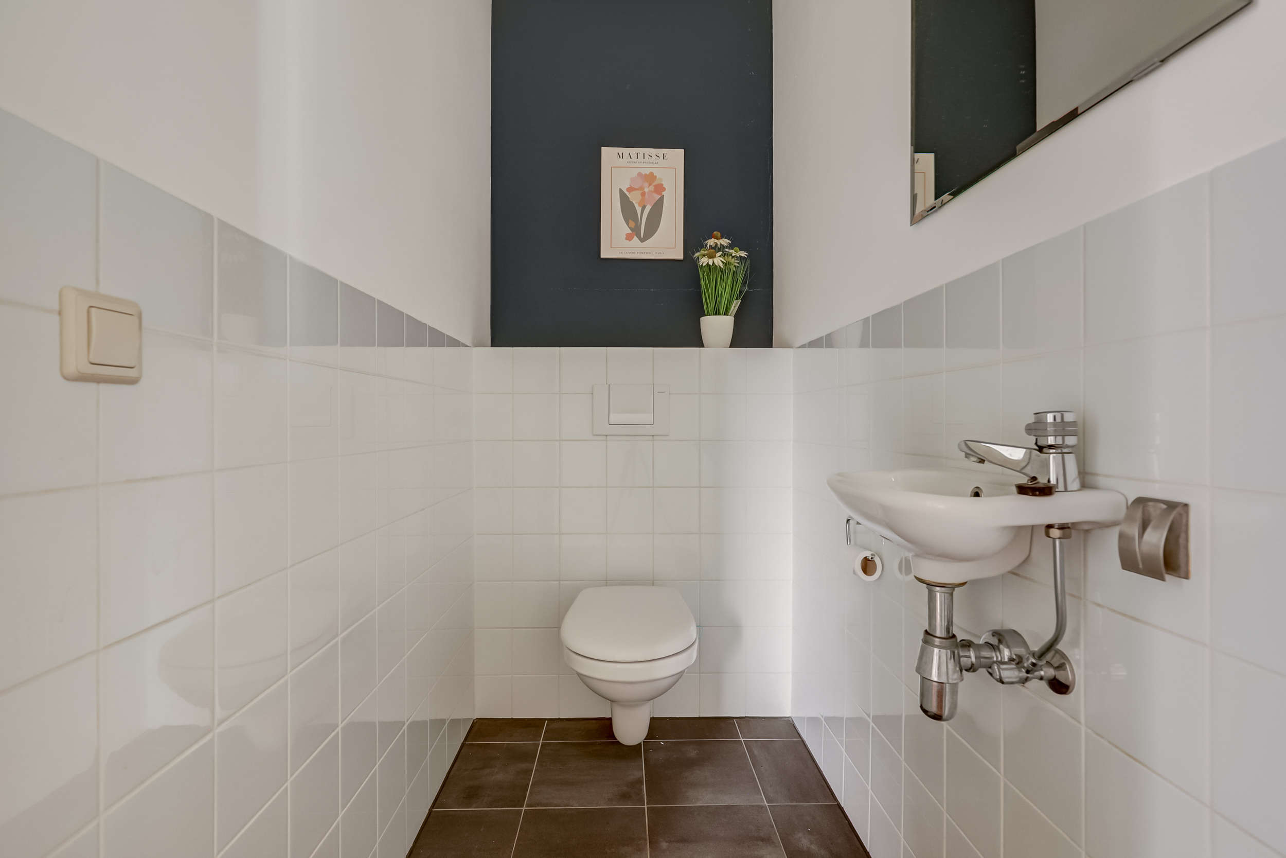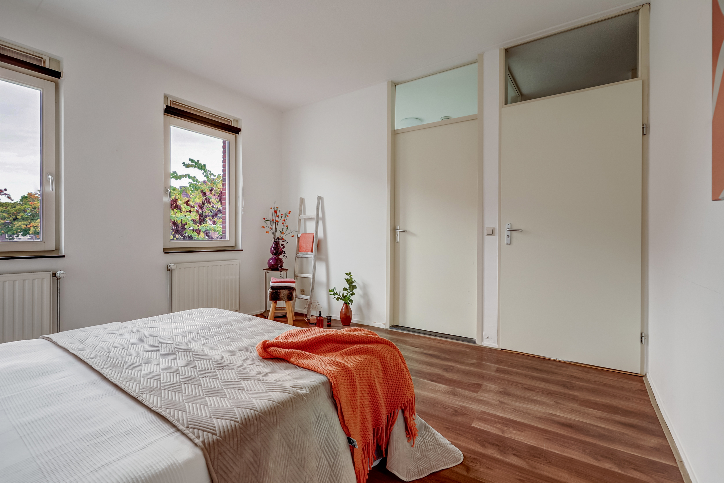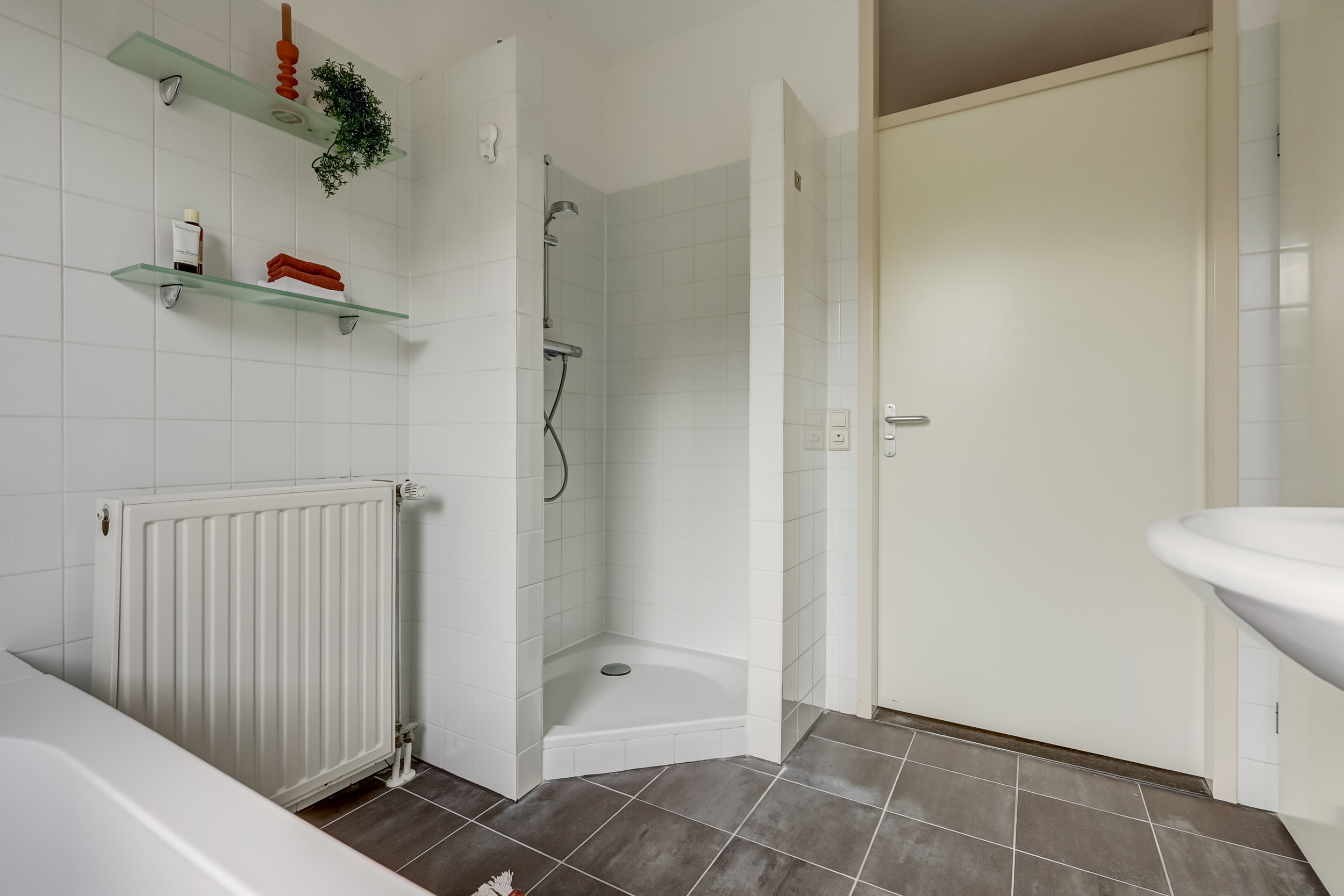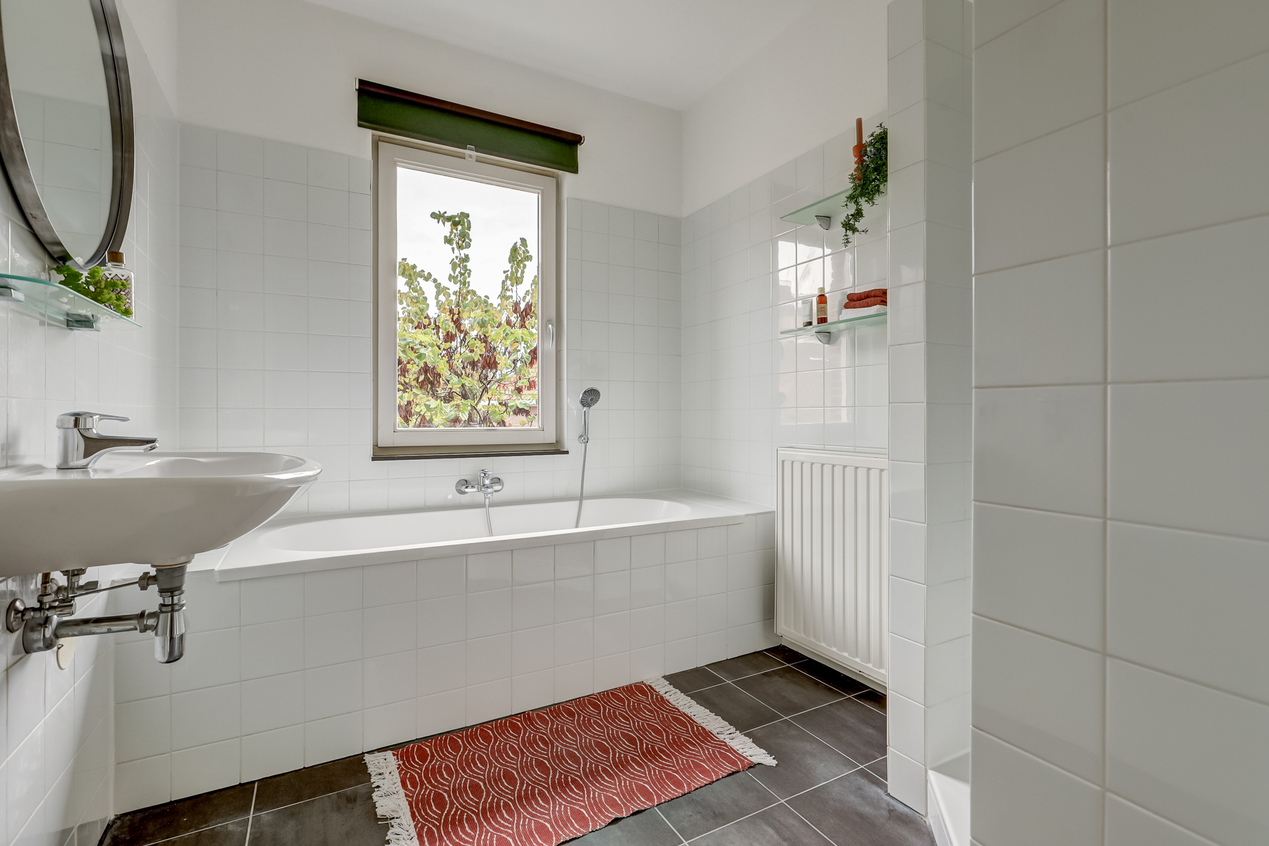 Aan de achterzijde bevinden zich twee slaapkamers van prettig formaat, waarvan één direct toegang heeft tot de badkamer. Deze is tevens vanuit de hal bereikbaar en uitgerust met een ligbad, douchecabine en wastafel en een raam voor daglicht en extra ventilatie. De separate toiletruimte is voorzien van een zwevend toilet met fonteintje.