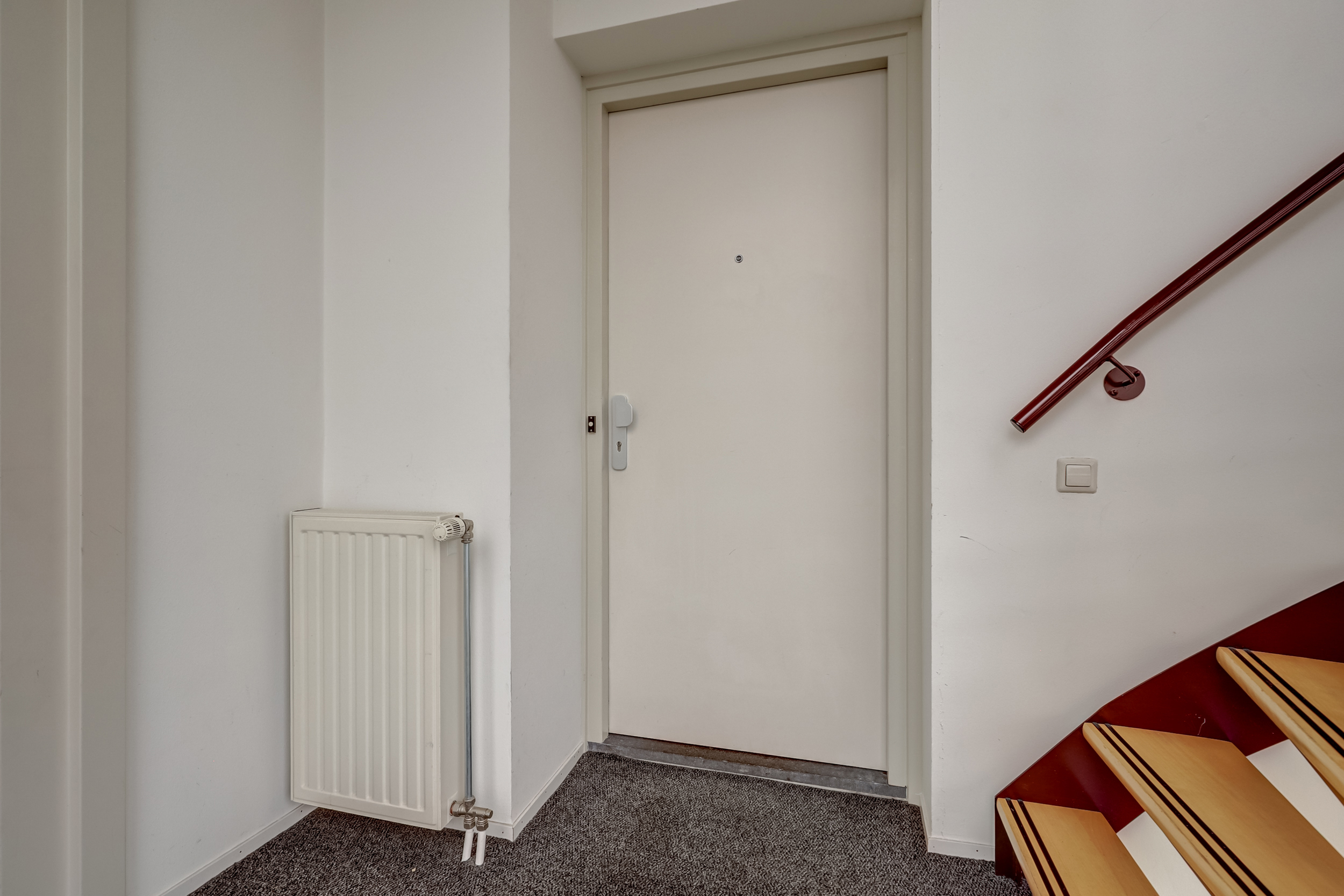 De gezamenlijke entree bevindt zich aan de zijkant van het complex. Hier heb je de keuze om met de trap of de lift naar de eerste verdieping te gaan en vervolgens stap je binnen in het appartement.