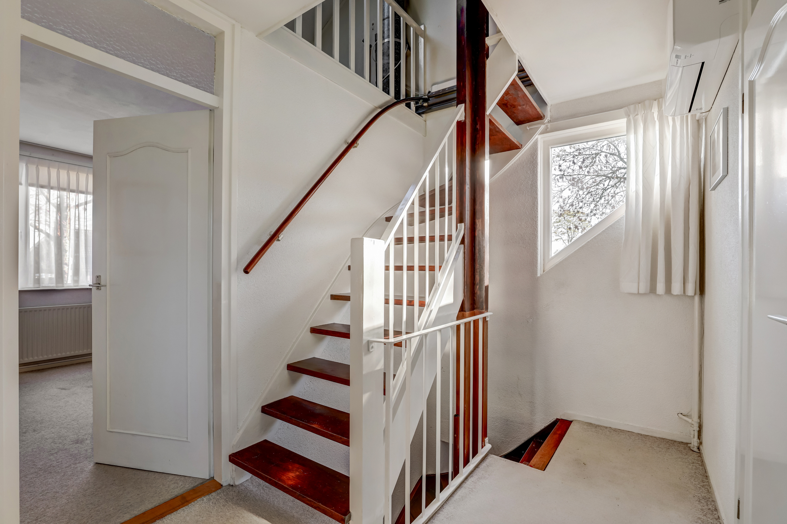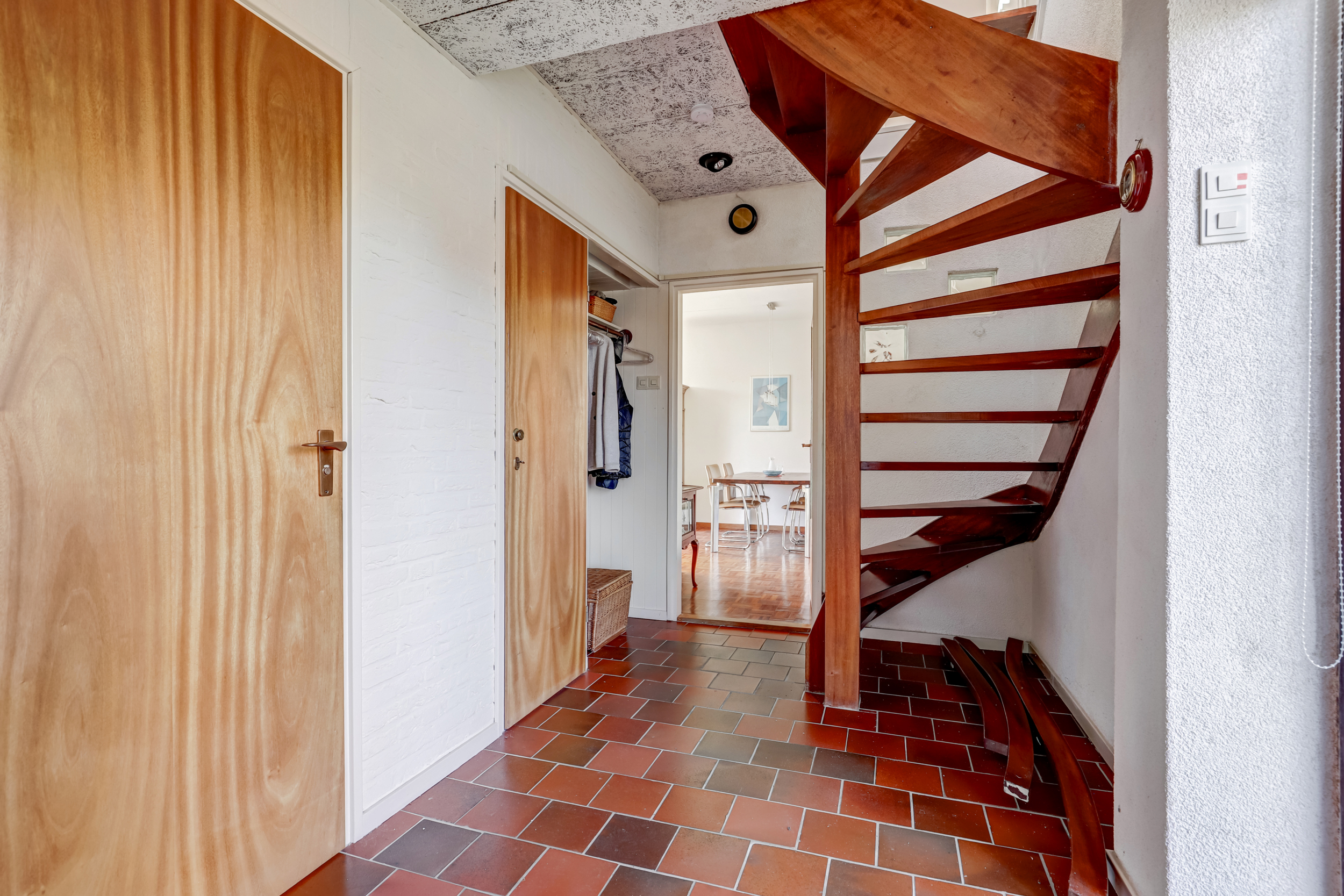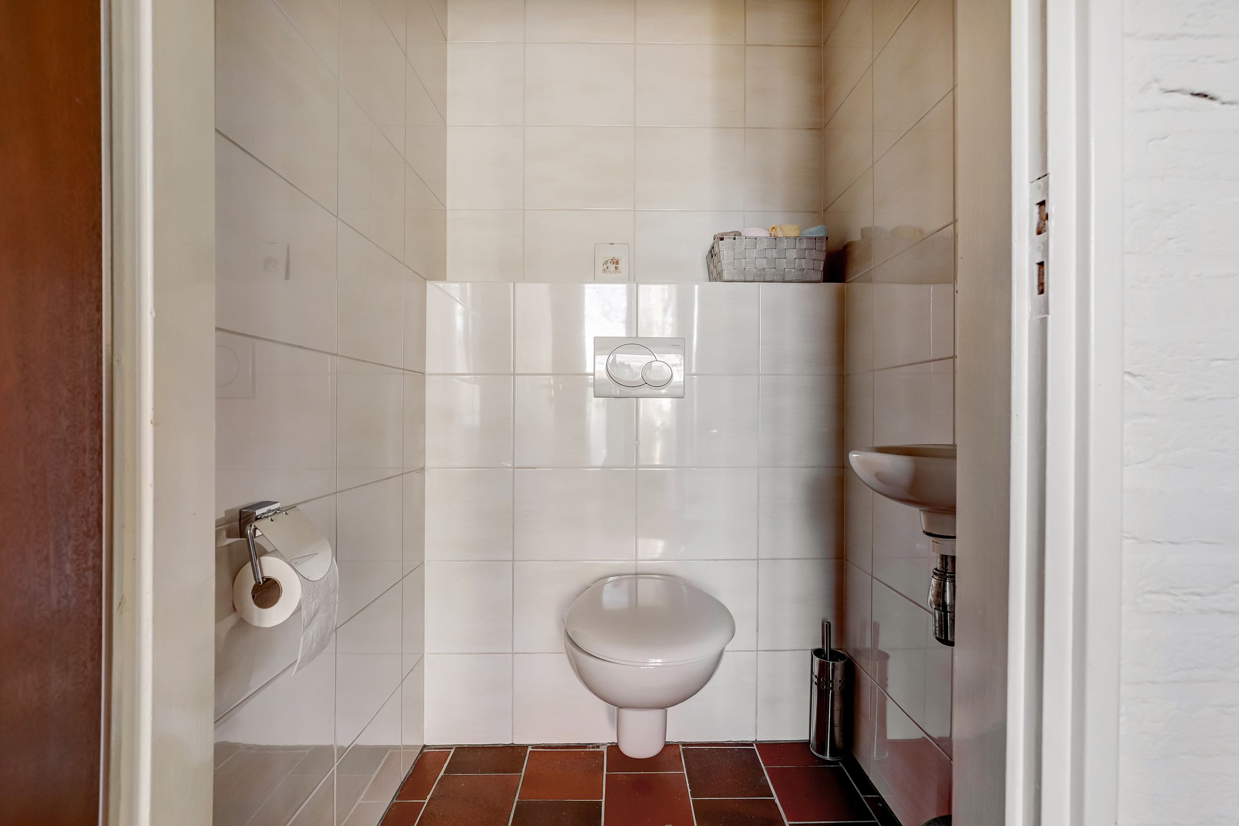 Je komt binnen in een ruime hal met garderobe, meterkast, trapopgang, trapkast en een toiletruimte met vrij hangend toilet. Vanuit de hal stap je de woonkamer in: een fijne leefruimte met veel licht, dankzij de brede raampartijen. Het zitgedeelte ligt aan de voorzijde; aan de achterzijde zorgen schuifpuien voor direct contact met de tuin.