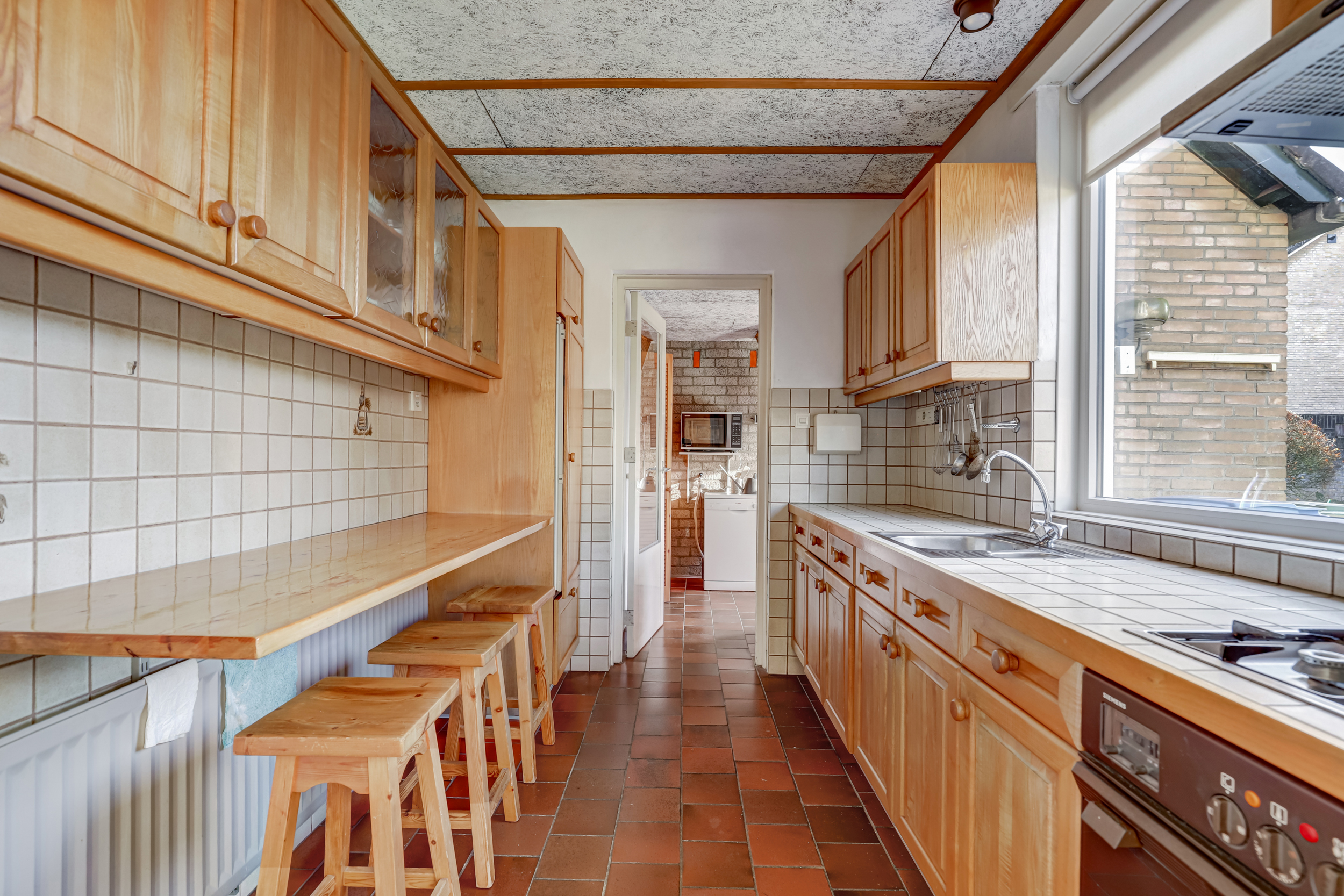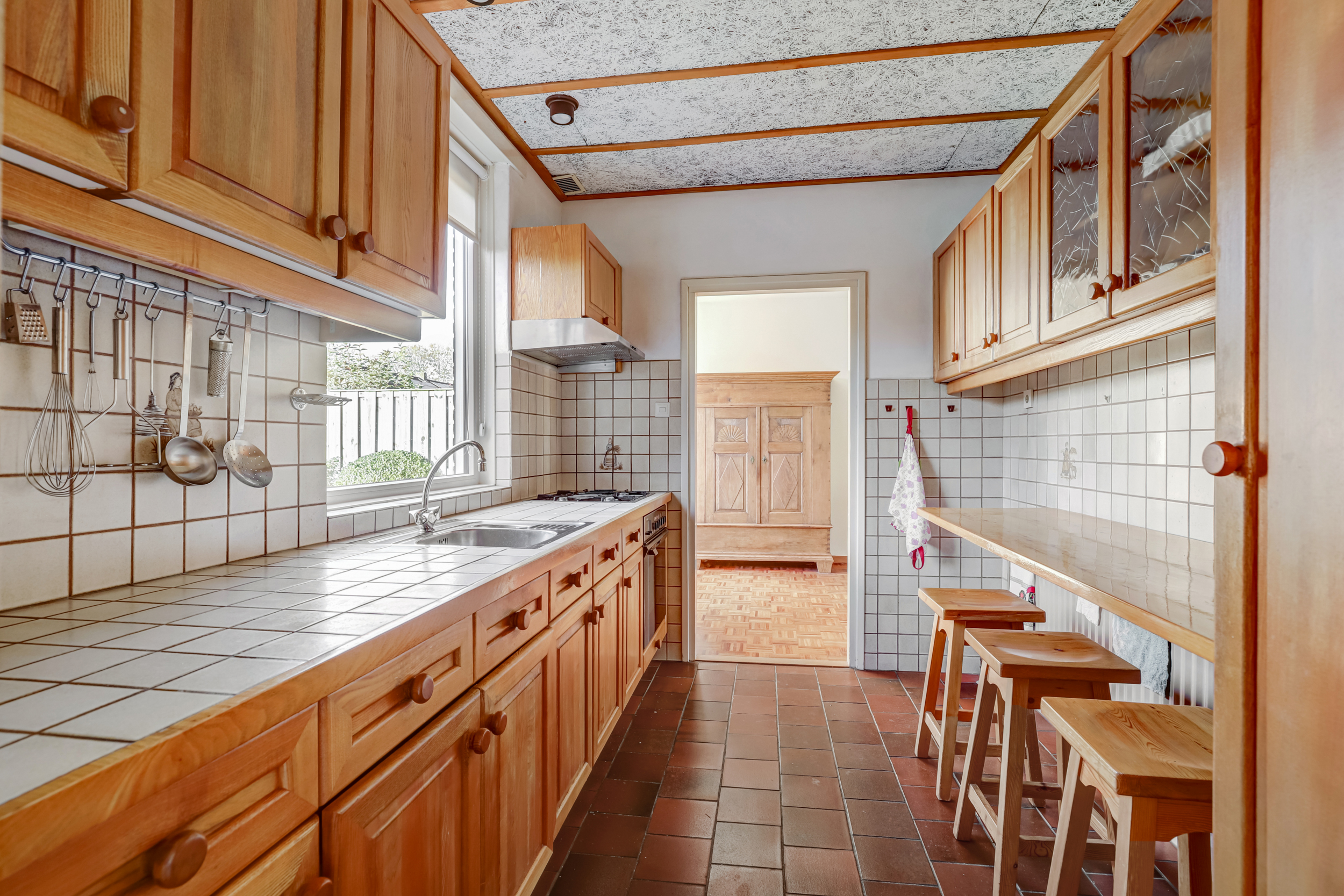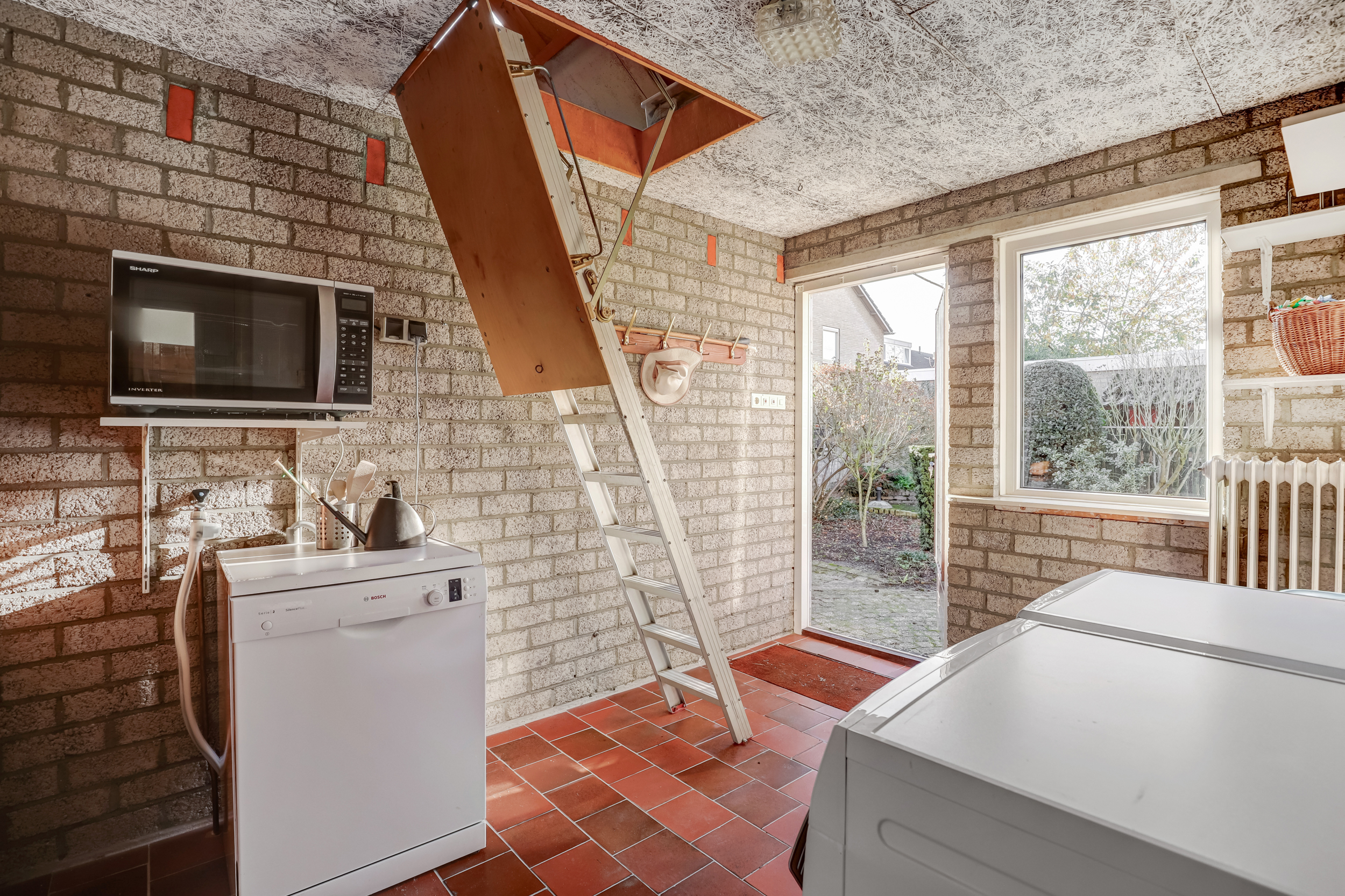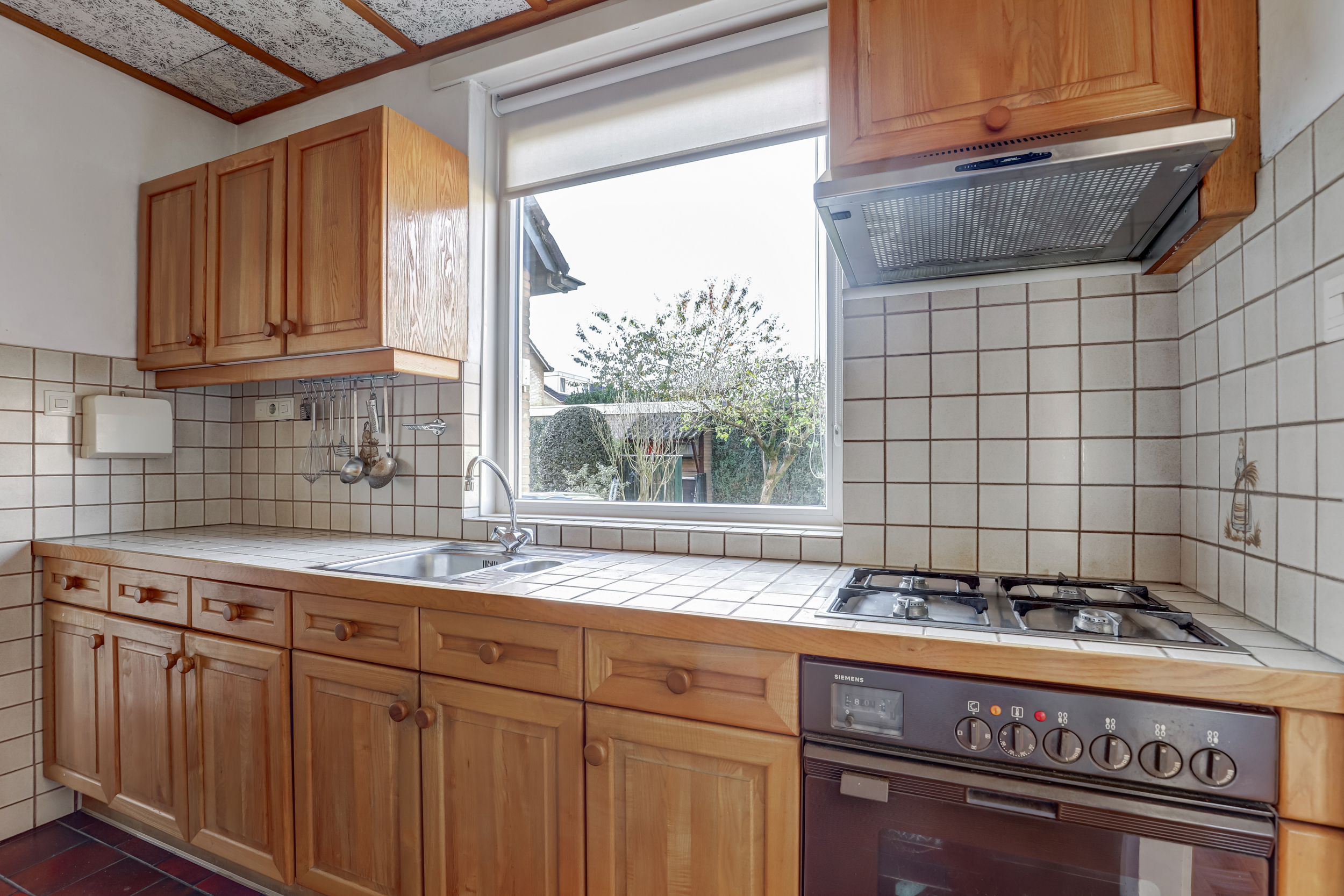 De keuken is afgesloten van de woonkamer en voorzien van basisapparatuur. Vanuit hier loop je door naar de praktische bijkeuken met witgoedaansluitingen en toegang tot de tuin. In de bijkeuken bevindt zich tevens de vlizotrap naar de ruime bergzolder boven de bijkeuken en de garage — een ideale plek voor seizoensspullen of sportartikelen.