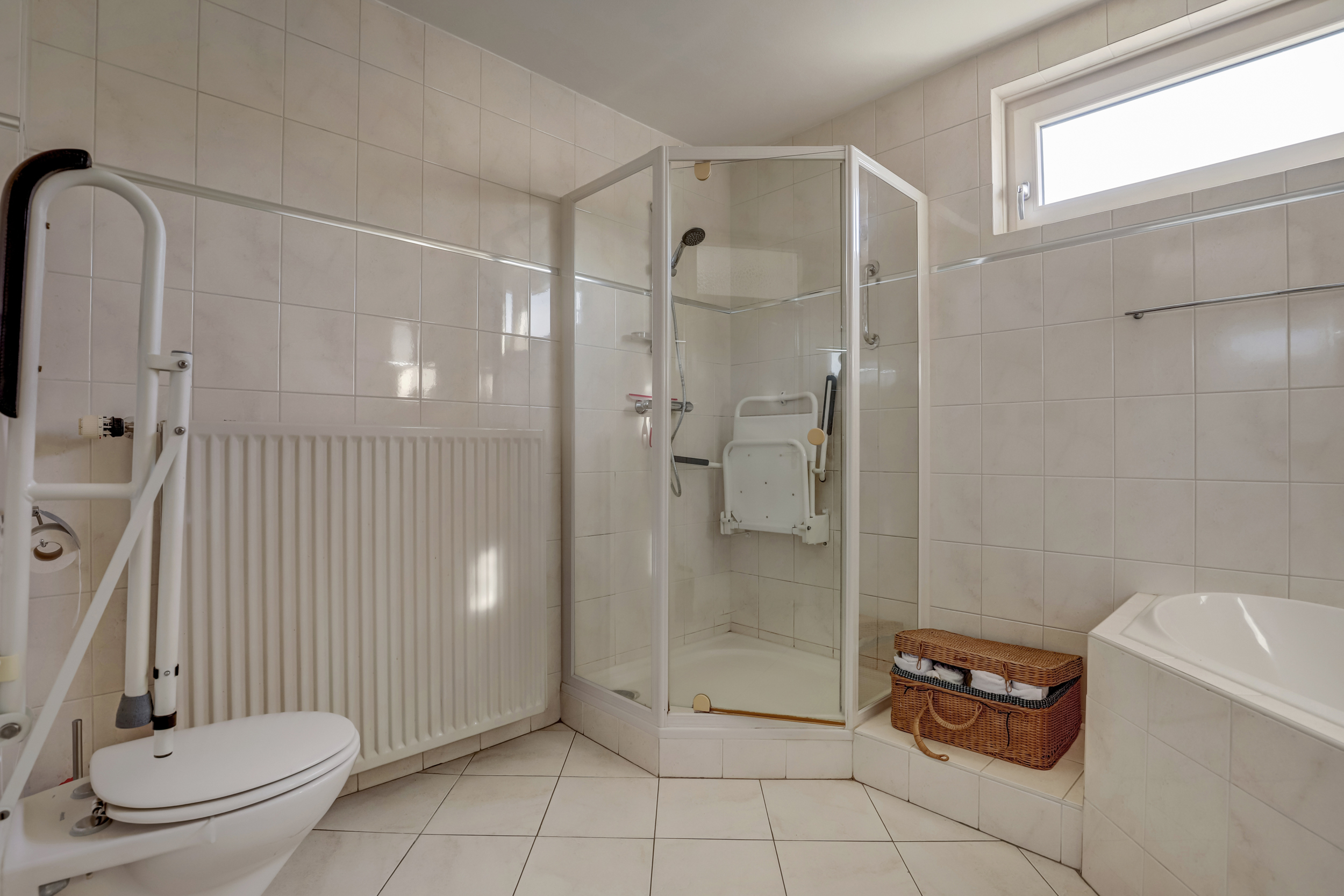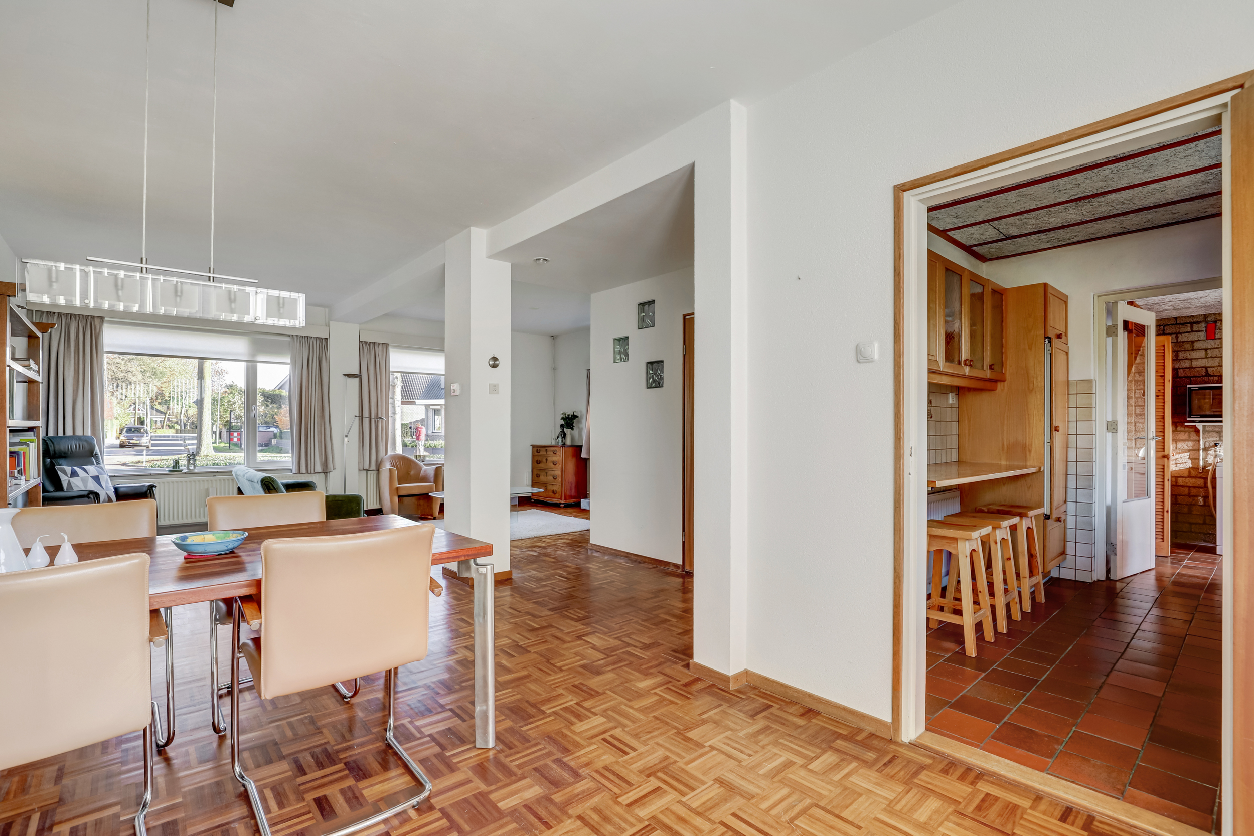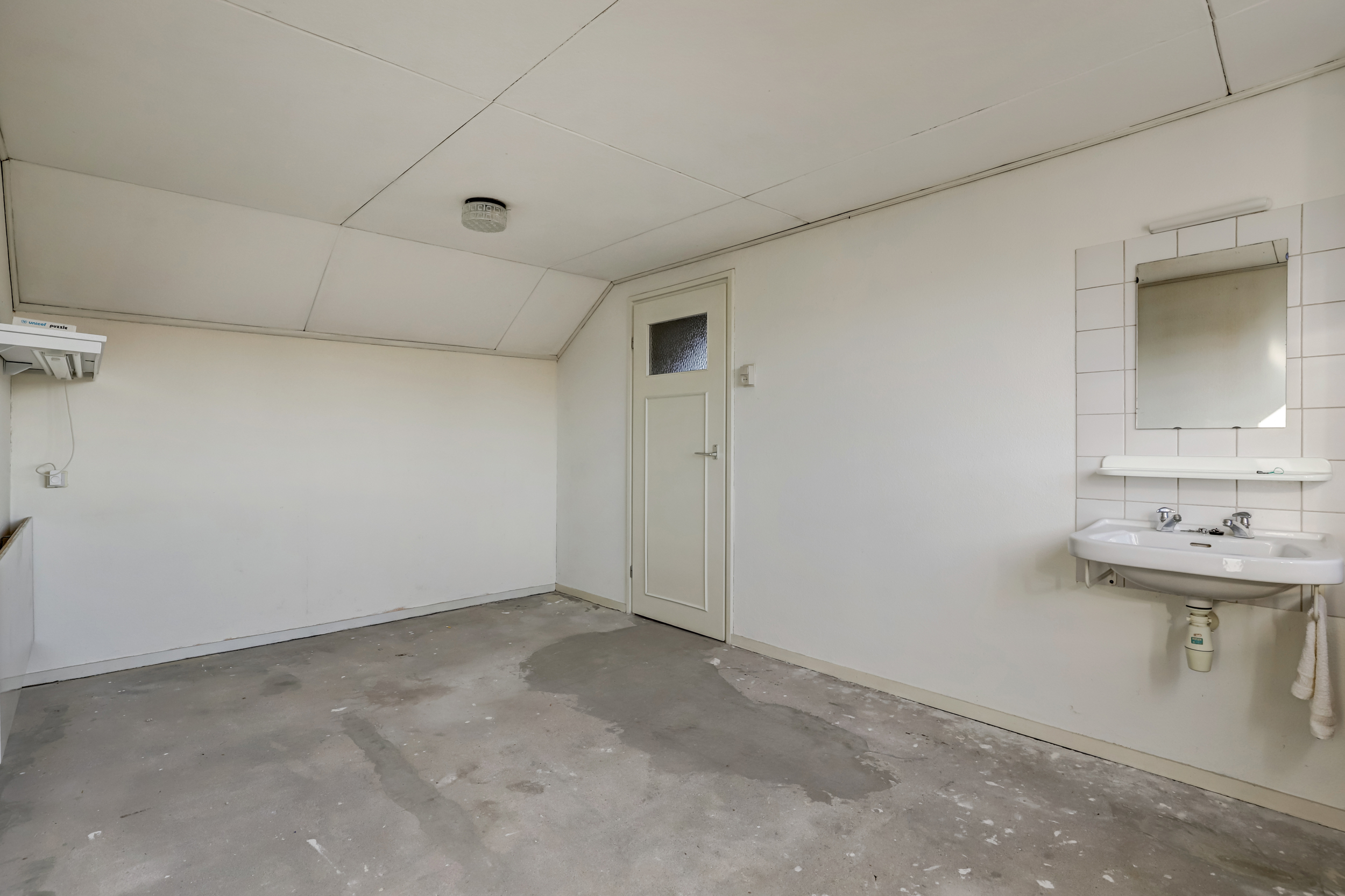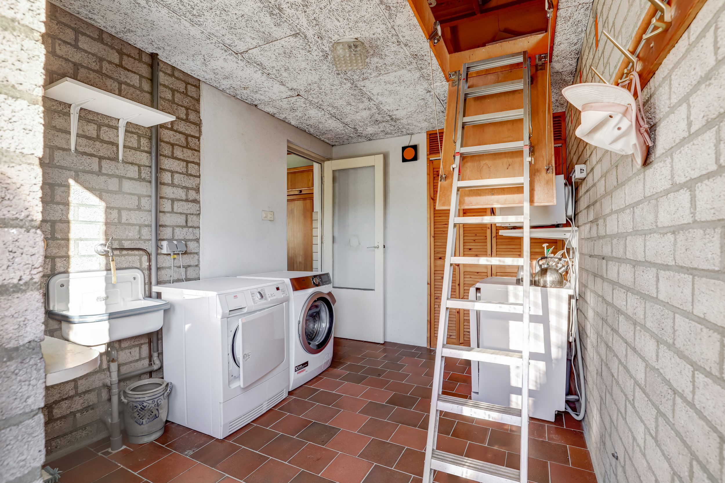 De keuken is afgesloten van de woonkamer en voorzien van basisapparatuur. Vanuit hier loop je door naar de praktische bijkeuken met witgoedaansluitingen en toegang tot de tuin. In de bijkeuken bevindt zich tevens de vlizotrap naar de ruime bergzolder boven de bijkeuken en de garage — een ideale plek voor seizoensspullen of sportartikelen.
