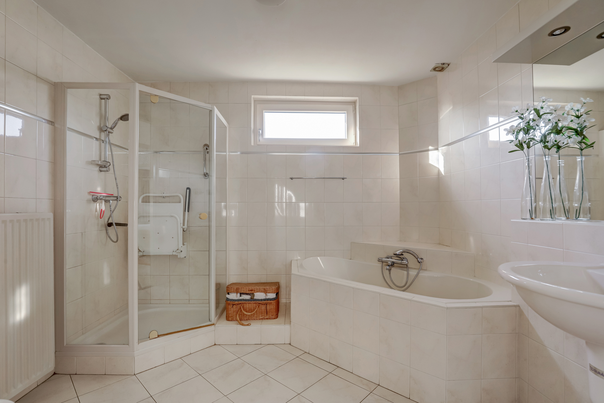 De overloop biedt toegang tot maar liefst drie royale slaapkamers — stuk voor stuk ruim en licht. De badkamer is compleet uitgerust met een ligbad, douche, toilet en wastafel. Een fijne, overzichtelijke verdieping waar een gezin makkelijk zijn draai vindt. Fijn detail, er is airconditioning aanwezig op deze verdiepingsvloer.