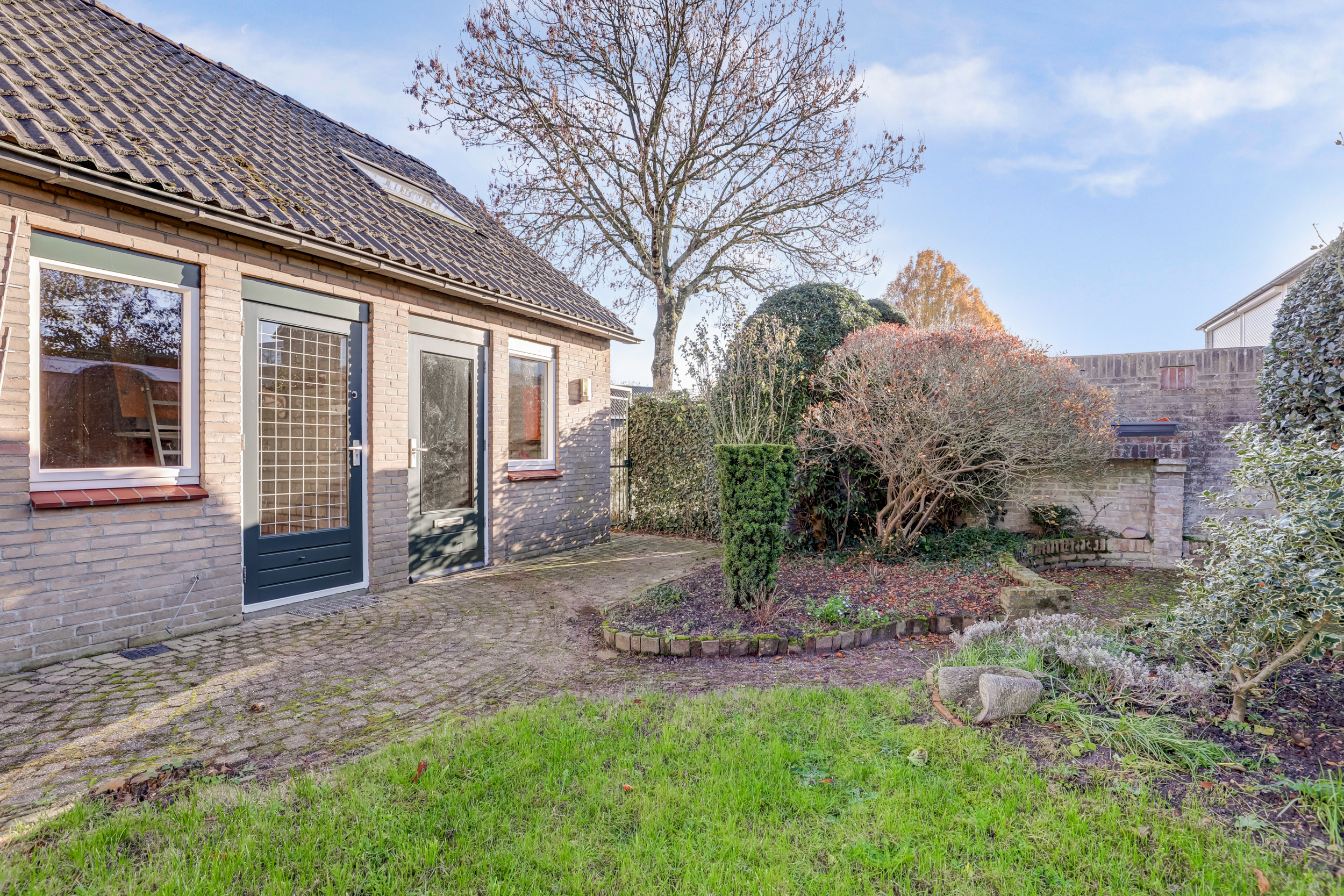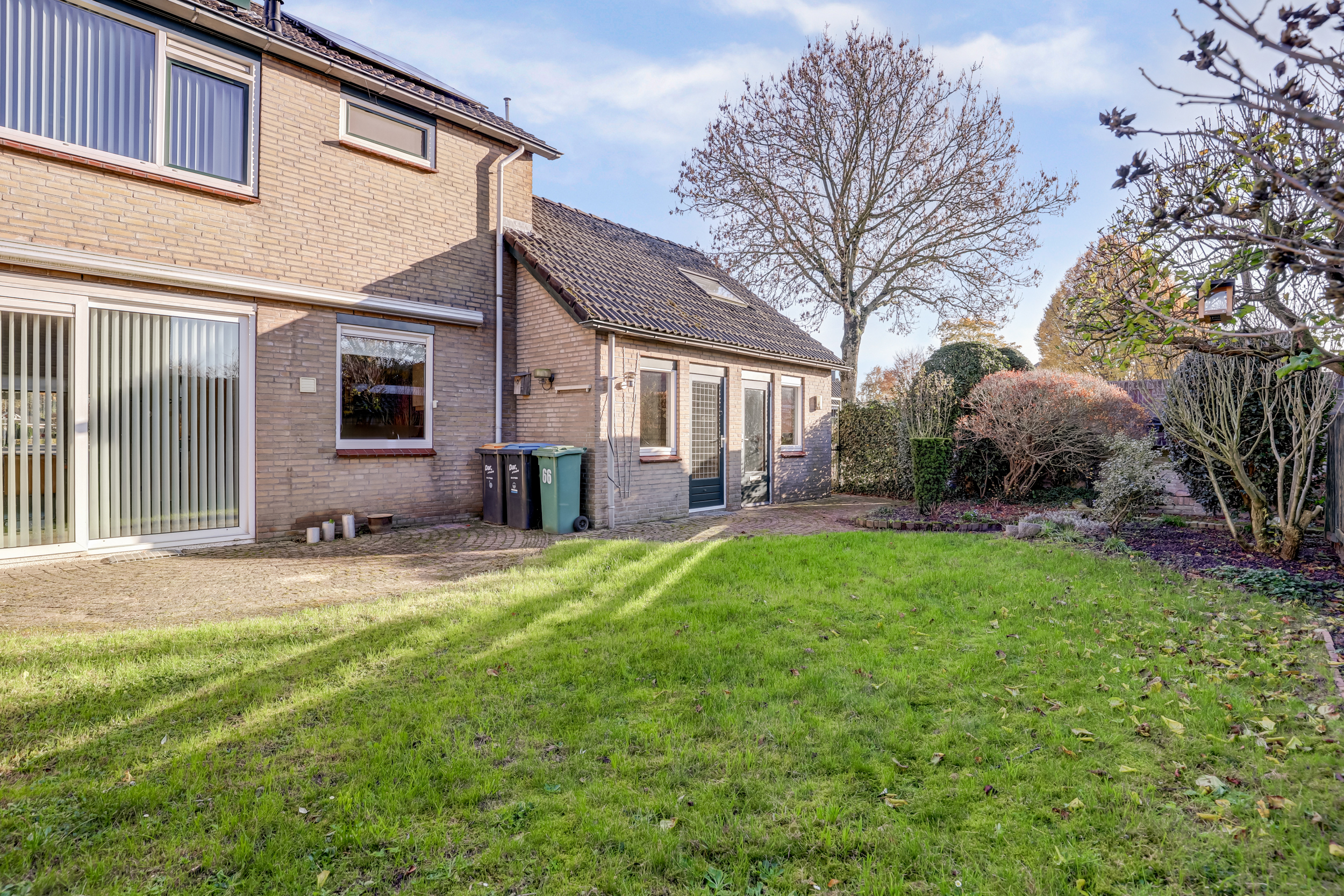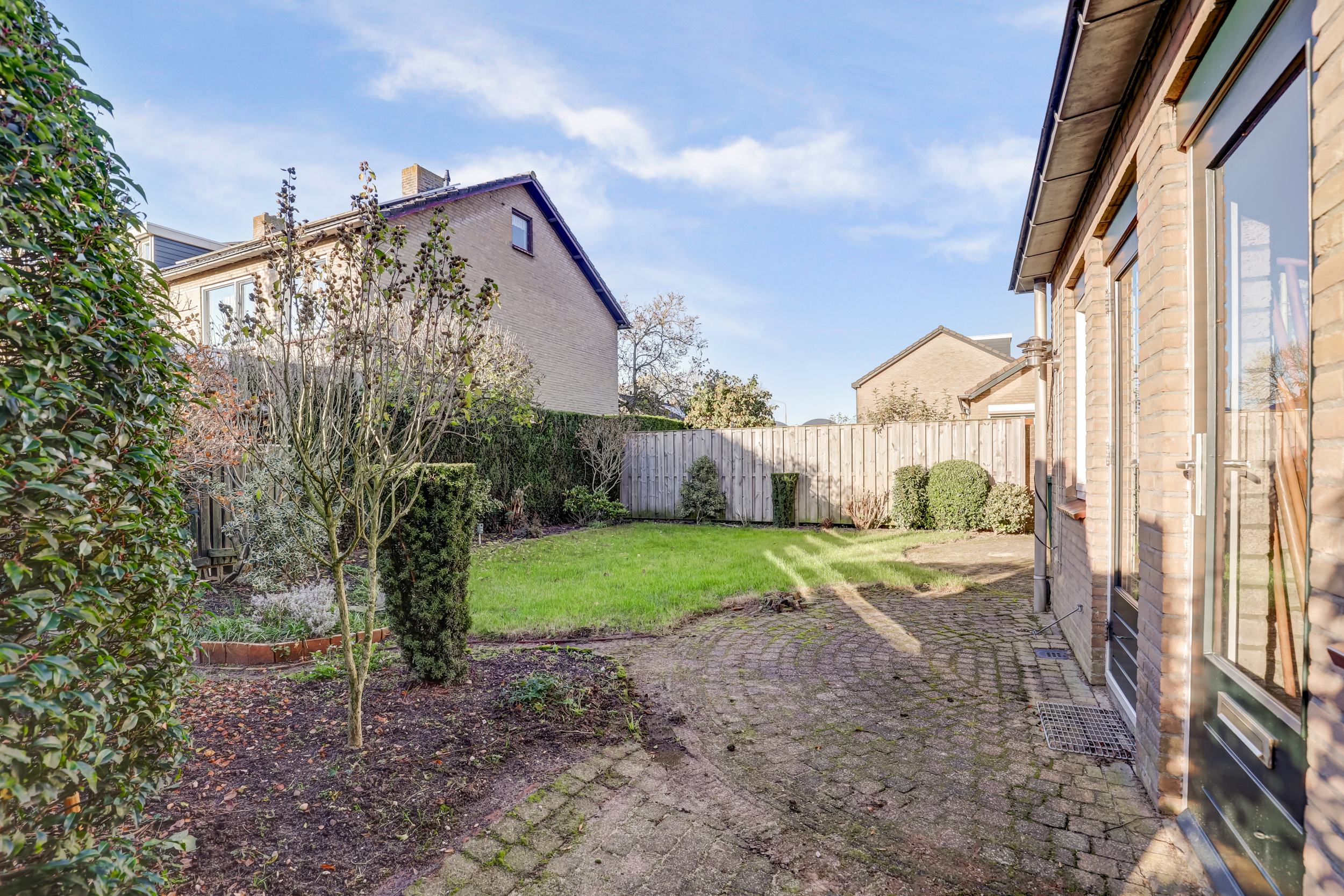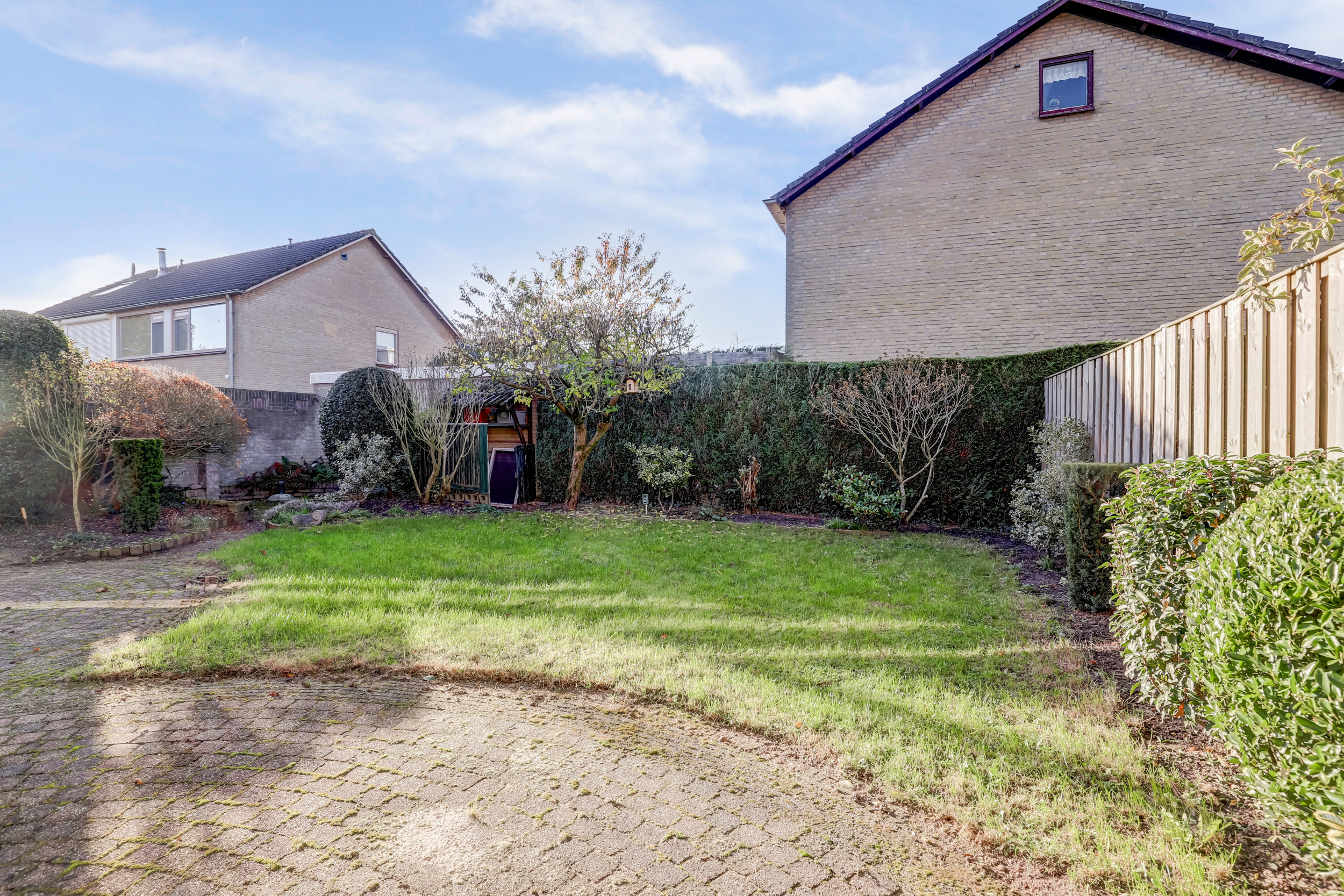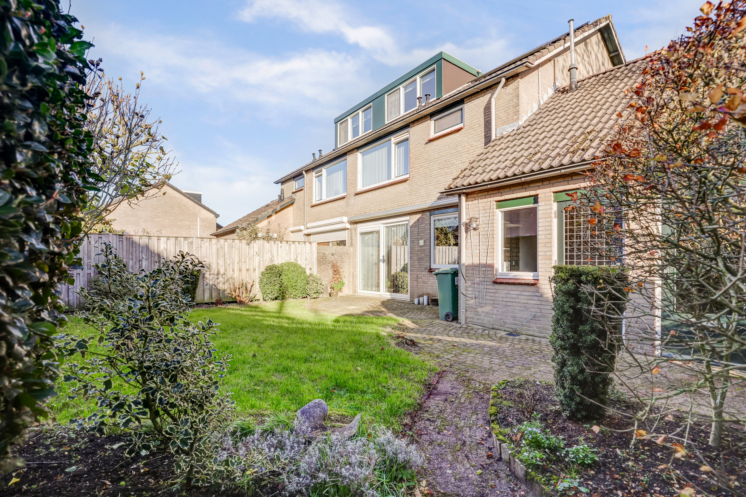 De hoofdtuin ligt aan de achterzijde en is netjes aangelegd met gras, borders en een fijn zonneterras. Dankzij de breedte van het perceel heb je hier een fijne combinatie van zon, privacy en gebruiksgemak. Via de zijkant loop je langs de garage naar de voortuin, waar je op eigen terrein kunt parkeren.