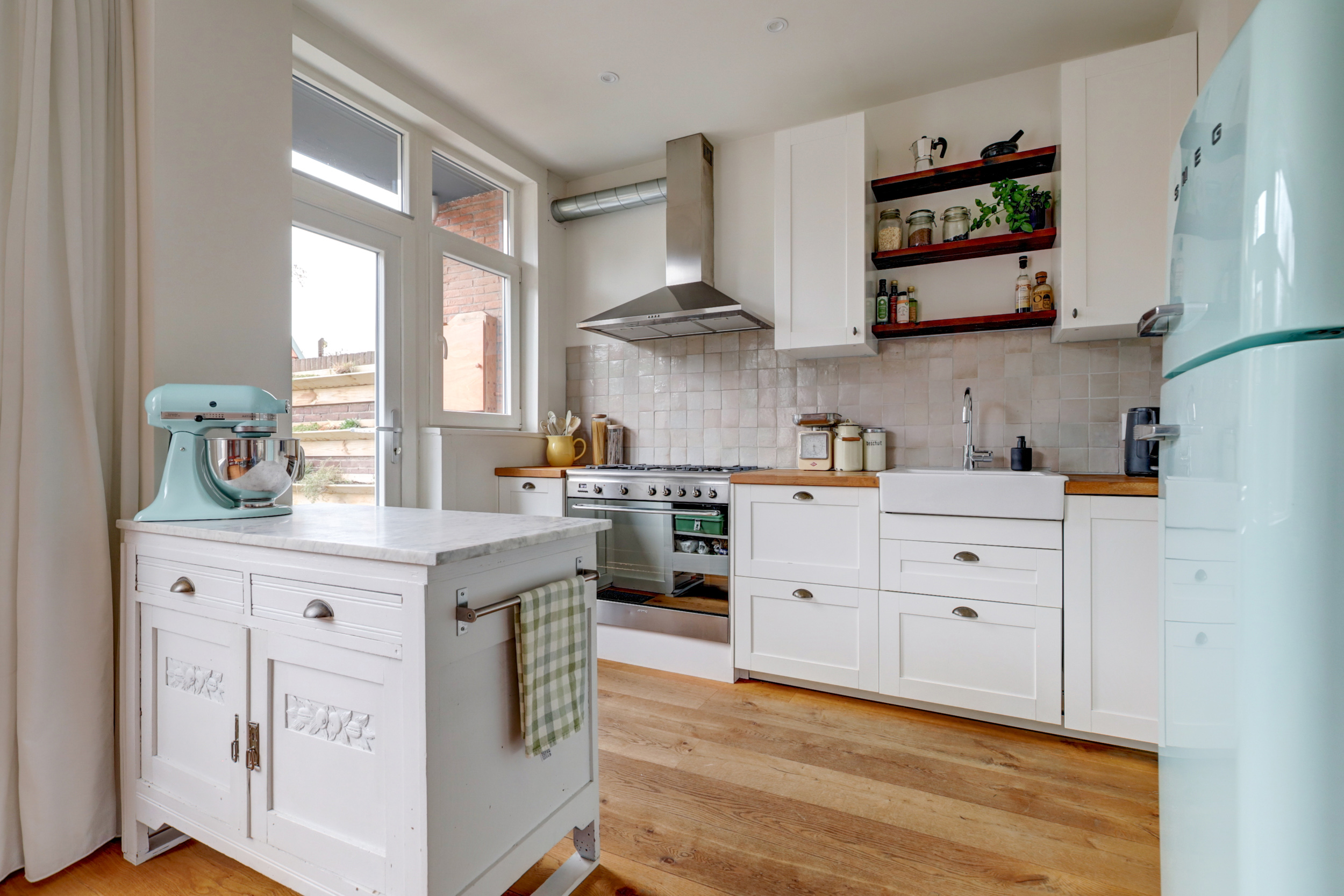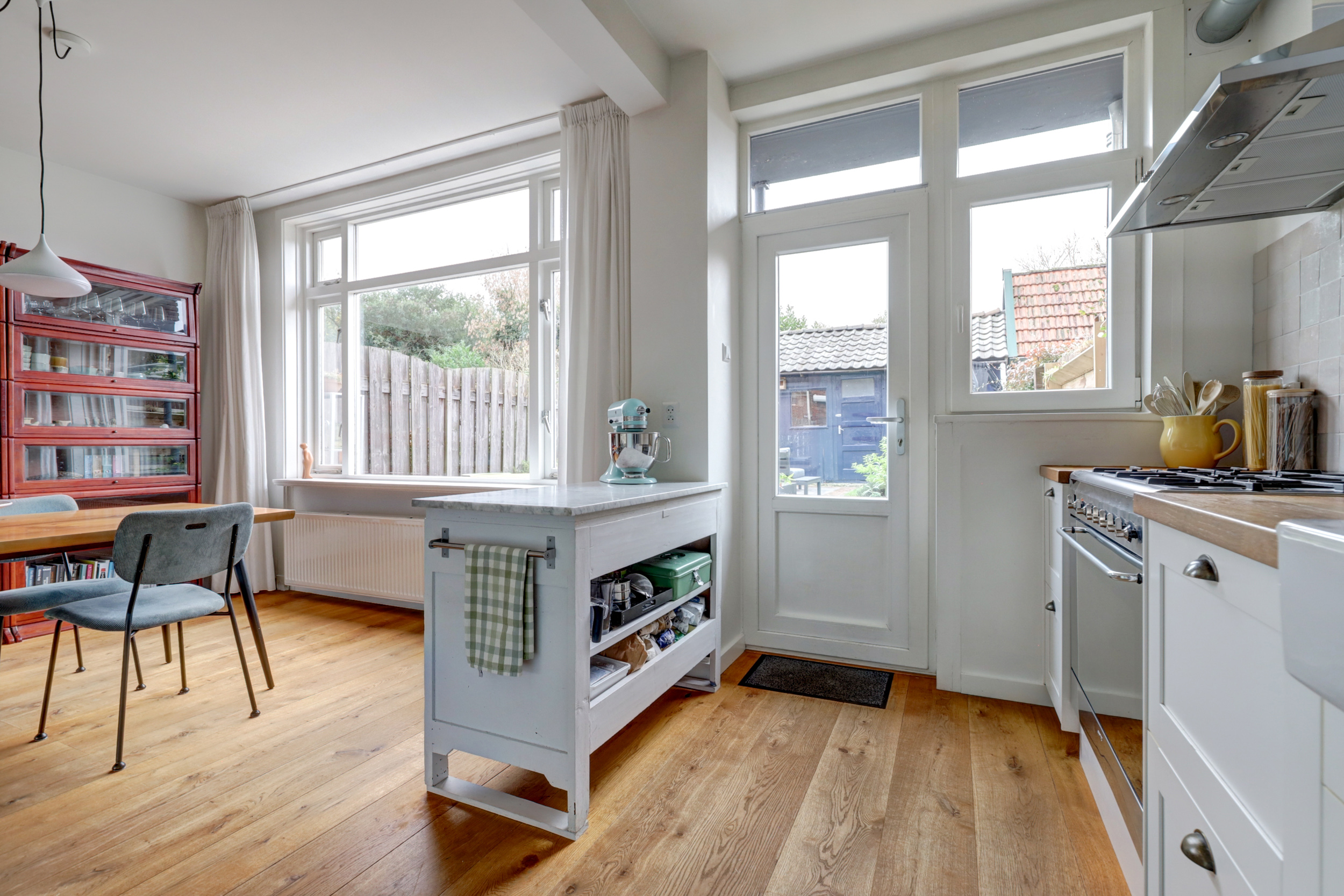 Via de hal bereik je onder andere de kelder en het moderne toilet. De woonkamer voelt direct open en licht, mede dankzij de erker aan de voorzijde en de doorlopende houten vloer. Het zitgedeelte bij de erker is warm en uitnodigend; richting de achtertuin vind je het eetgedeelte, dat in open verbinding staat met de keuken. De muur is in 2017 doorbroken, waardoor een ruimtelijke leefkeuken is ontstaan, uitgerust met een 5-pits gasfornuis met oven, afzuigkap, spoelbak en vaatwasser (2025). Vanuit hier loop je zo de zonnige achtertuin in.