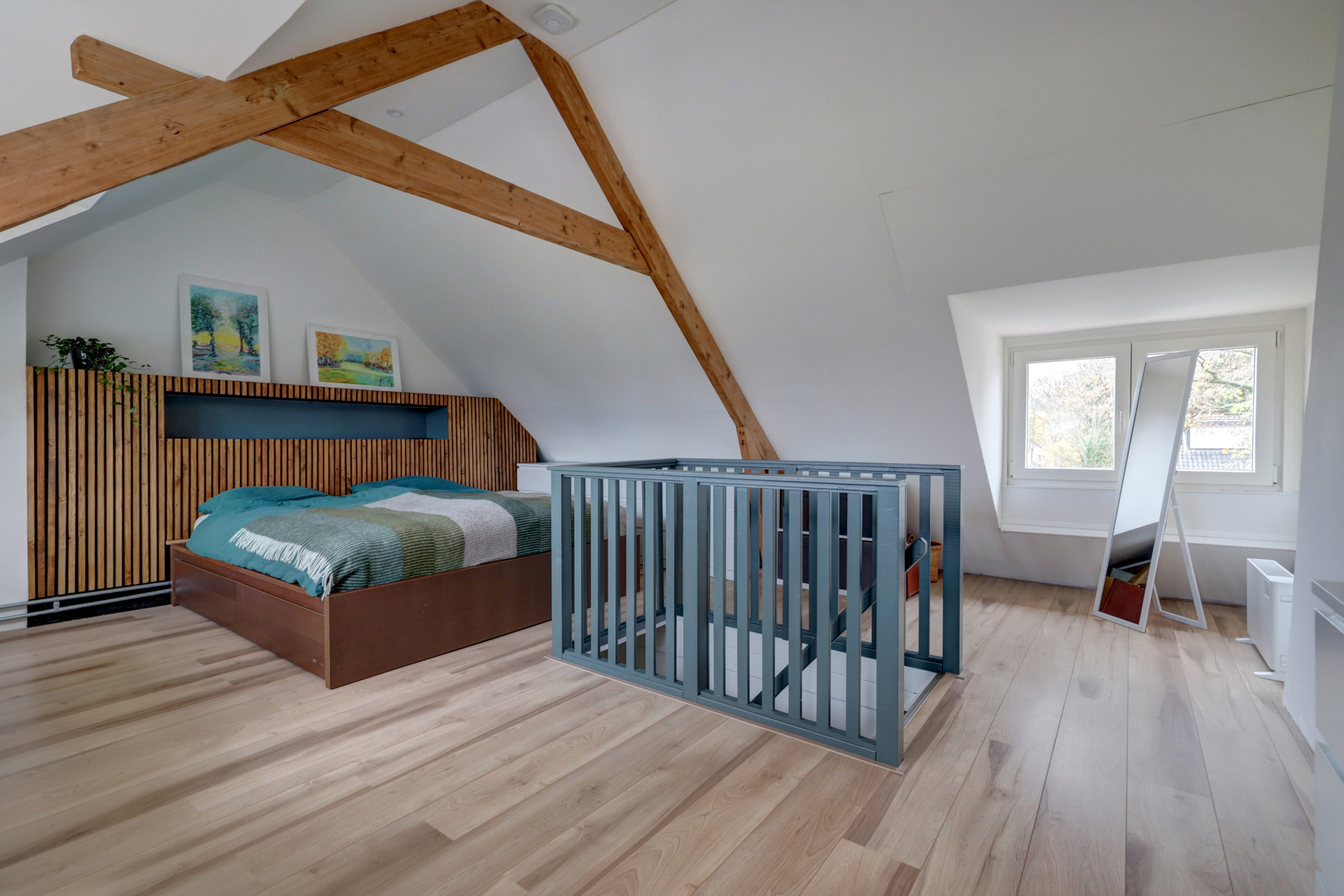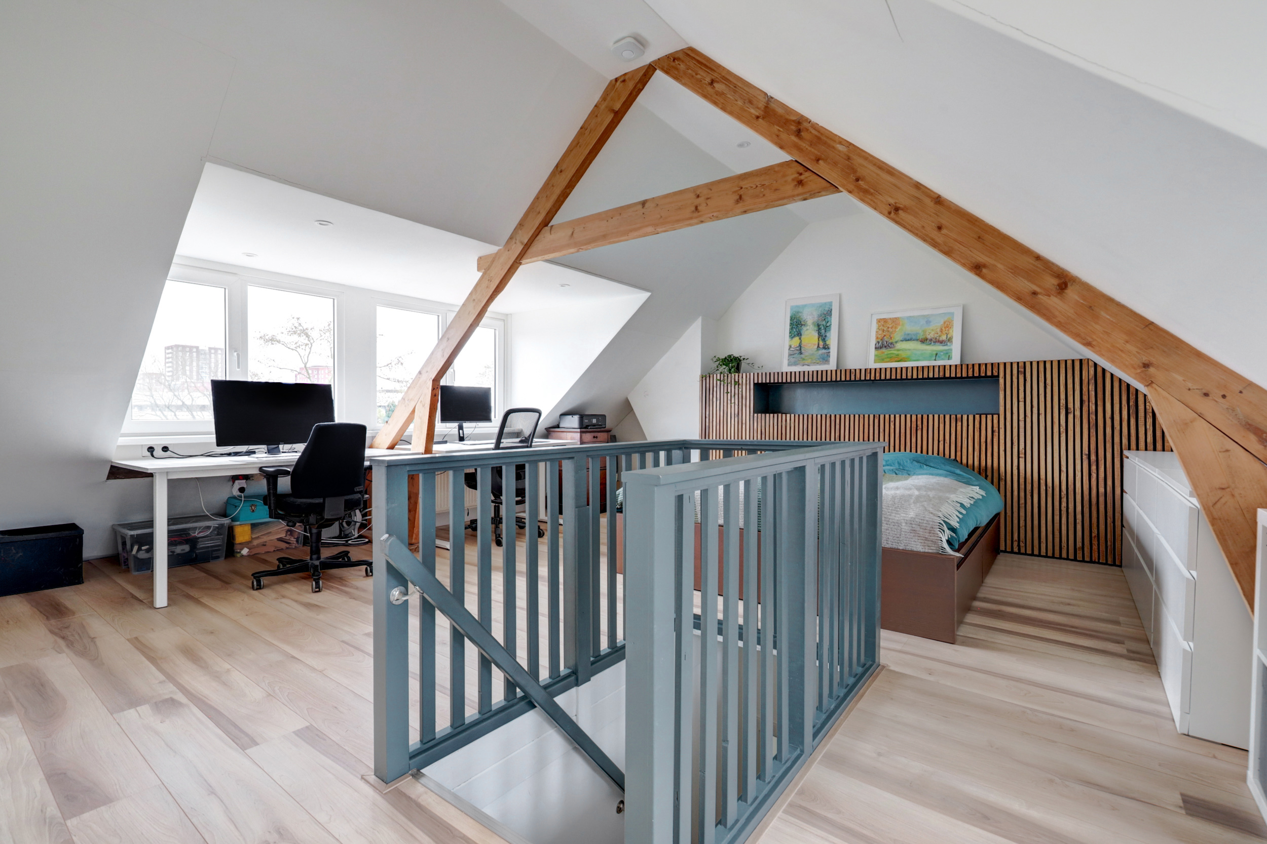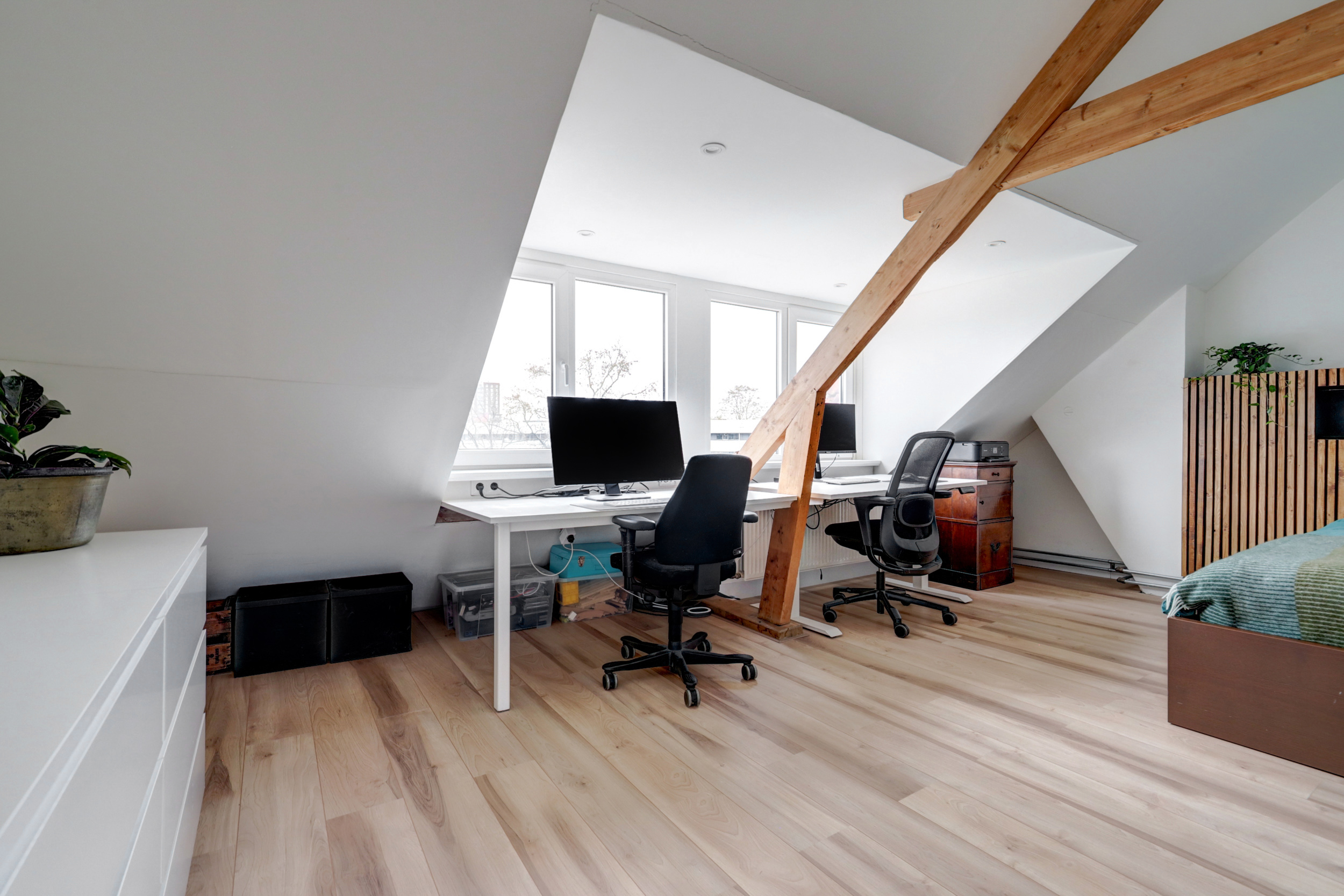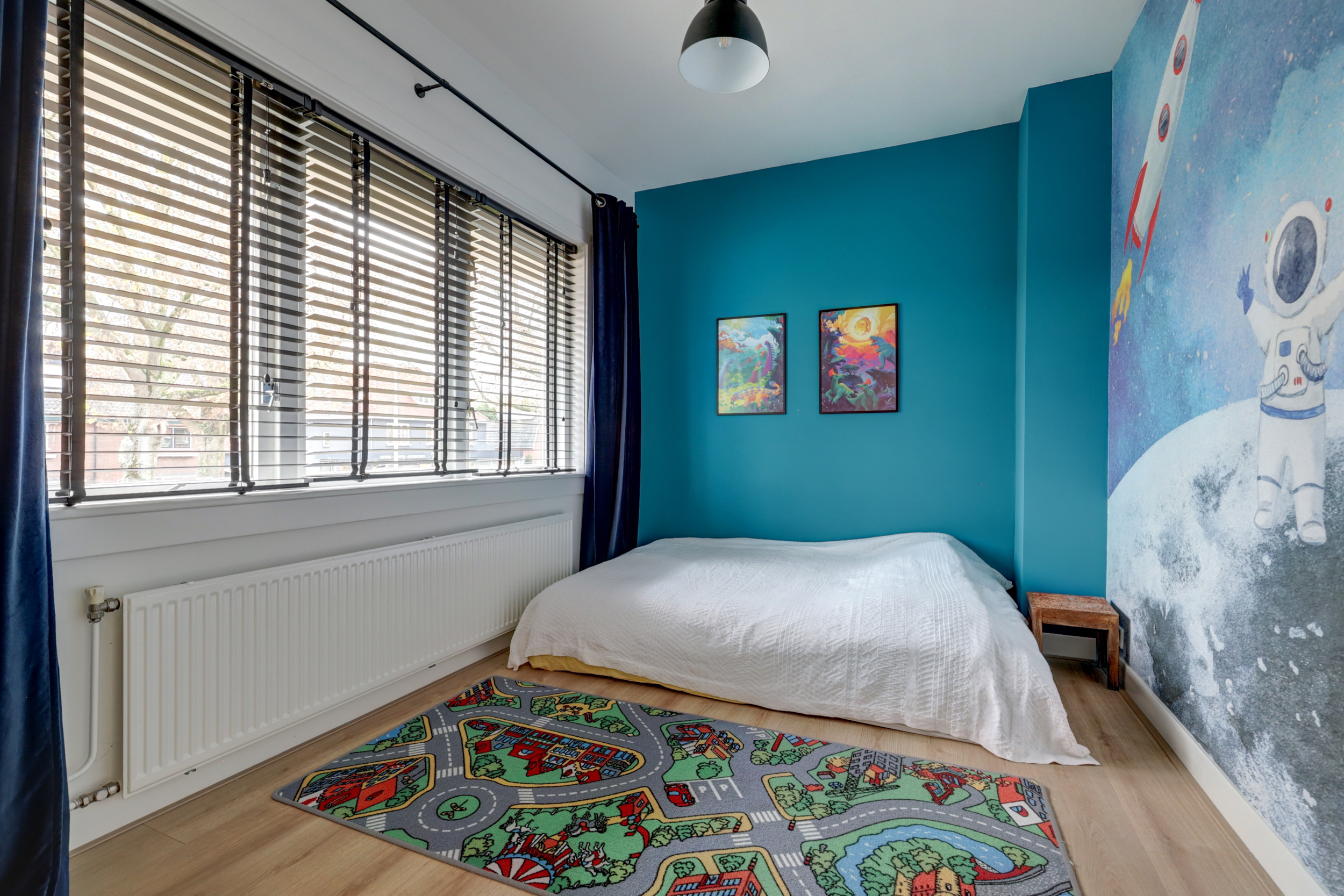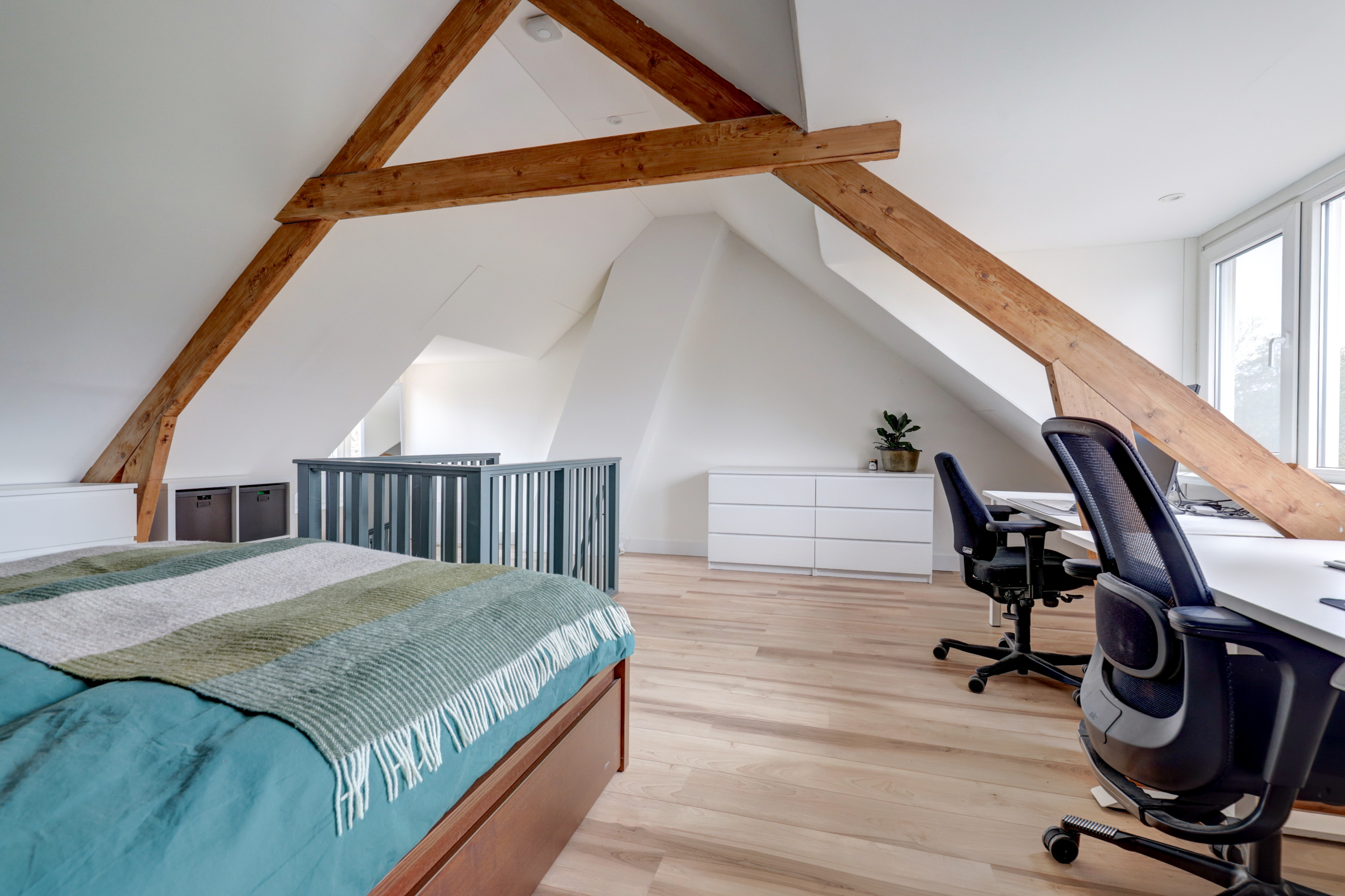 De tweede verdieping bereik je via een vaste trap. Hier ligt een royale ouderslaapkamer met kunststof dakkapel aan de achterzijde (met rolluiken) en een tweede dakkapel aan de voorzijde. De kamer heeft fijne lichtinval en veel praktische ruimte.