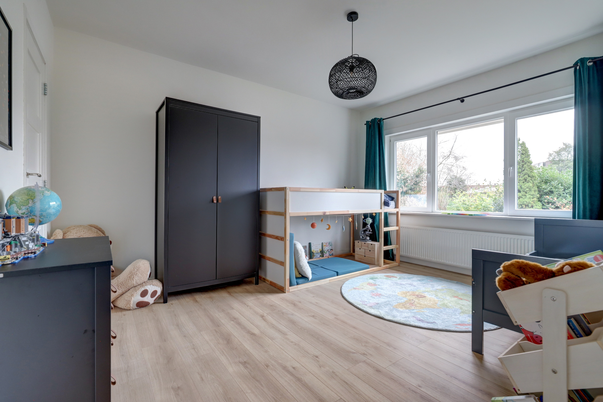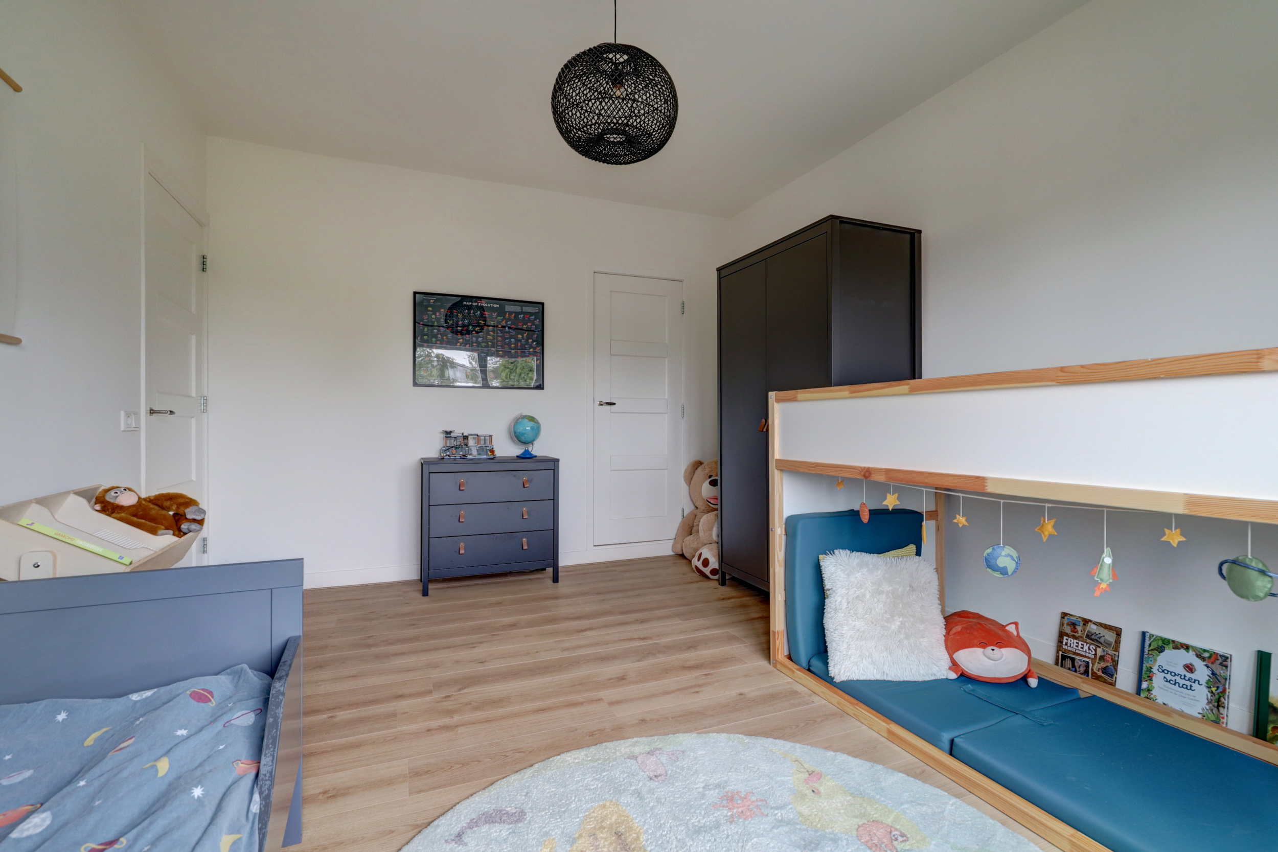 De eerste verdieping biedt een ruime slaapkamer aan de achterzijde met trapkast, een tweede slaapkamer aan de voorzijde en een royale badkamer die is vergroot door een voormalige slaapkamer te betrekken bij de ruimte. De badkamer beschikt over een ligbad, inloopdouche, wastafelmeubel, toilet en elektrische vloerverwarming. De voormalige badkamer is omgebouwd tot wasruimte met cv-ketel (Vaillant, 2021).