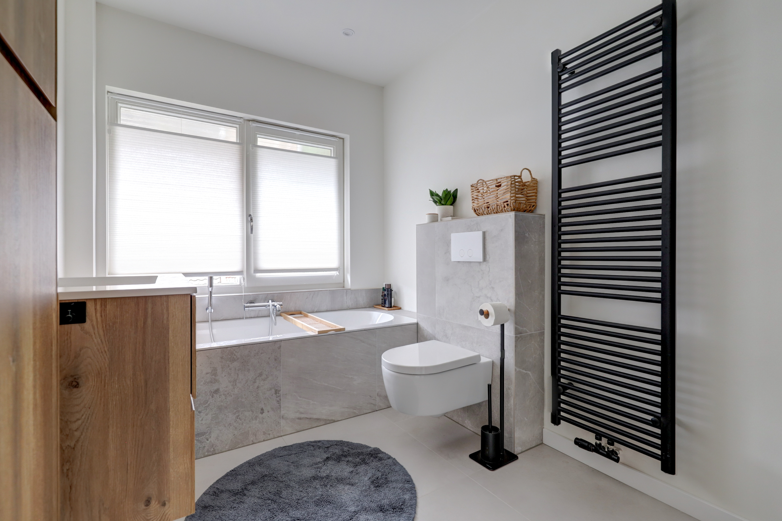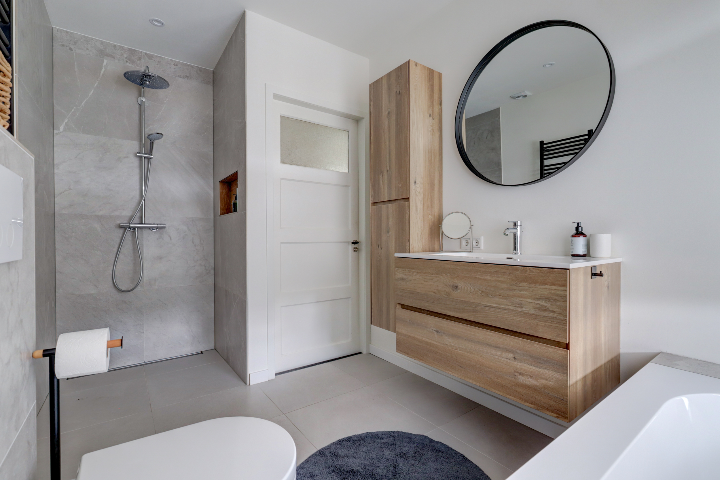 + Royale badkamer met ligbad, inloopdouche, wastafelmeubel, toilet en vloerverwarming;