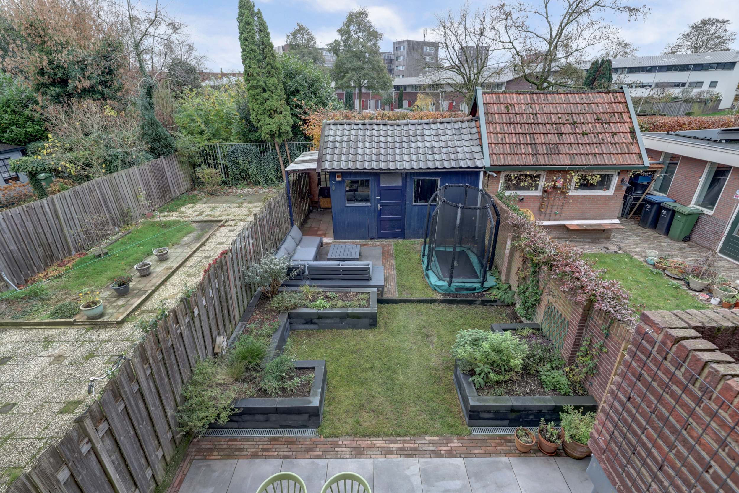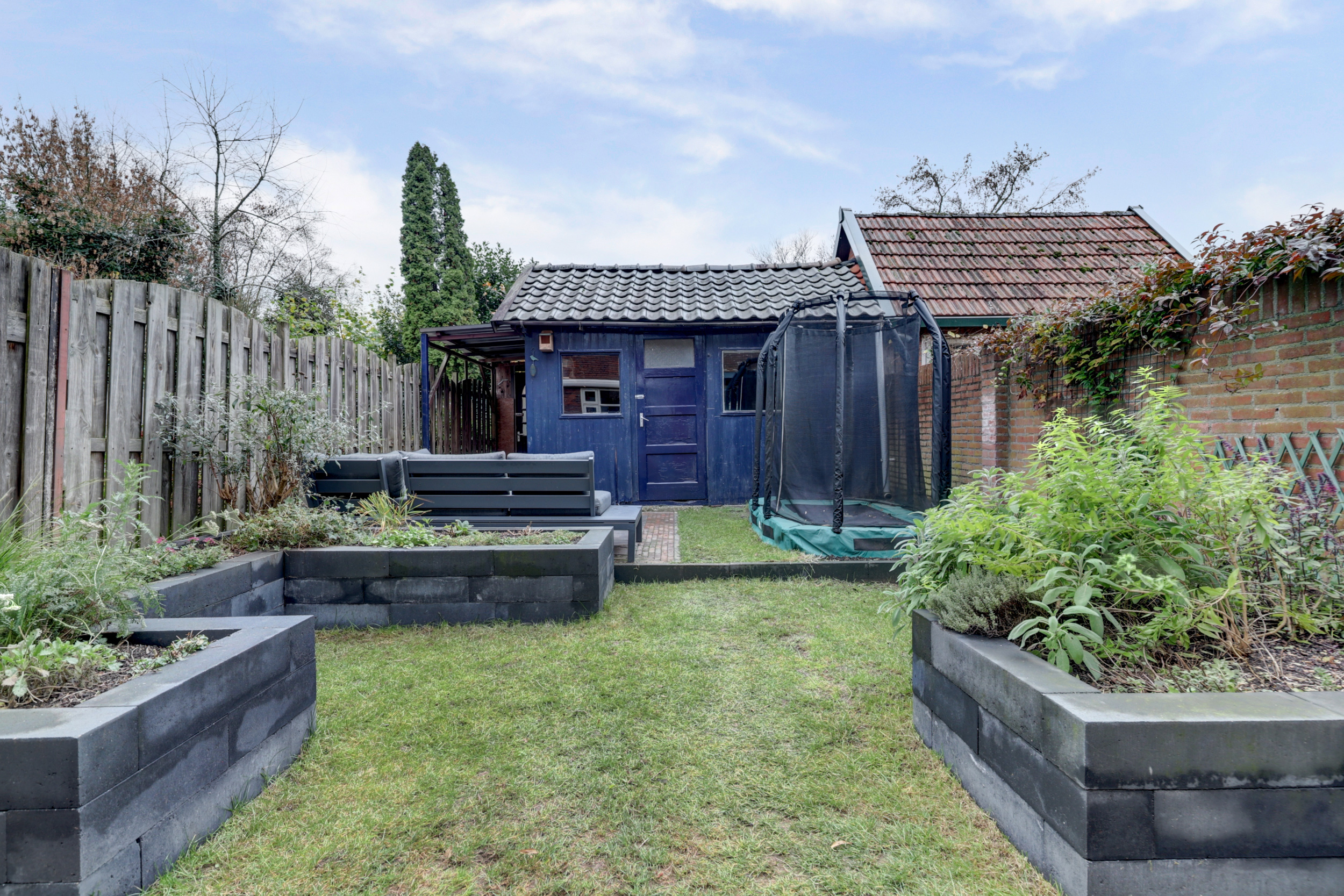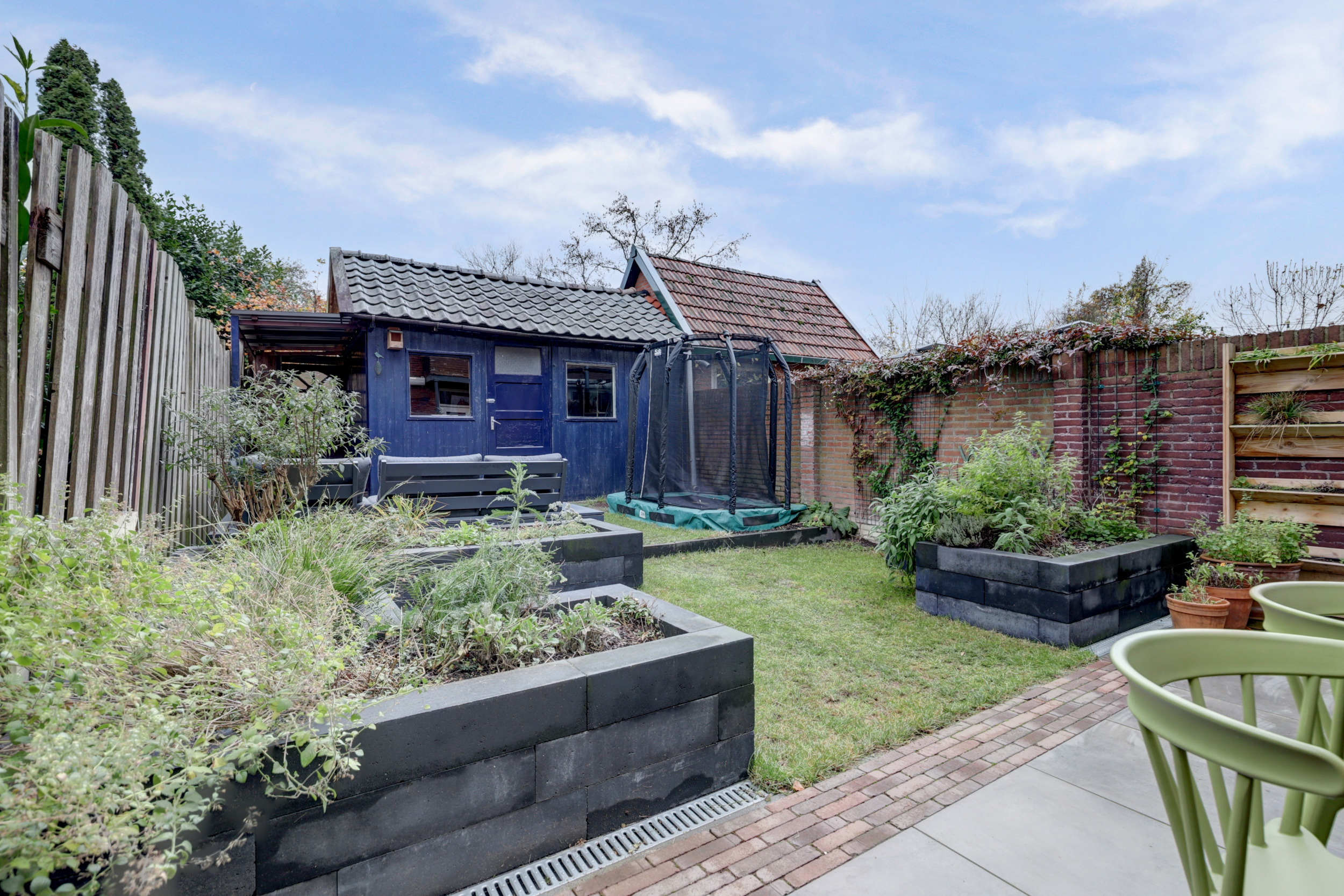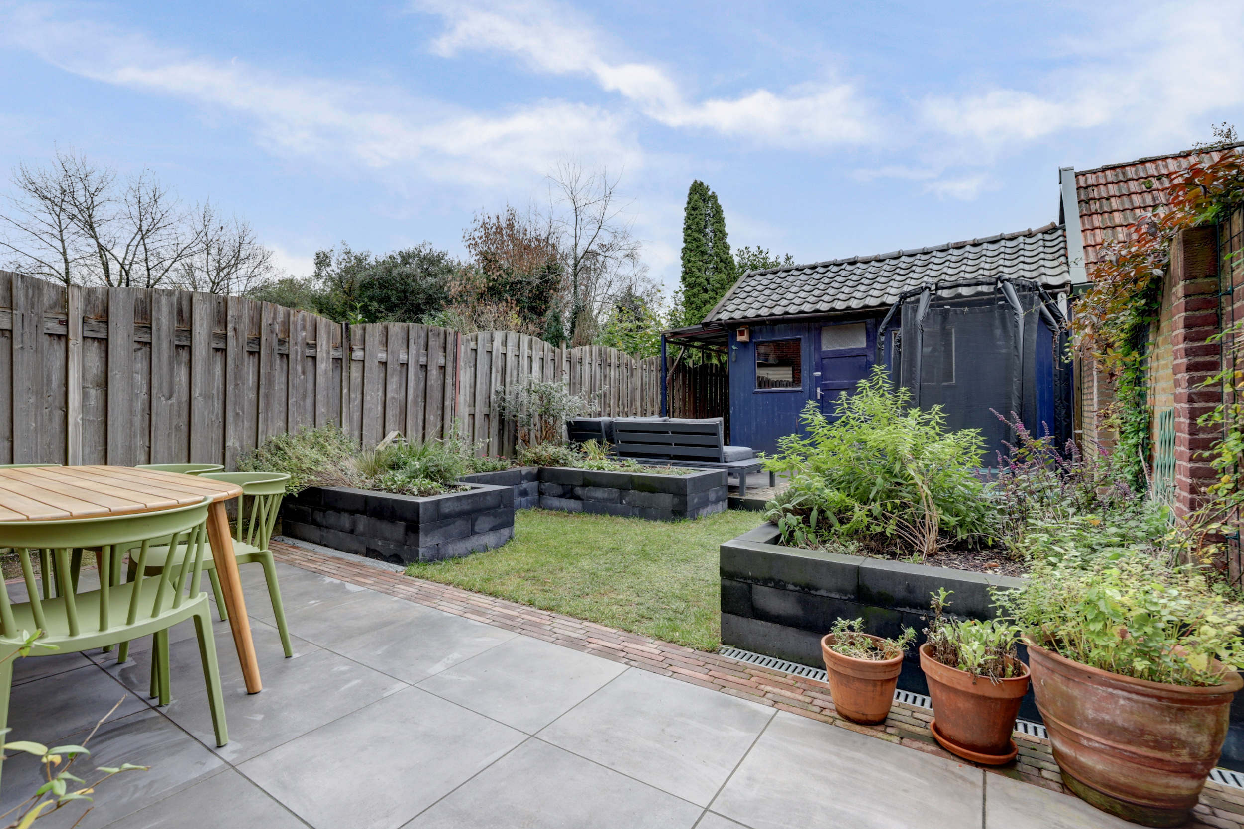 De achtertuin van ca. 55 m² is fraai aangelegd en gericht op het zuidoosten, met twee terrassen, groen, een zonnescherm, achterom en een vrijstaand houten schuurtje. De voortuin is eveneens vernieuwd en verzorgd aangelegd.