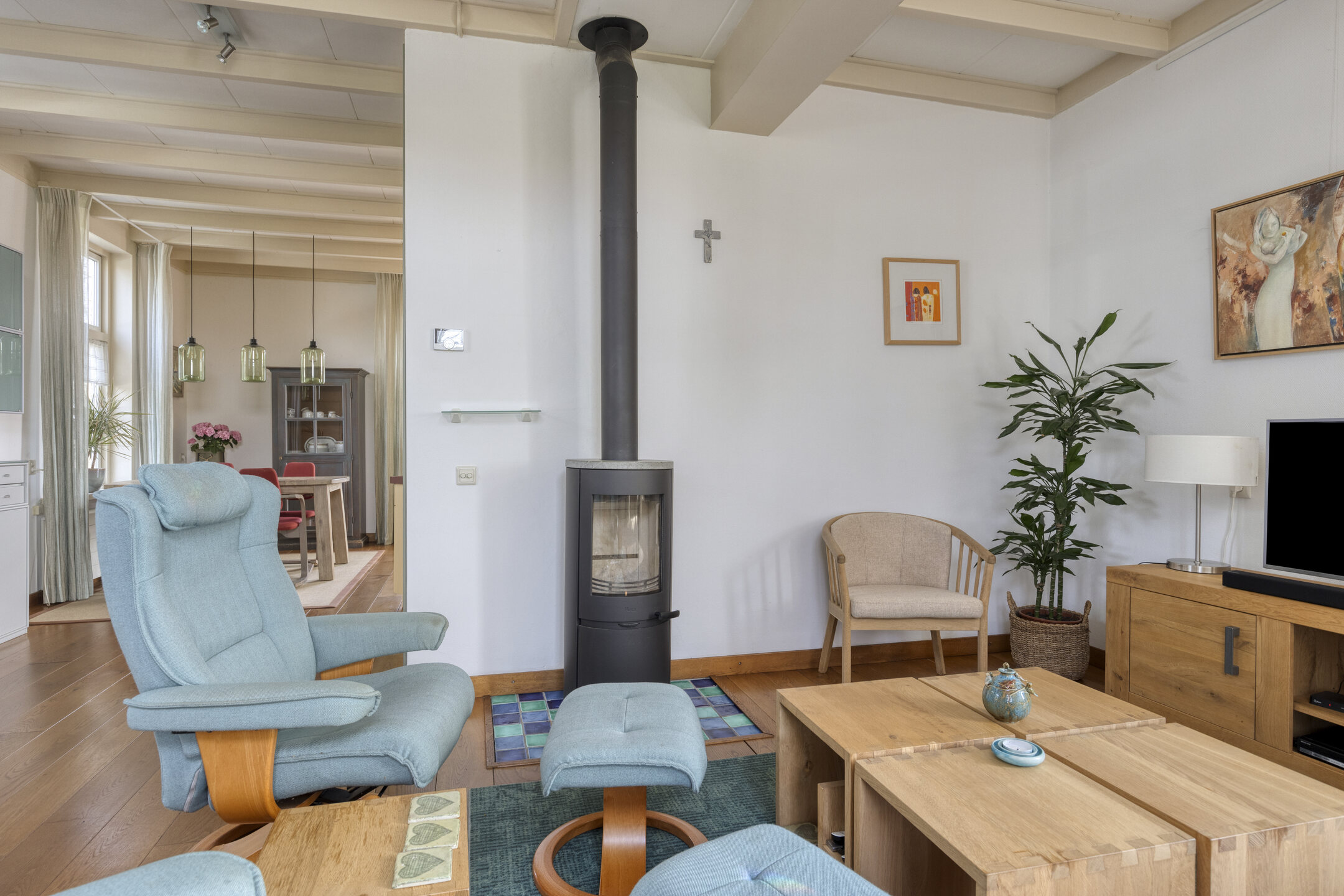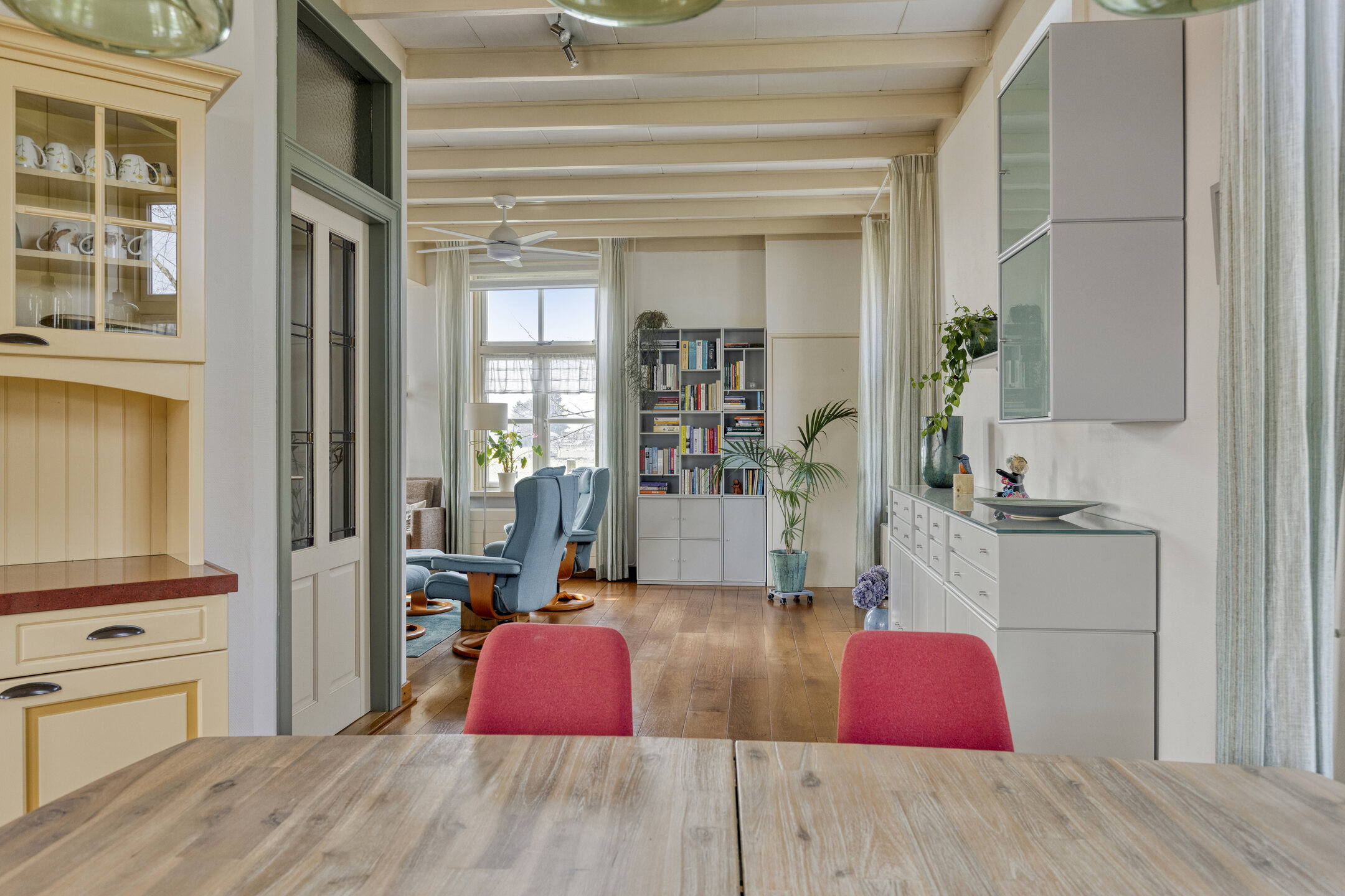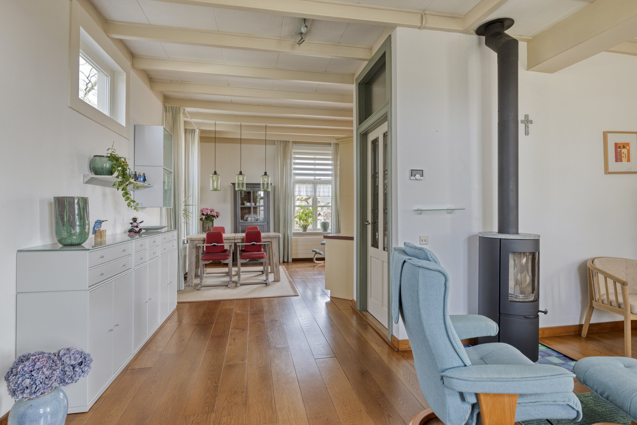 Via de entree kom je binnen in de hal met garderobe en toilet. Vanuit hier betreed je de woonkamer, een warme en uitnodigende ruimte waar de authentieke sfeer van het huis goed voelbaar is. De woonkamer staat in open verbinding met het eetgedeelte en de woonkeuken, waardoor een prettig en ruimtelijk geheel ontstaat.
