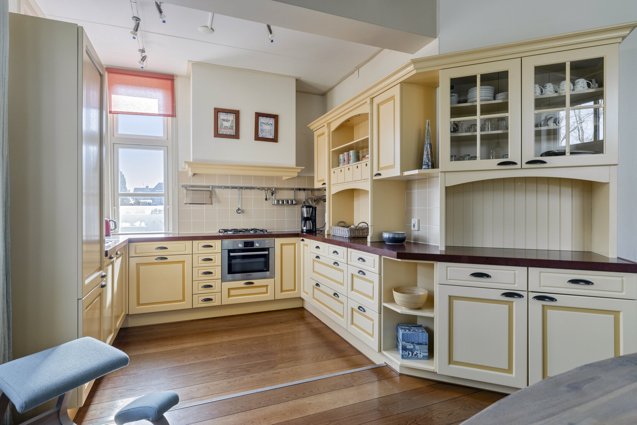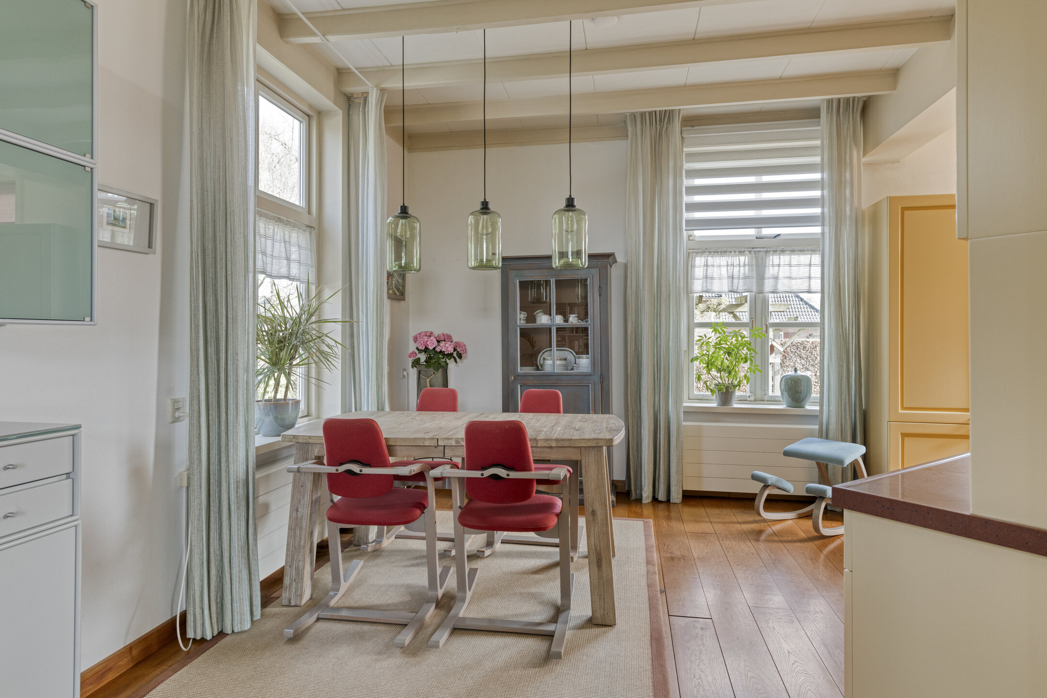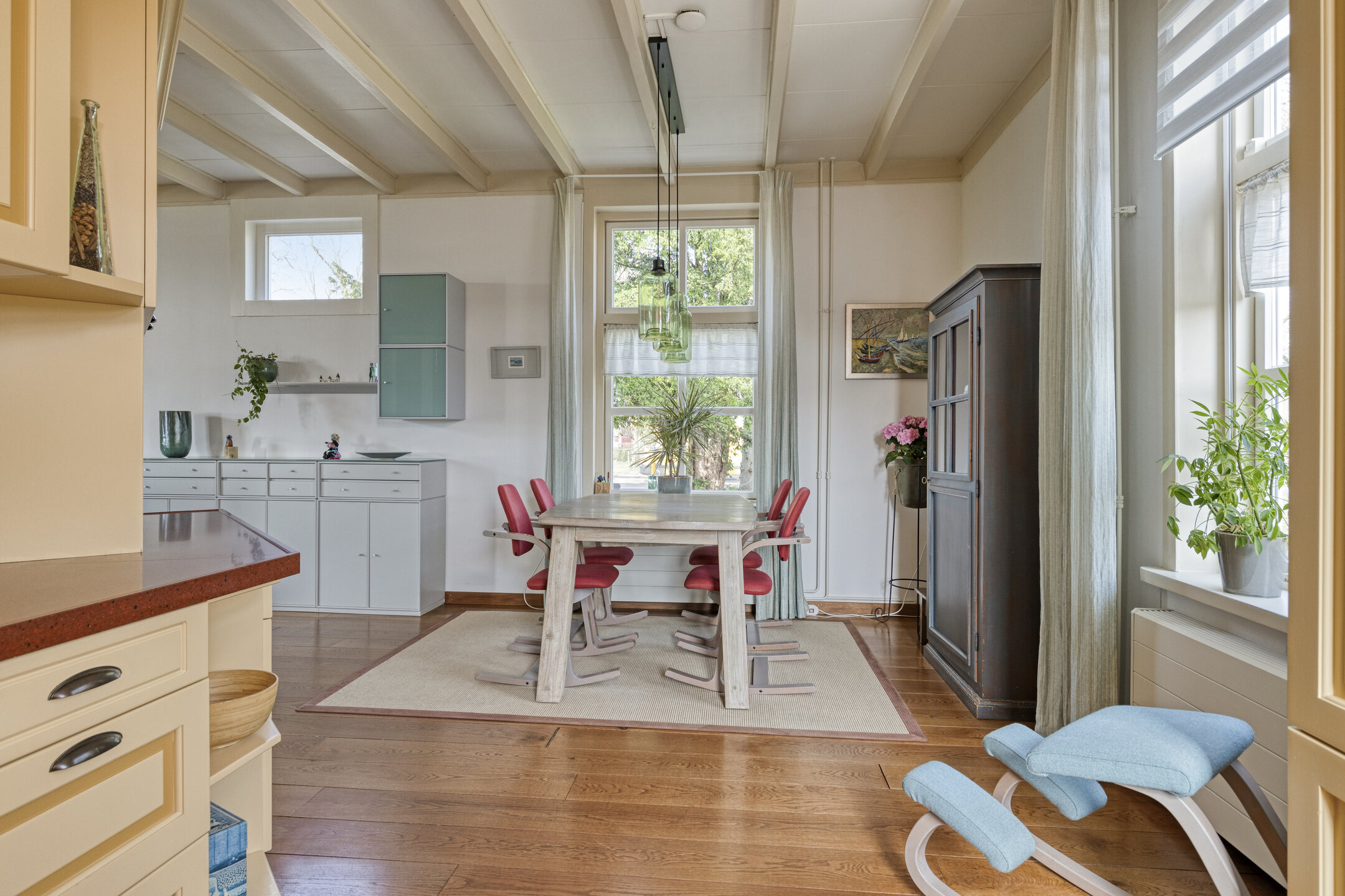 De keuken beschikt over diverse inbouwapparatuur, waaronder een koelkast, vaatwasser, combimagnetron, 4-pits gaskookplaat en afzuigkap. Het eetgedeelte vormt een natuurlijke plek voor lange diners en gezellige avonden met familie en vrienden.