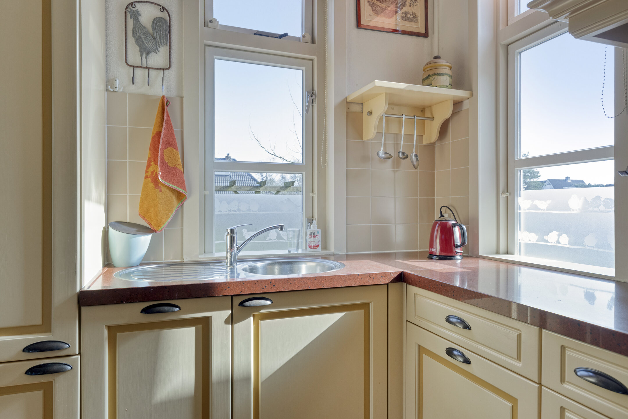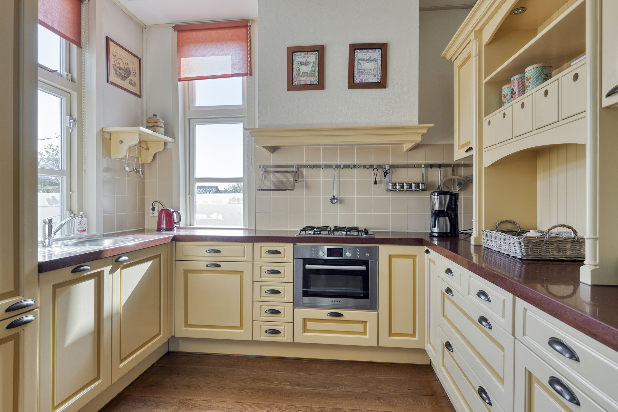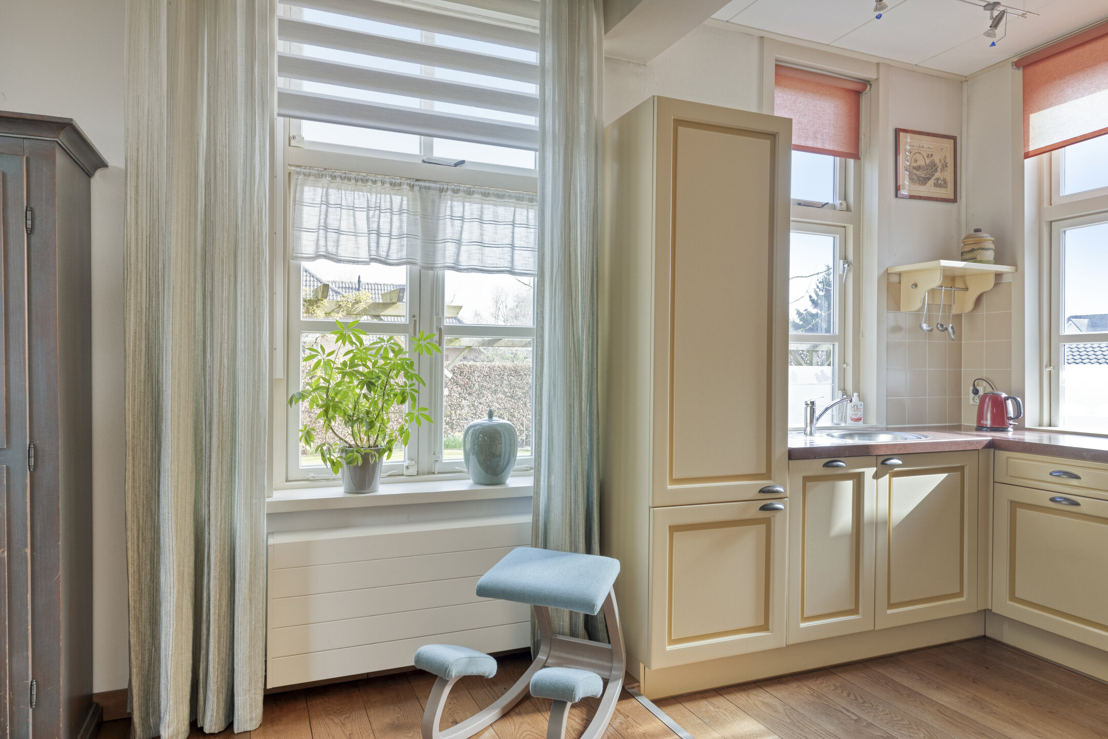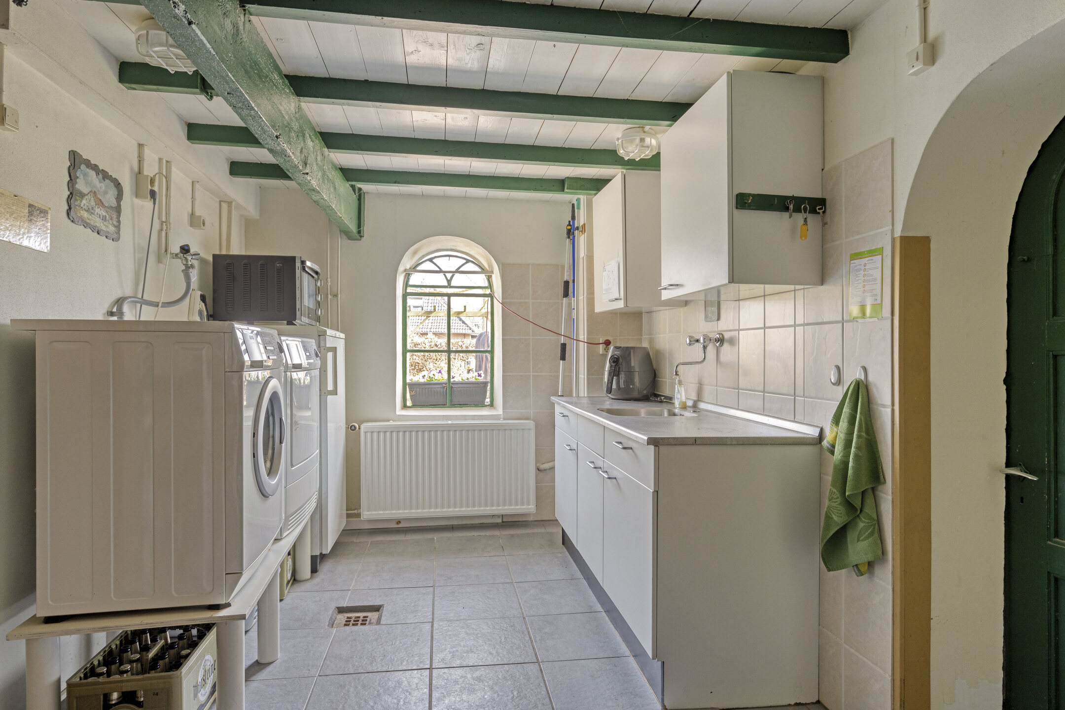 Aan de achterzijde bevindt zich de praktische bijkeuken met witgoedaansluitingen en een extra keukenblokje.